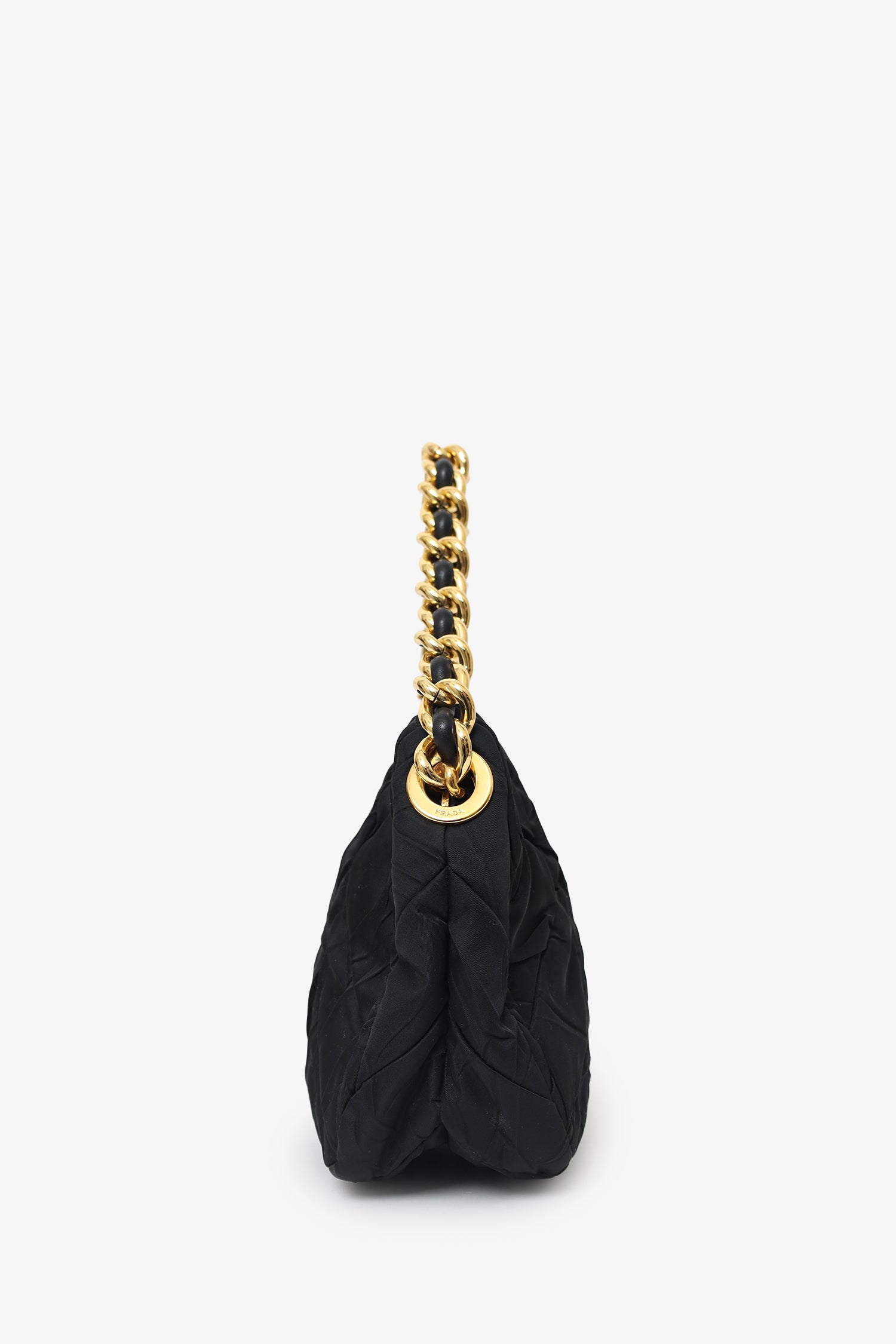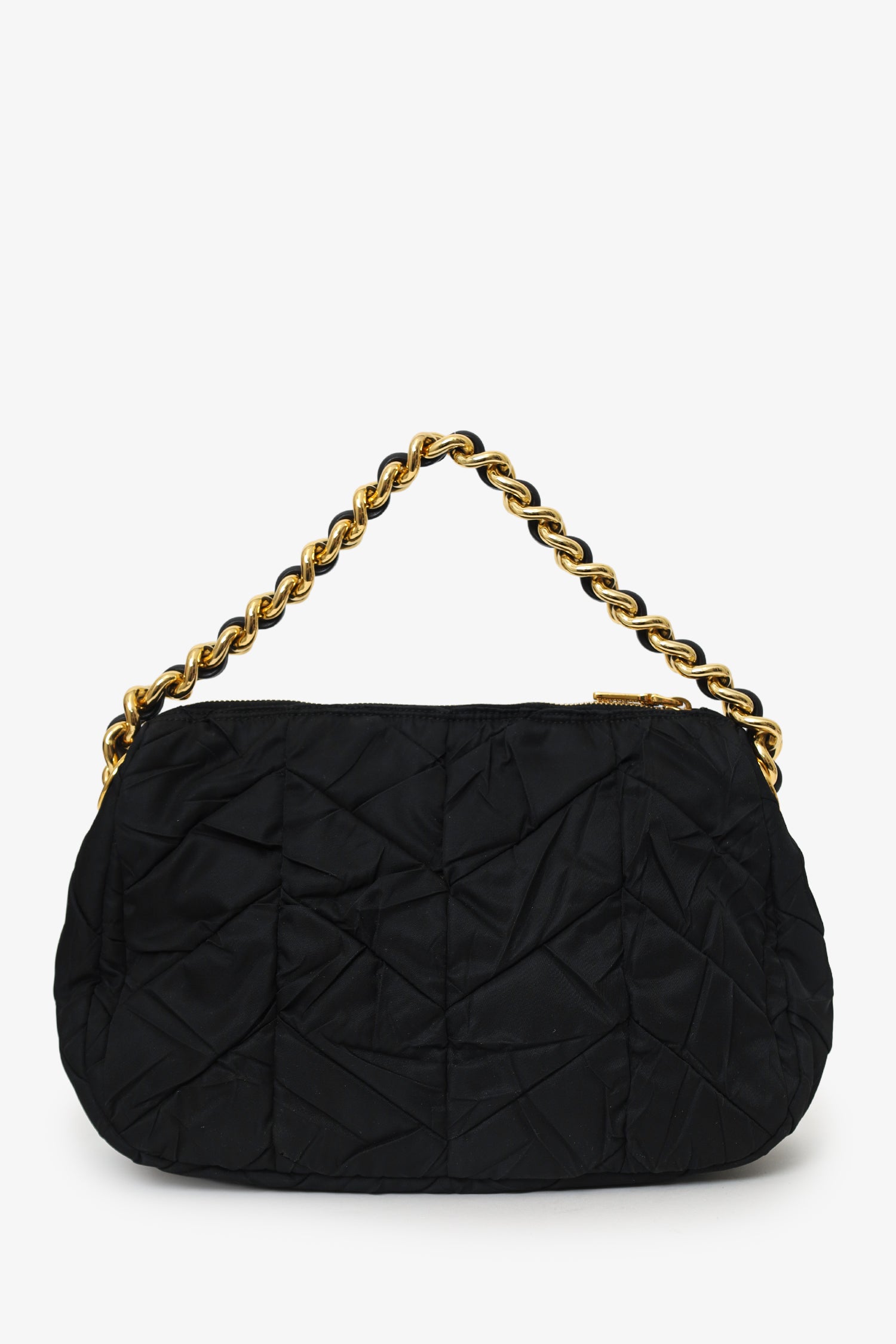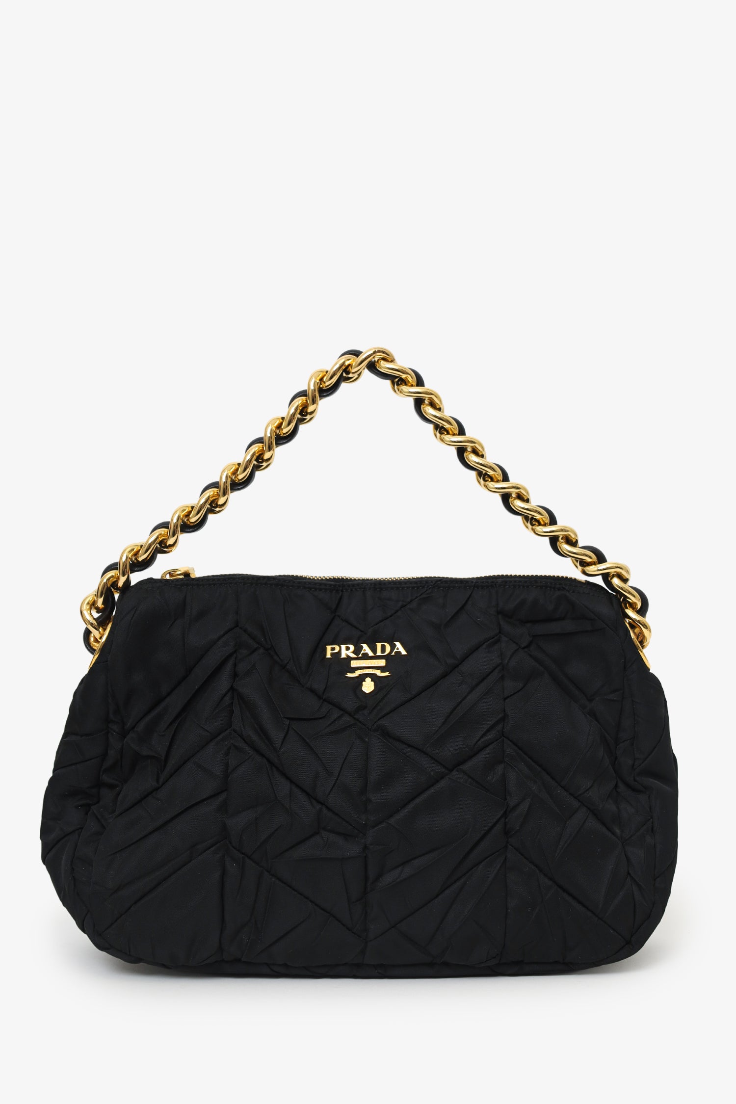 Refresh availabilityPrada Black Chevron Quilted Tessuto Chain Strap Bag. Top zip closure. Single chain strap. Single interior wall zip closure pocket. Gold-tone hardware. Tonal stitching.