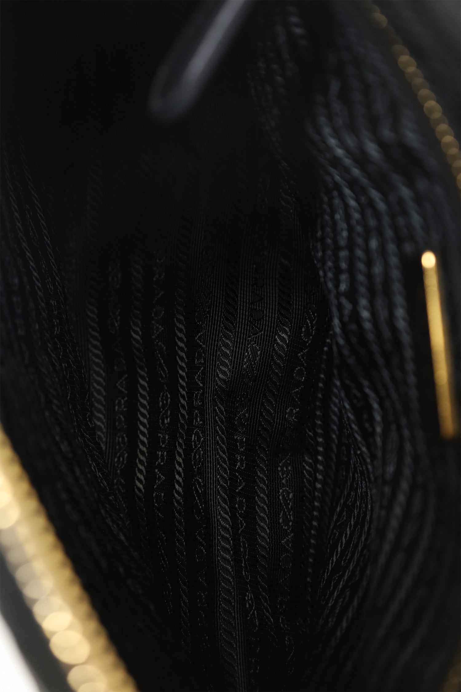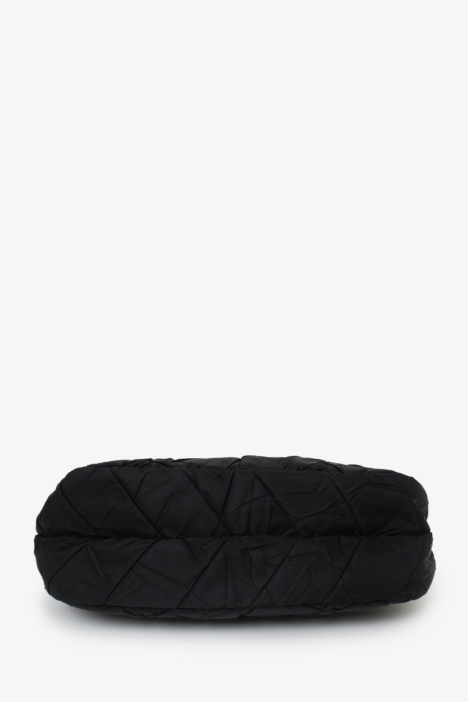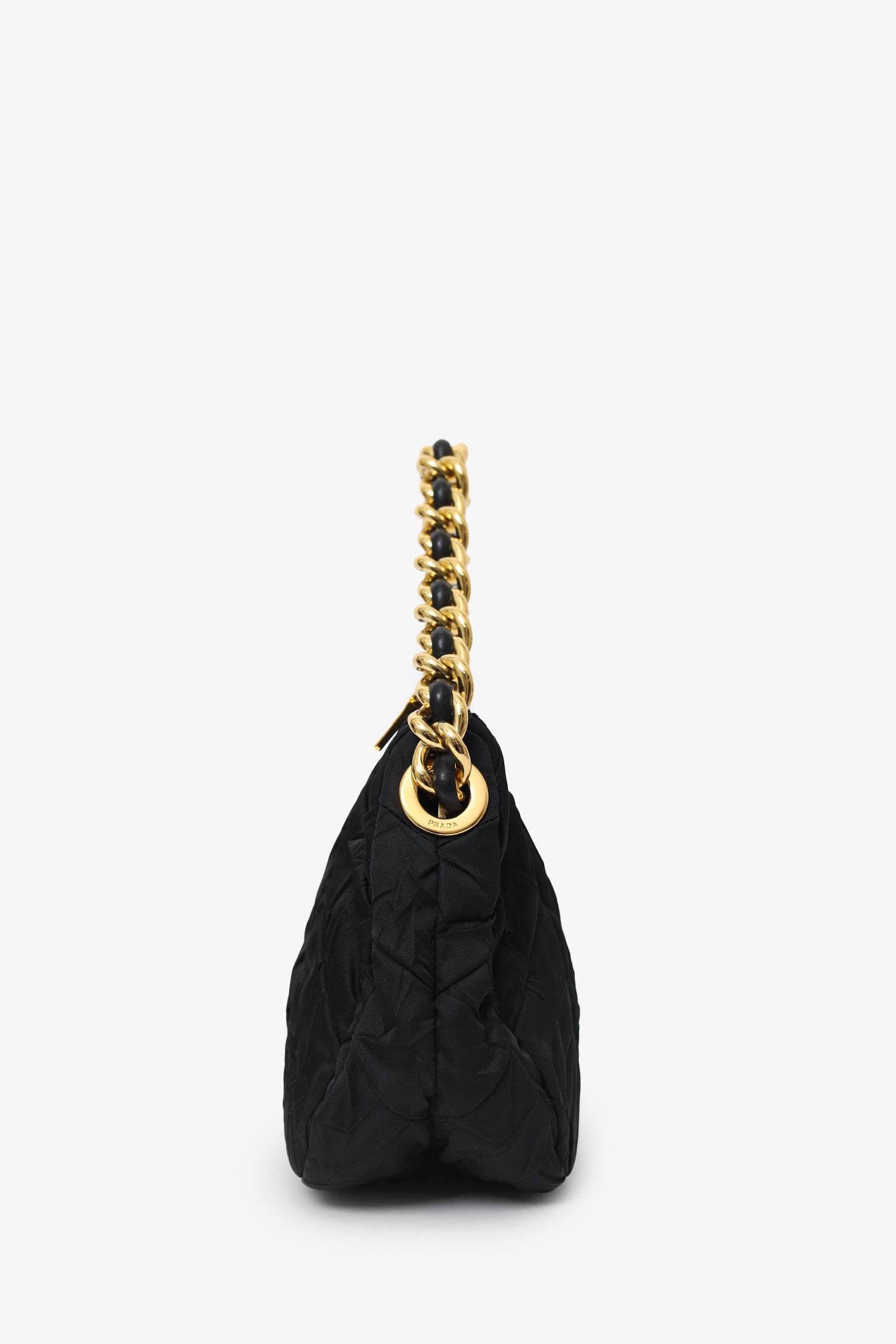 Refresh availabilityPrada Black Chevron Quilted Tessuto Chain Strap Bag. Top zip closure. Single chain strap. Single interior wall zip closure pocket. Gold-tone hardware. Tonal stitching.