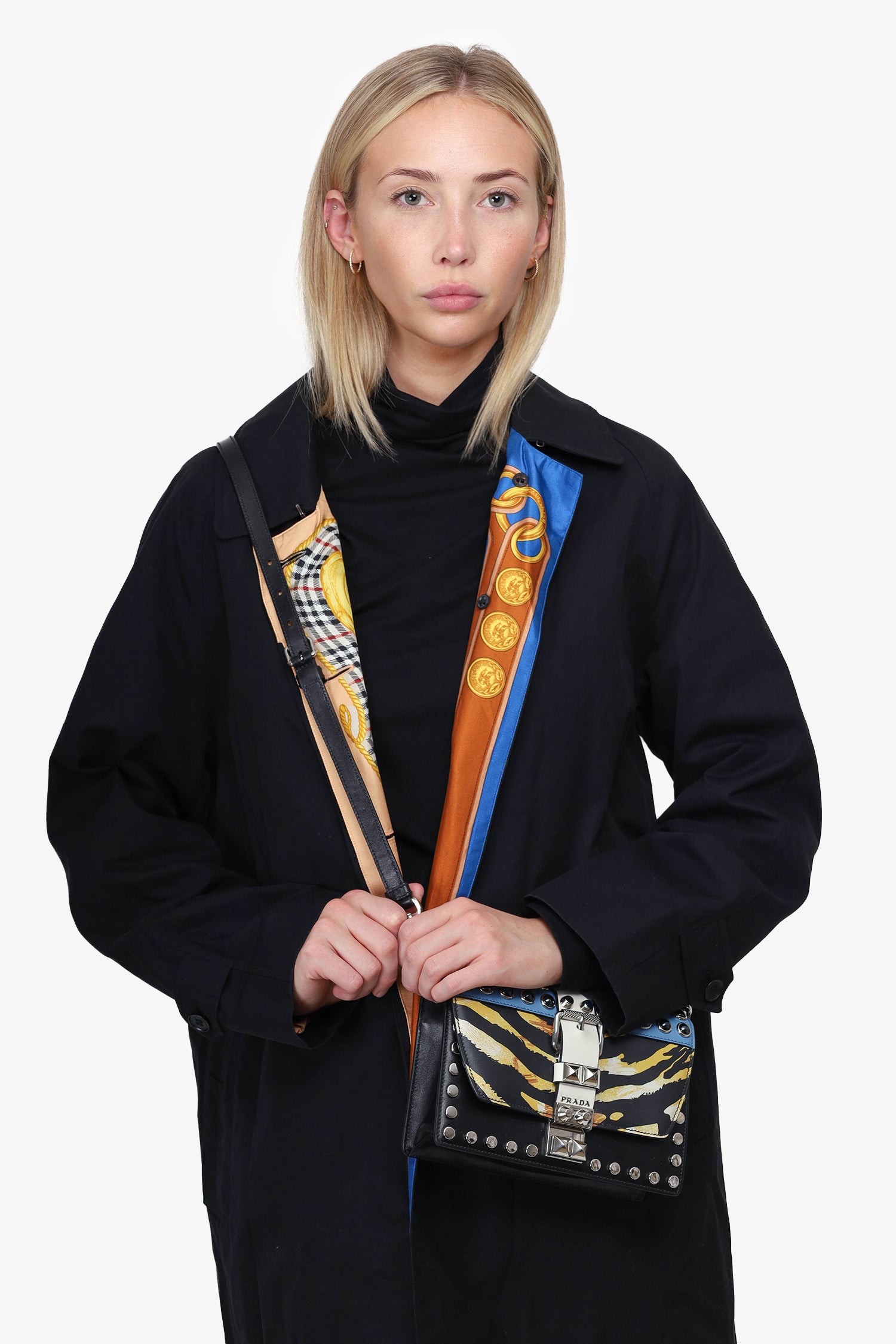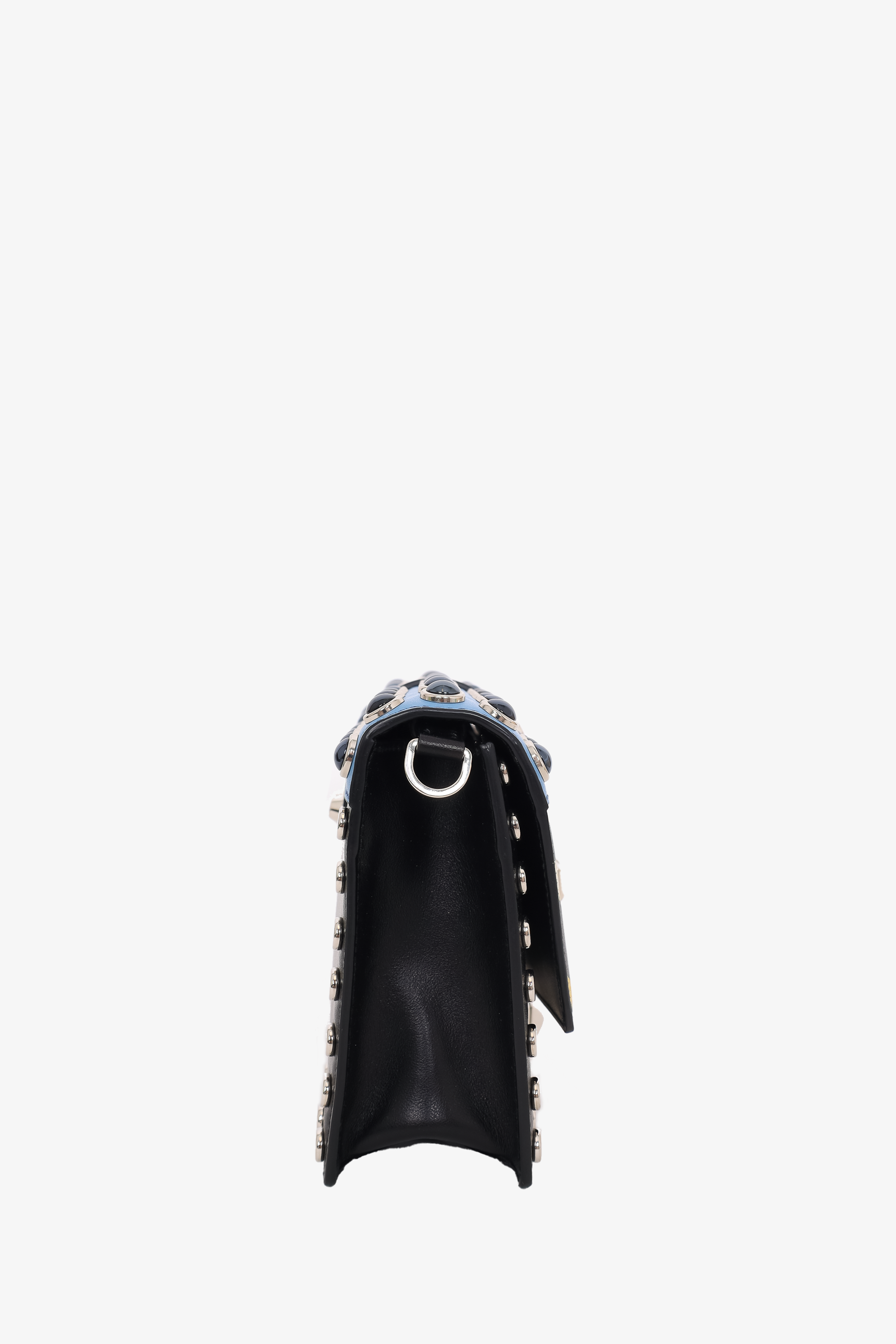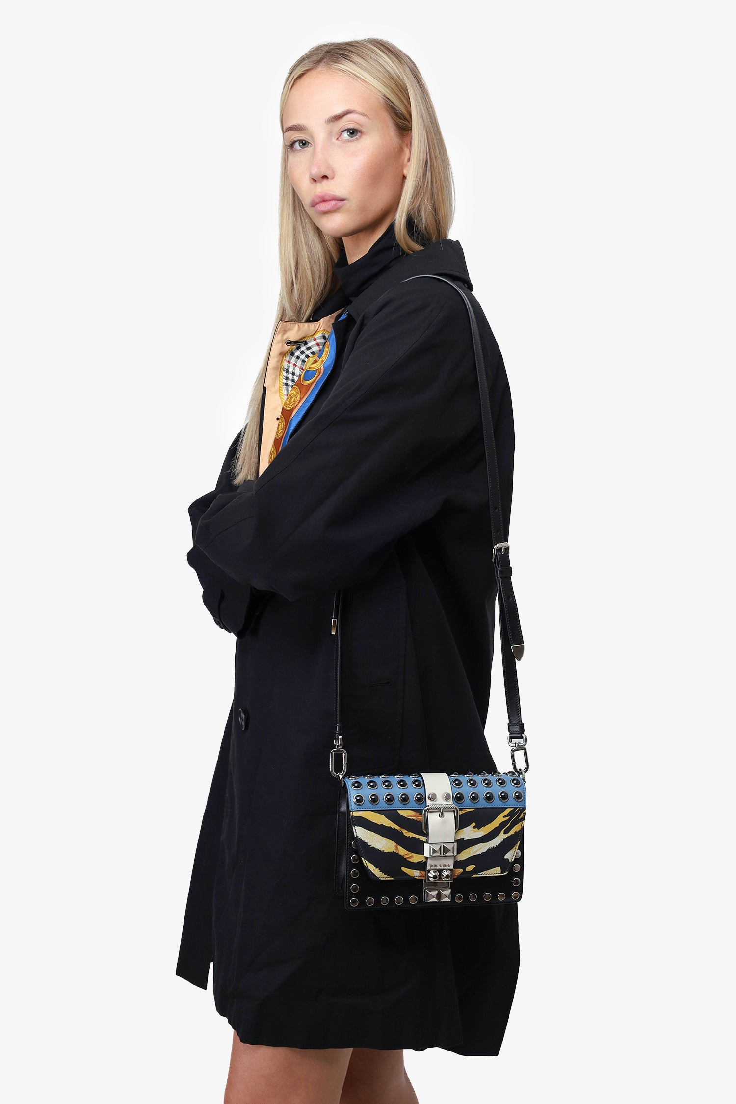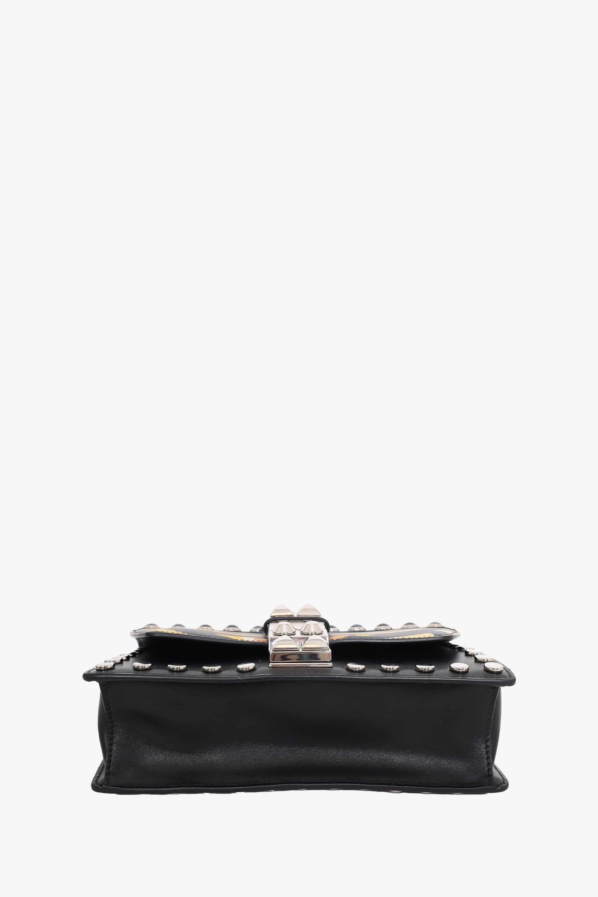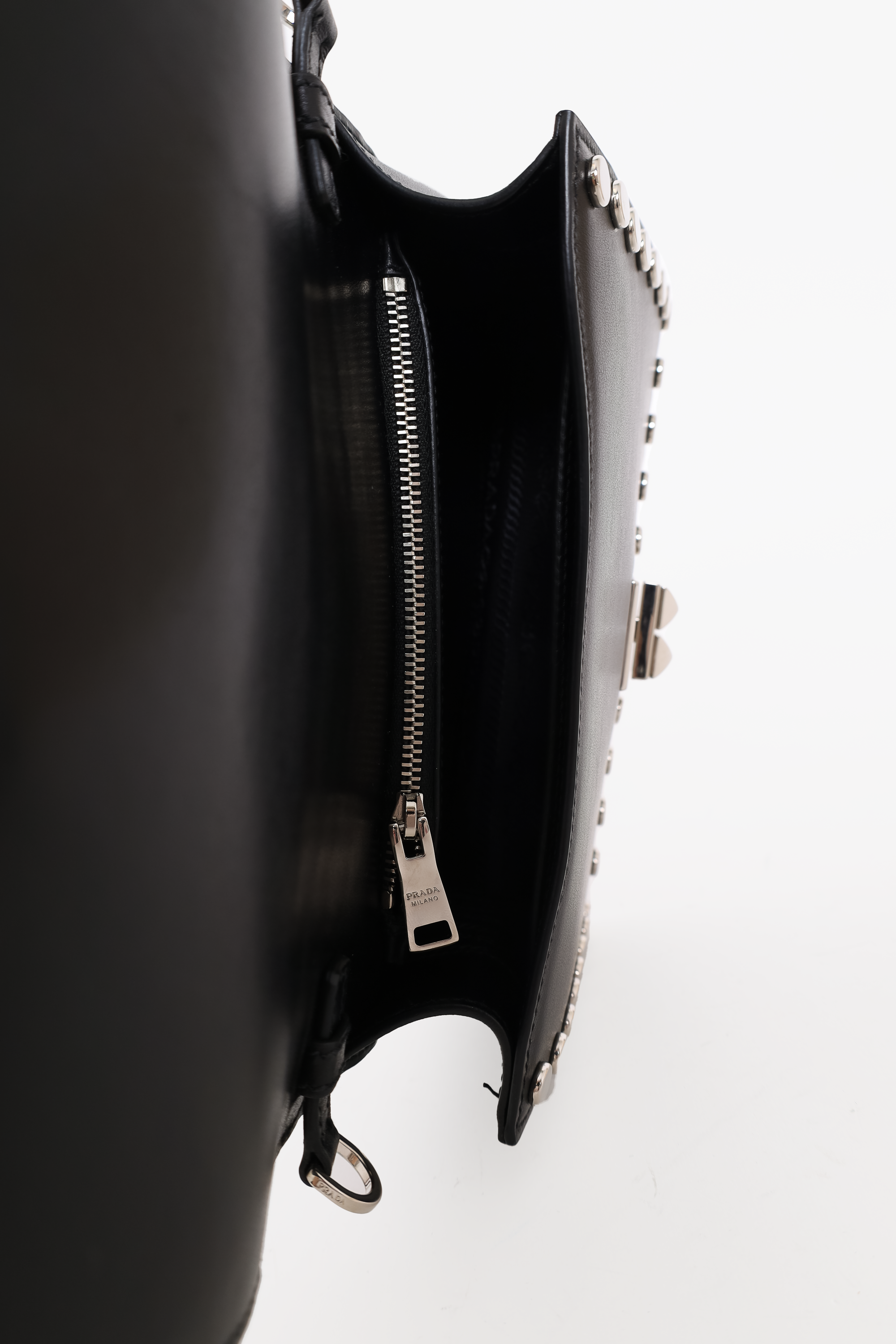 Refresh availabilityPrada Black City Calf Elektra Studded Shoulder Bag. Silver-tone hardware. Front flap with slide-lock closure. 1 interior zip pocket. 1 interior slip pocket. Stud detailing. Removable adjustable buckle strap. Tonal stitching.