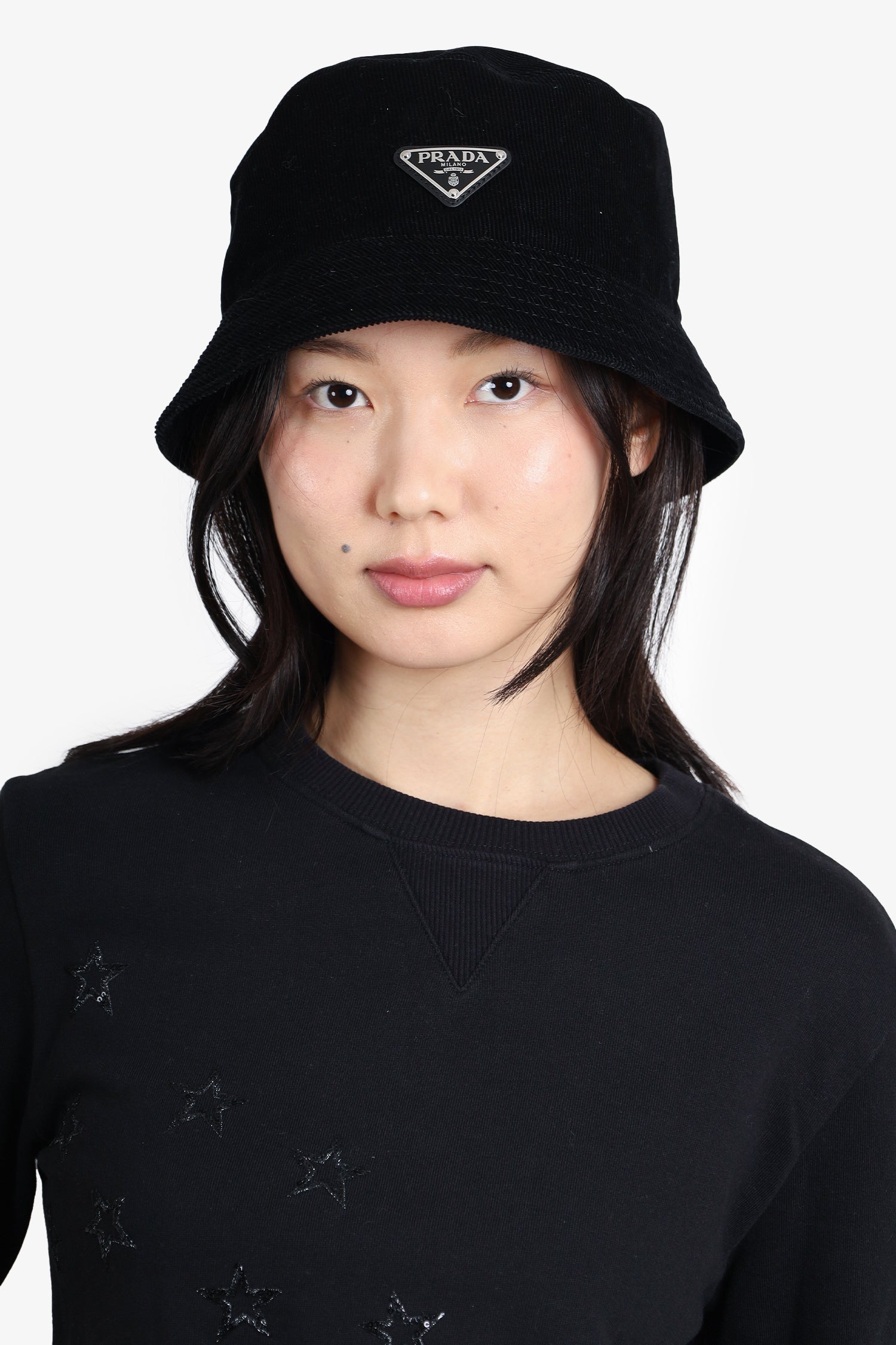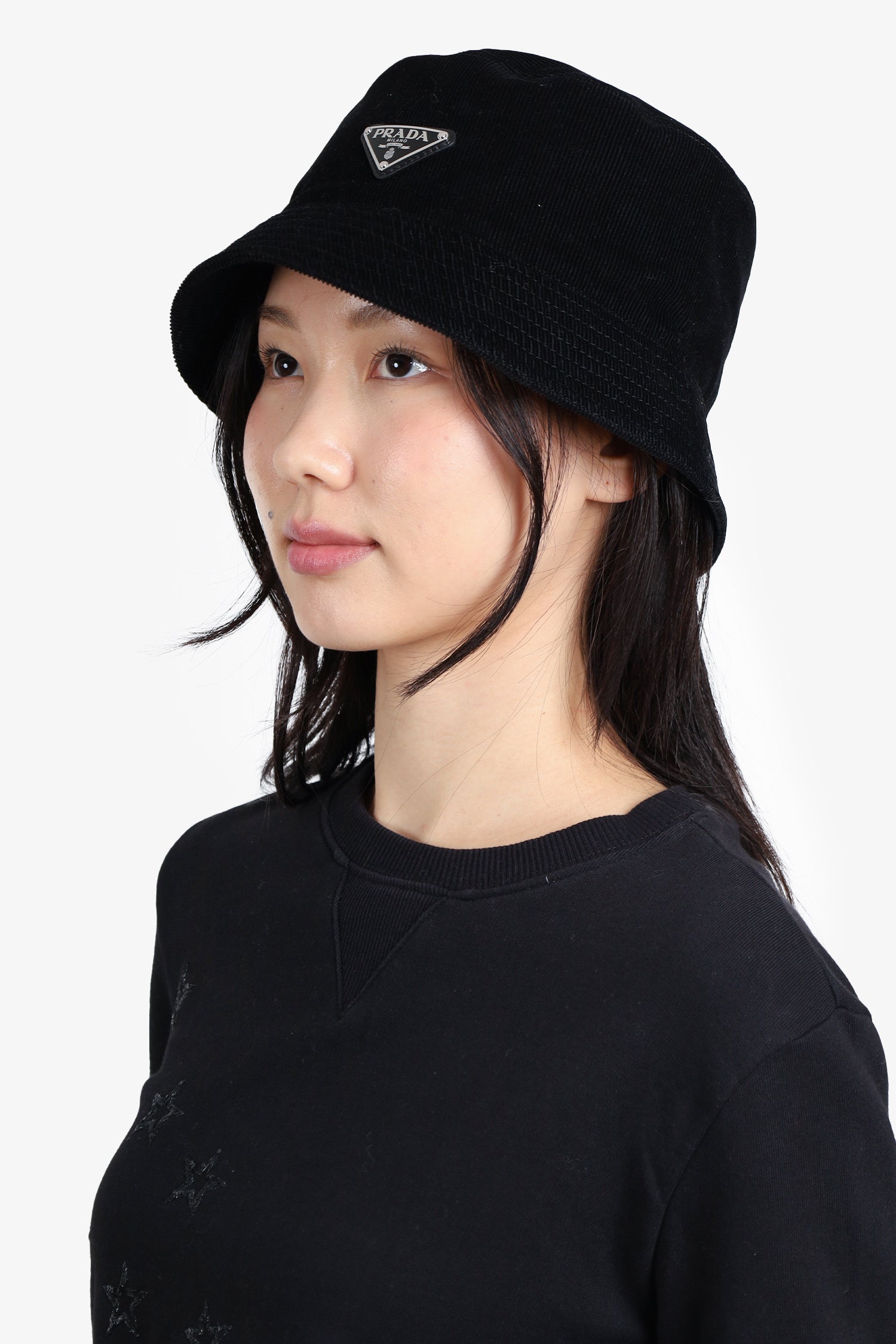 Refresh availabilityPrada Black Corduroy Triangle Logo Bucket Hat. Lined. Tonal stitching.