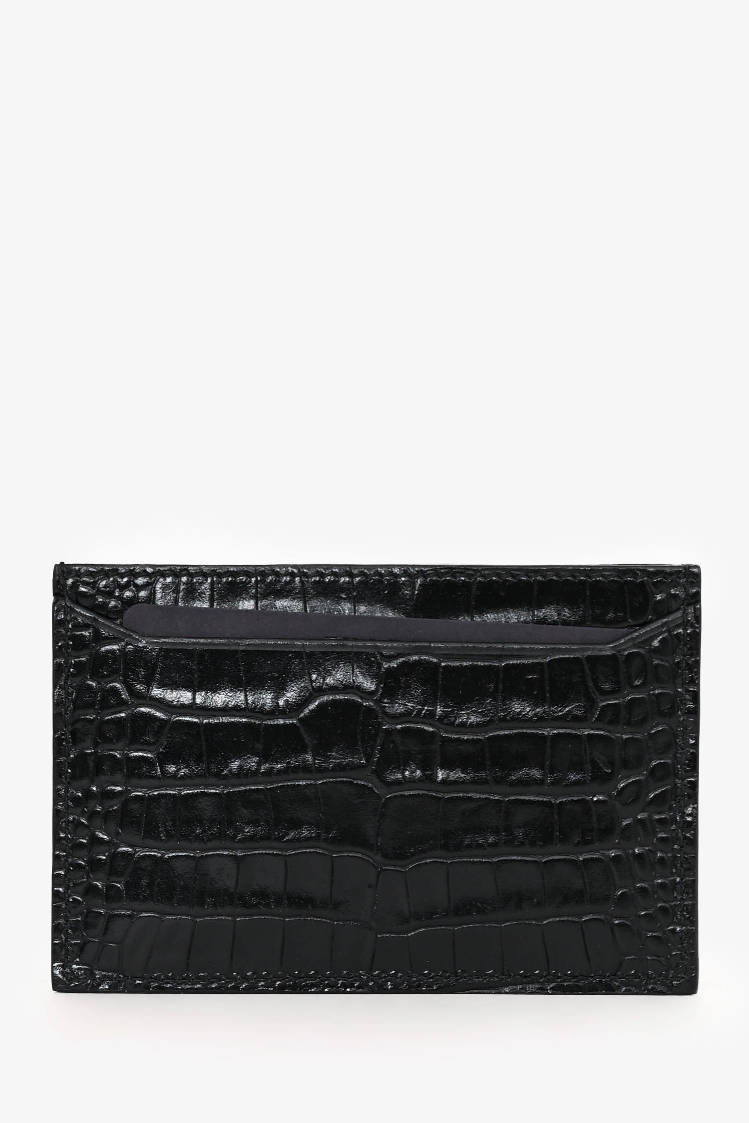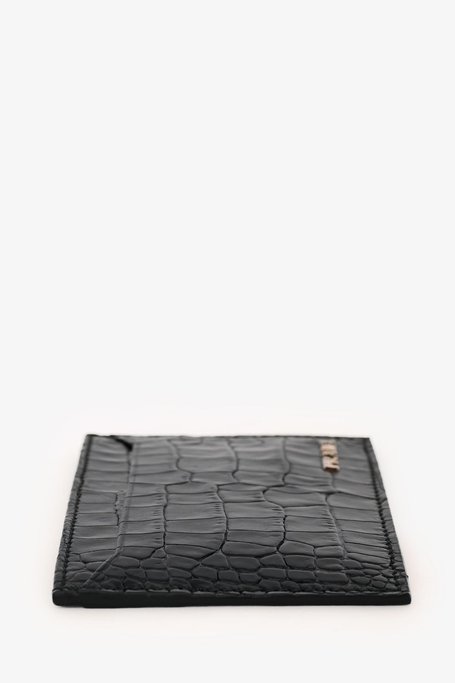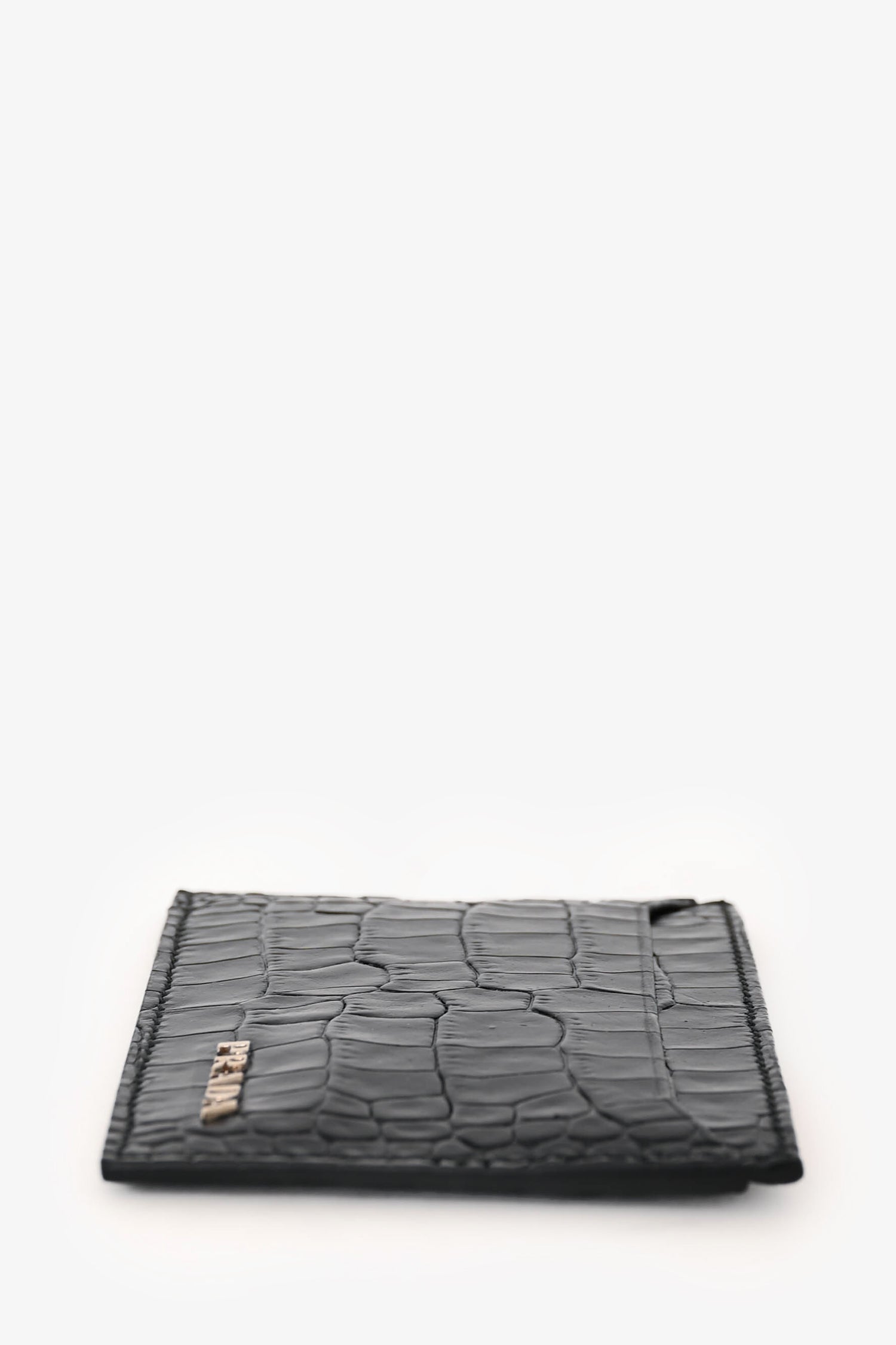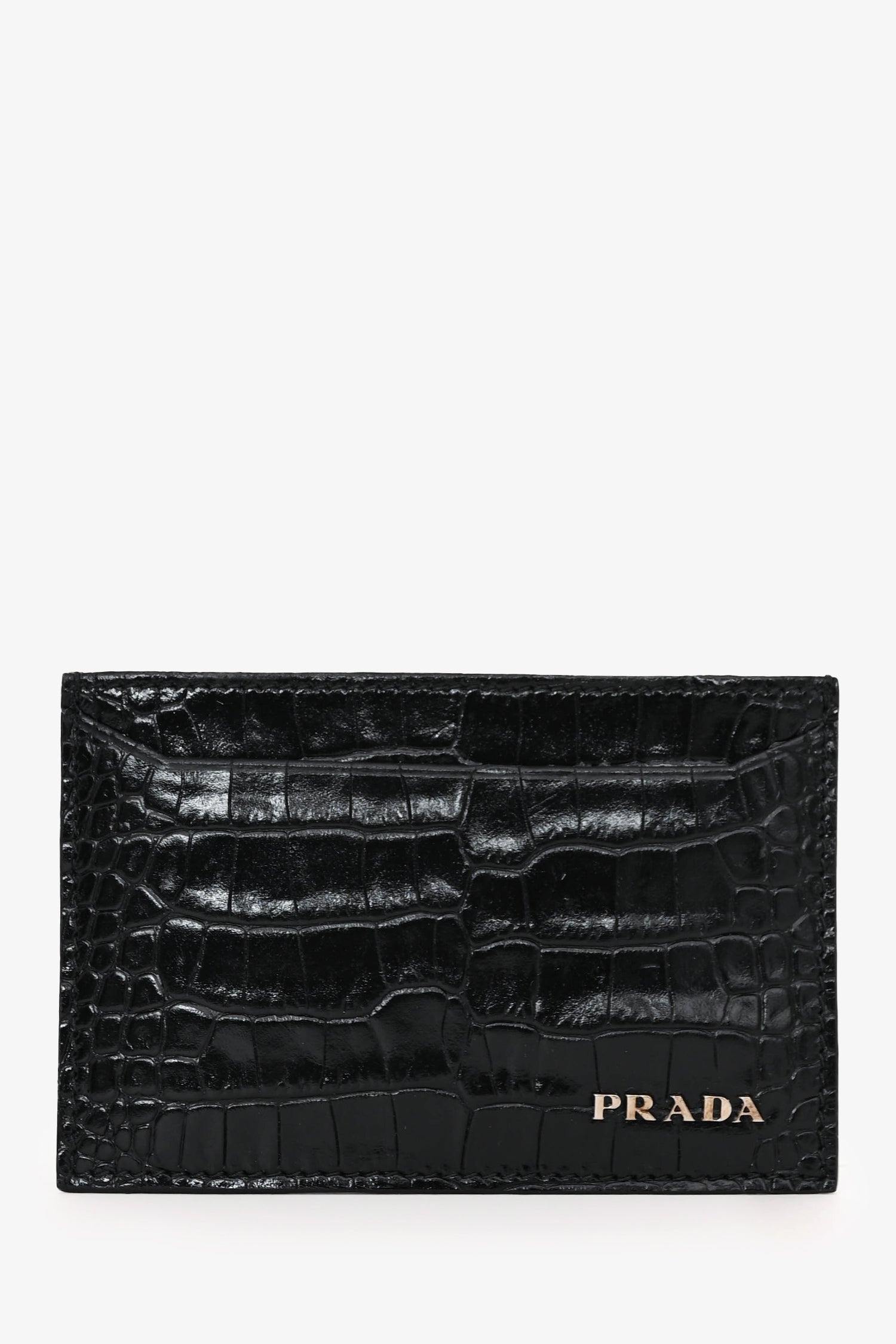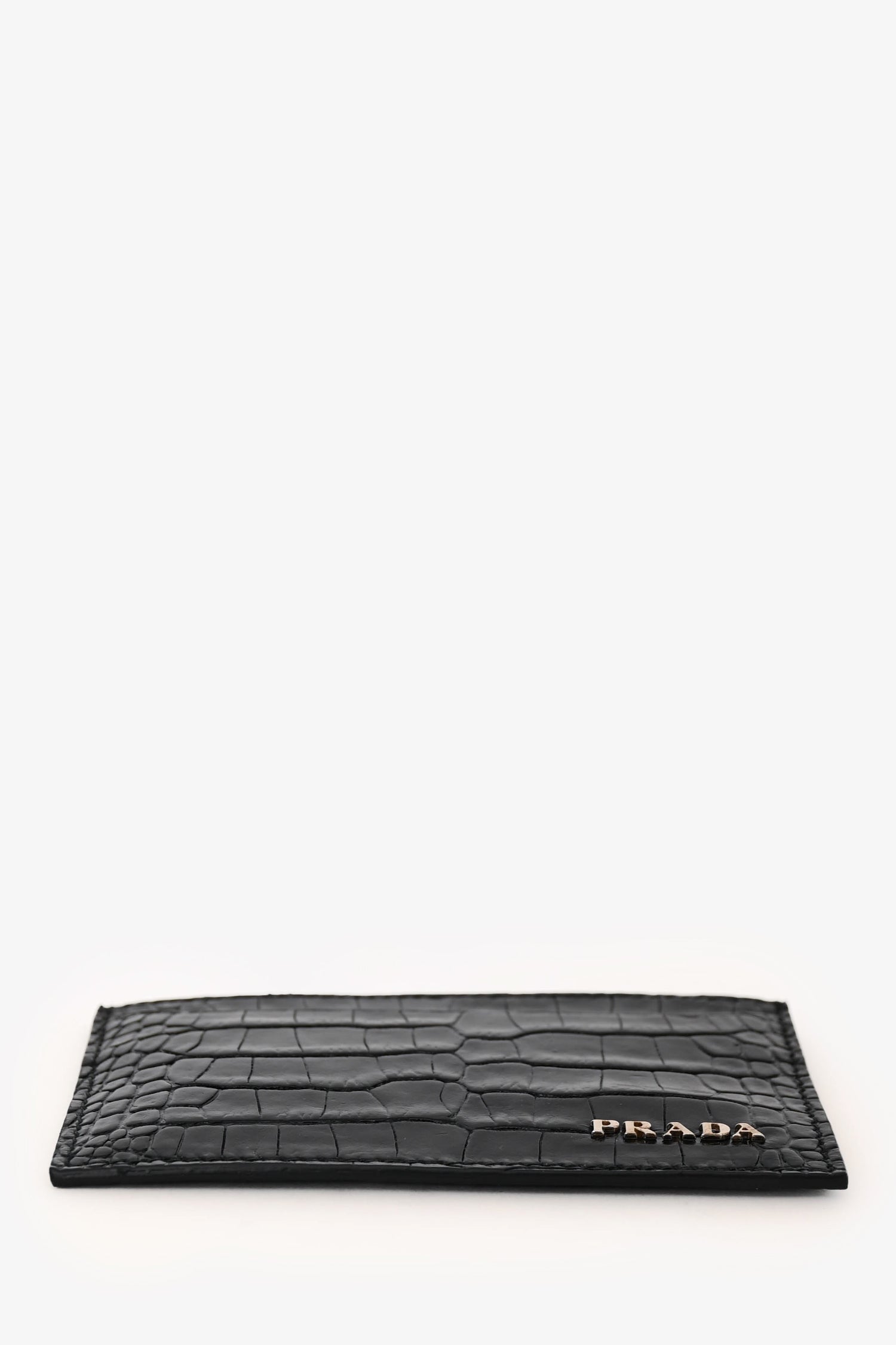 Refresh availabilityPrada Black Croc Embossed Leather Card Holder. 1 middle pocket. 2 card slots on either side. Silver-tone hardware. Tonal stitching.