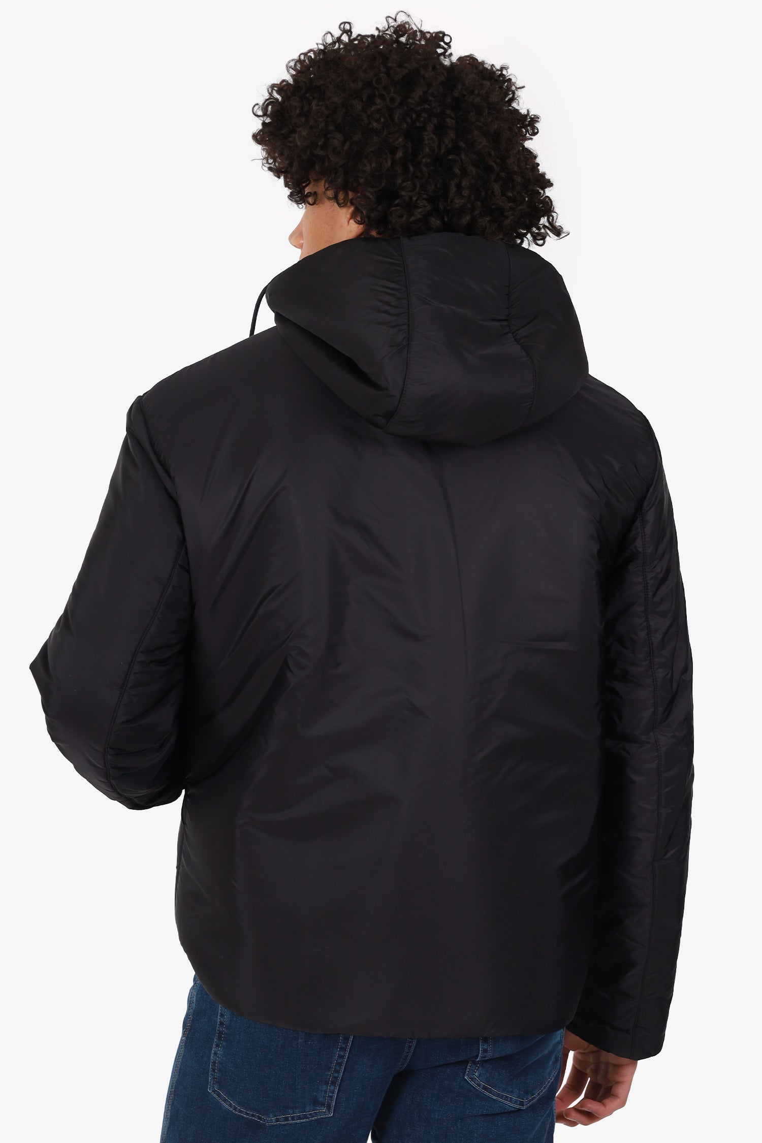 Refresh availabilityPrada Black Down Hooded Puffer Jacket. Pull-on. Hooded neckline with drawstring. Front zip-up closure. 2 exterior front slip pockets. Lined interior with 3 pockets; 1 zip, 1 button-up, and 1 snap-button up. Silver-tone hardware.