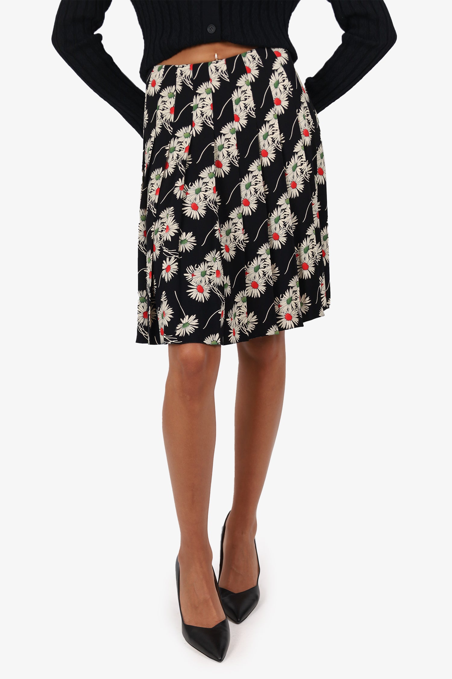 Refresh availabilityPrada Black Floral Print Pleated Mini Skirt. Slip-on. Side zip closure. Tonal stitching.