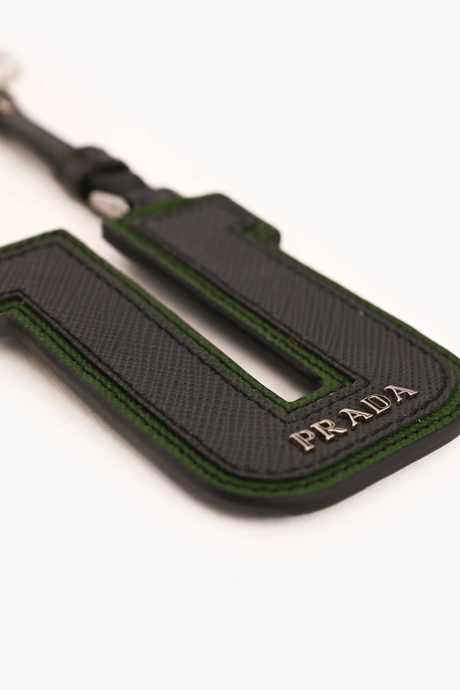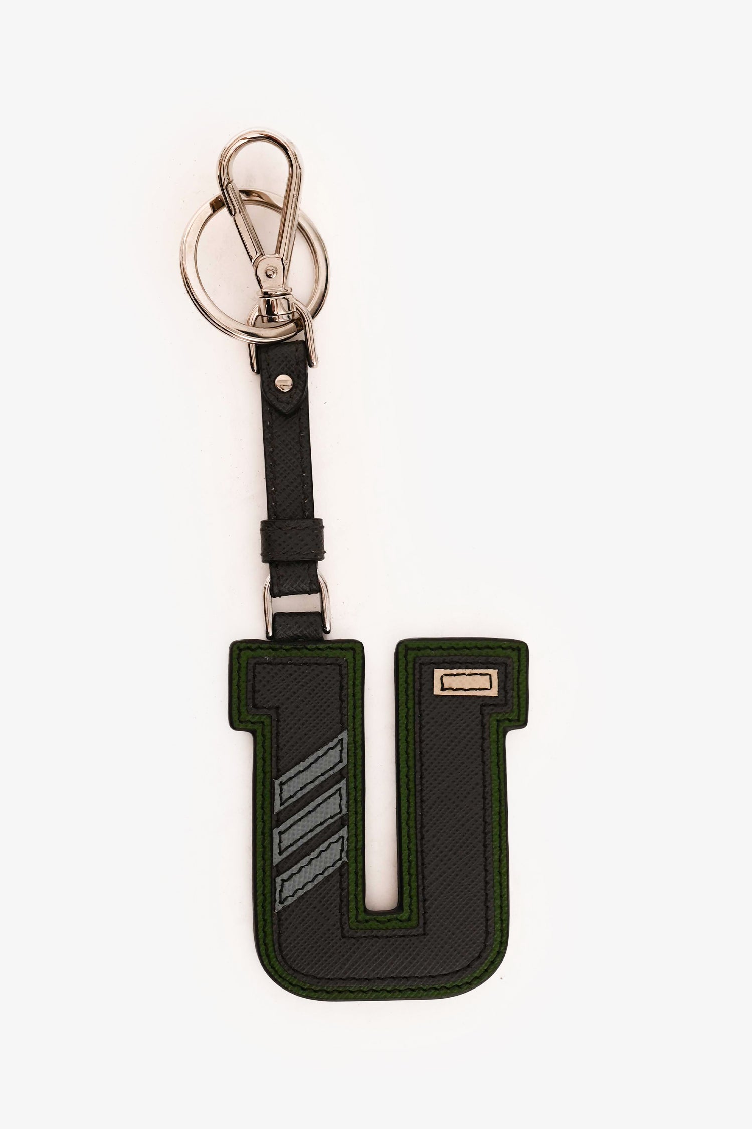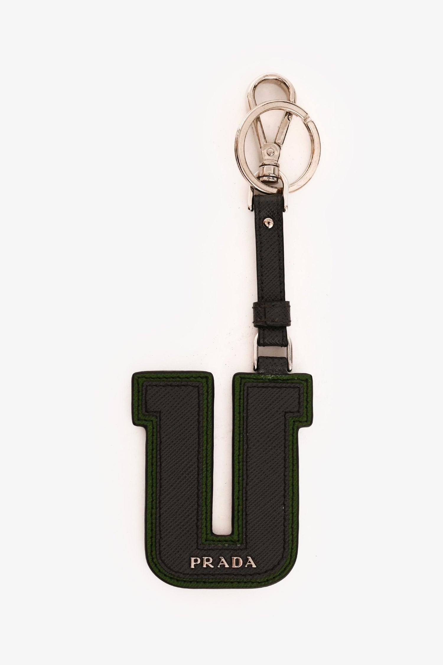 Refresh availabilityPrada Black/Green Saffiano Leather 'U' Key Chain. Silver-tone clasp and keyring. Green and grey-tone leather trimming. Coated trimming. Tonal stitching.