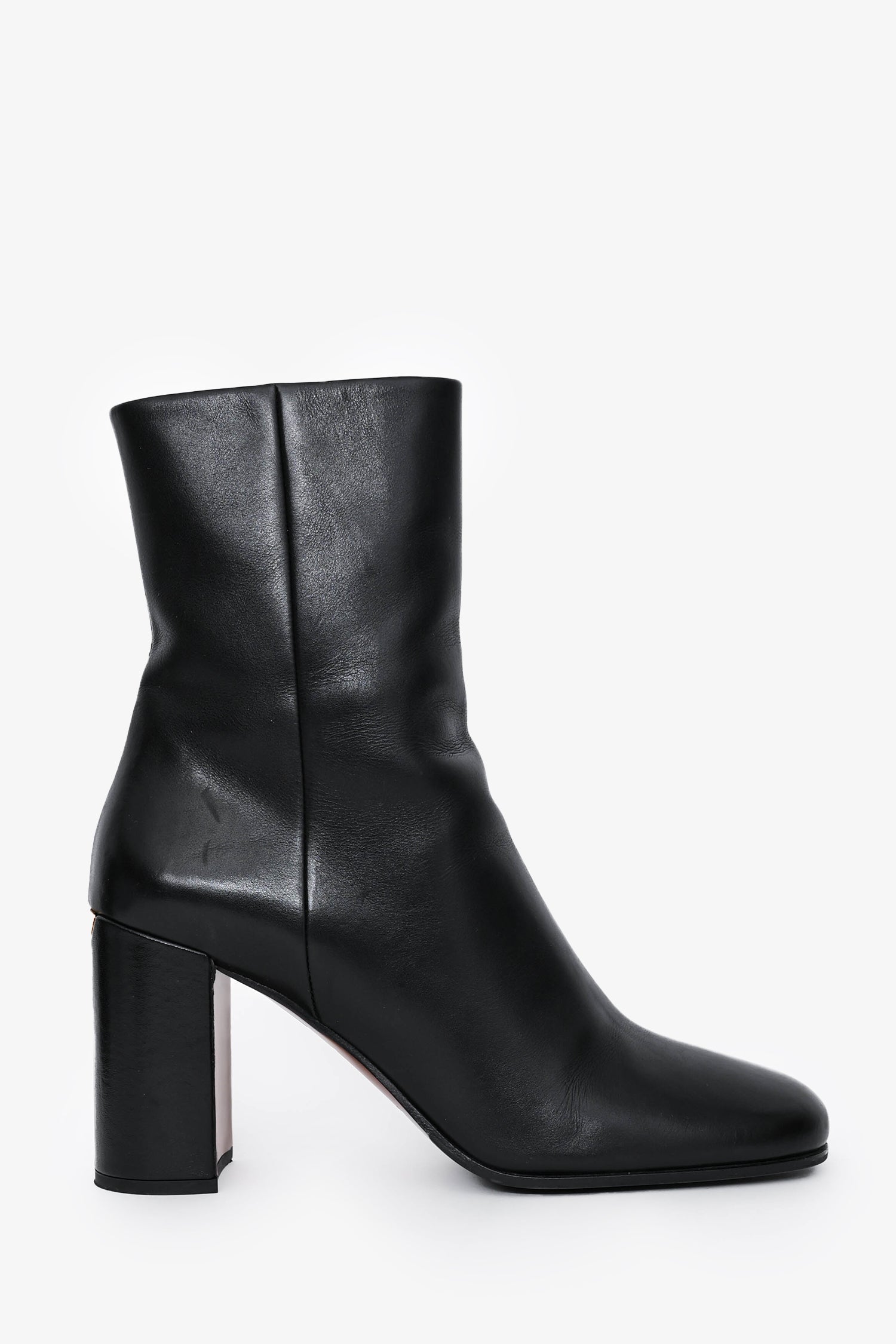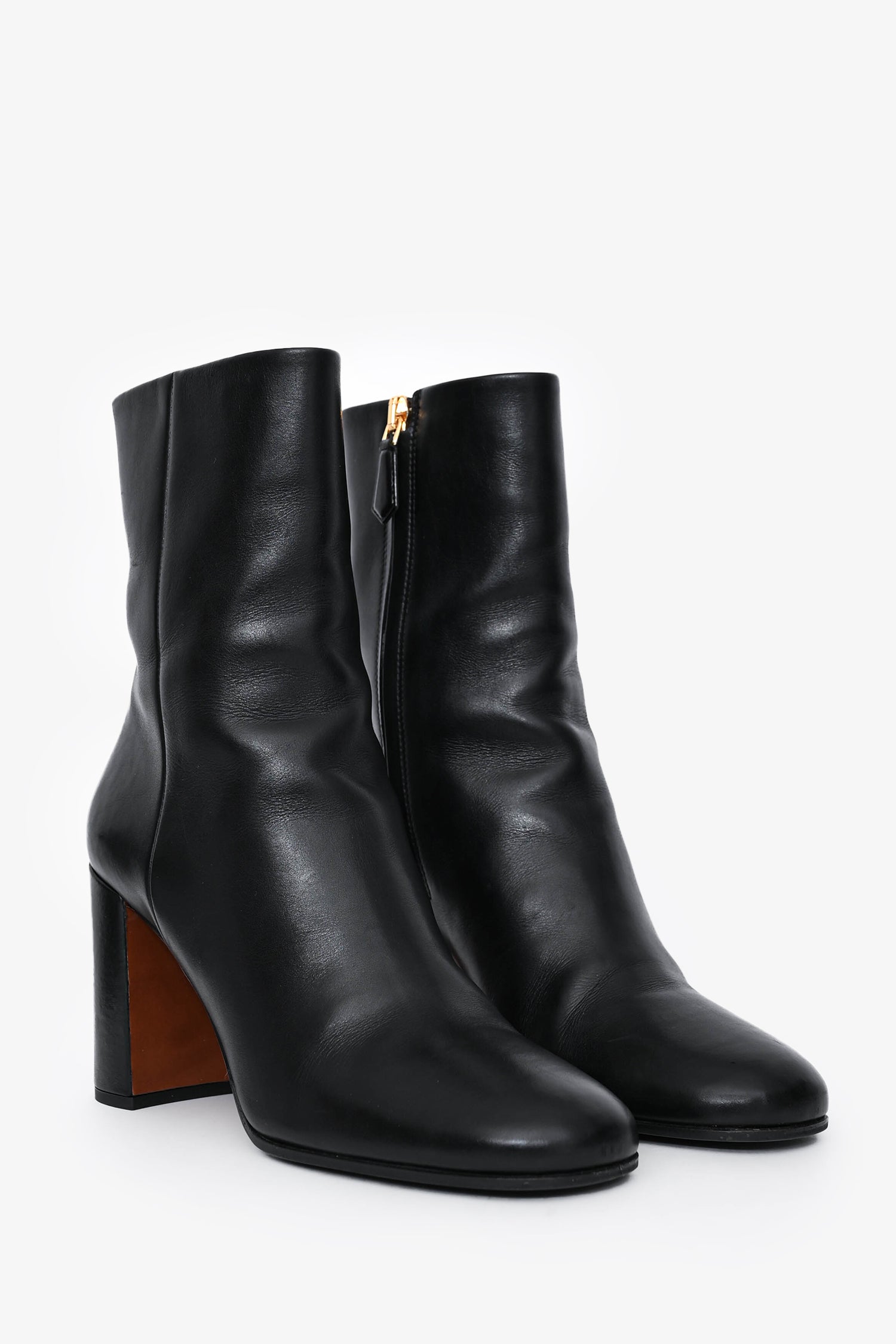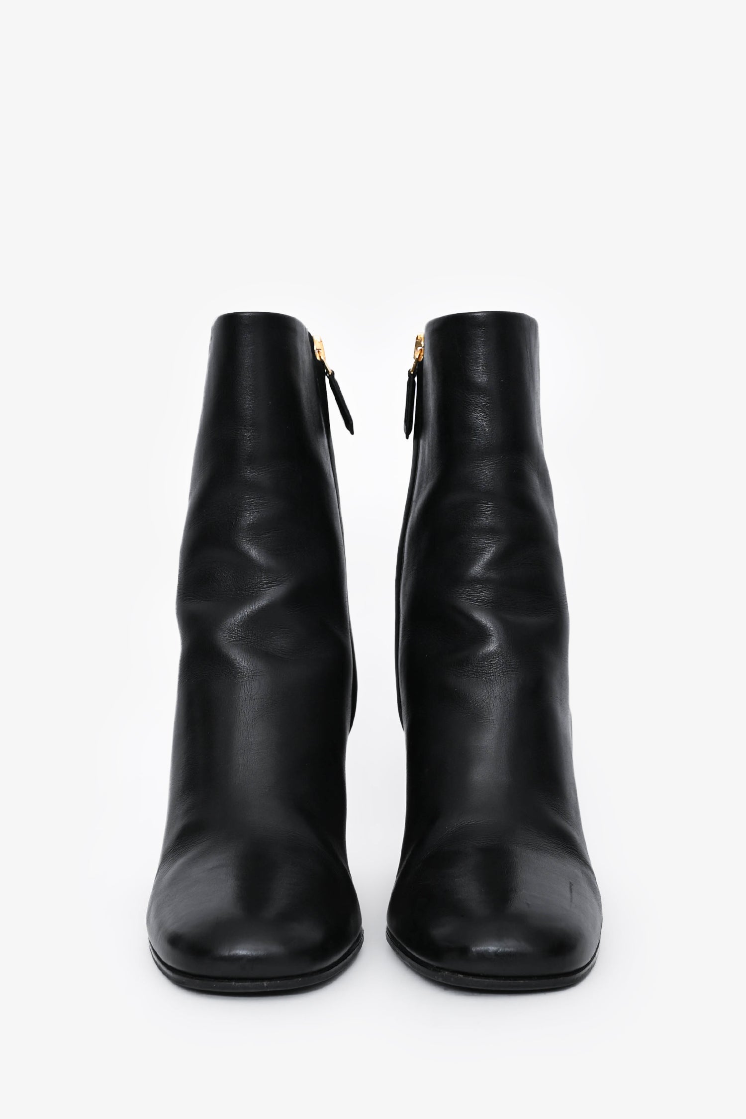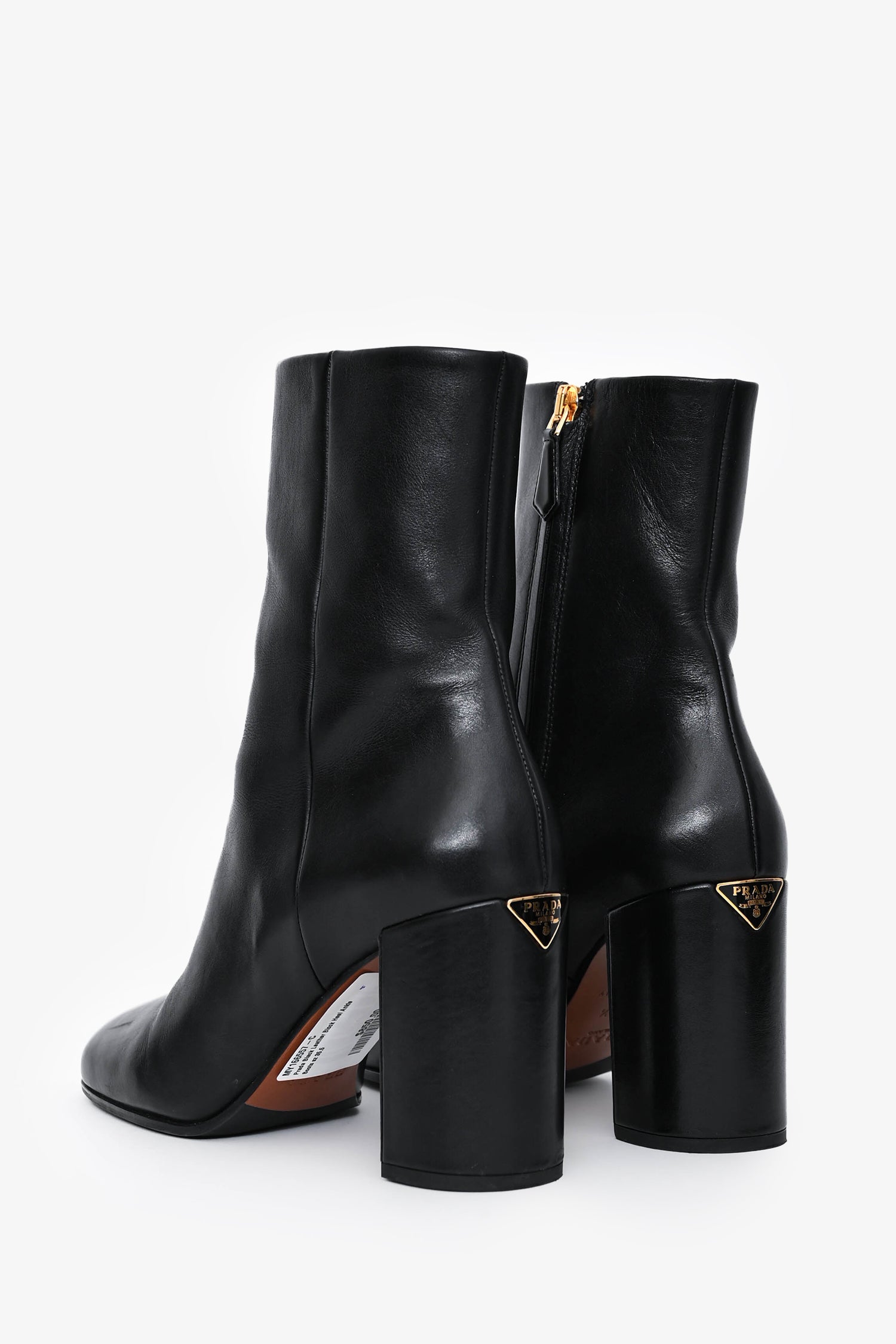 Refresh availabilityPrada Black Leather Block Heel Ankle Boots. Round toe. Side zip closure. Gold-tone hardware. Branded logo plaque on the heel.