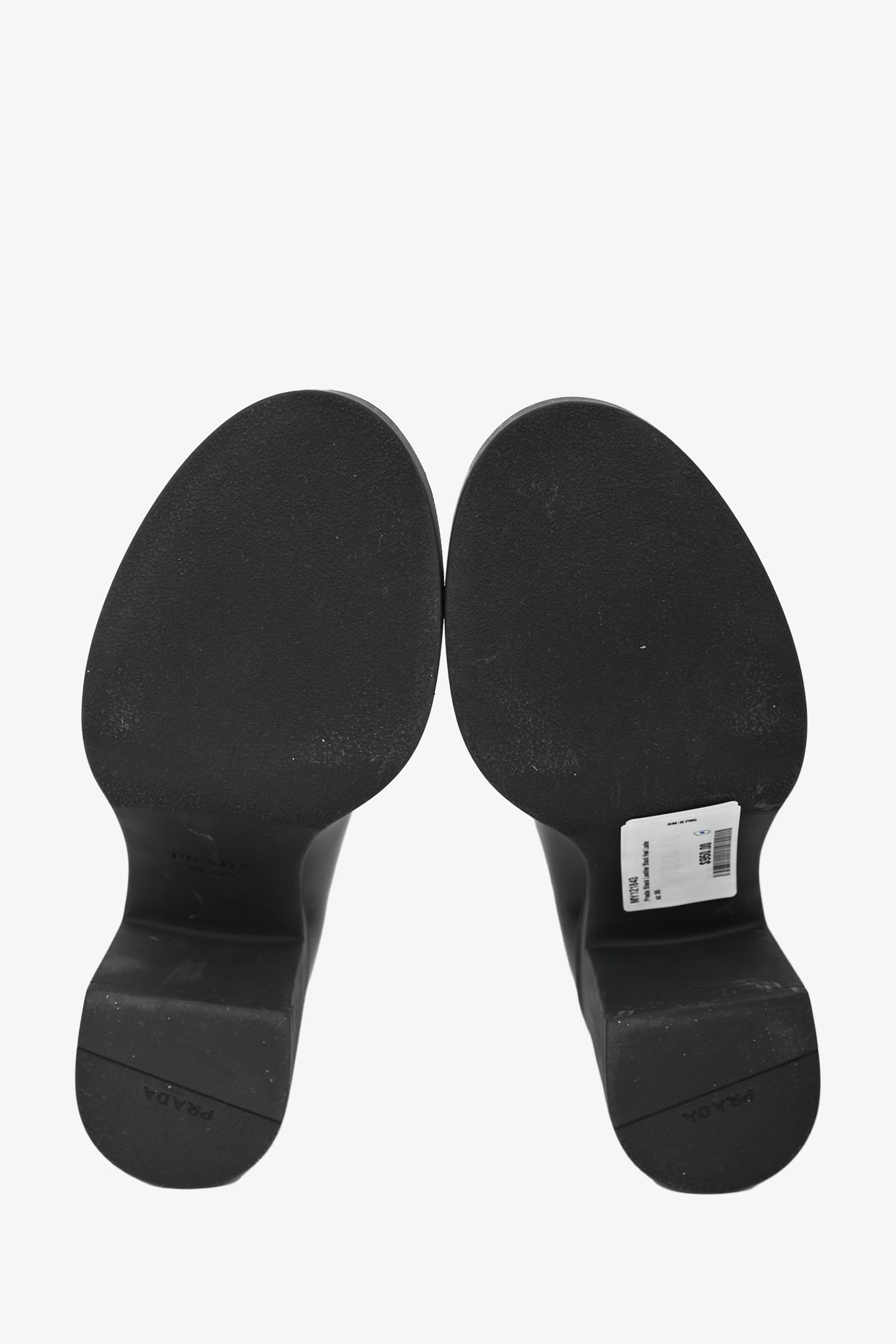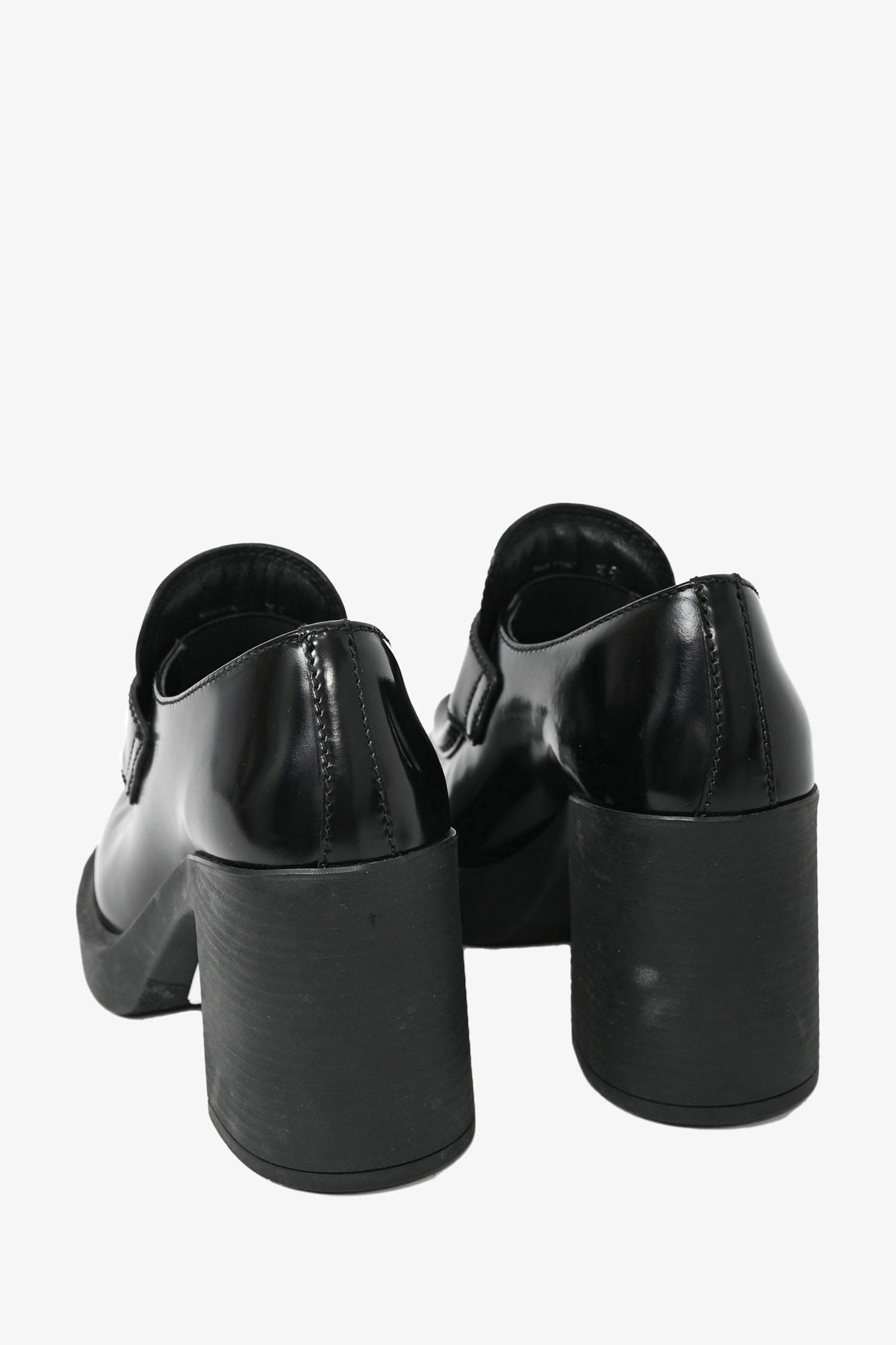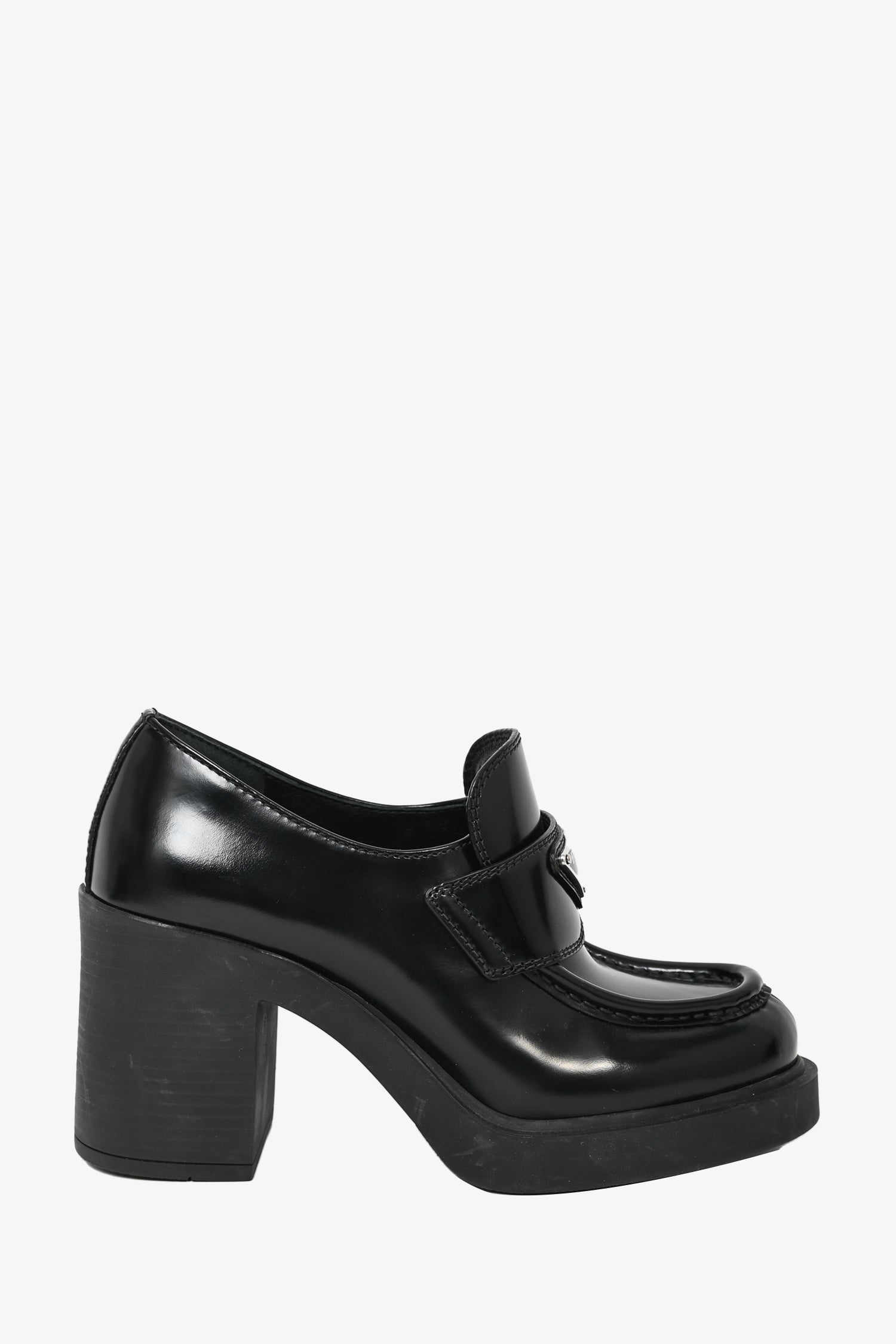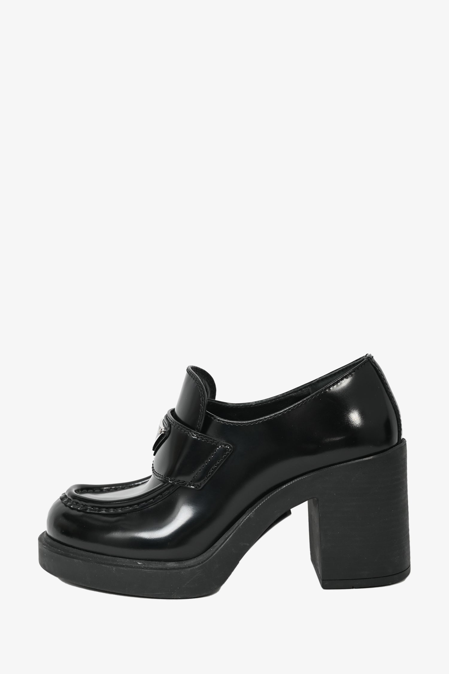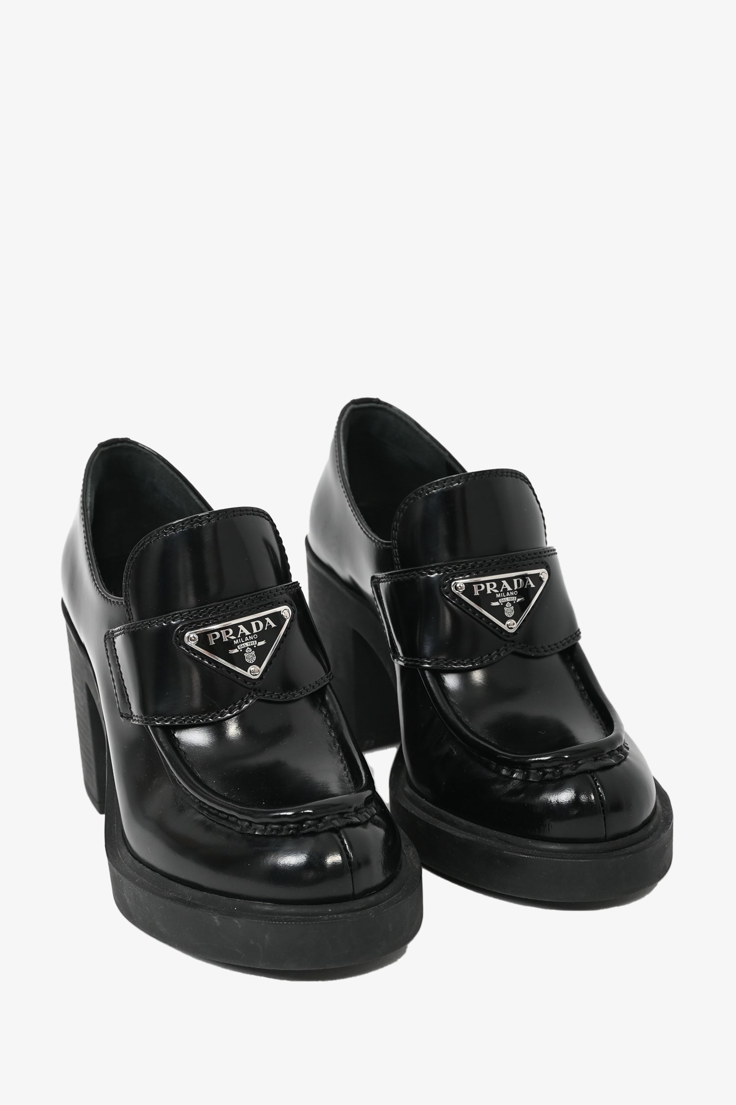 Refresh availabilityPrada Black Leather Block Heel Loafer. Slip on. Round toe. Silver-tone hardware. Tonal stitching.
