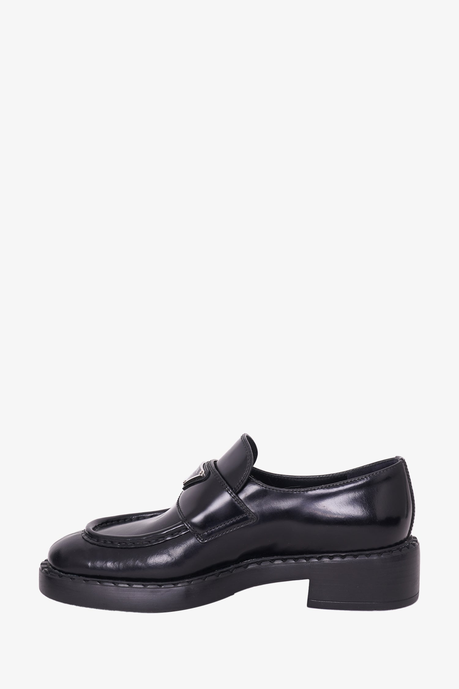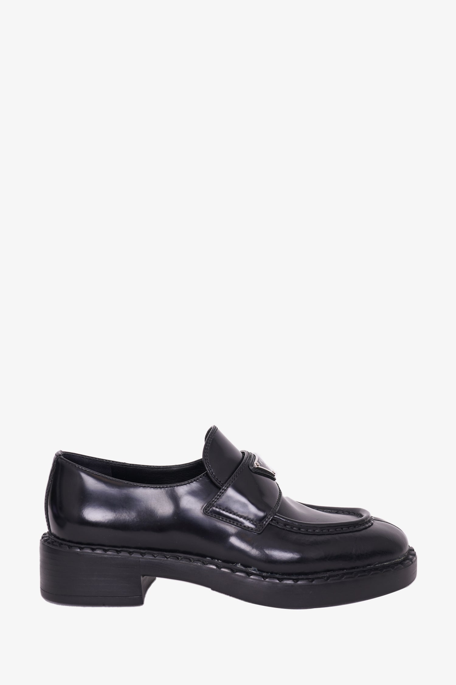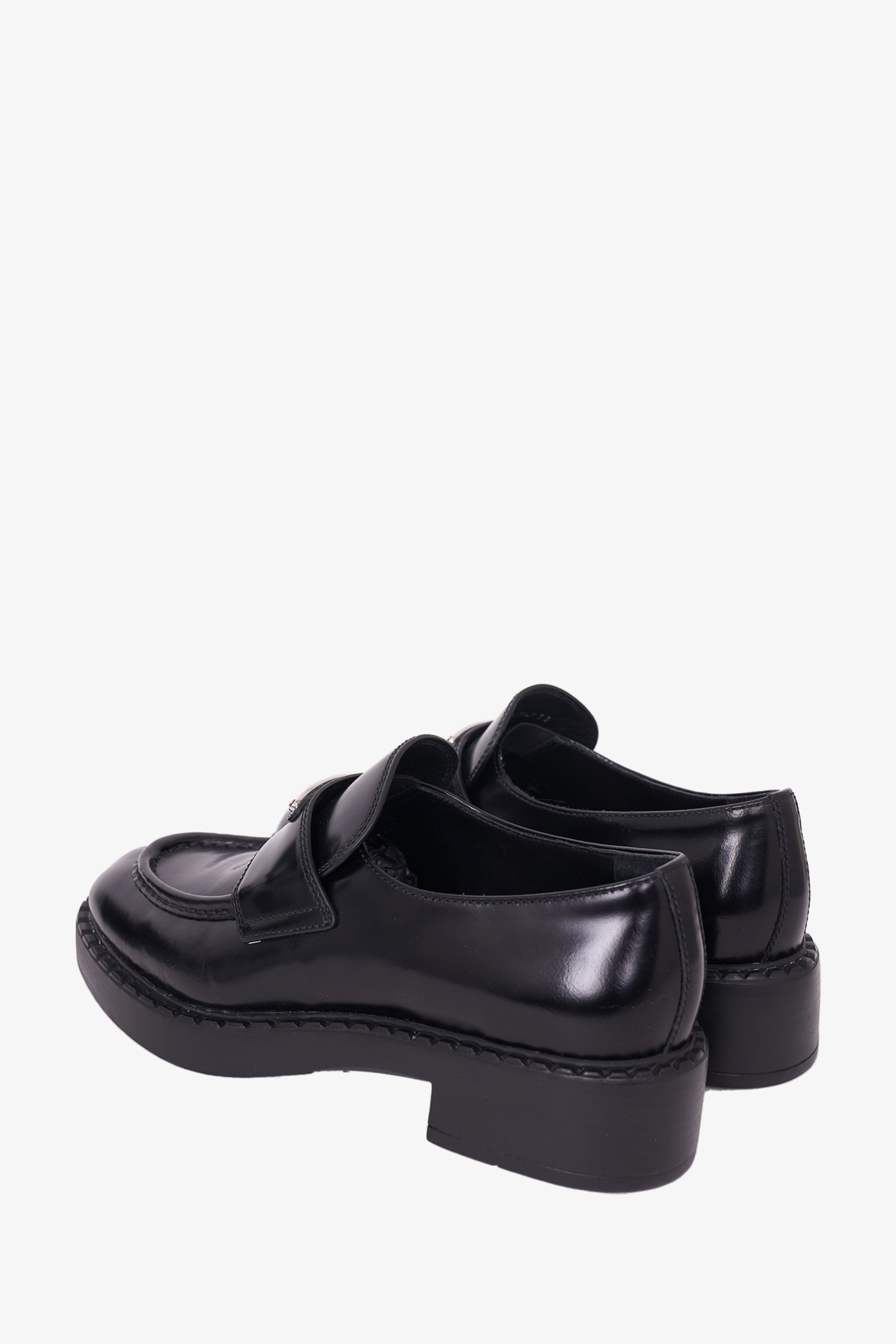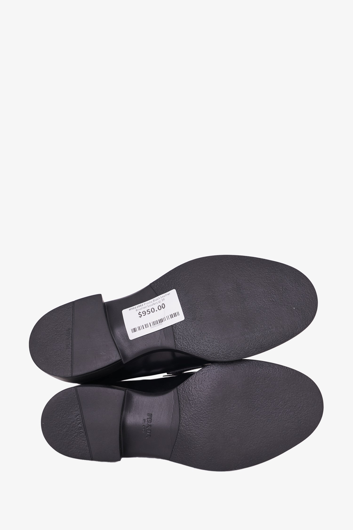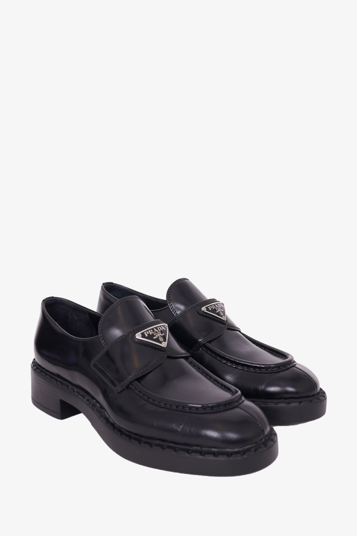 Refresh availabilityPrada Black Leather Brushed Loafers Size 38. Slip on. Almond toe. Silver-tone hardware. Tonal stitching.