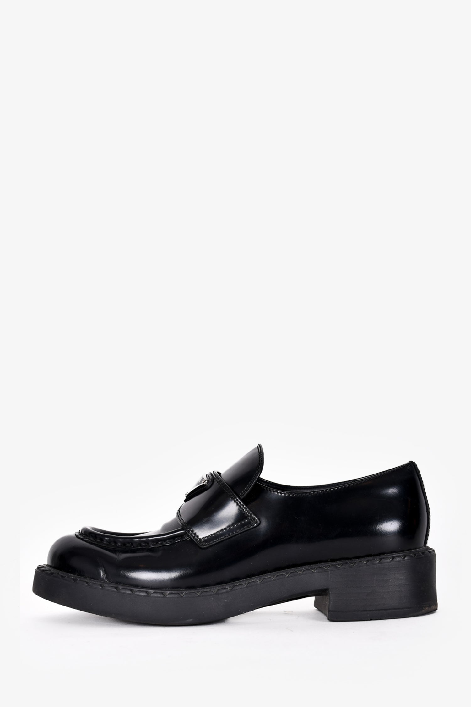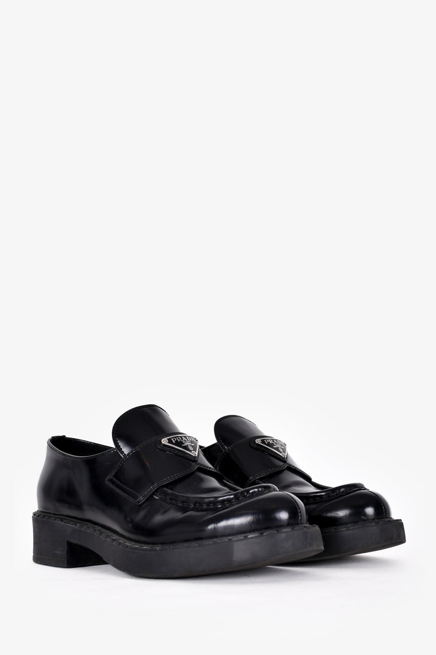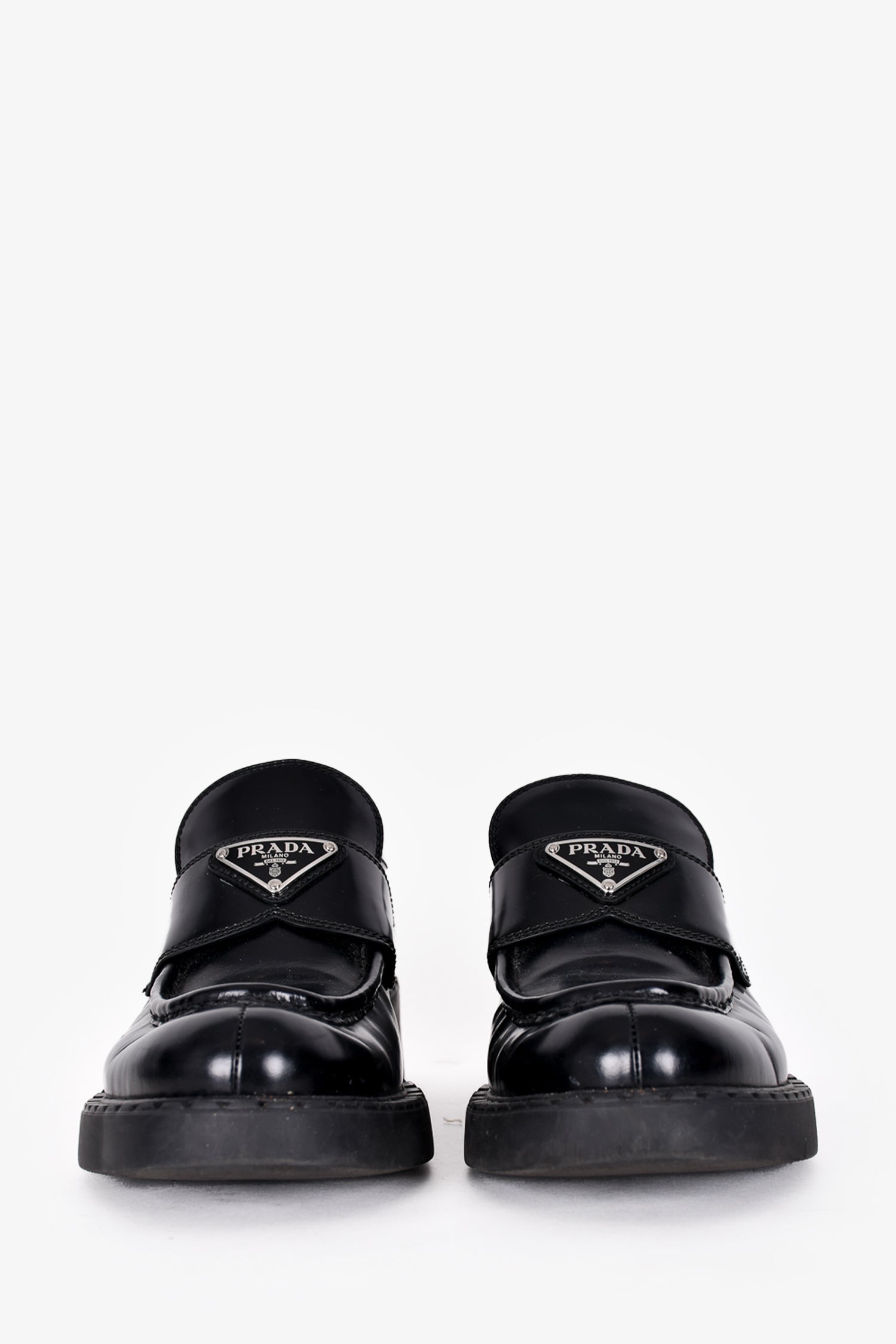 Refresh availabilityPrada Black Leather Brushed Loafers. Slip on. Silver-toned hardware.