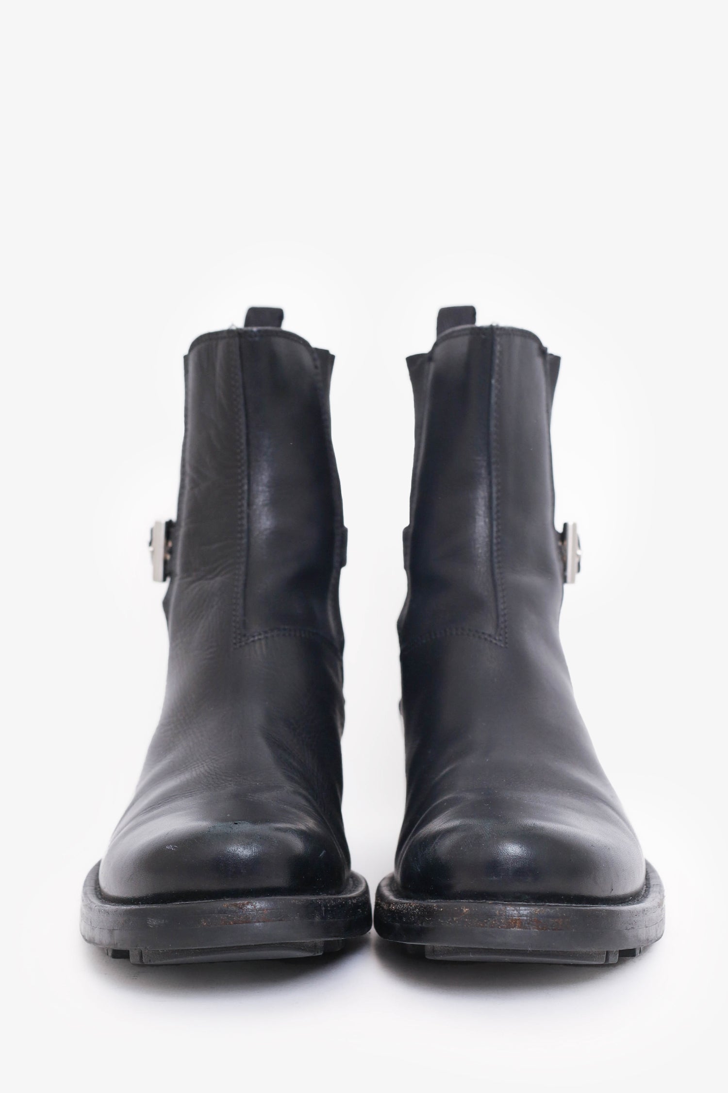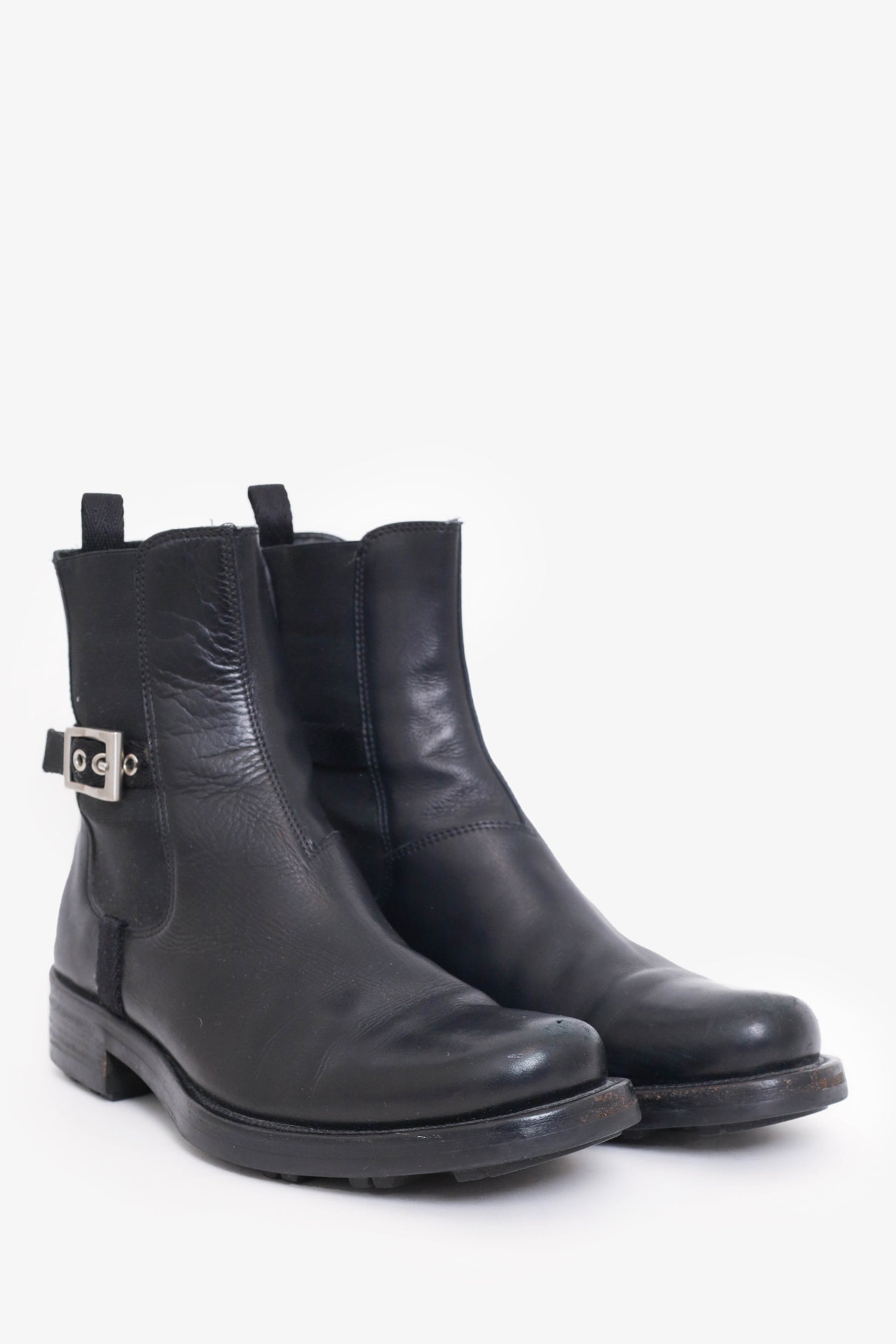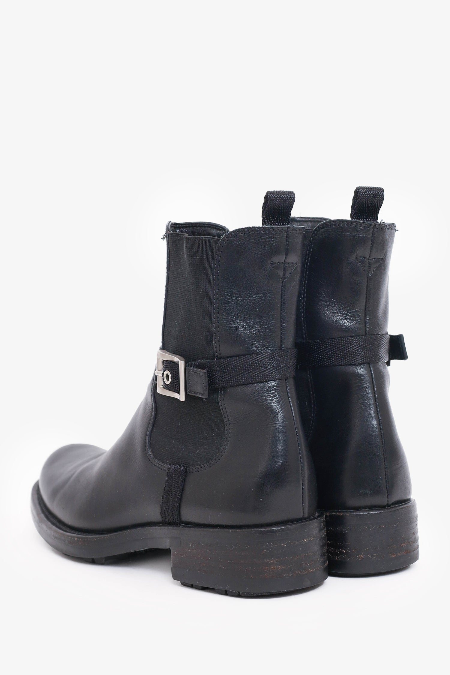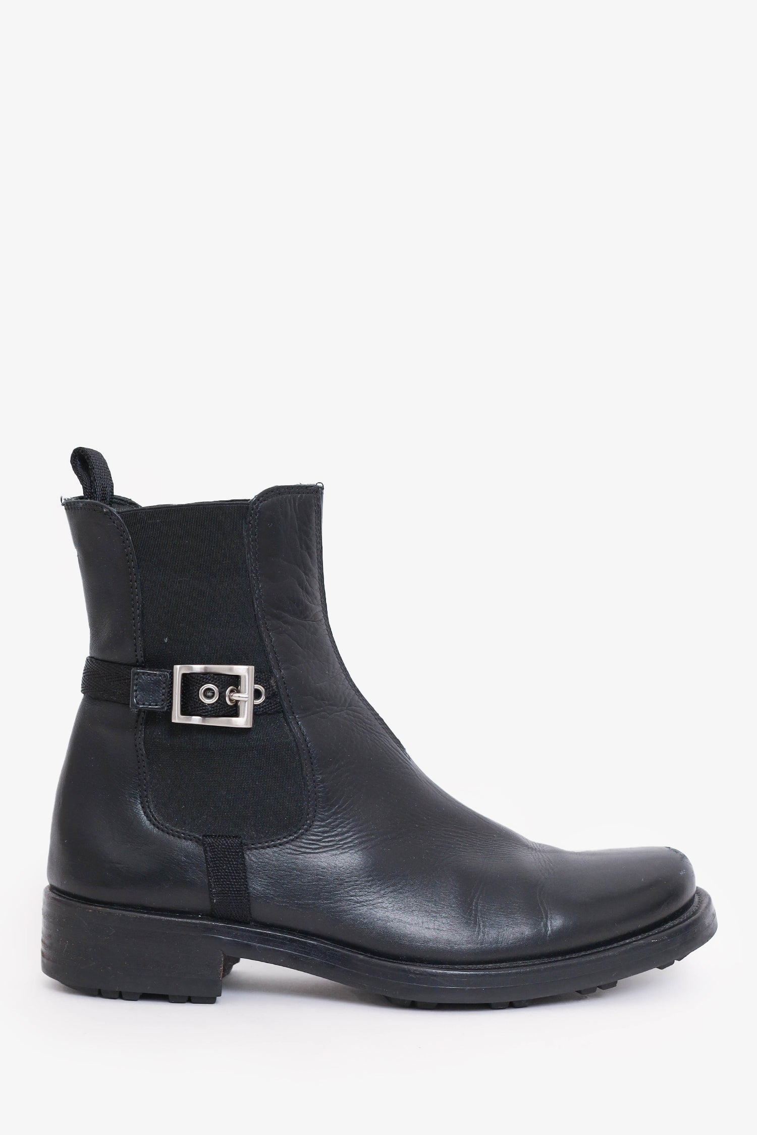 Refresh availabilityPrada Black Leather Buckle Detail Chelsea Boots. Pull-on. Pull tabs on back. Elasticated sides. Round toe. Silver-tone hardware. Tonal stitching.