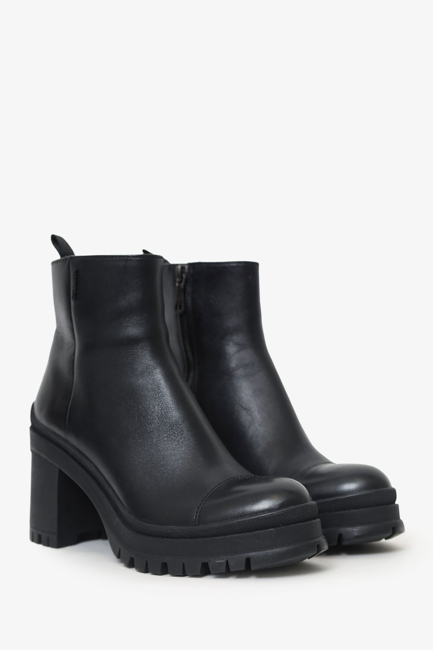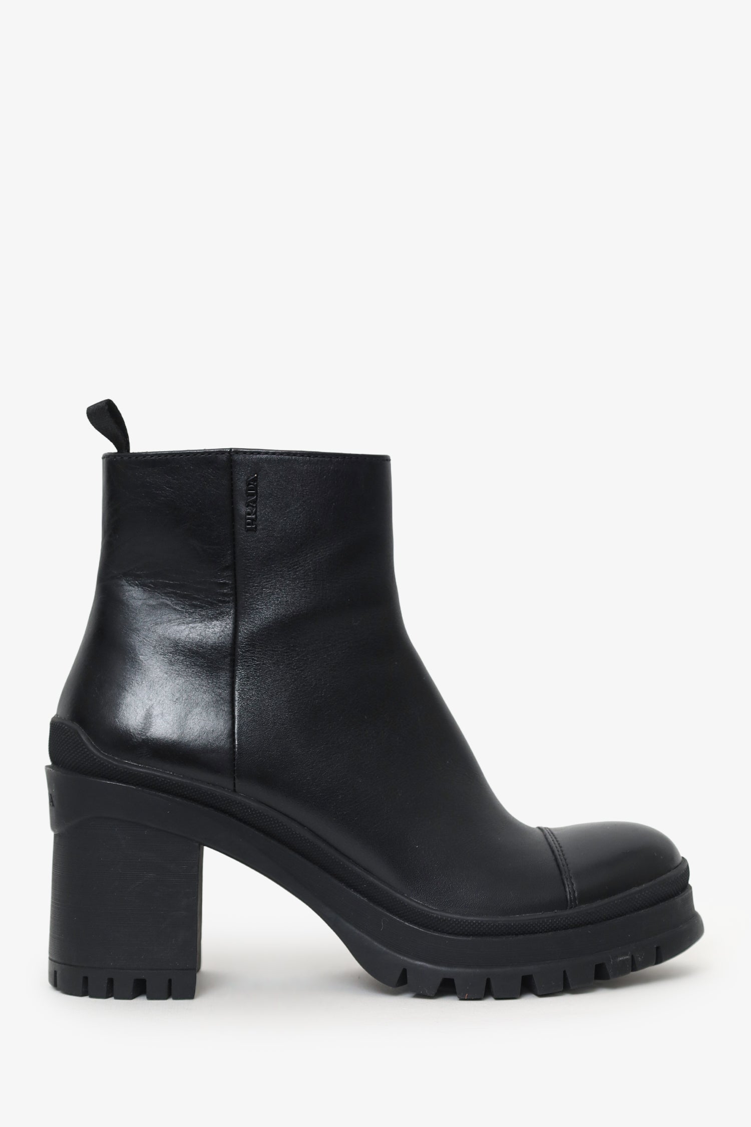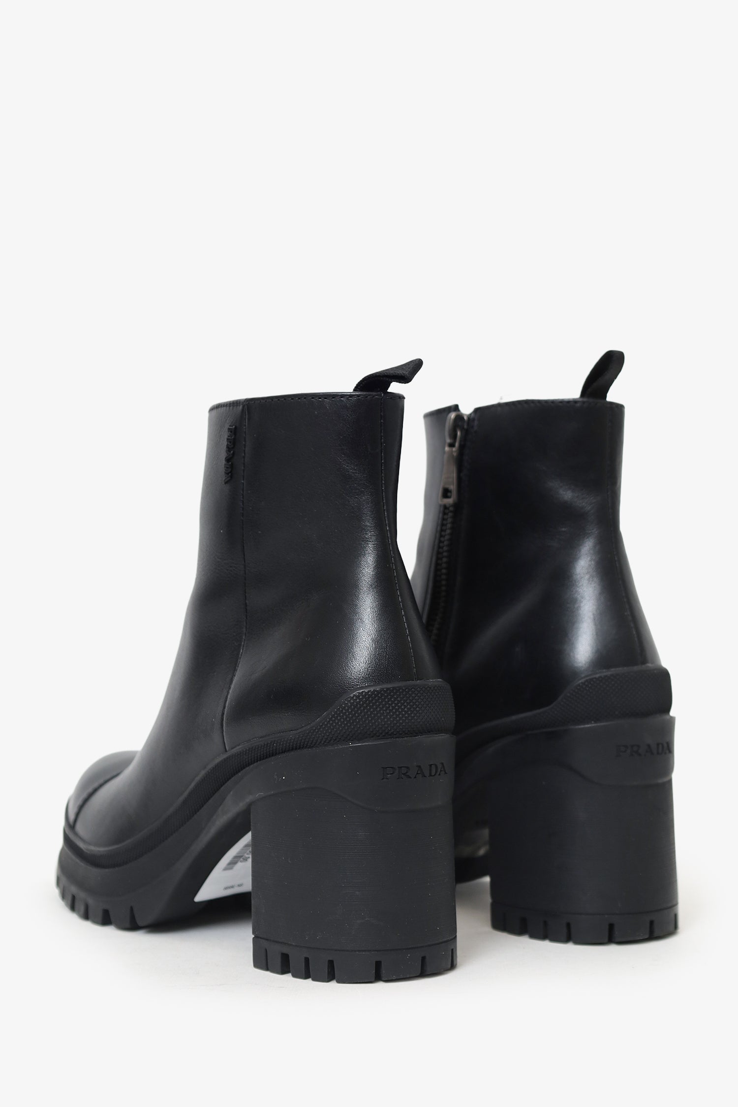 Refresh availabilityPrada Black Leather Chunky Block Heel Boots. Pull-on. Round toe. Side zip closure. Silver-tone hardware. Tonal stitching.