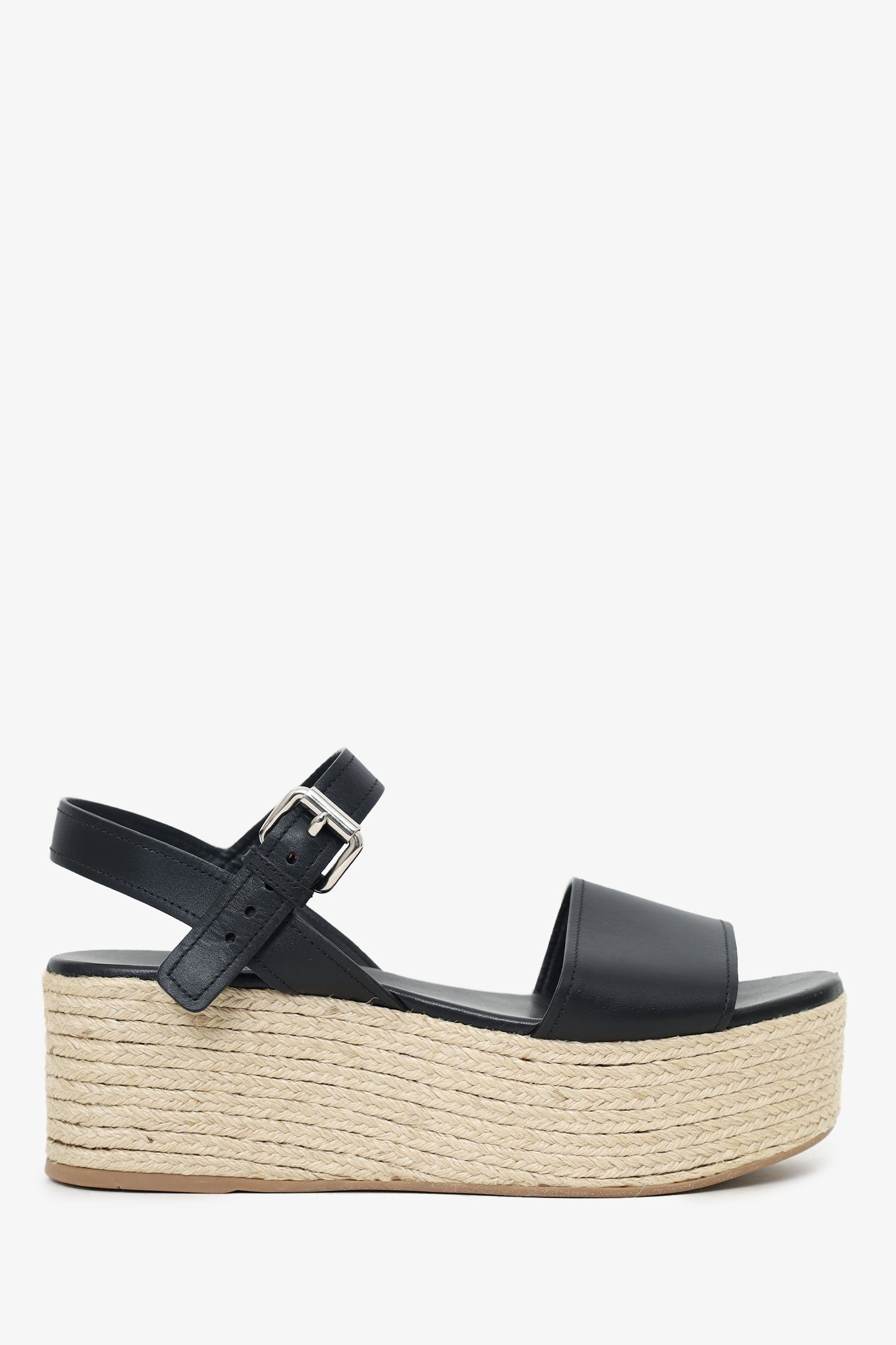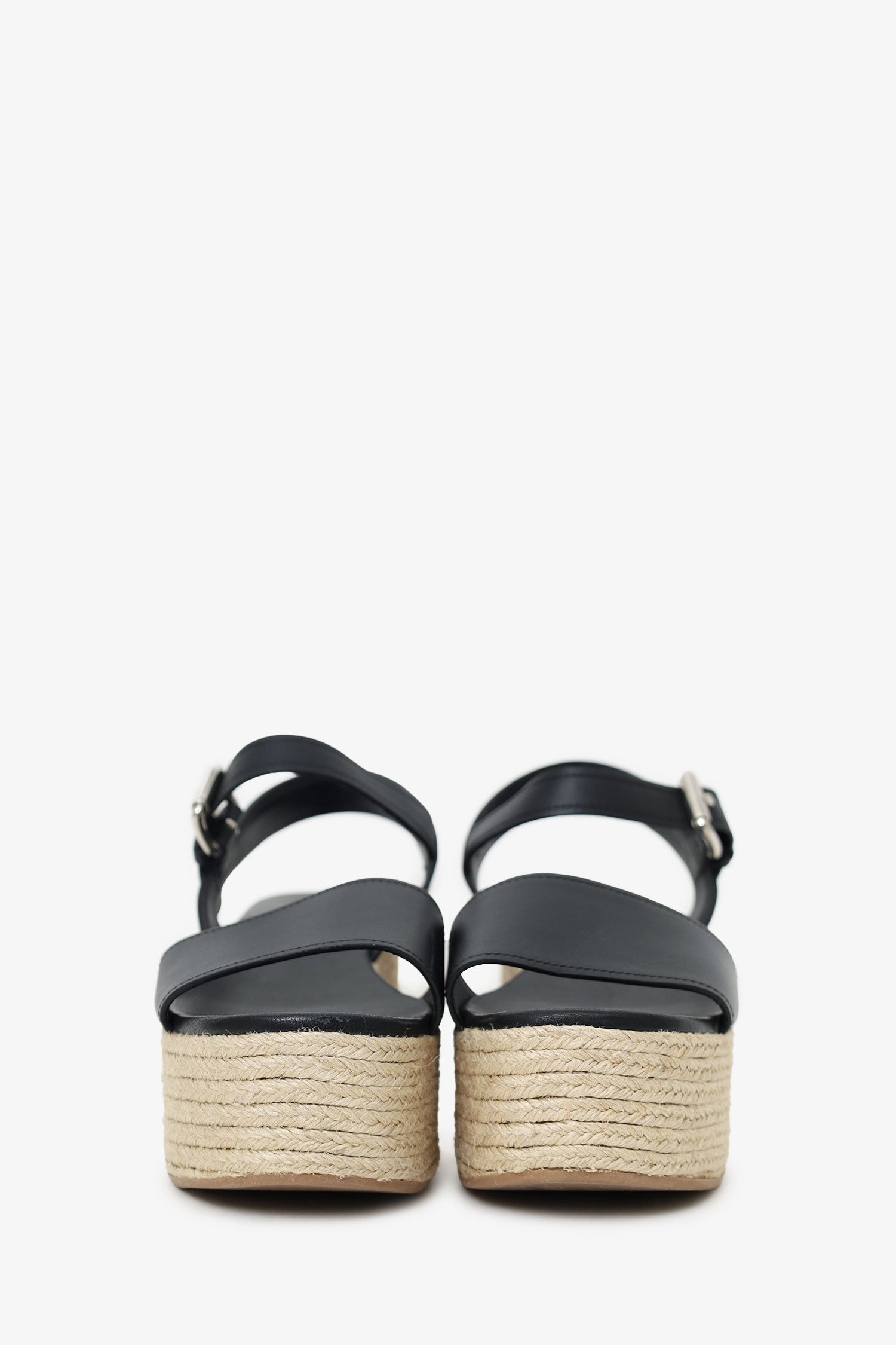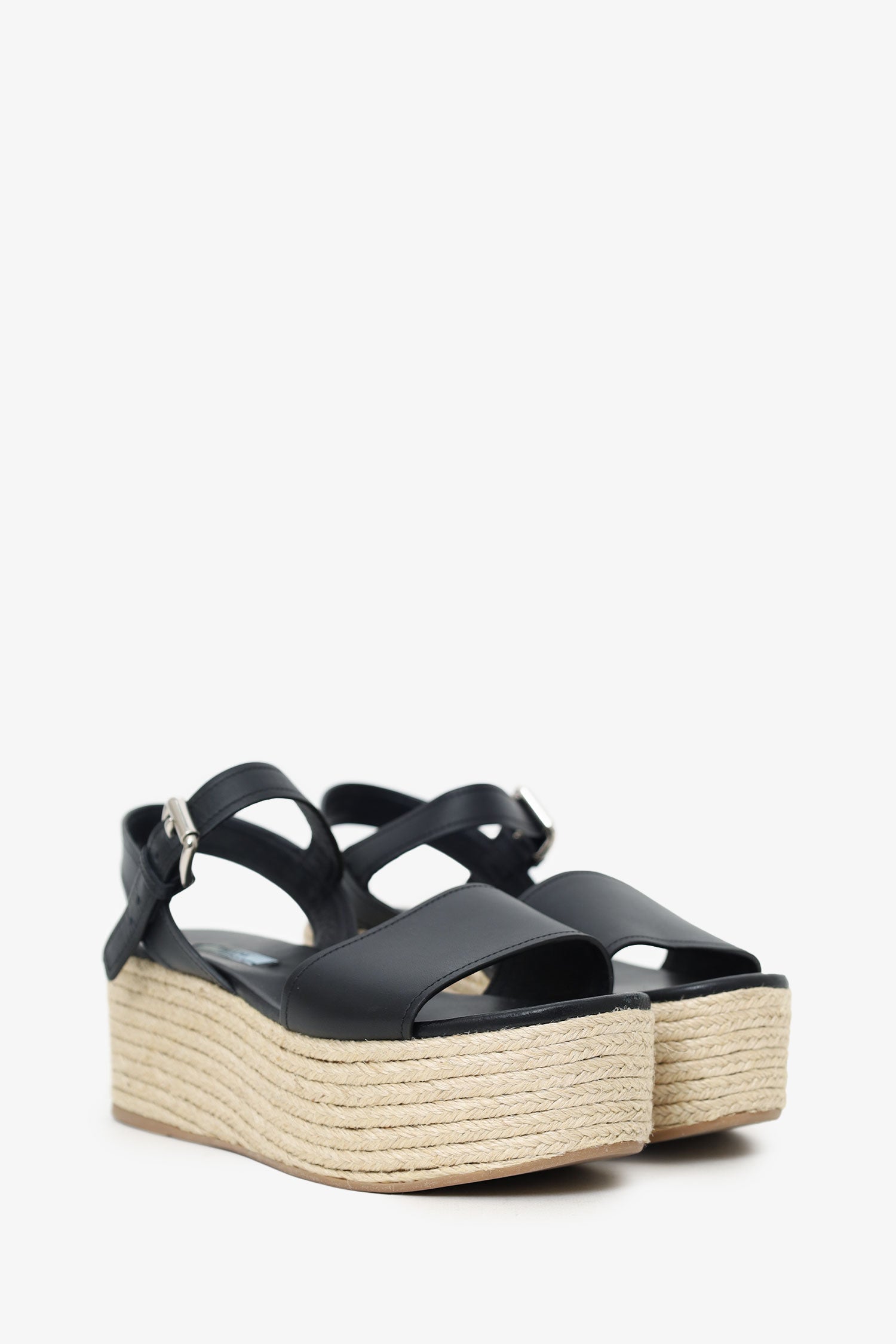 Refresh availabilityPrada Black Leather platform Espadrilles. Ankle strap closure. Round open toe. Silver-tone hardware. Tonal stitching.