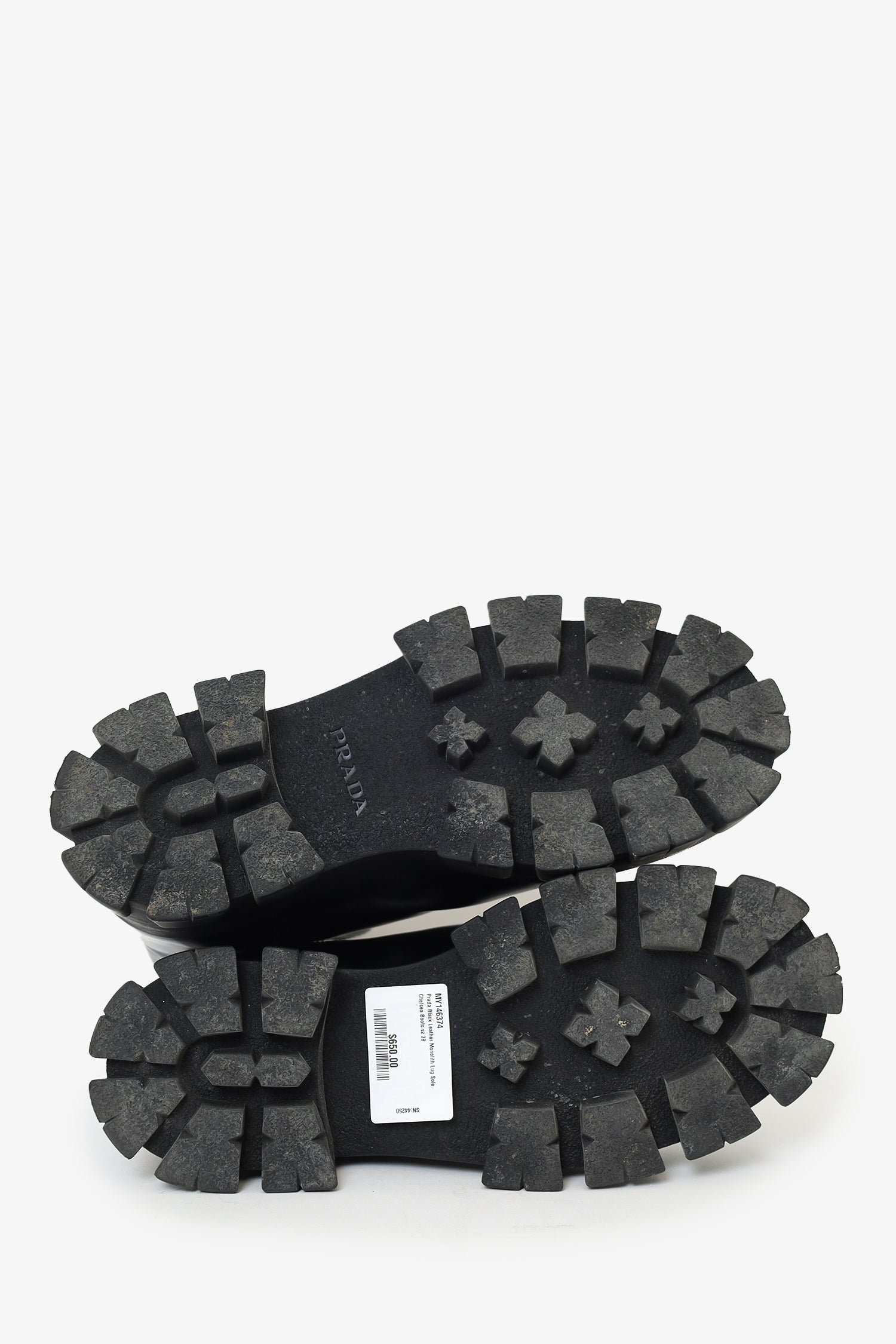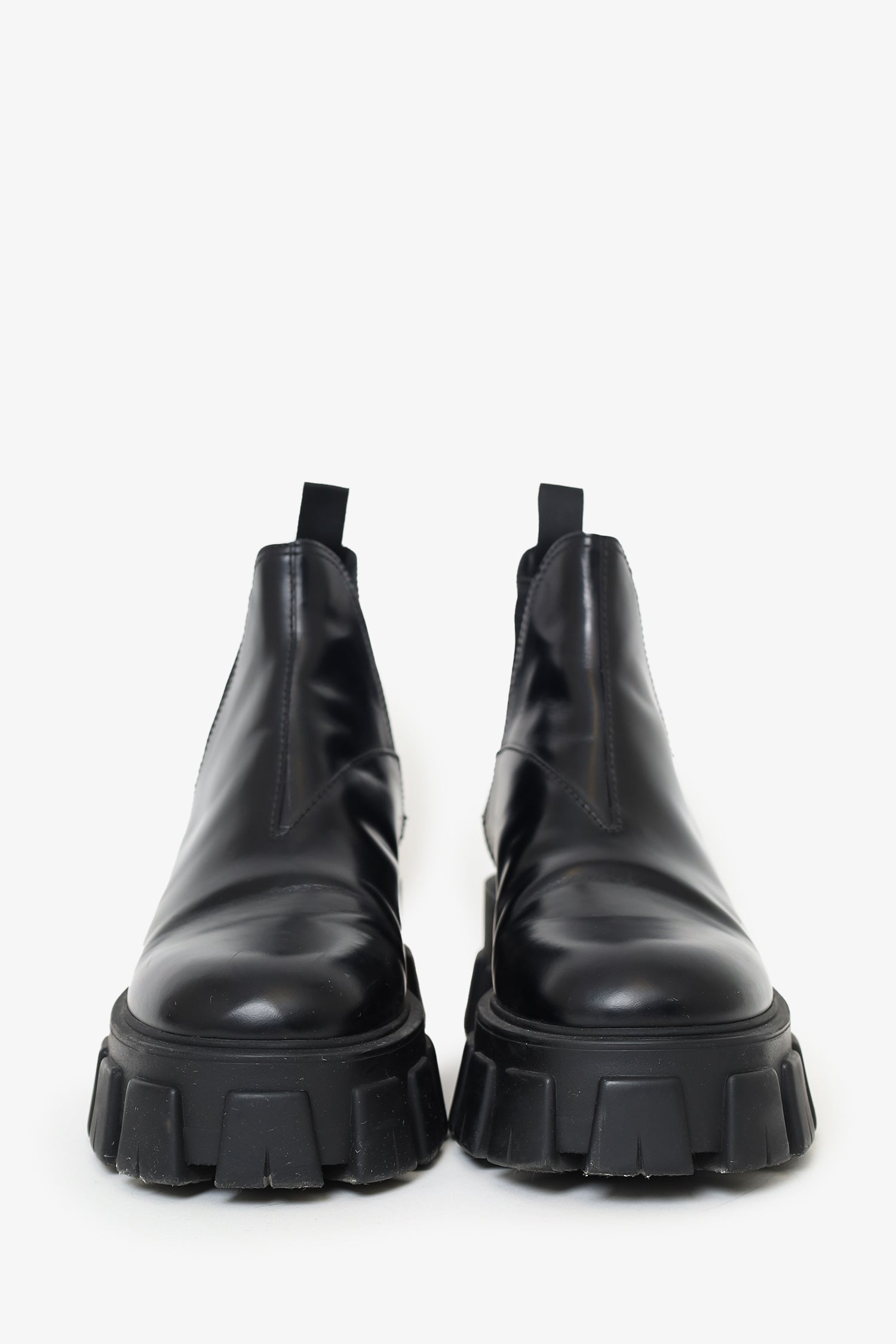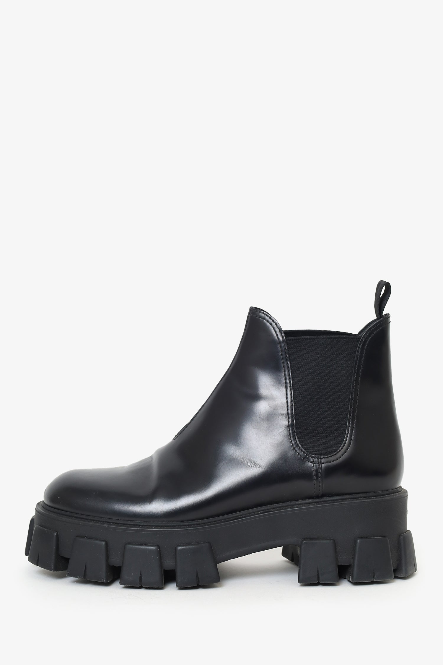 Refresh availabilityPrada Black Leather Monolith Lug Sole Chelsea Boots. Pull-on. Round toe. Elastic panels on either sides of shoe opening. Pull tabs on rear. Tonal stitching.