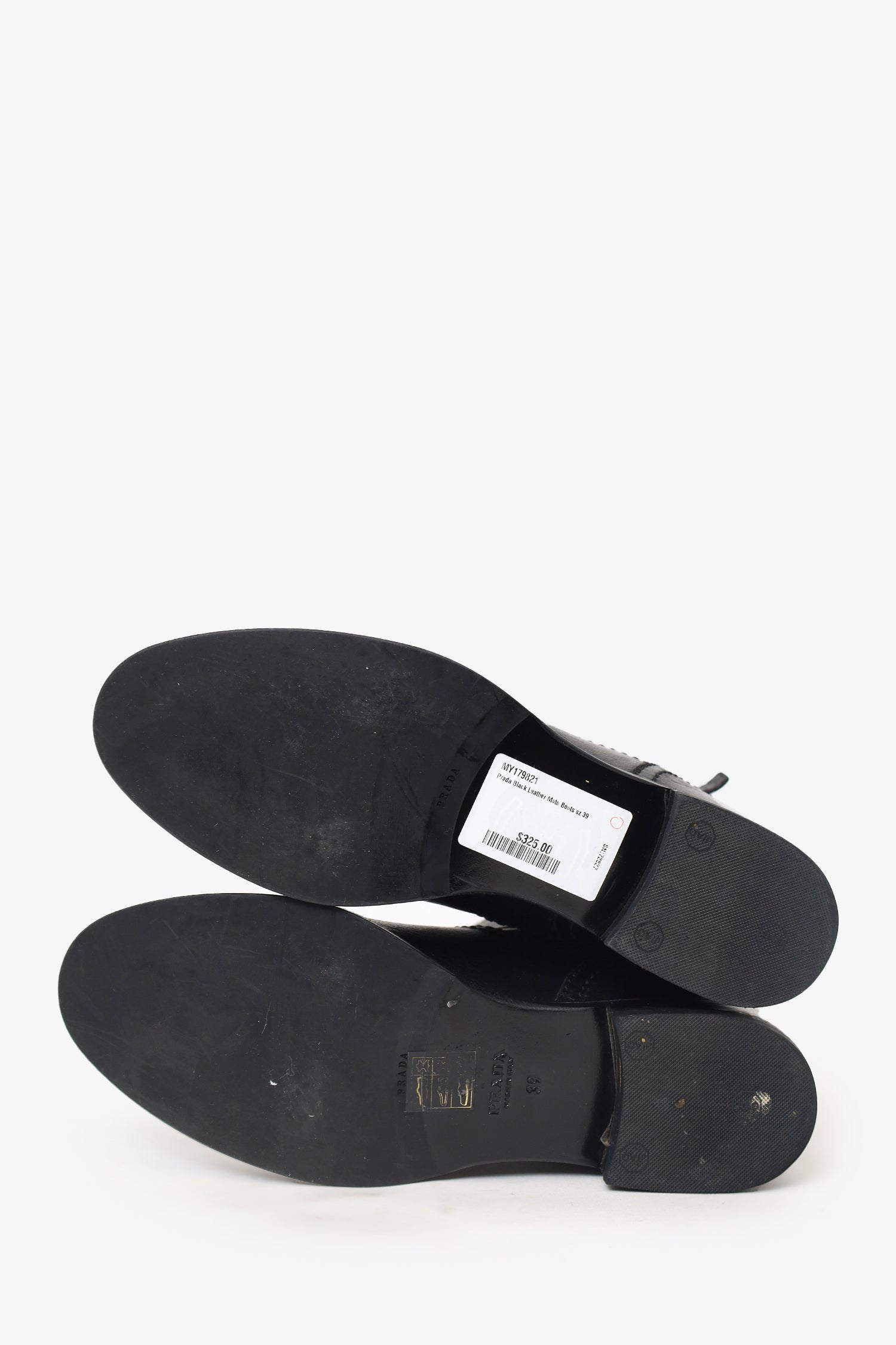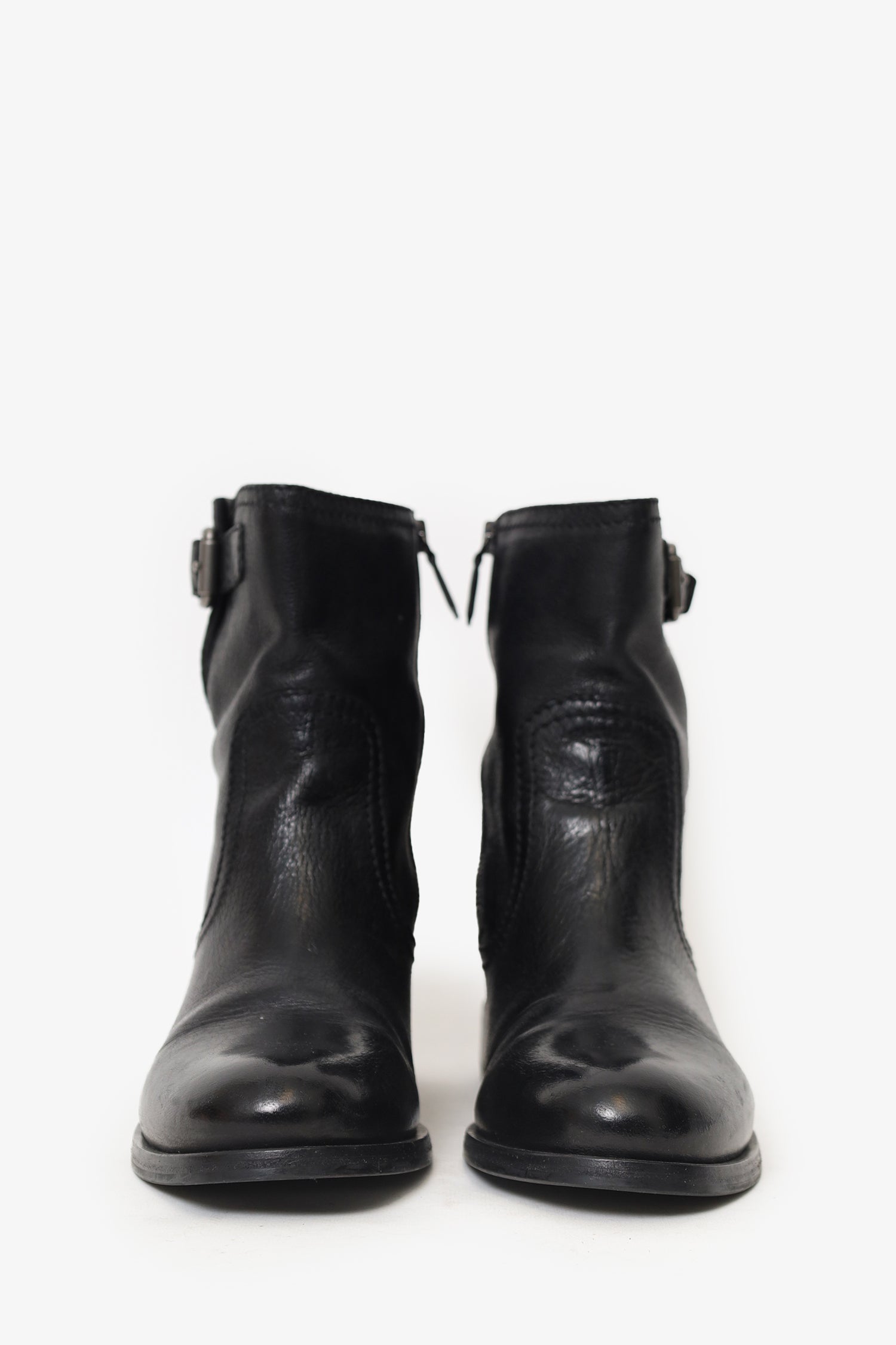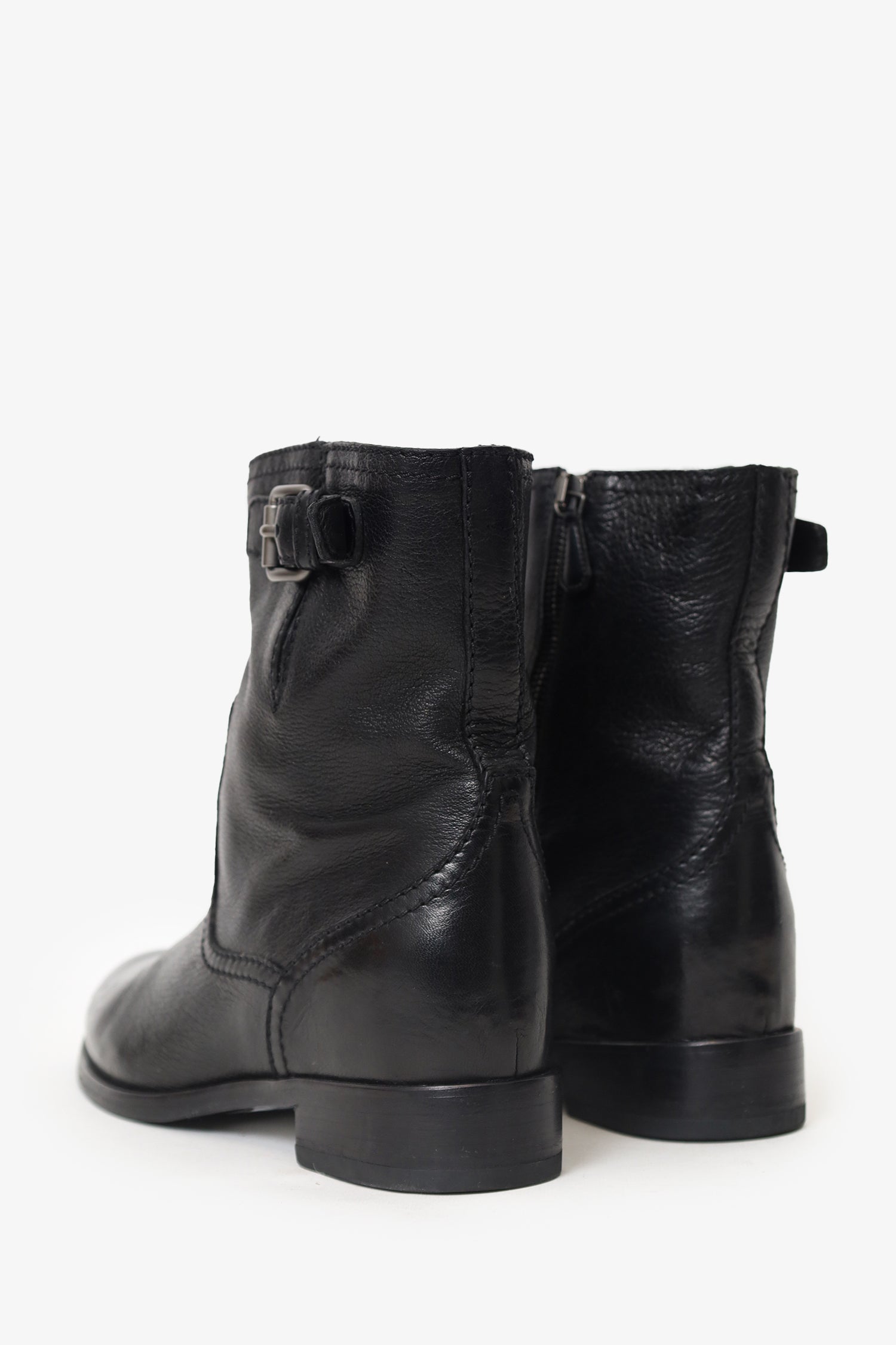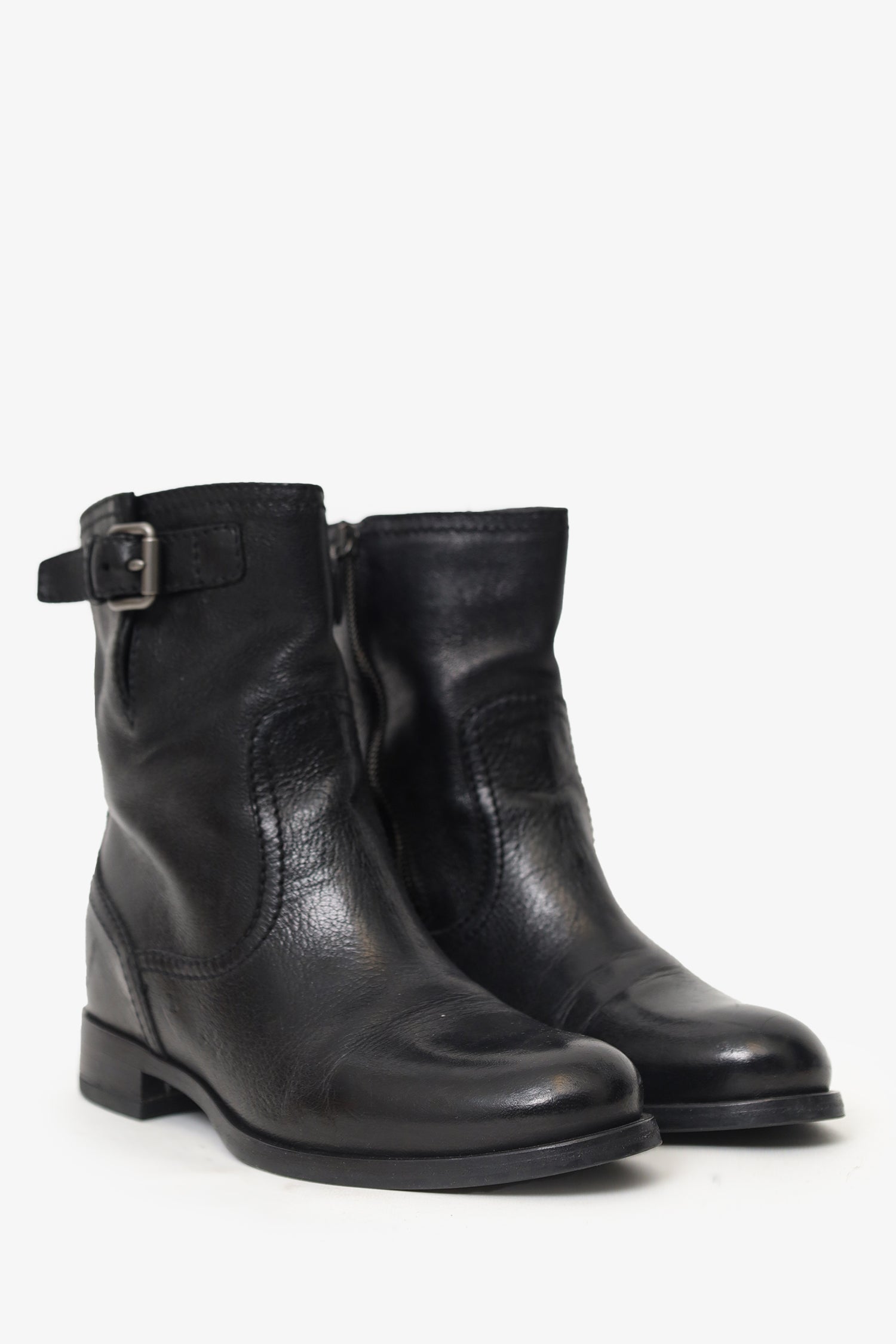 Refresh availabilityPrada Black Leather Moto Boots. Pull-on. Side zip closure. Top side exterior buckle detail. Leather-lined interior. Palladium-tone hardware. Tonal stitching.