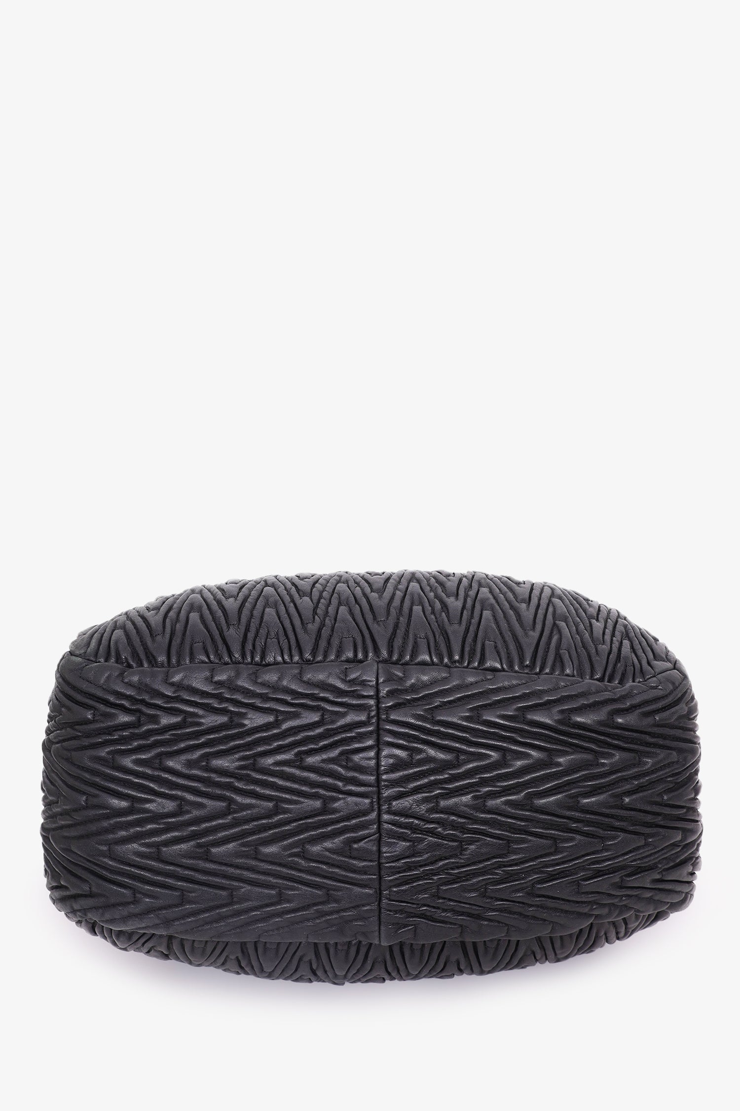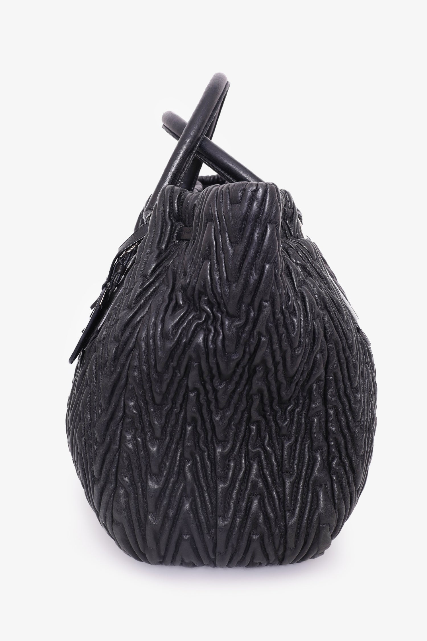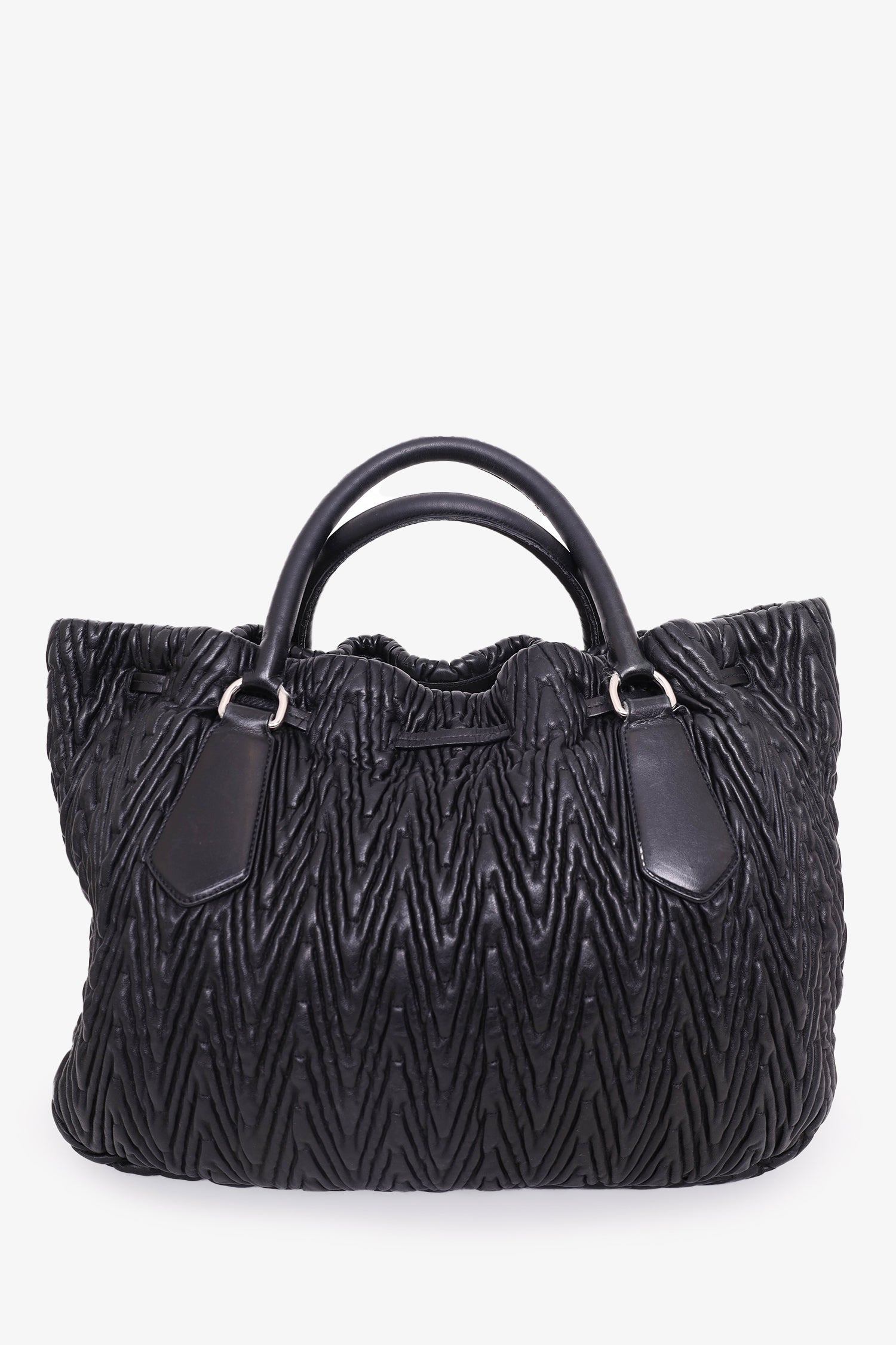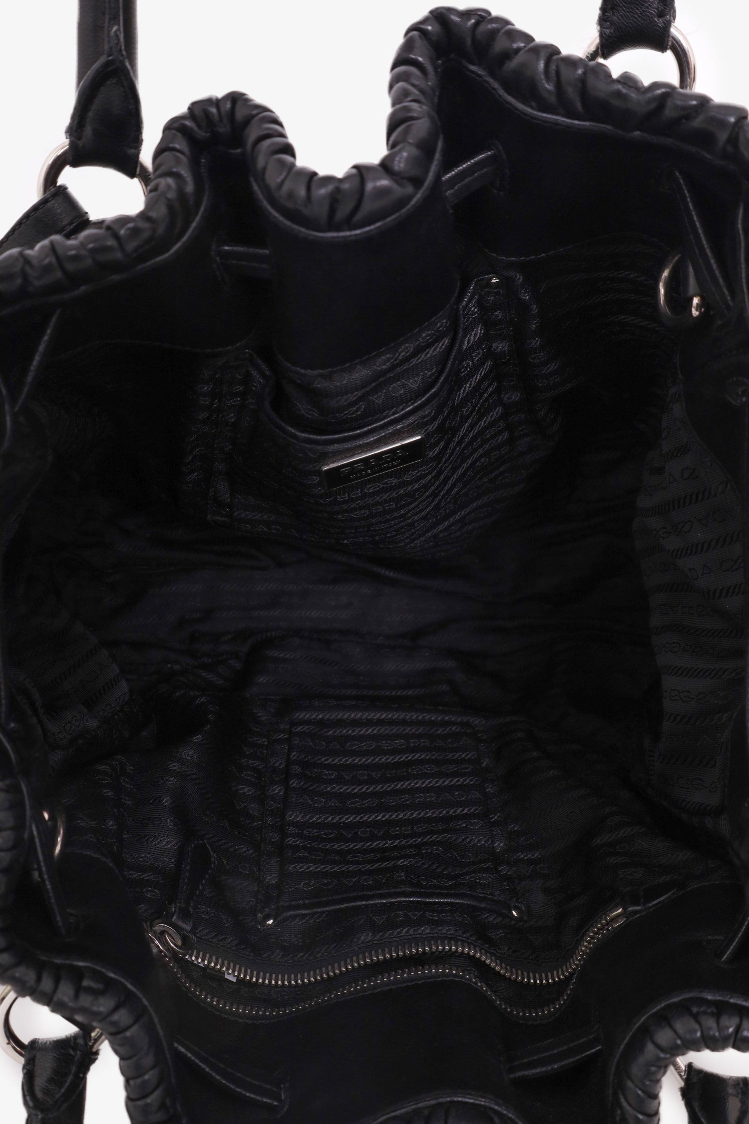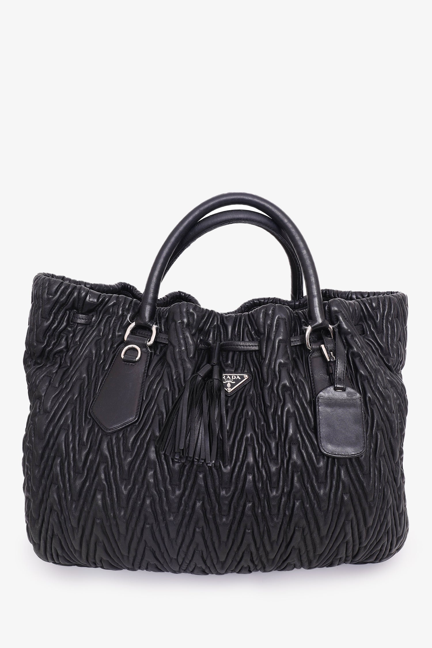 Refresh availabilityPrada Black Leather Nappa Chevron Antik Tote Bag. Top handle. 2 interior pockets; slip pocket, zip closure. Silver tone-hardware. Tonal stitching.