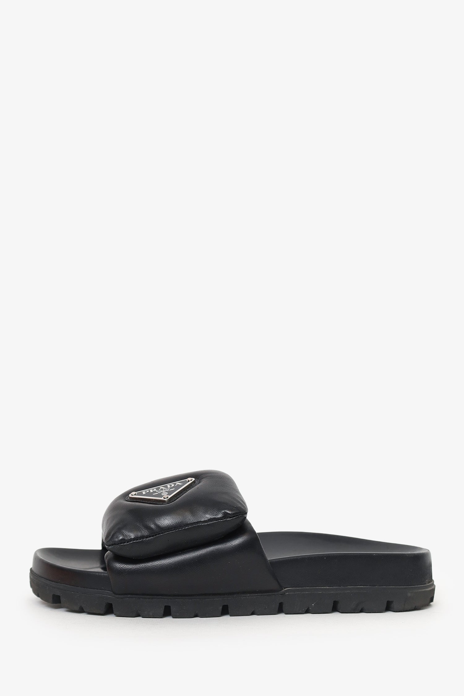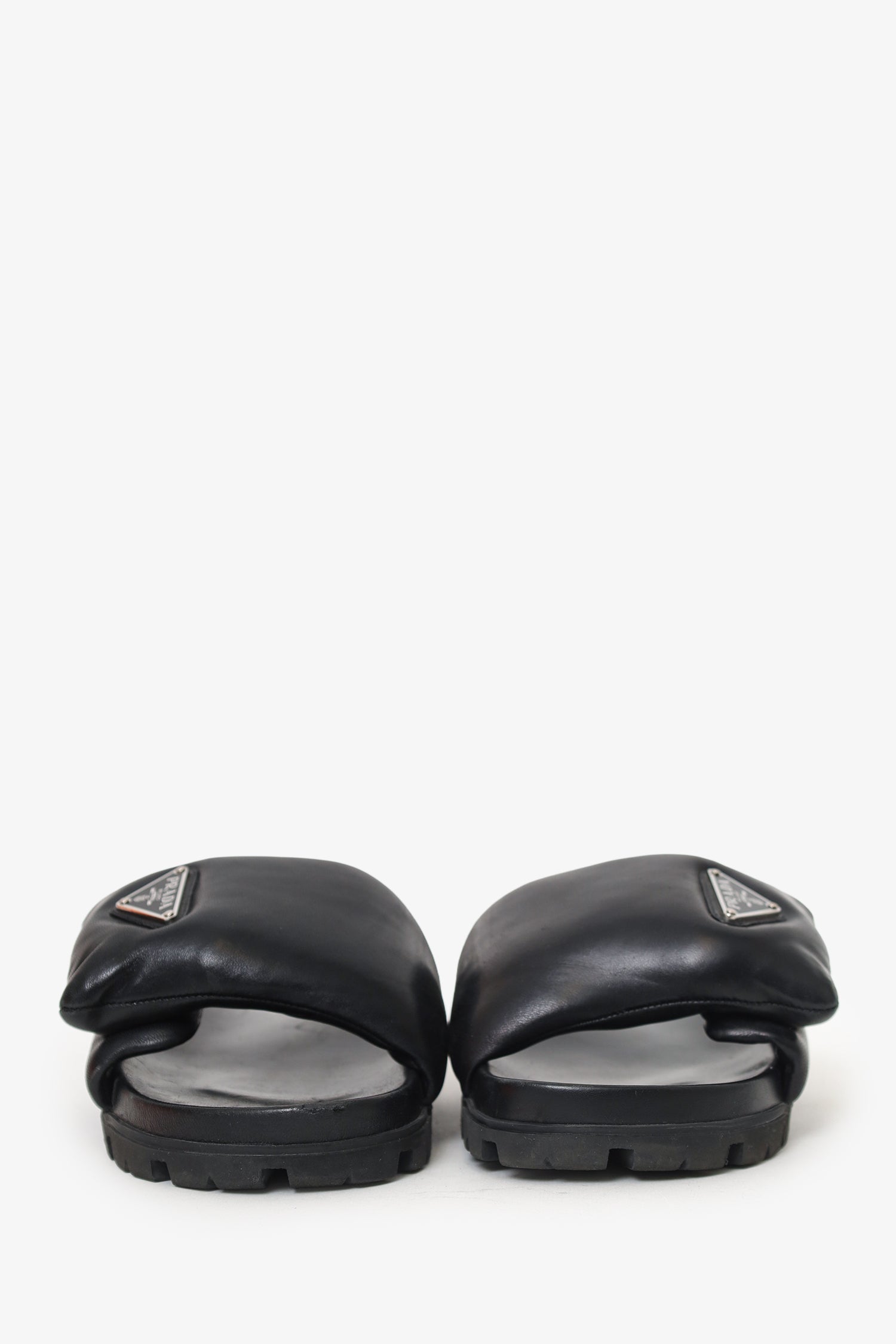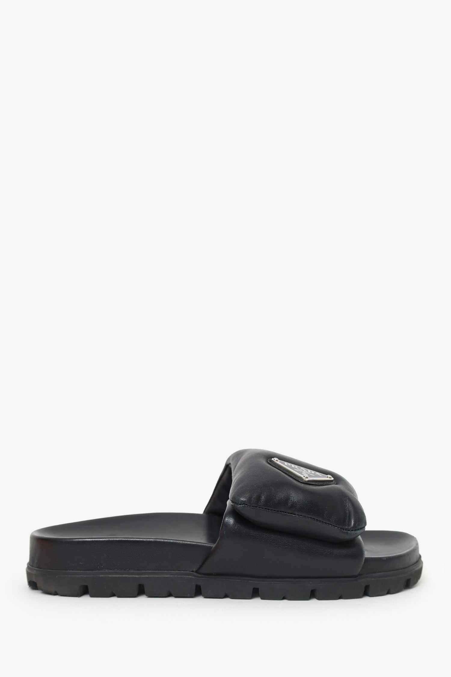 Refresh availabilityPrada Black Leather Padded Triangle Slides. Slip-on. Round toe. Silver-tone hardware. Tonal stitching.