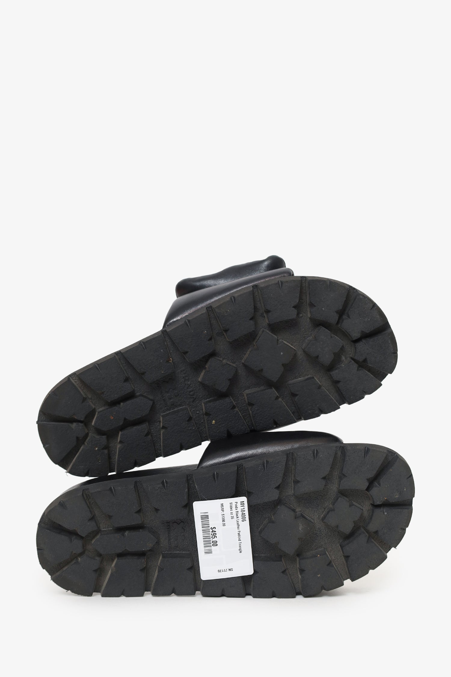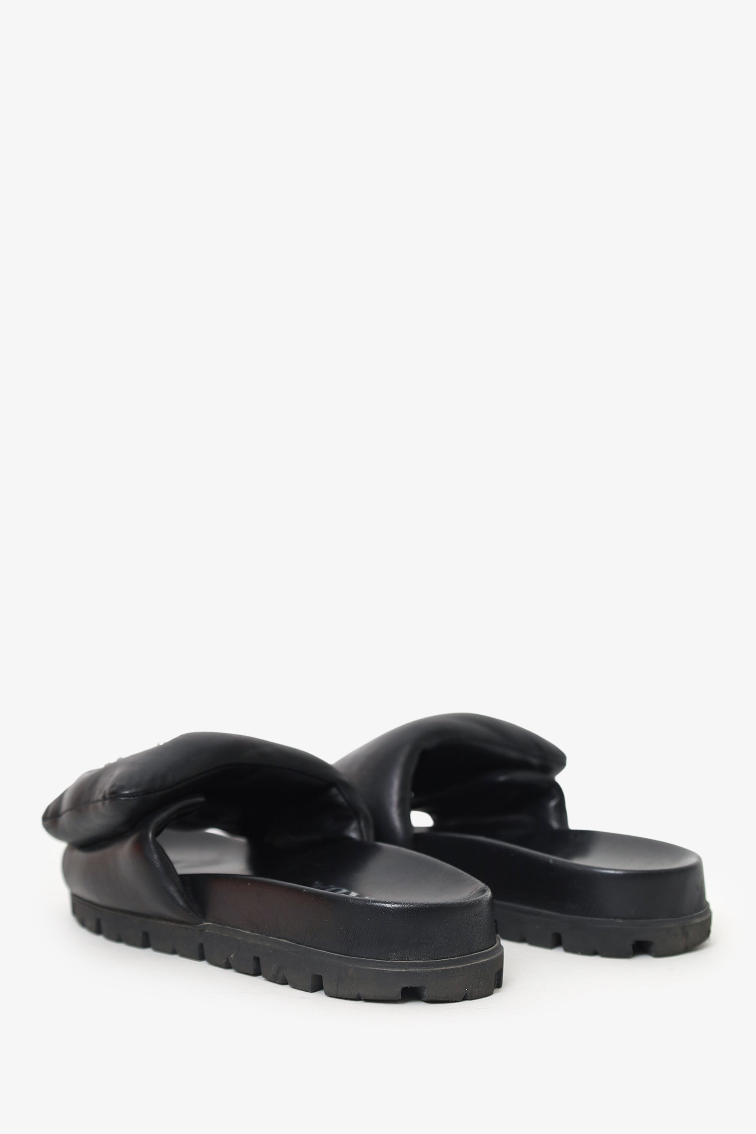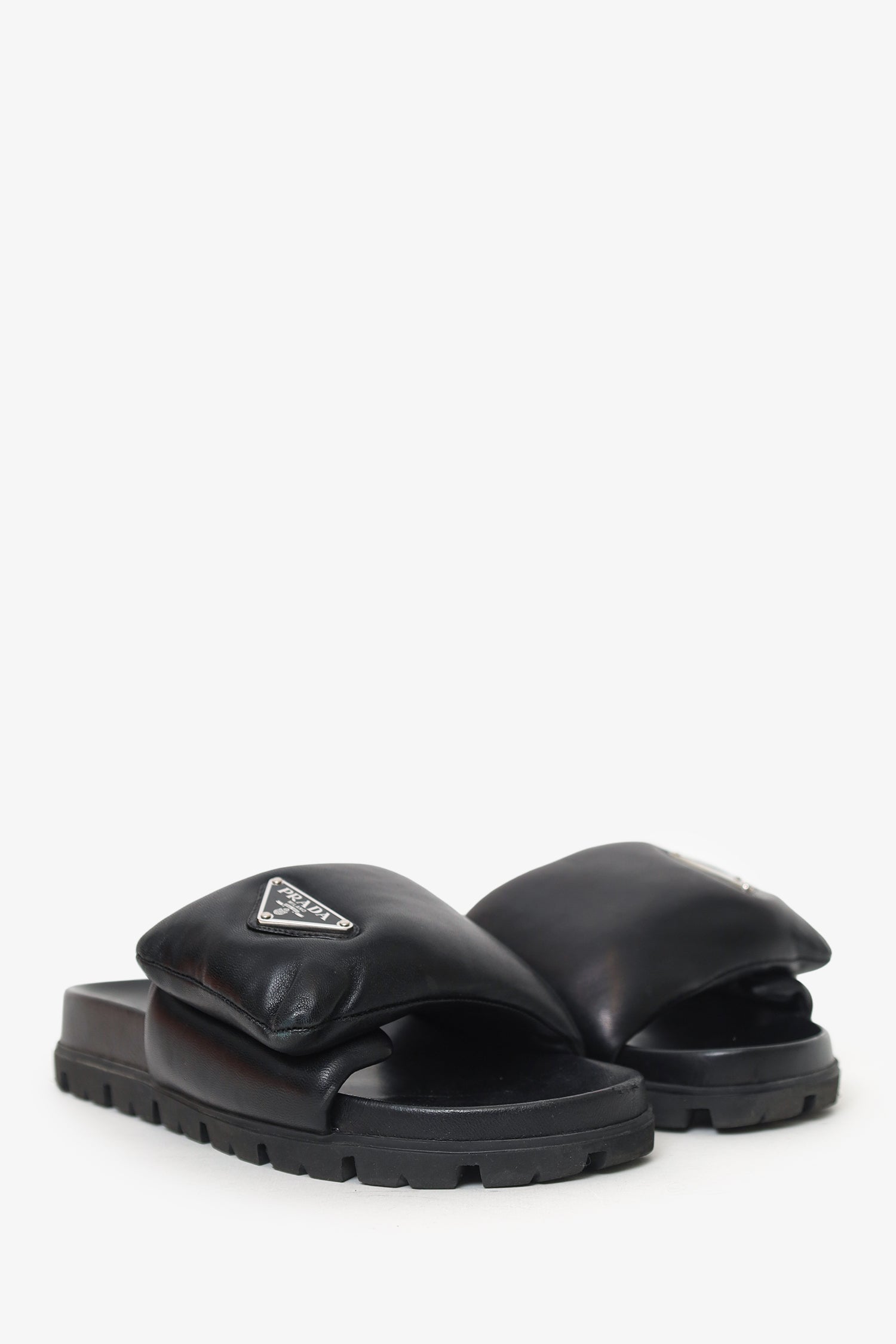Refresh availabilityPrada Black Leather Padded Triangle Slides. Slip-on. Round toe. Silver-tone hardware. Tonal stitching.