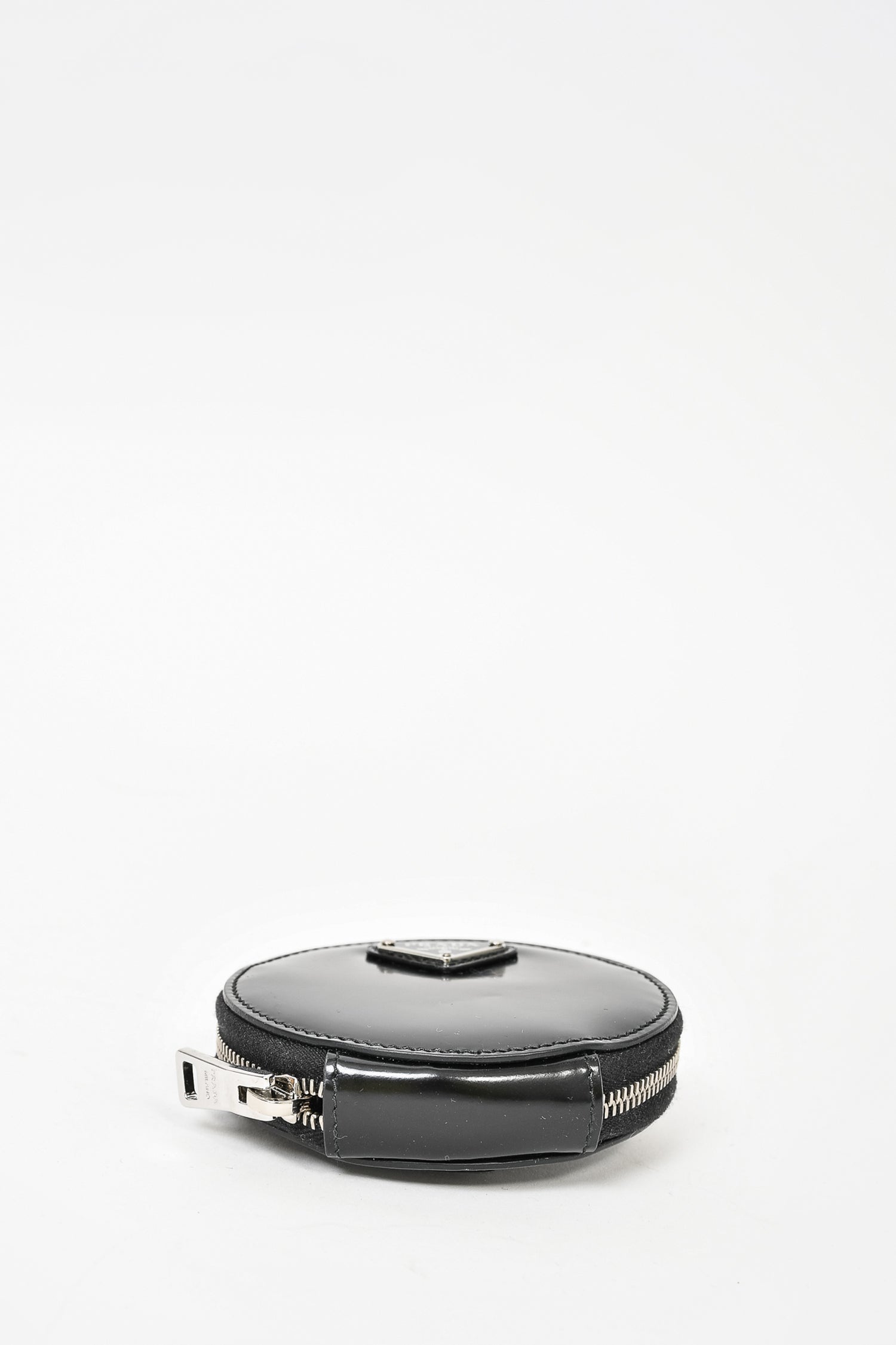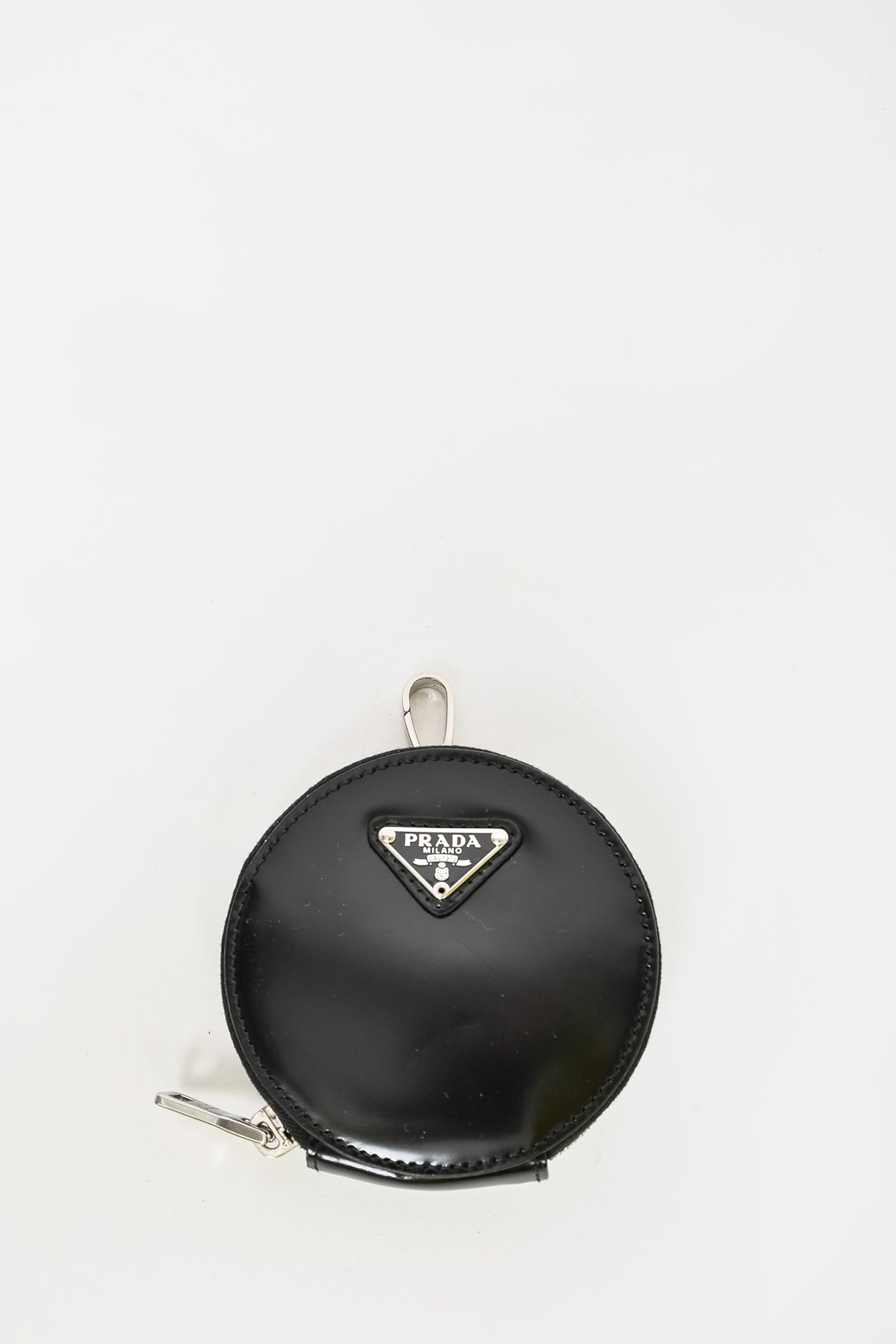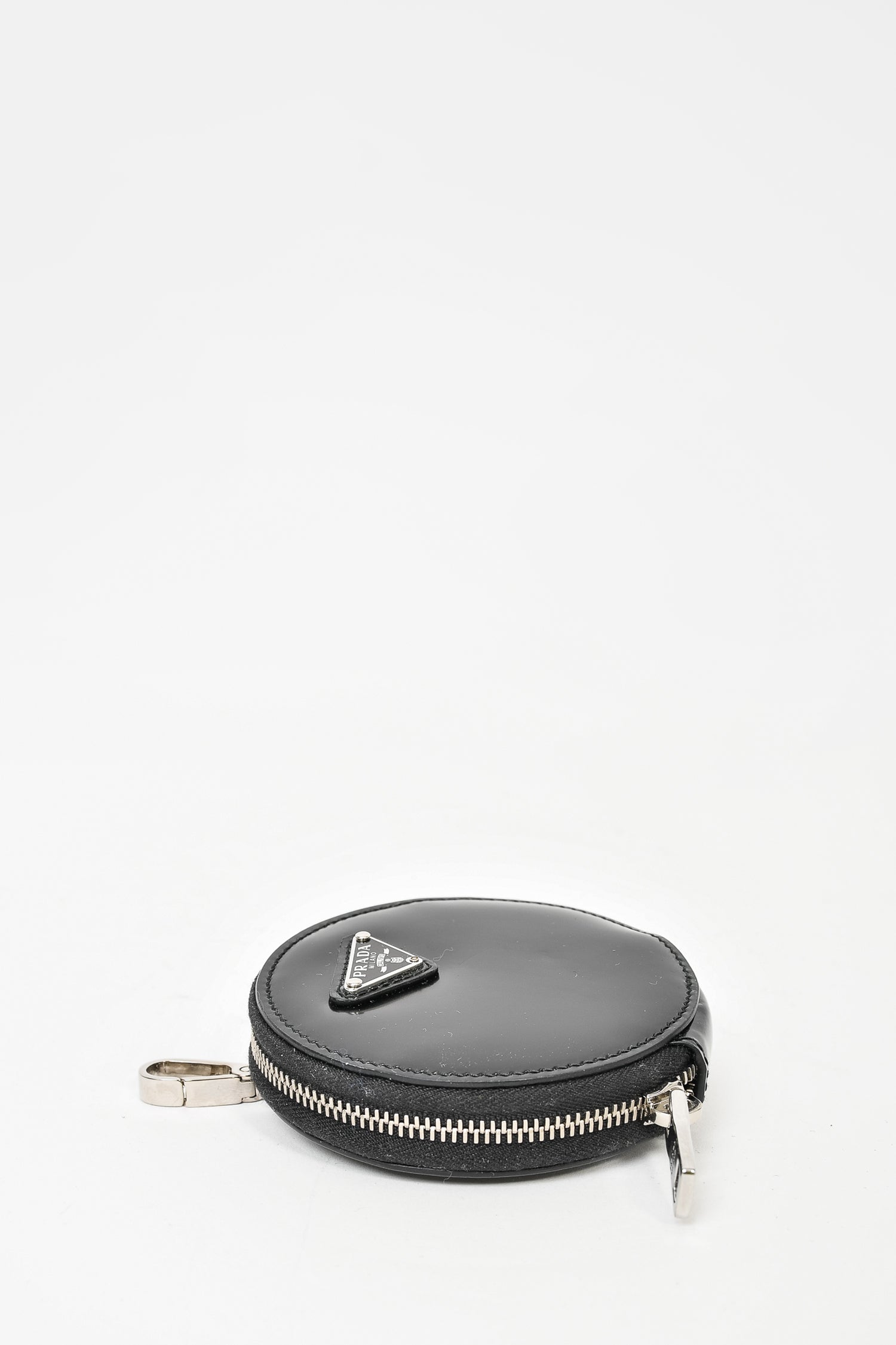 Refresh availabilityPrada Black Leather Round Keychain. Top zip closure. Open interior. Rear clip. Silver-tone hardware. Tonal stitching.