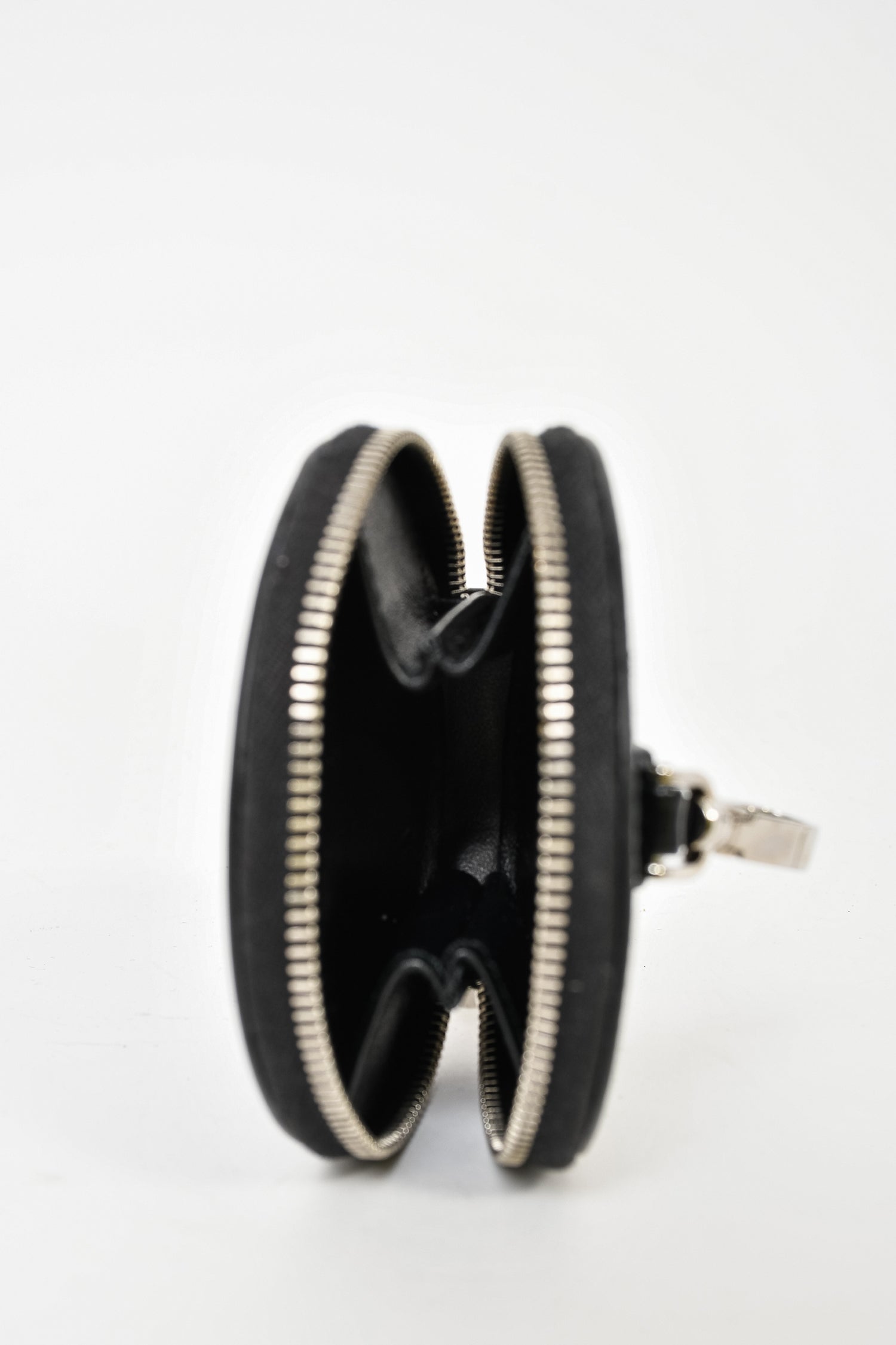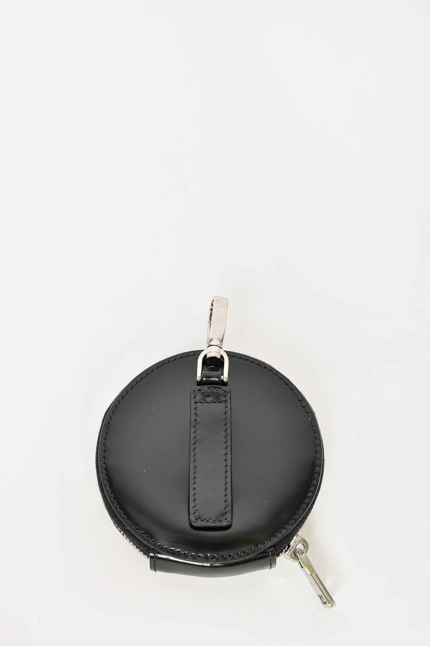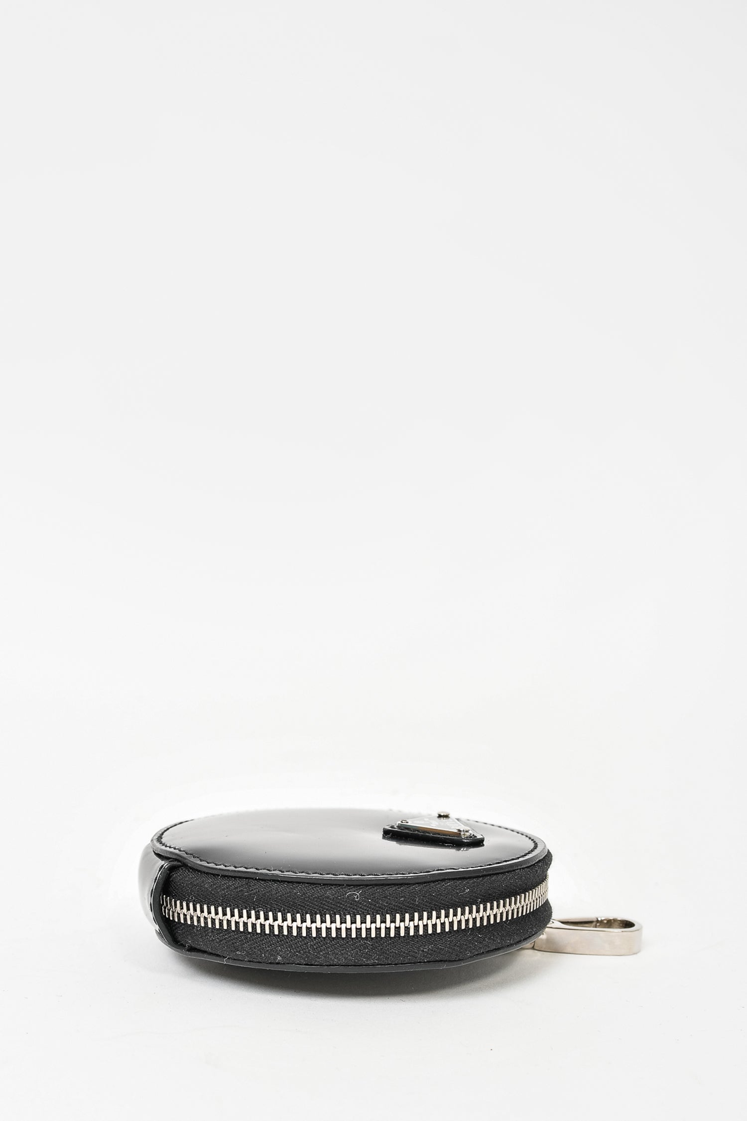 Refresh availabilityPrada Black Leather Round Keychain. Top zip closure. Open interior. Rear clip. Silver-tone hardware. Tonal stitching.
