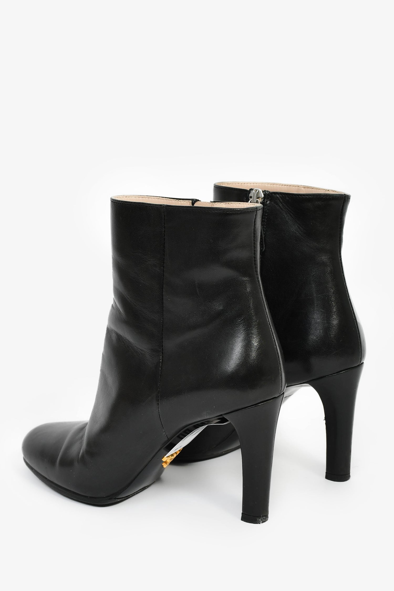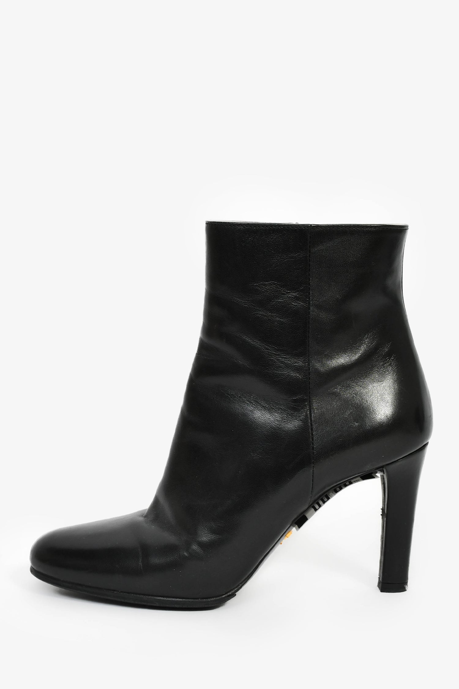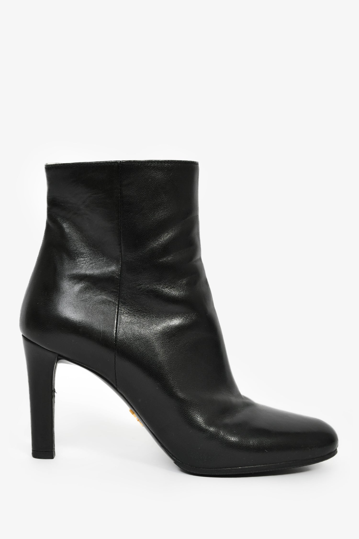 Refresh availabilityPrada Black Leather Round Toe Heeled Booties. Pull-on. Round toe. Side zipped closure. Gold and silver-tone hardware. Tonal stitching.