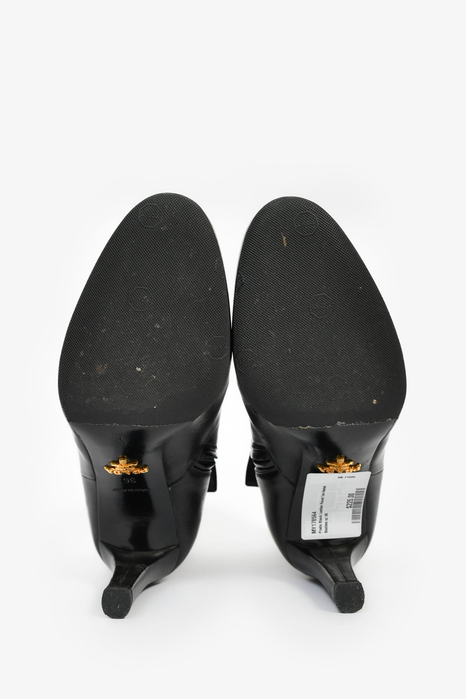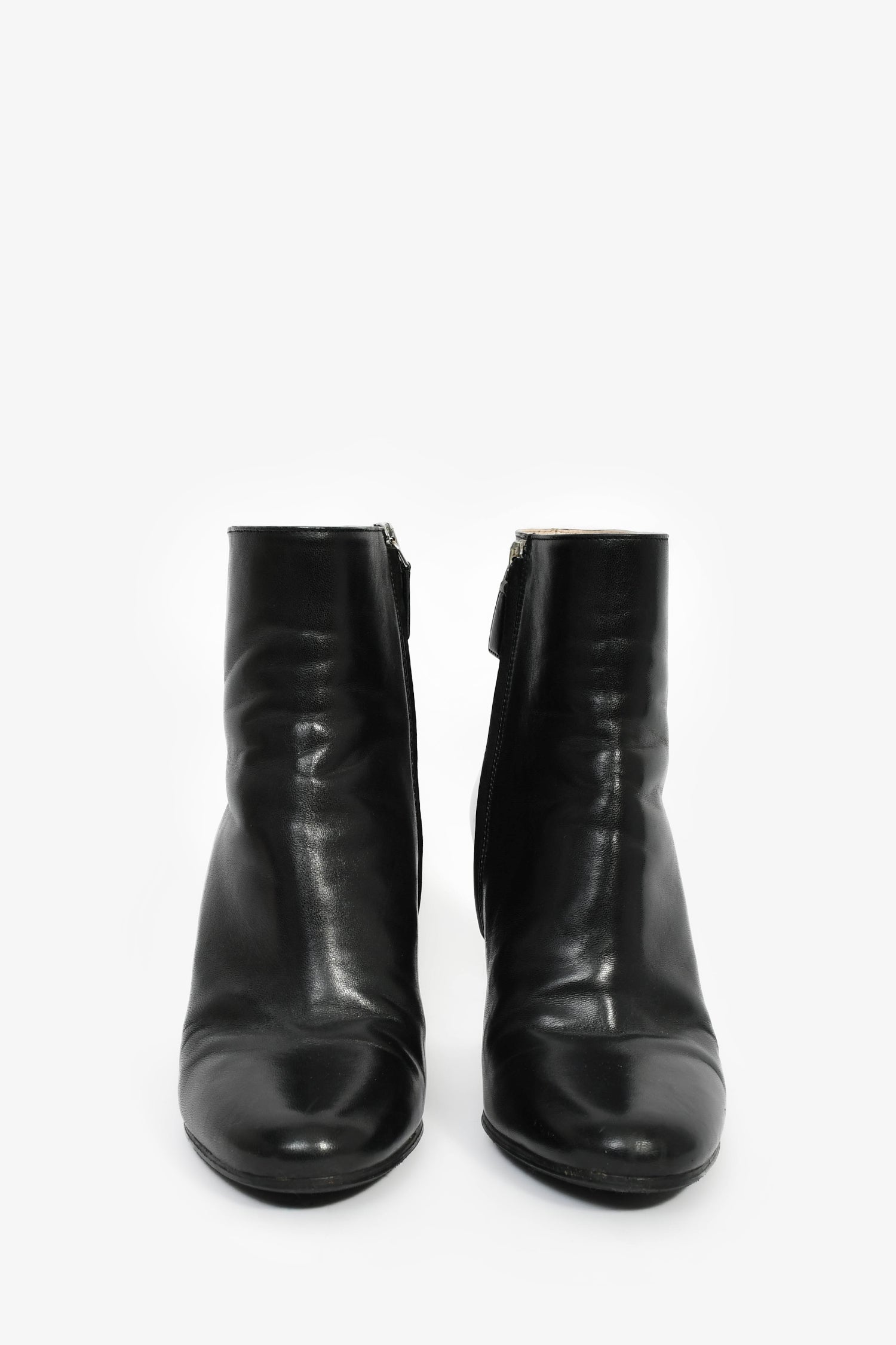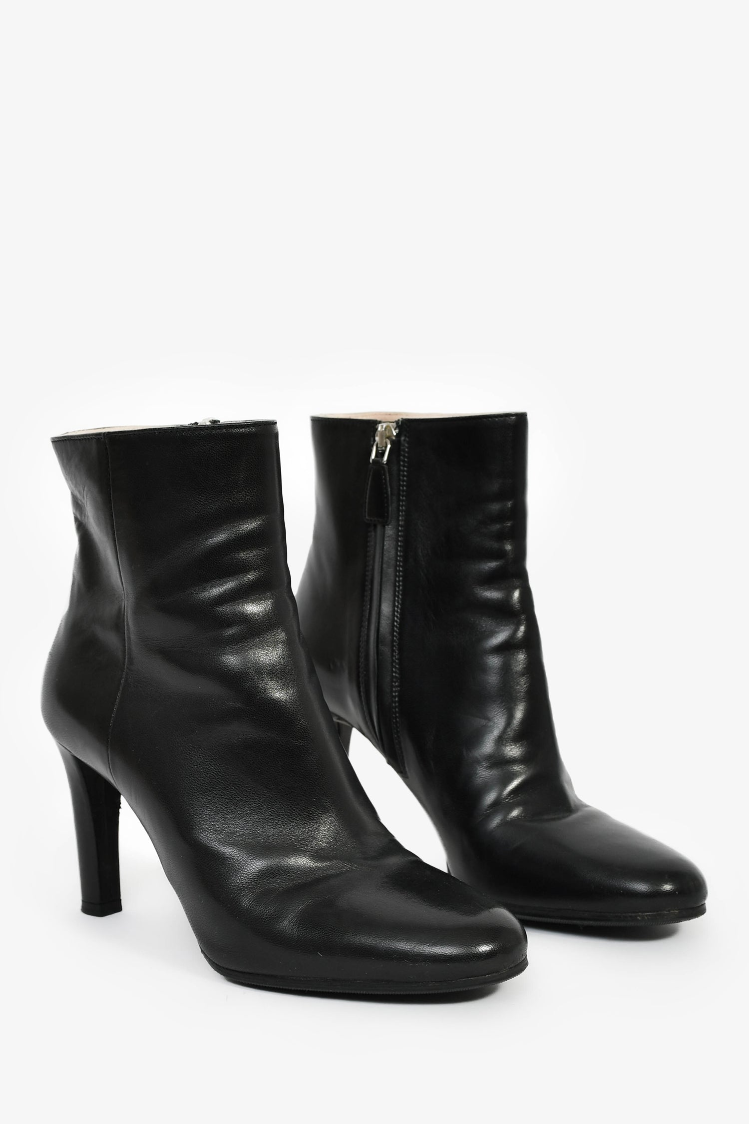Refresh availabilityPrada Black Leather Round Toe Heeled Booties. Pull-on. Round toe. Side zipped closure. Gold and silver-tone hardware. Tonal stitching.