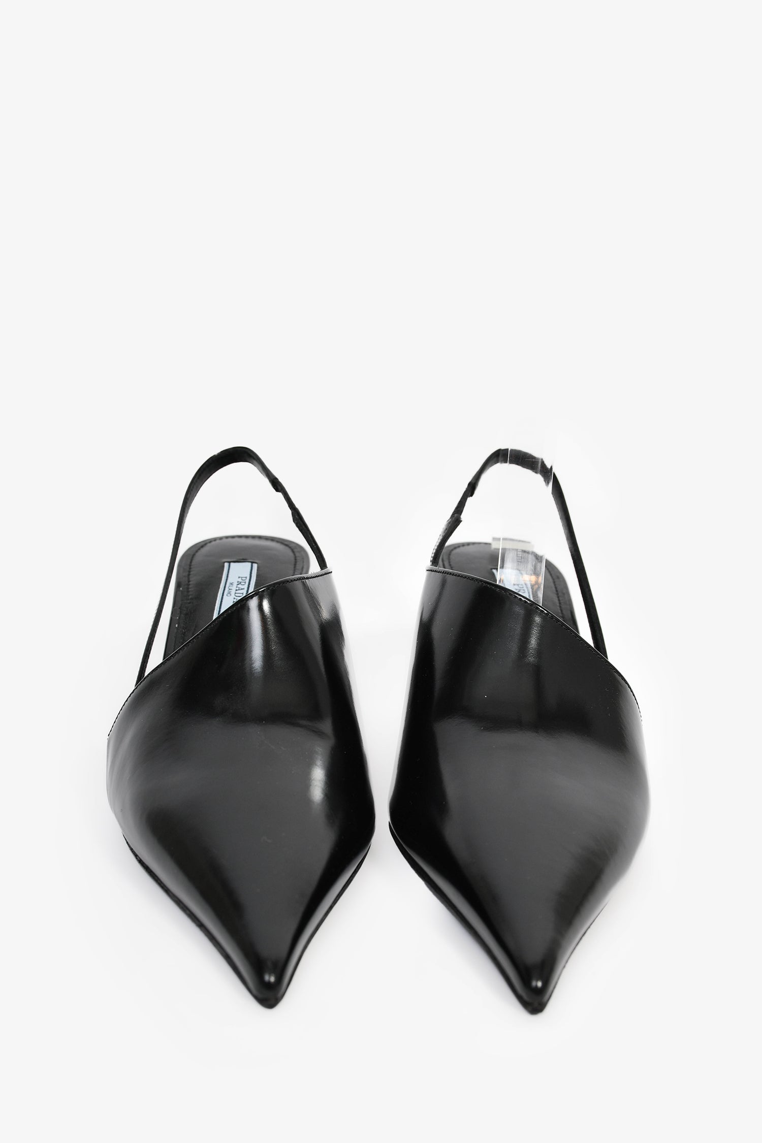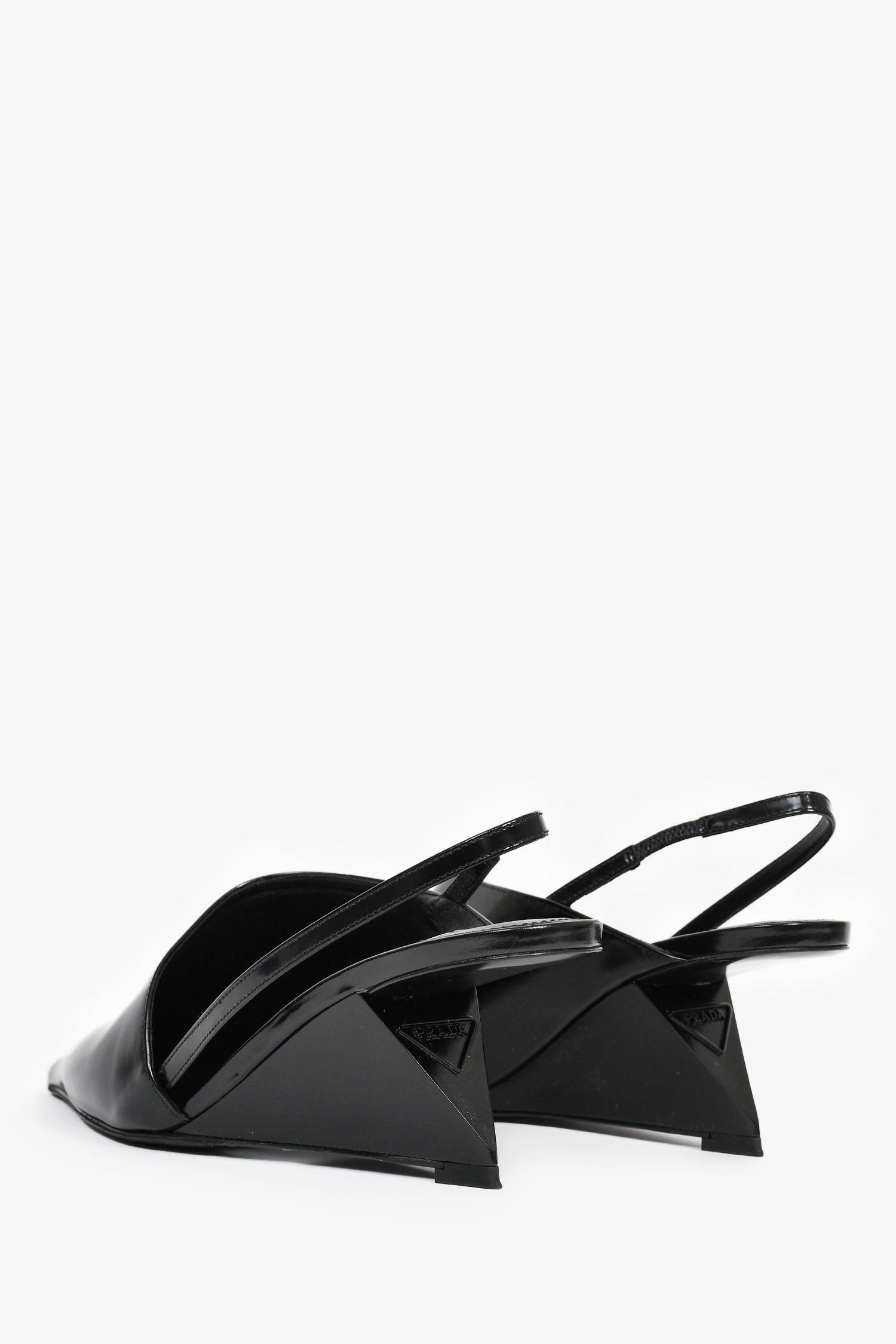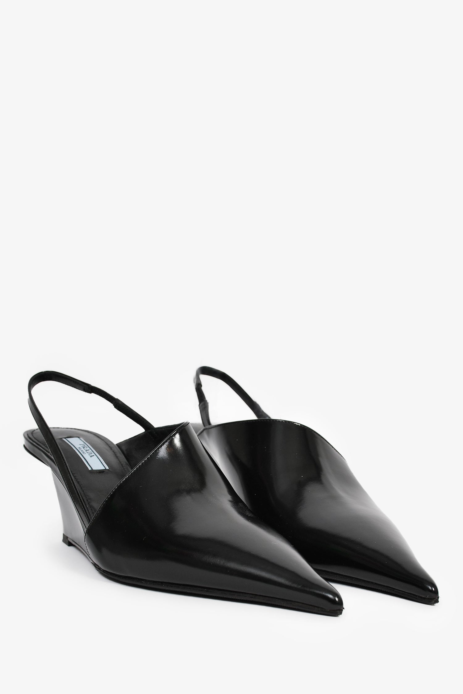 Refresh availabilityPrada Black Leather Slingback Wedges. Slip-on. Pointed toe. Geometric heel. Topy soles.
