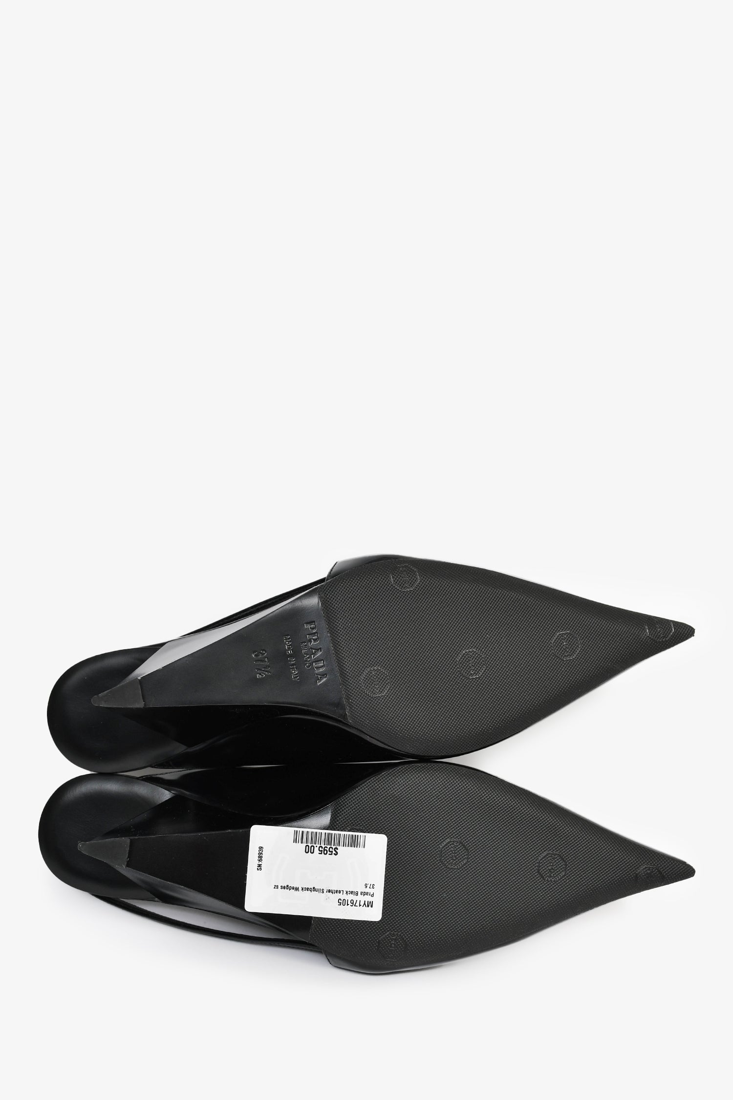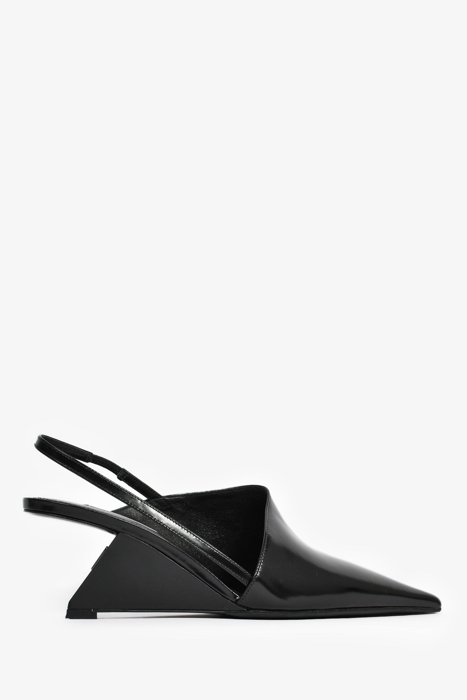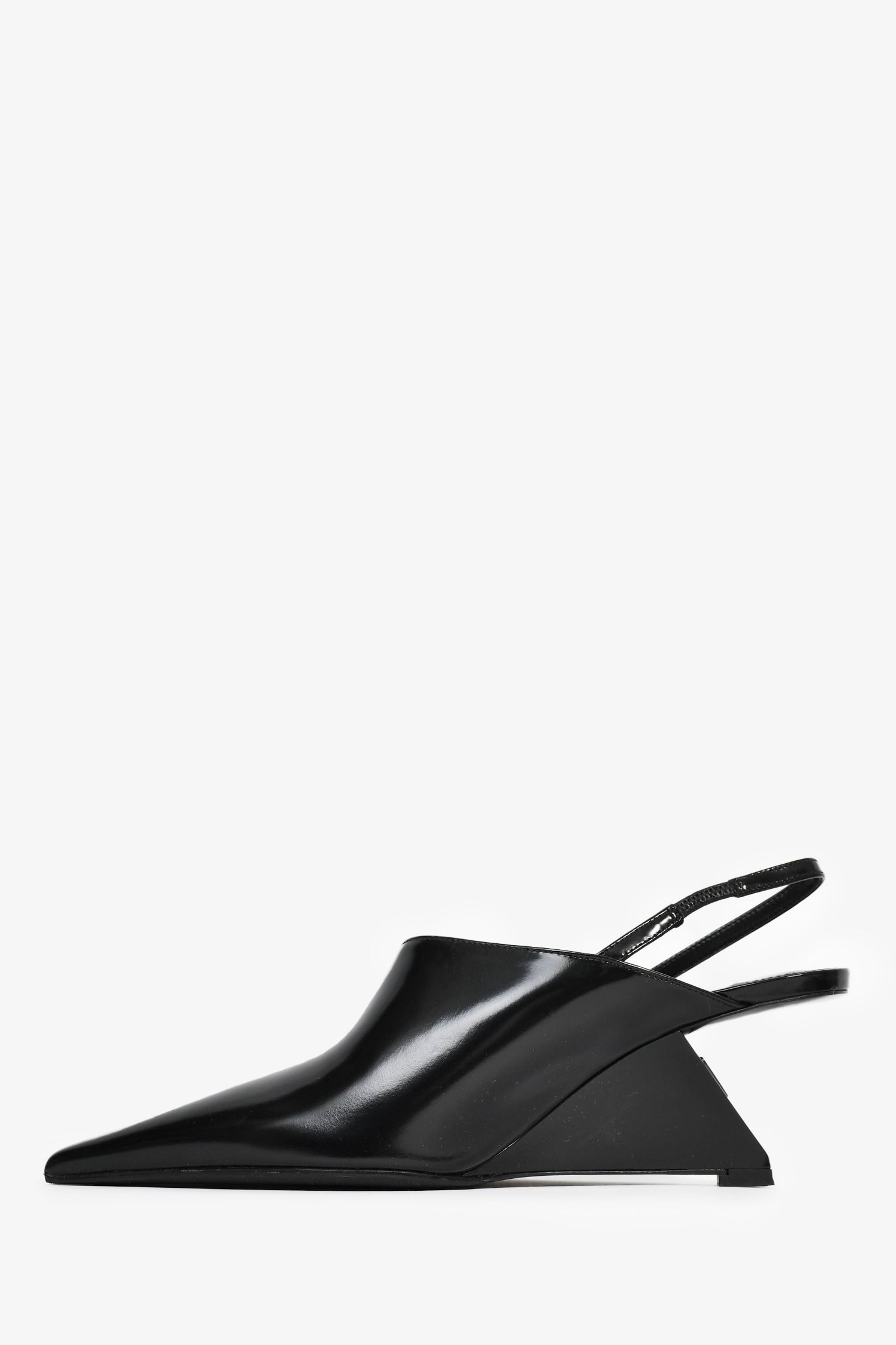 Refresh availabilityPrada Black Leather Slingback Wedges. Slip-on. Pointed toe. Geometric heel. Topy soles.