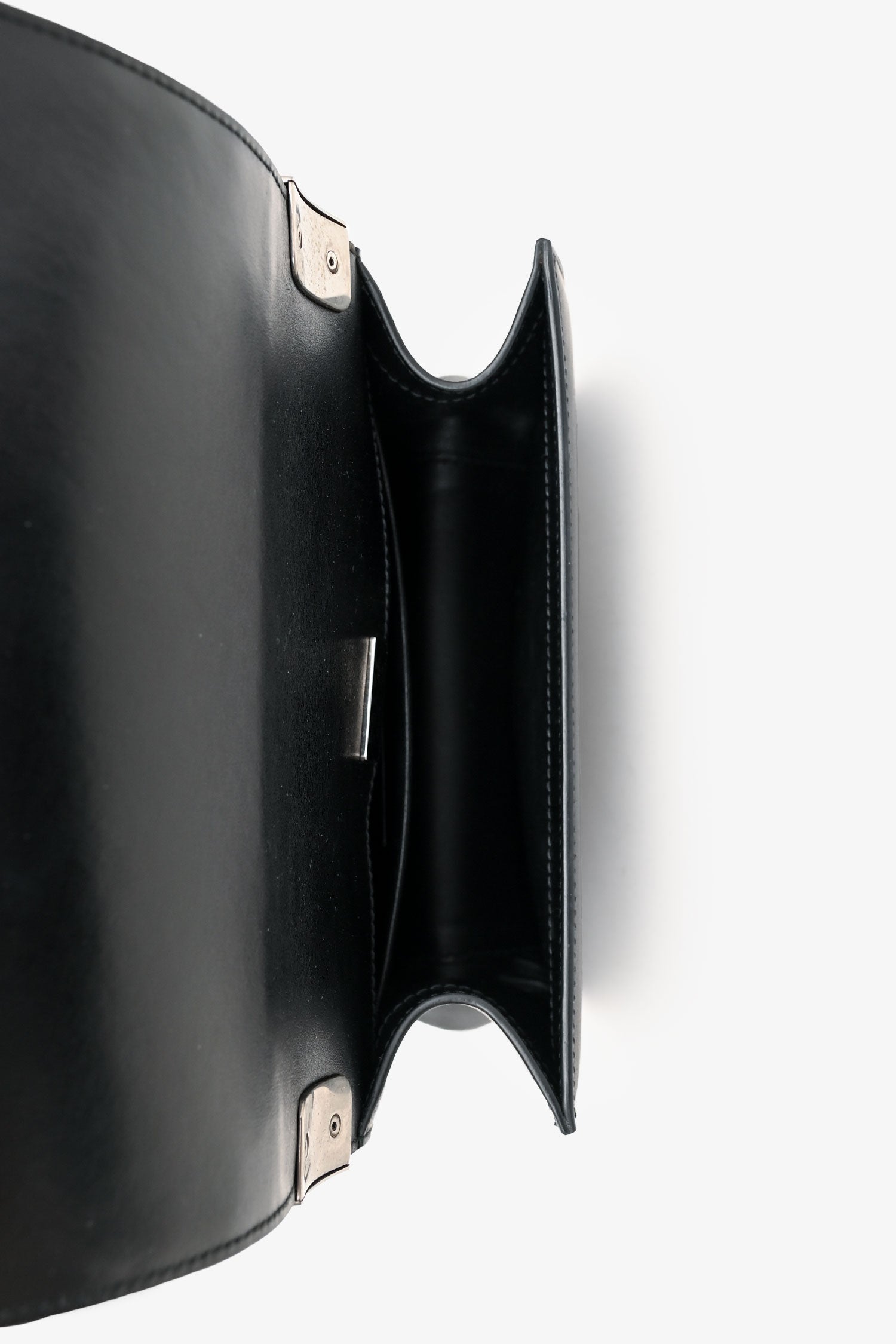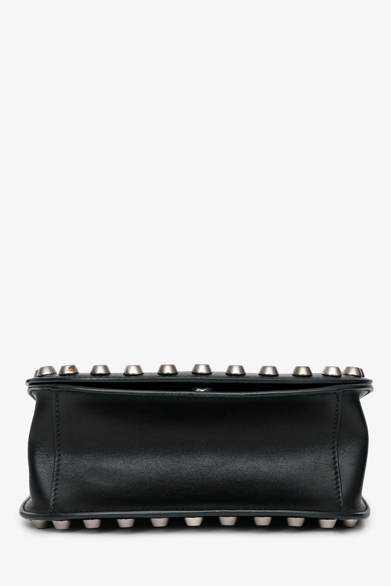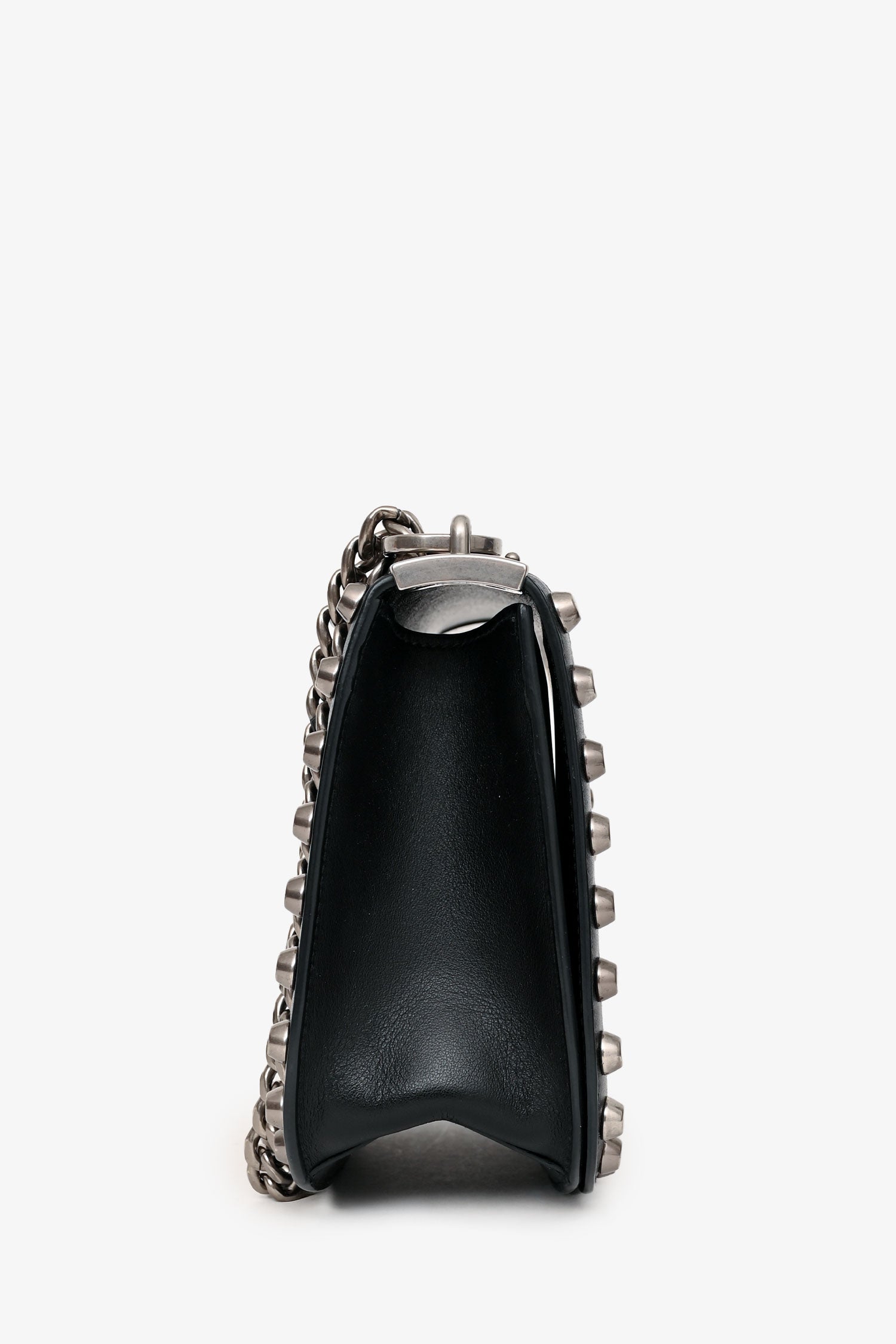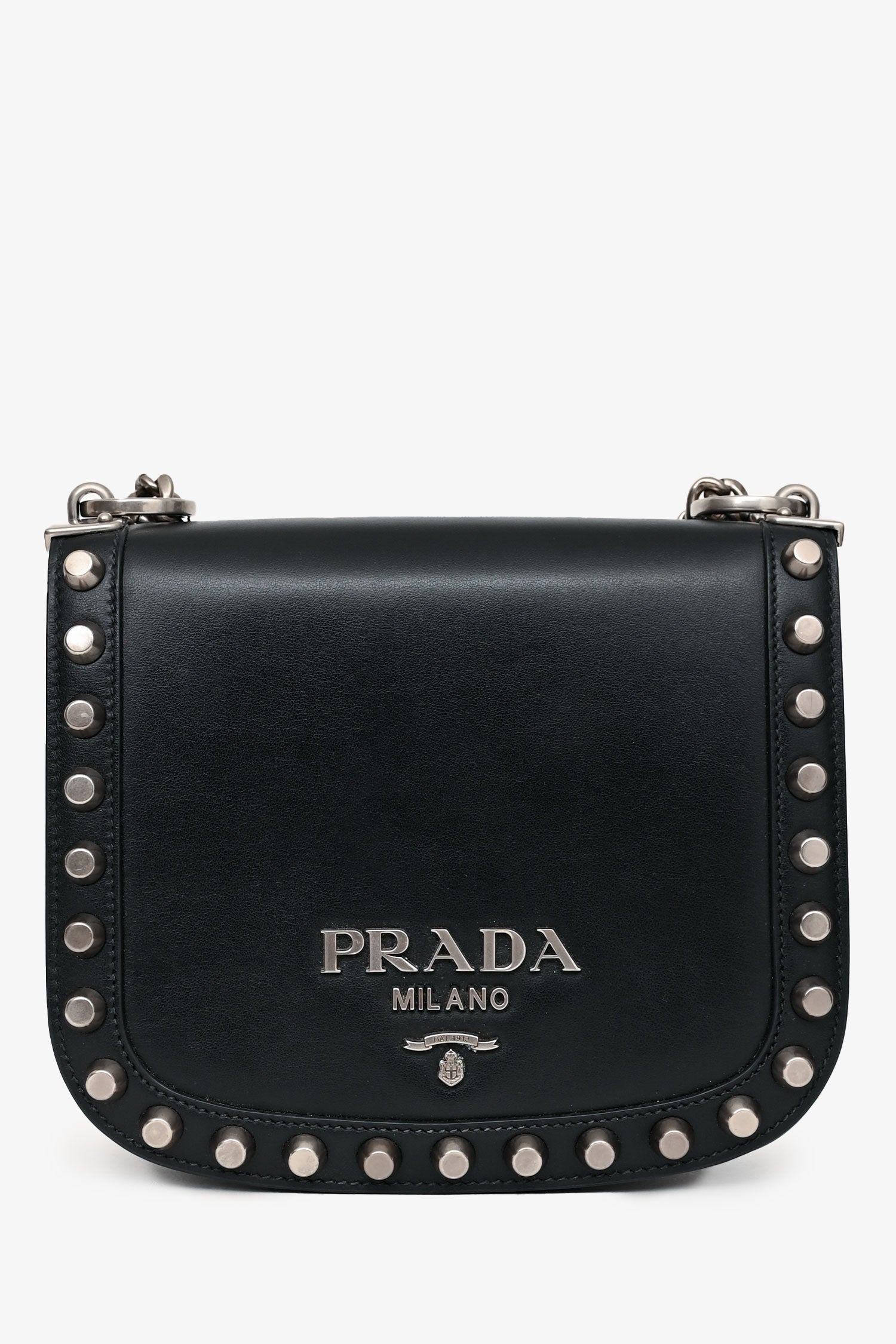 Refresh availabilityPrada Black Leather Studded Square Crossbody Bag. Fold-over flap with a snap closure. Silver-tone hardware. Interior slip compartment. Chain-link crossbody strap. Tonal stitching.