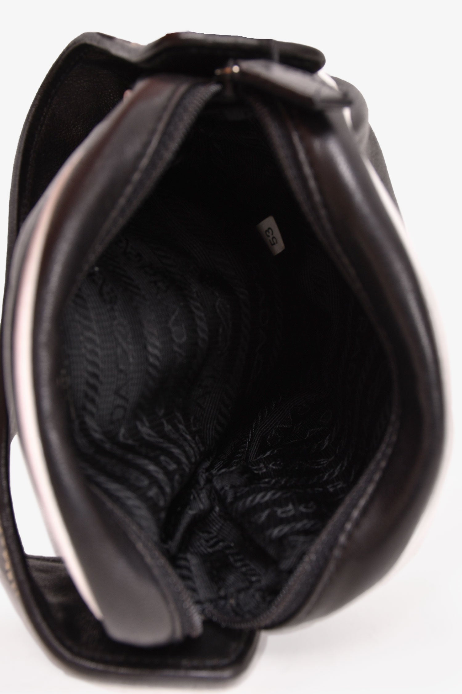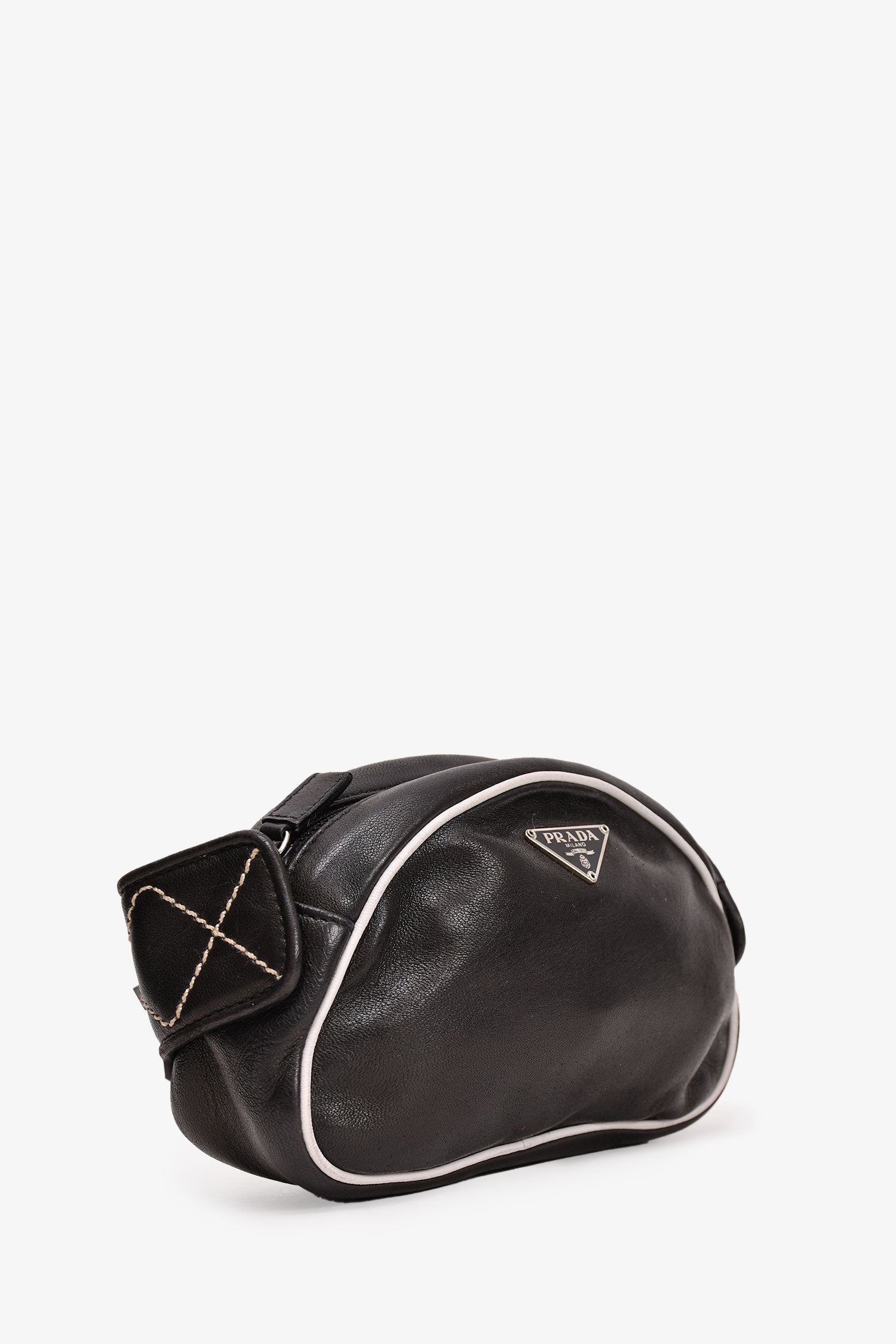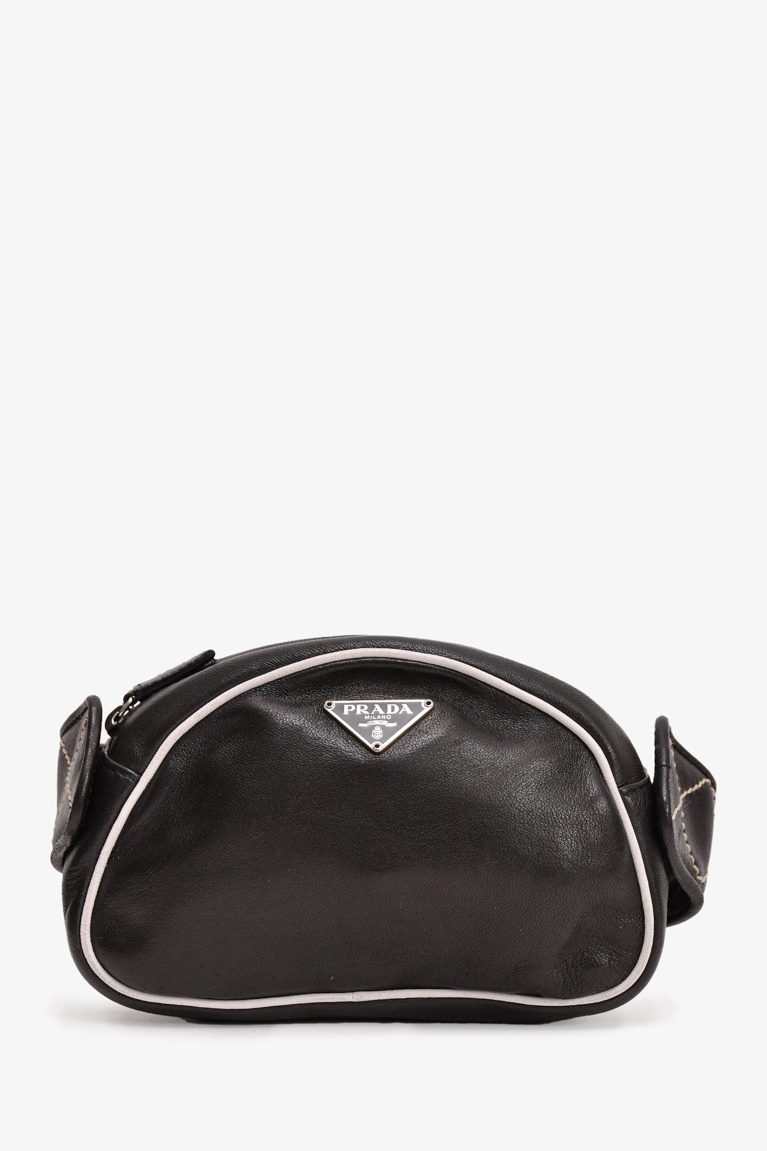 Refresh availabilityPrada Black Leather Trim Detail Pouch. Top zip closure. Tonal logo'd textile interior lining. Open interior. Removable top handle. Silver-tone hardware.