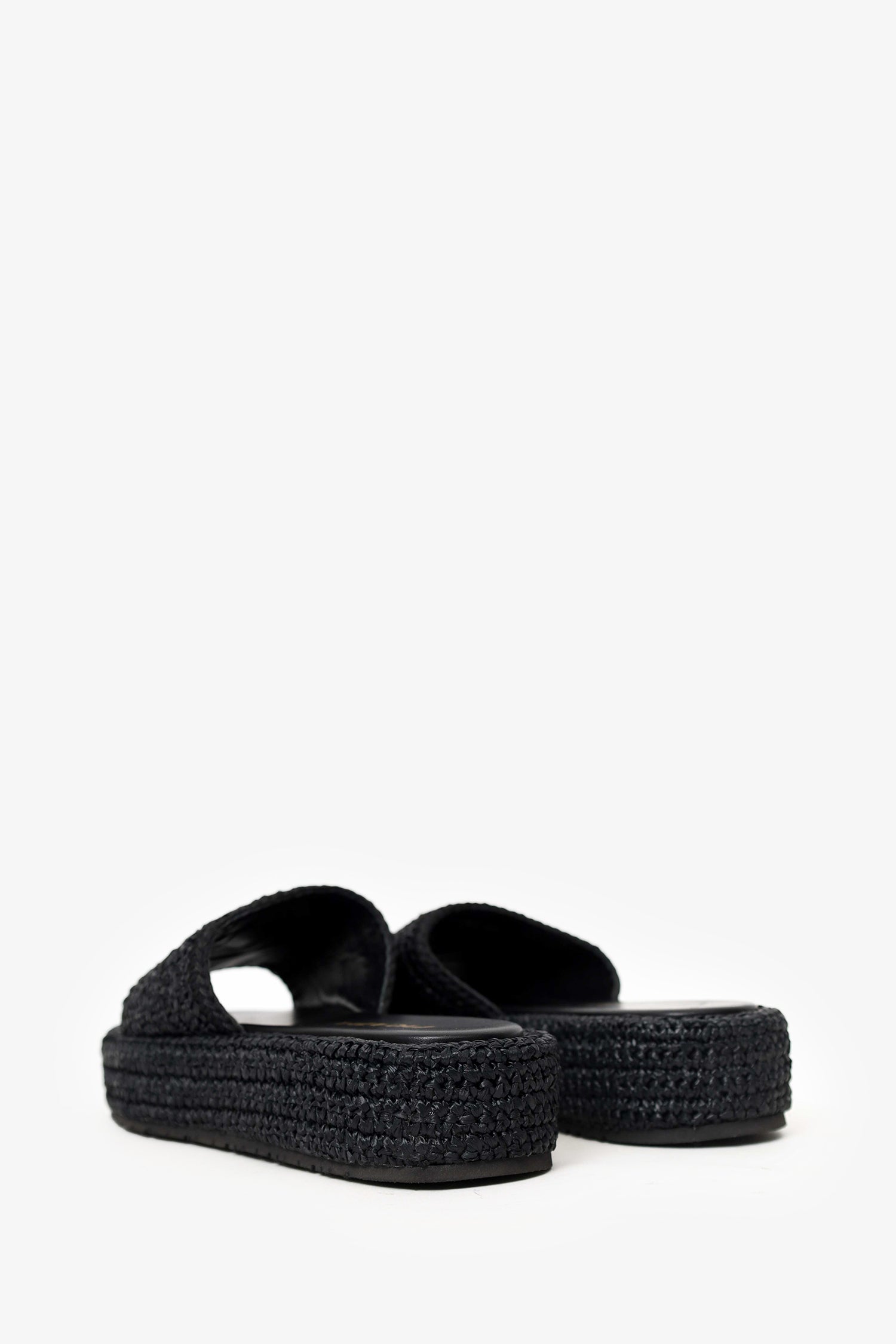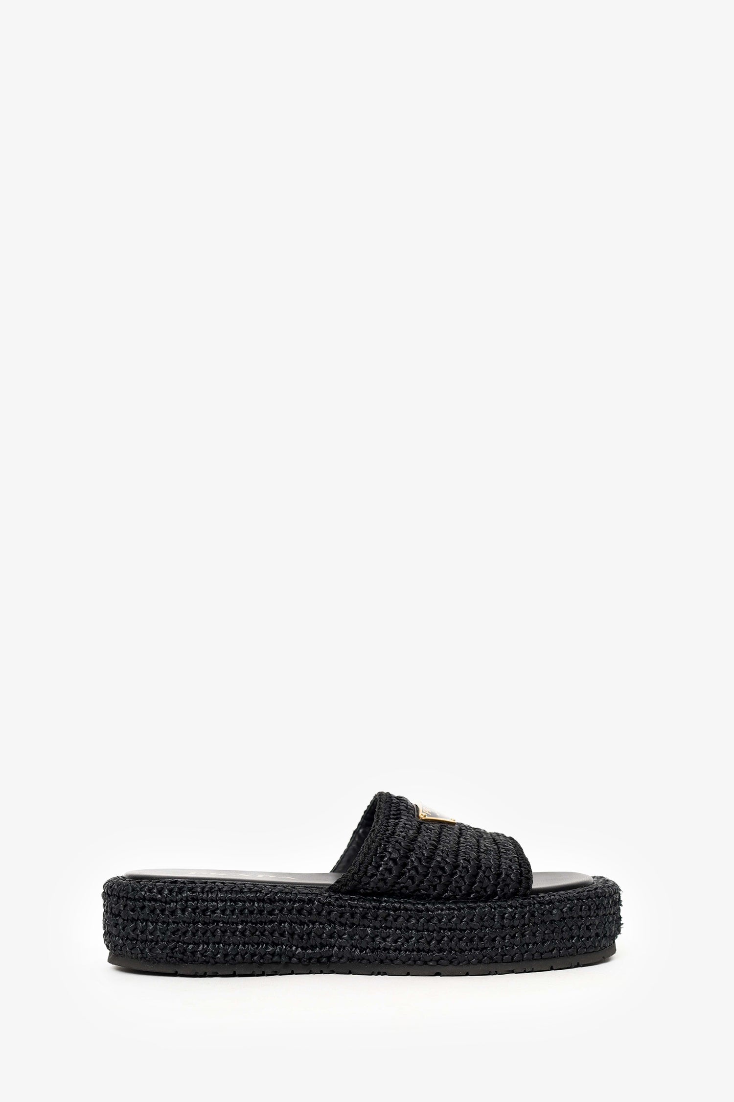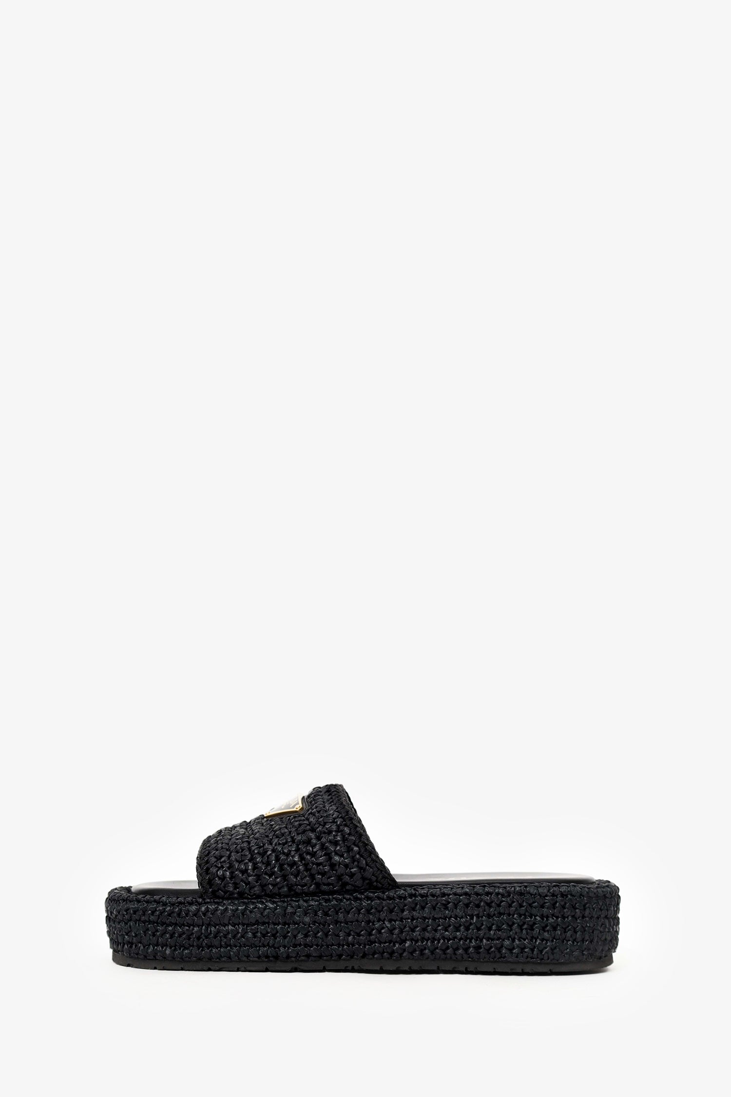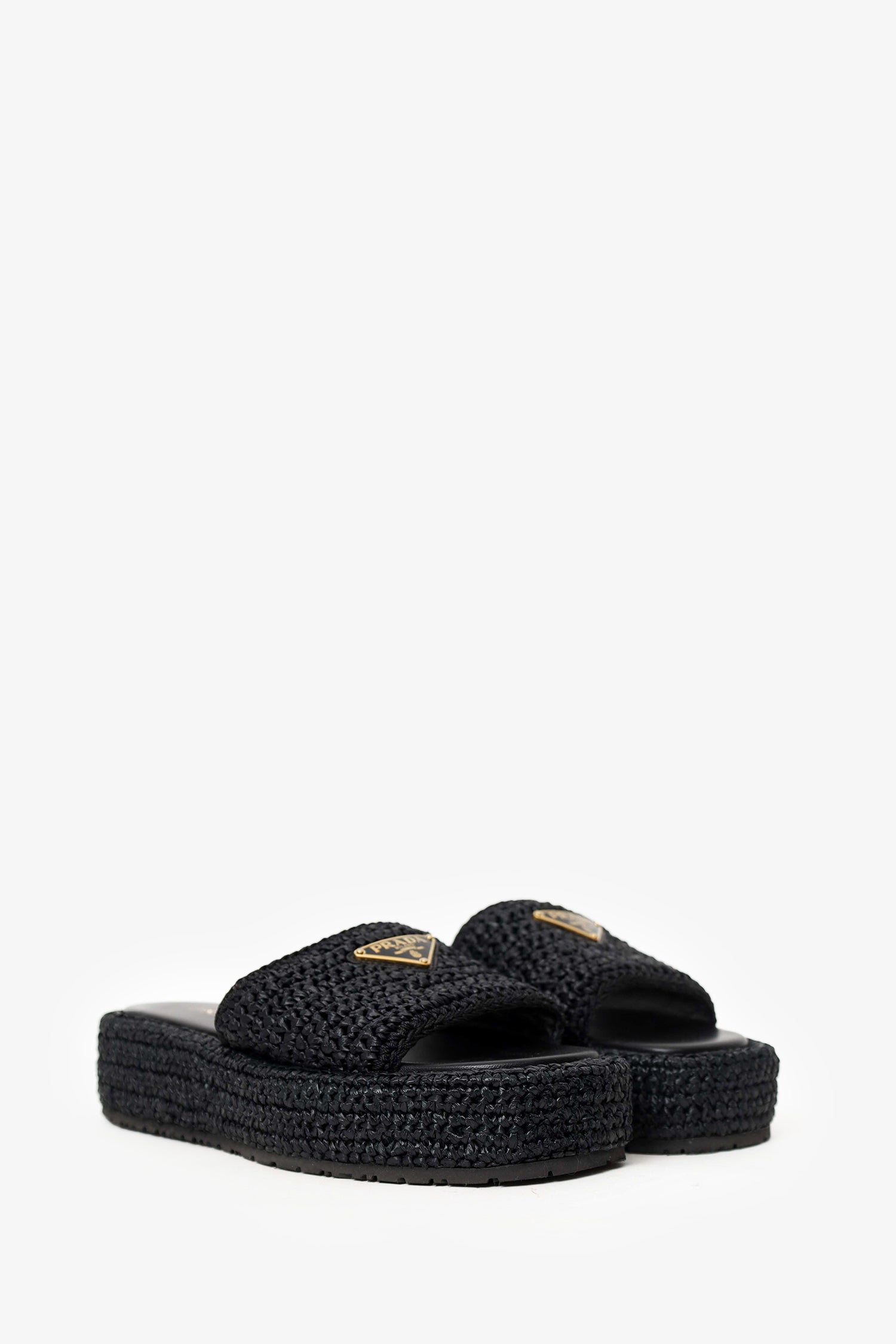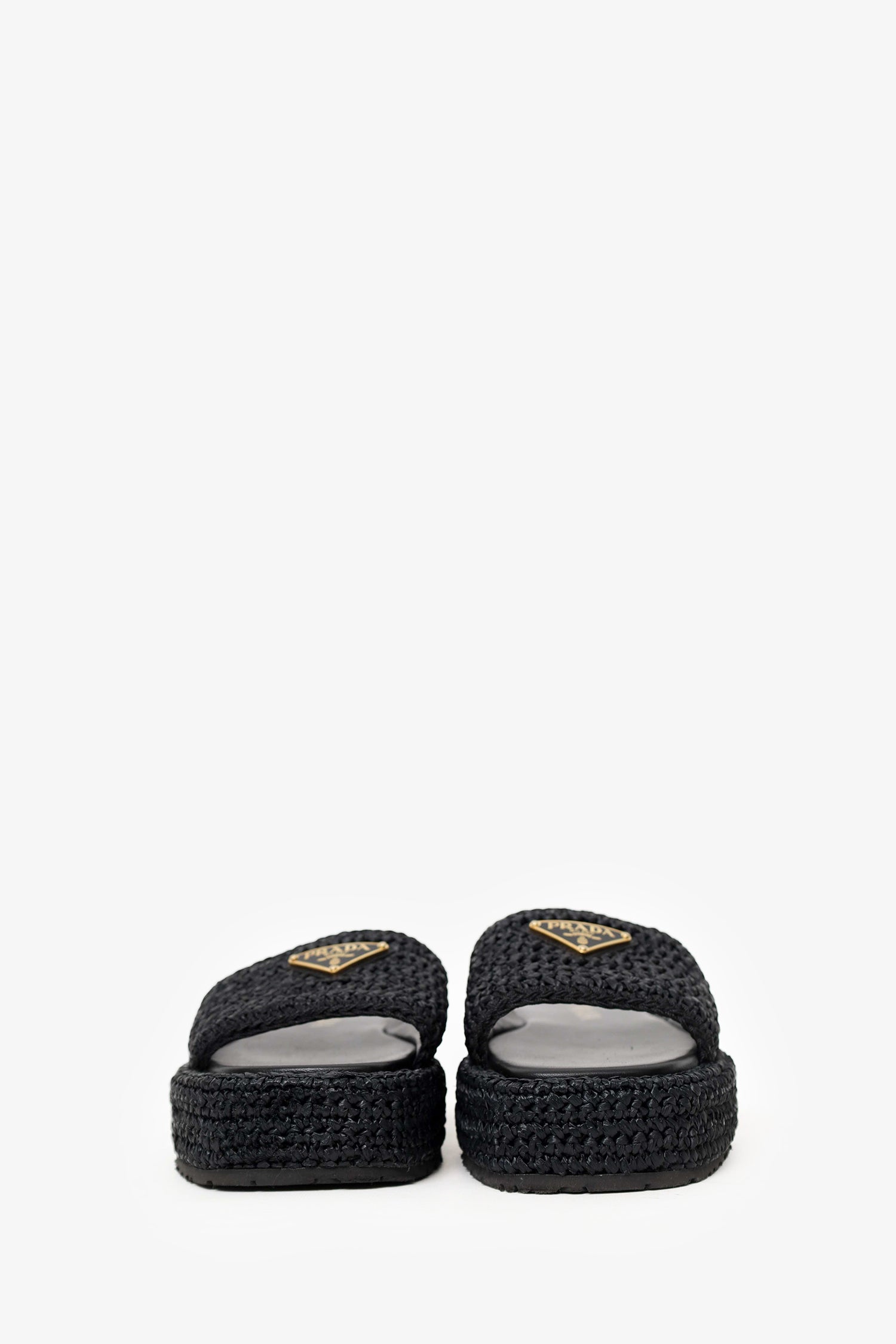 Refresh availabilityPrada Black Logo-plaque Woven Raffia Sandals. Slip-on. Open toe. Logo vamp. Gold-tone hardware. Tonal stitching.