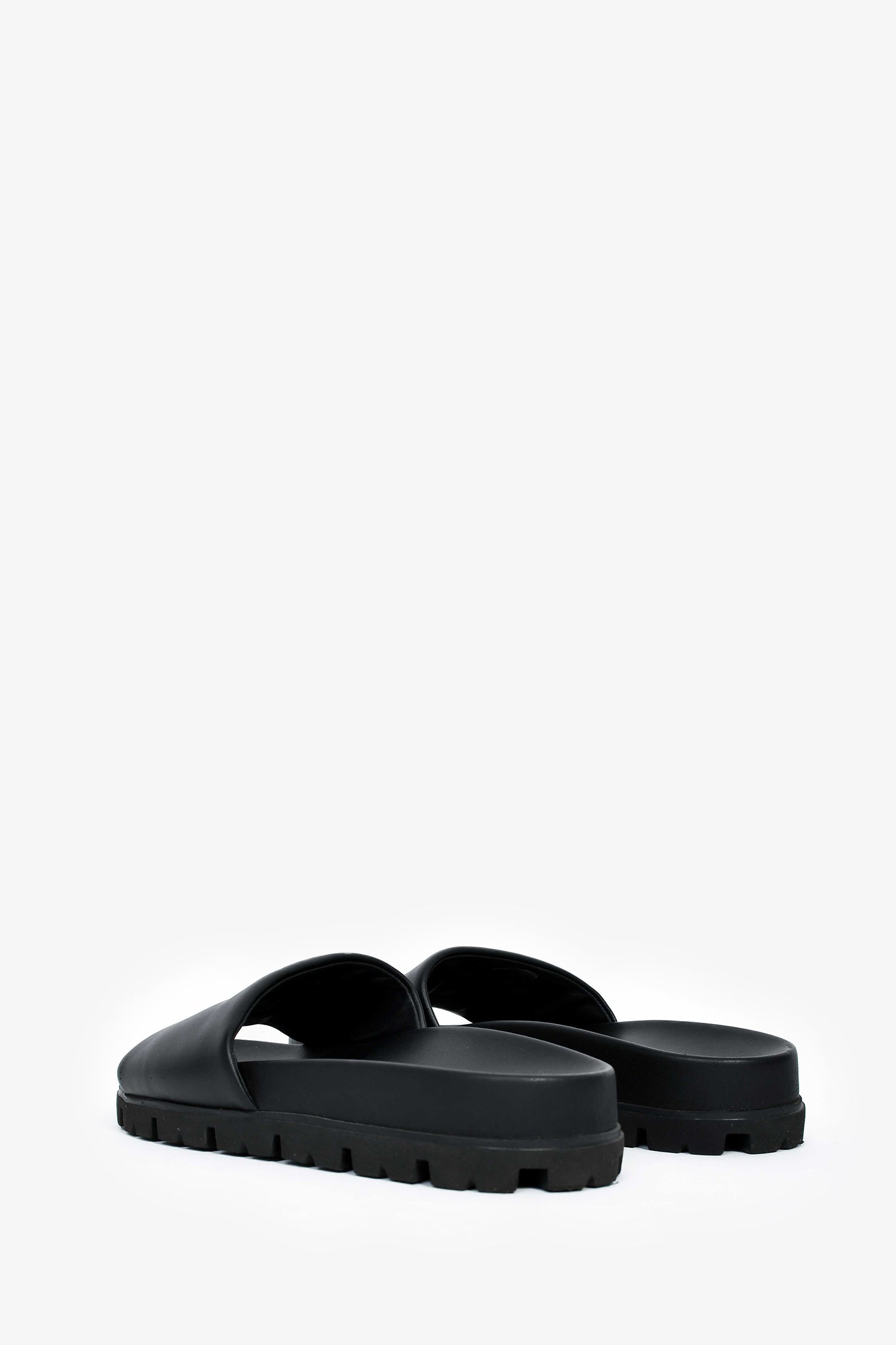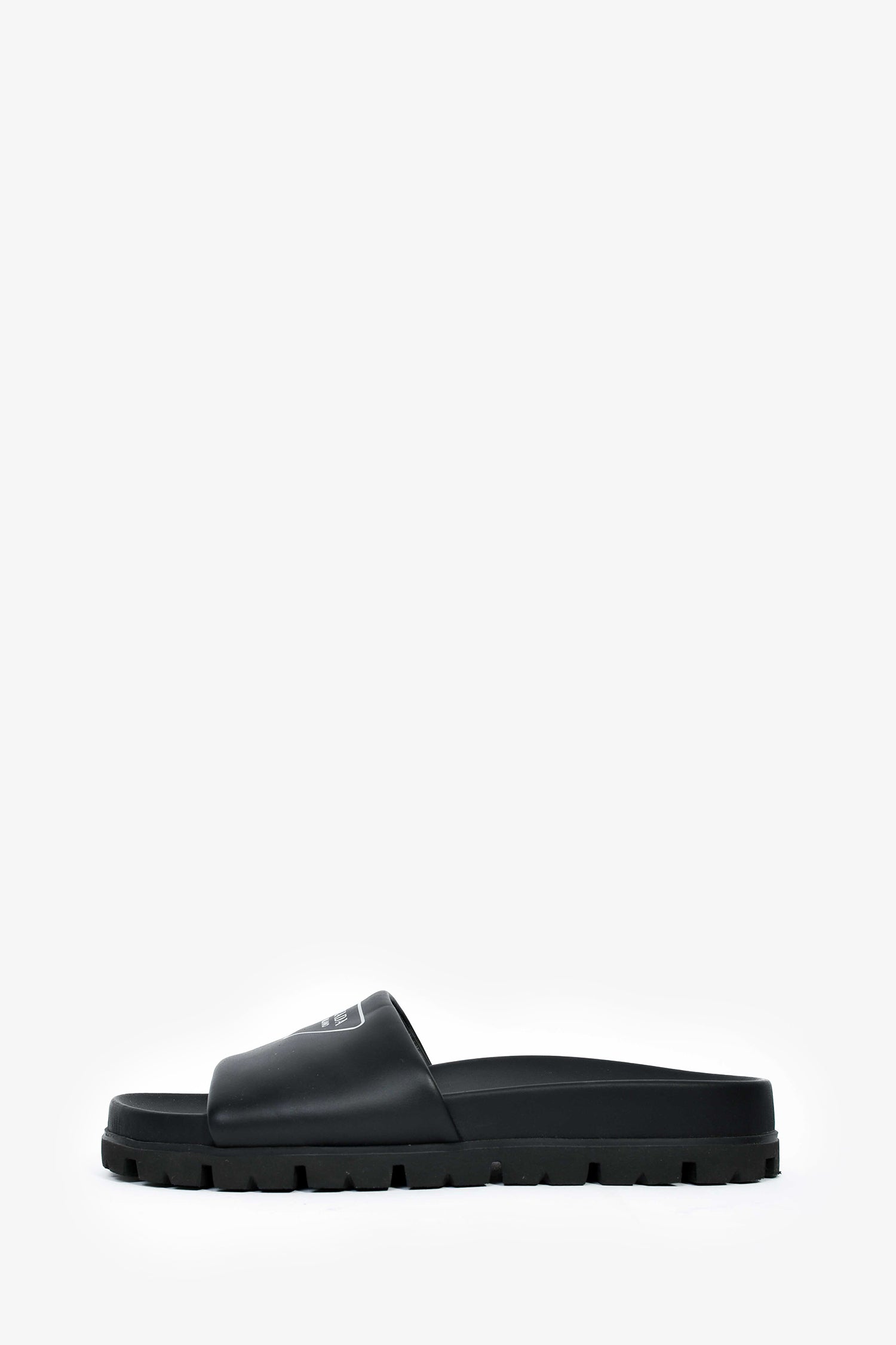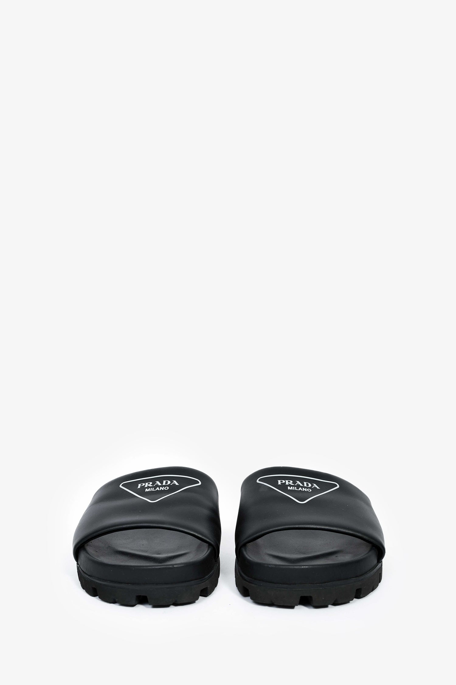 Refresh availabilityPrada Black Logo Rubber Slides. Slide-on. Padded foot strap. Stacked soles. Tonal stitching.