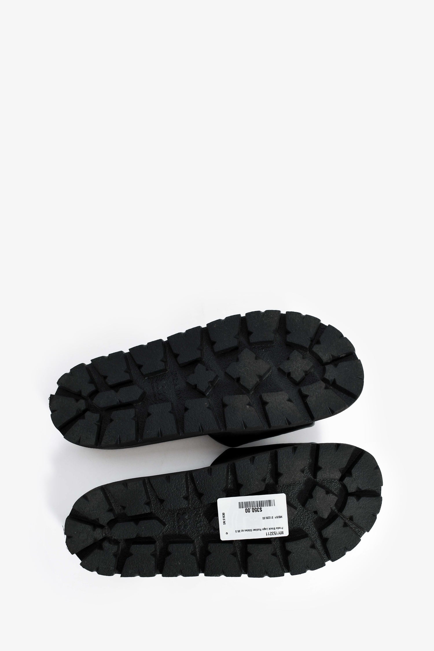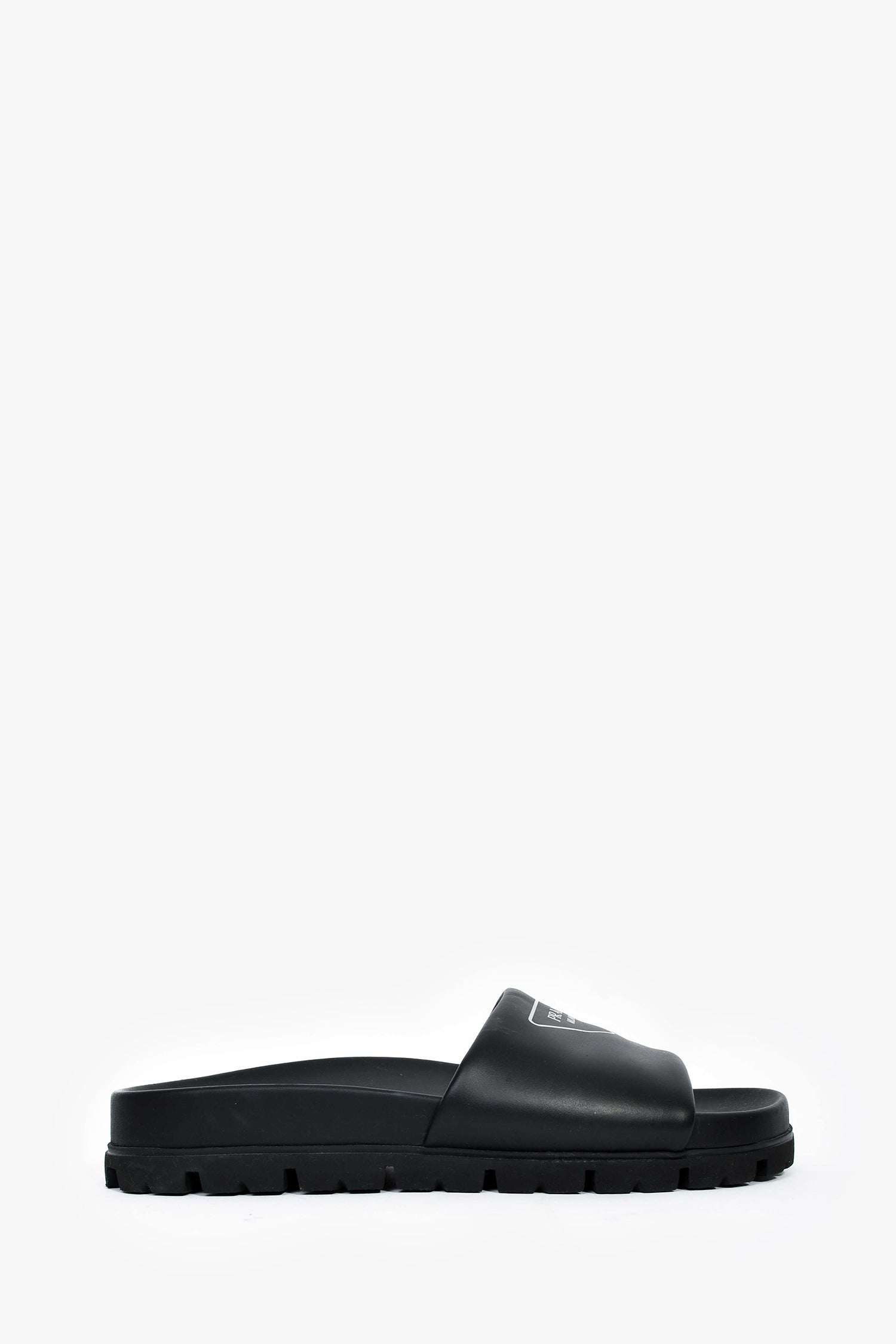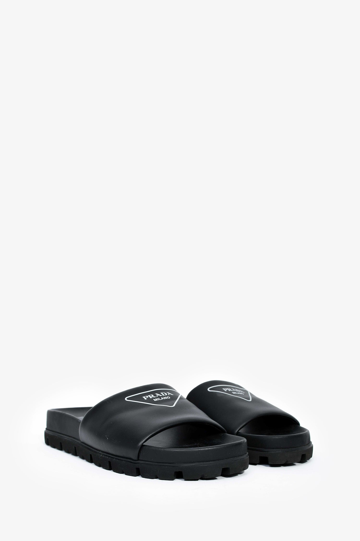 Refresh availabilityPrada Black Logo Rubber Slides. Slide-on. Padded foot strap. Stacked soles. Tonal stitching.