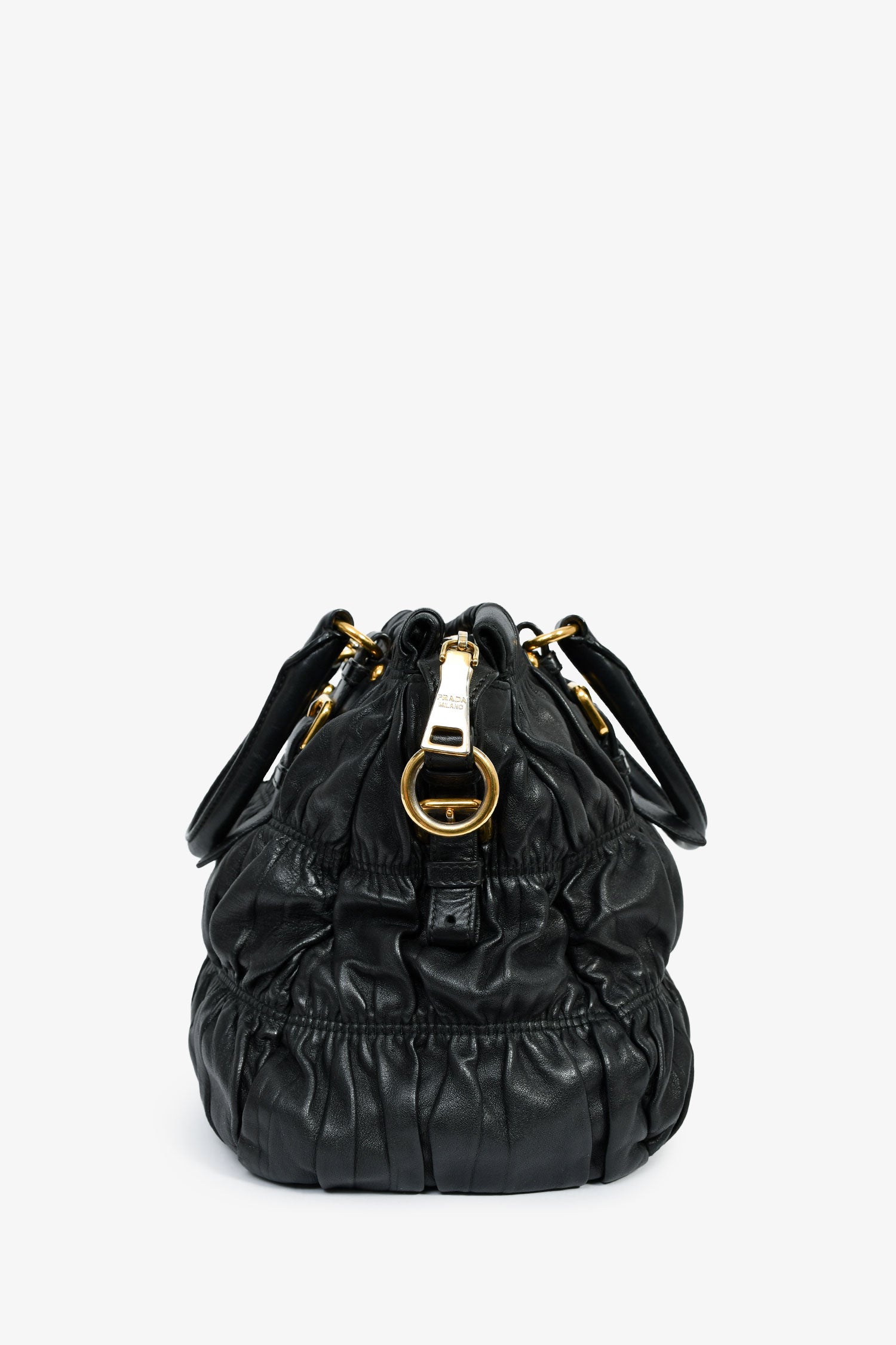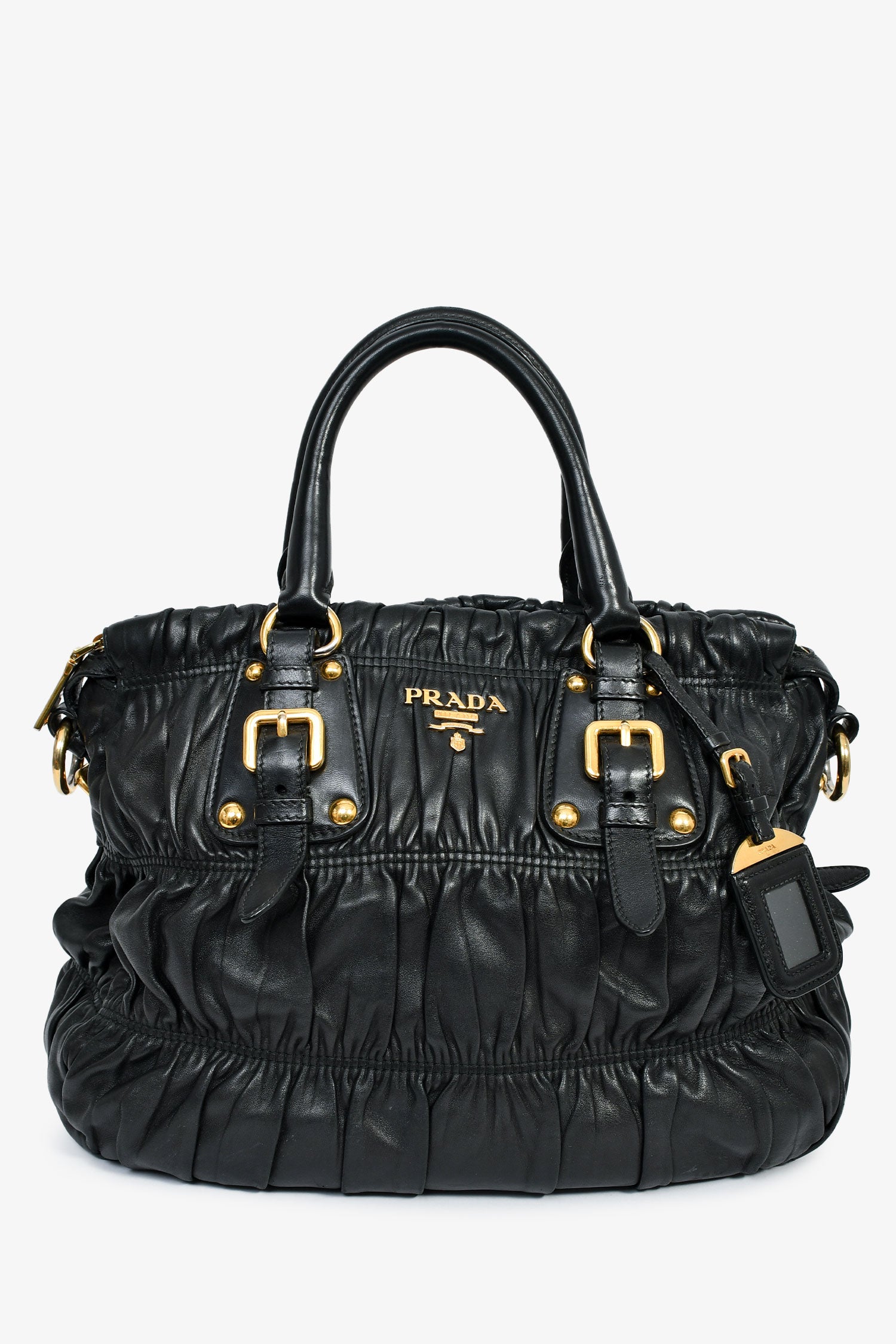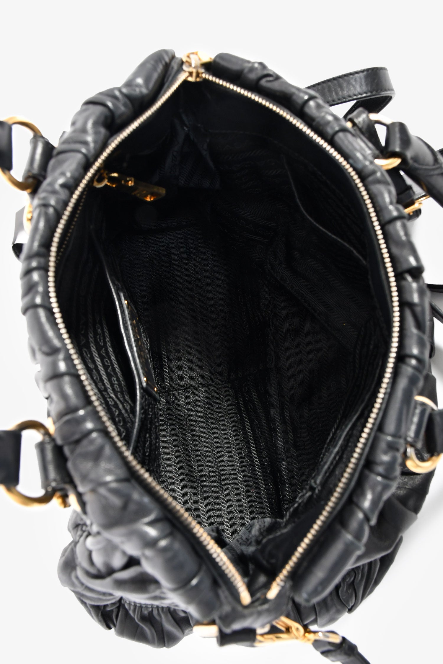 Refresh availabilityPrada Black Metallic Nappa Gaufre Leather Top Handle Bag with Strap. Top zip closure. Dual rolled handles. Removable shoulder strap. Lined interior. 3 interior pockets; 1 zip and 2 slip. Gold-tone hardware. Tonal stitching.