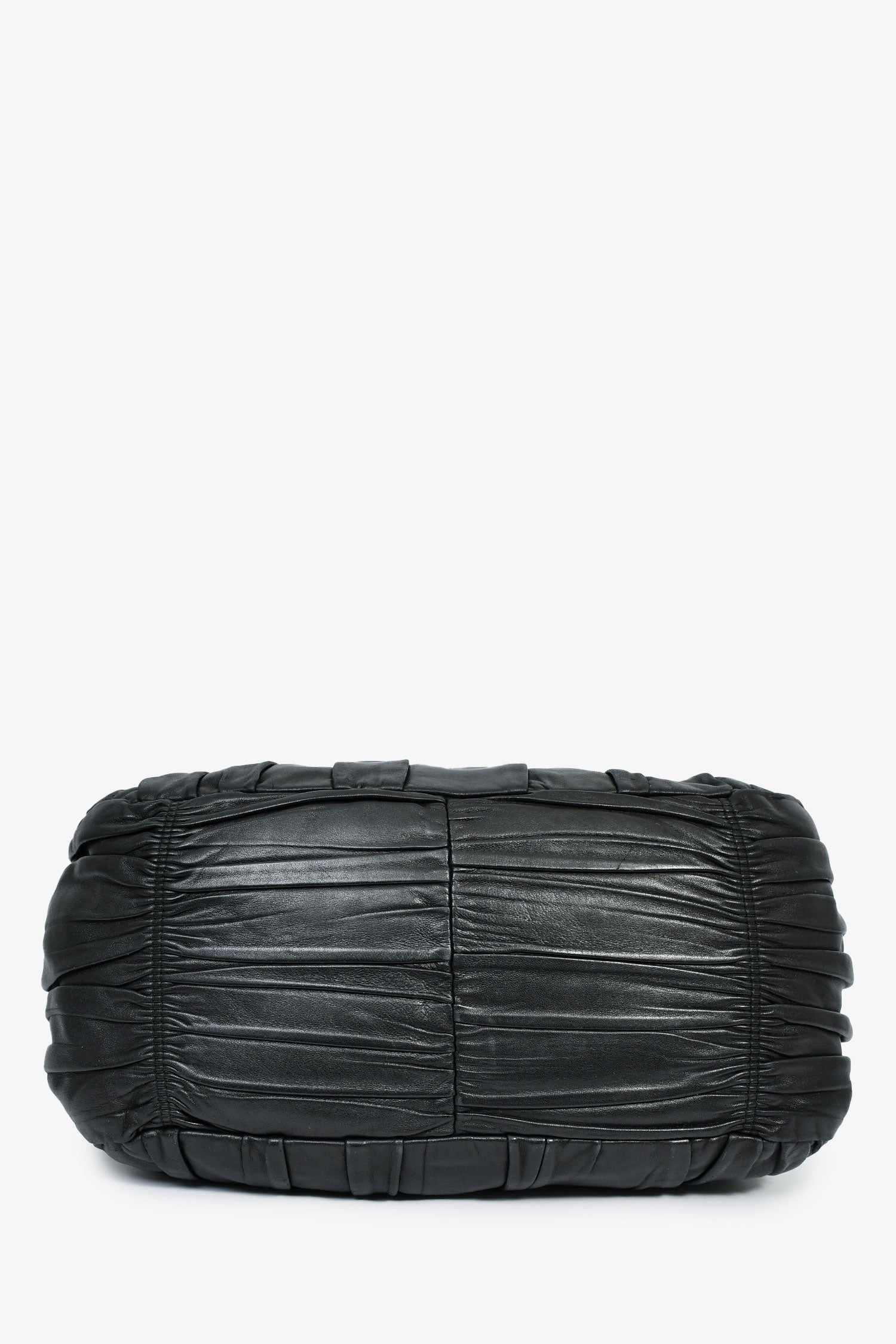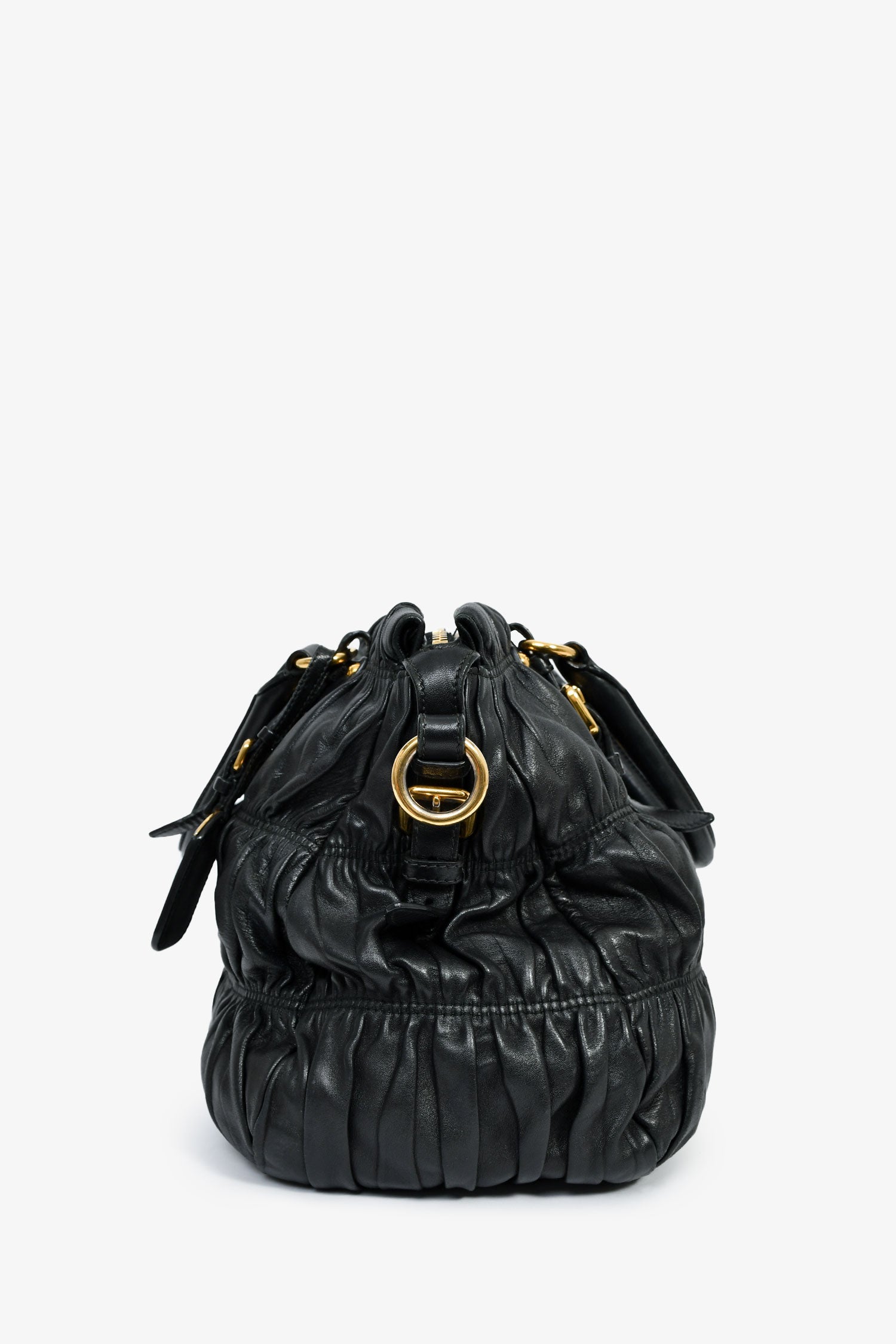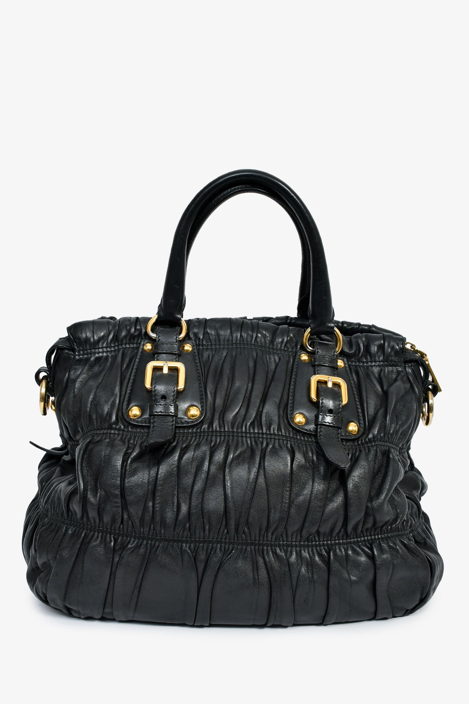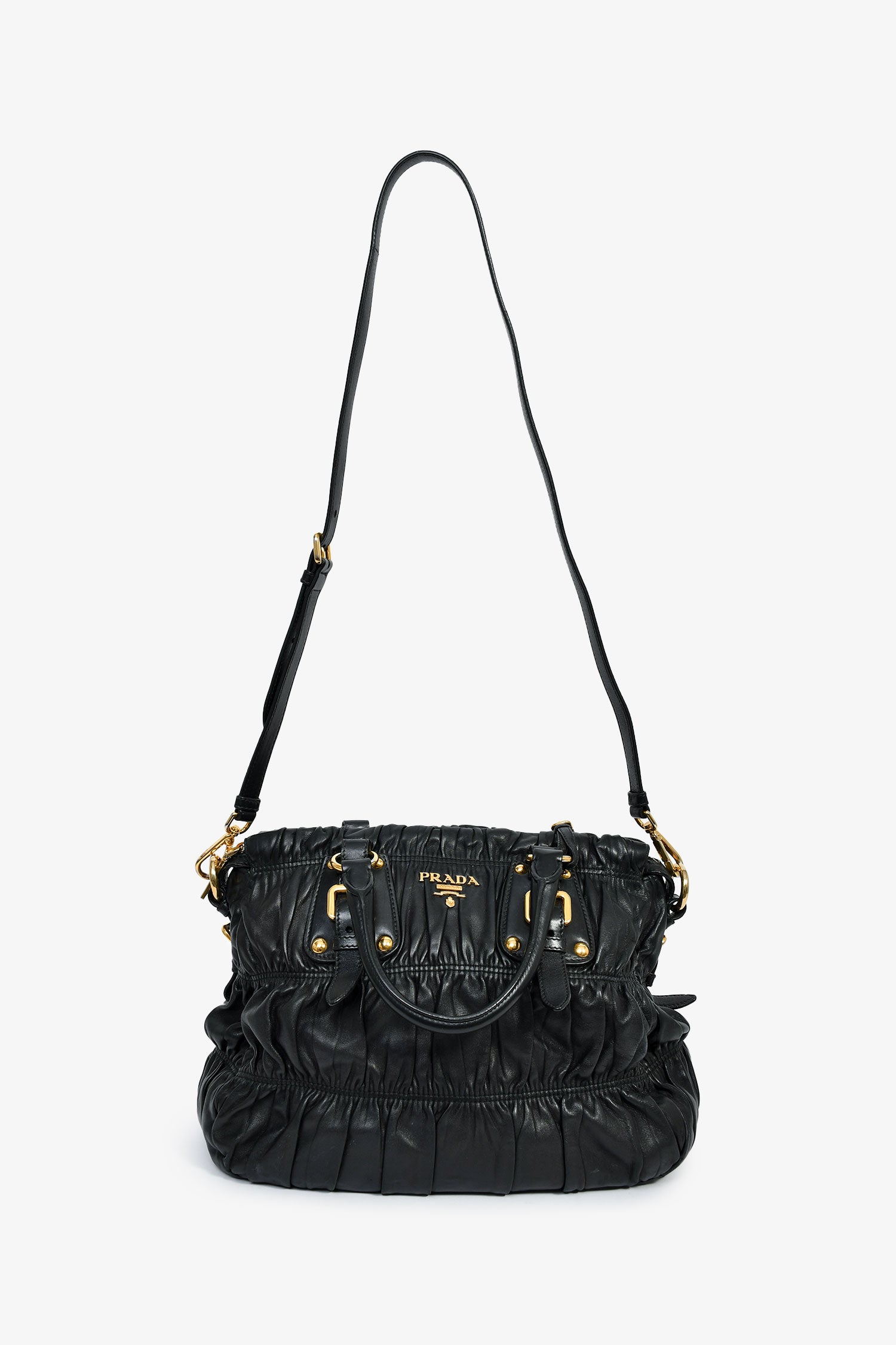Refresh availabilityPrada Black Metallic Nappa Gaufre Leather Top Handle Bag with Strap. Top zip closure. Dual rolled handles. Removable shoulder strap. Lined interior. 3 interior pockets; 1 zip and 2 slip. Gold-tone hardware. Tonal stitching.