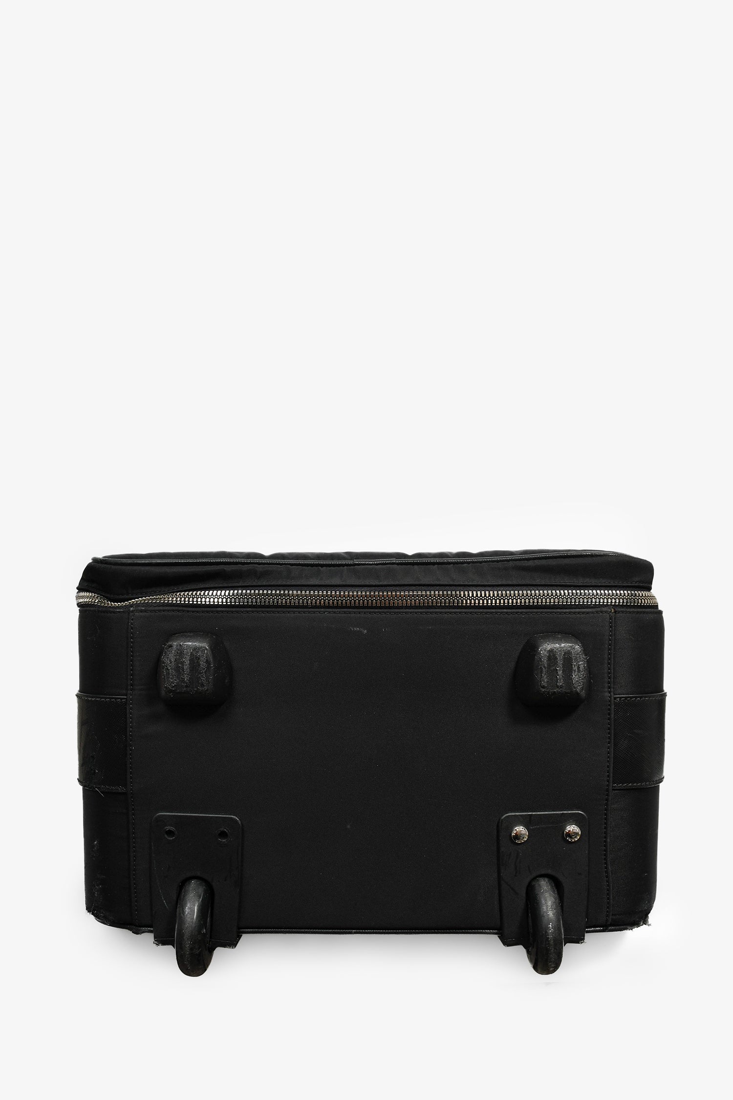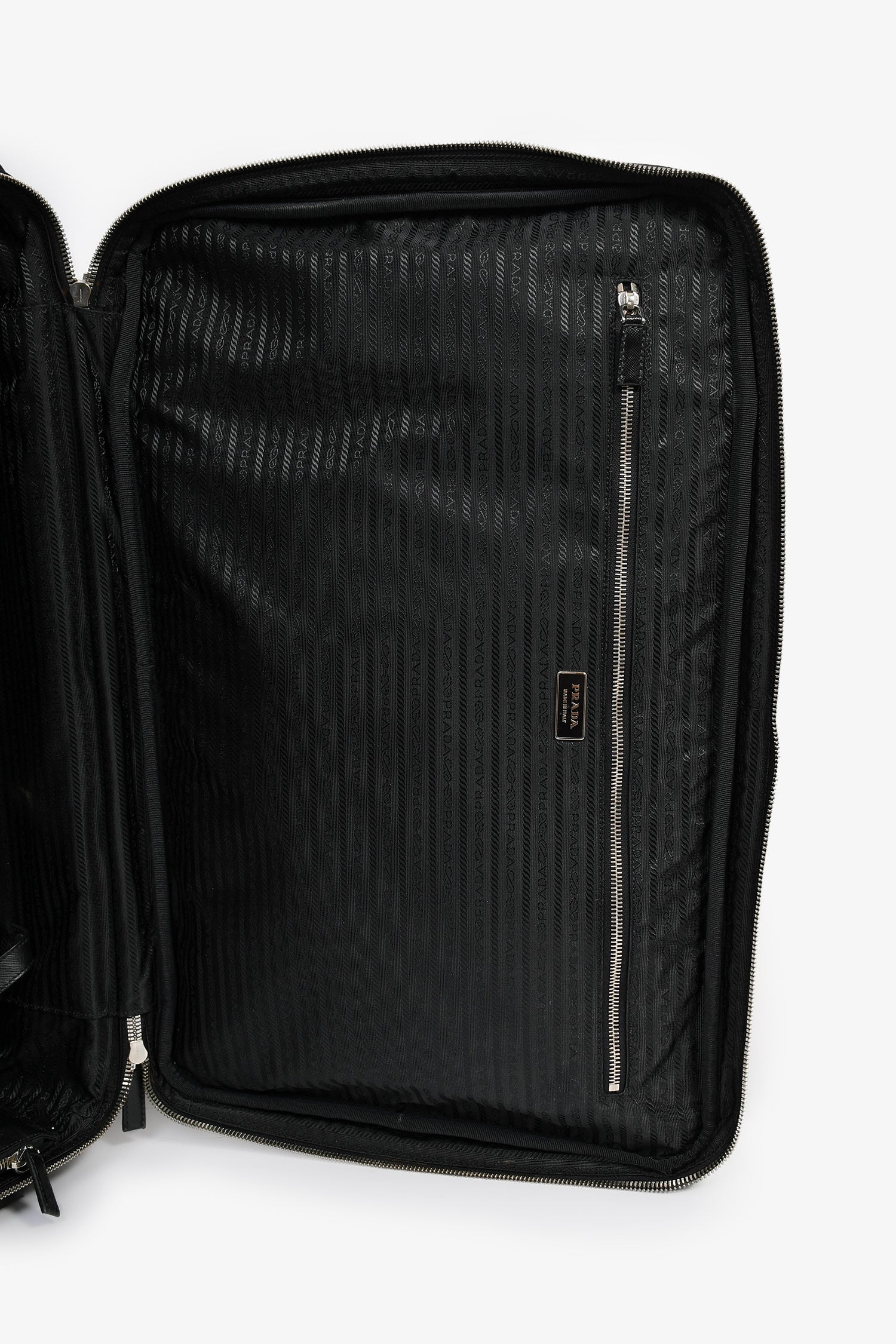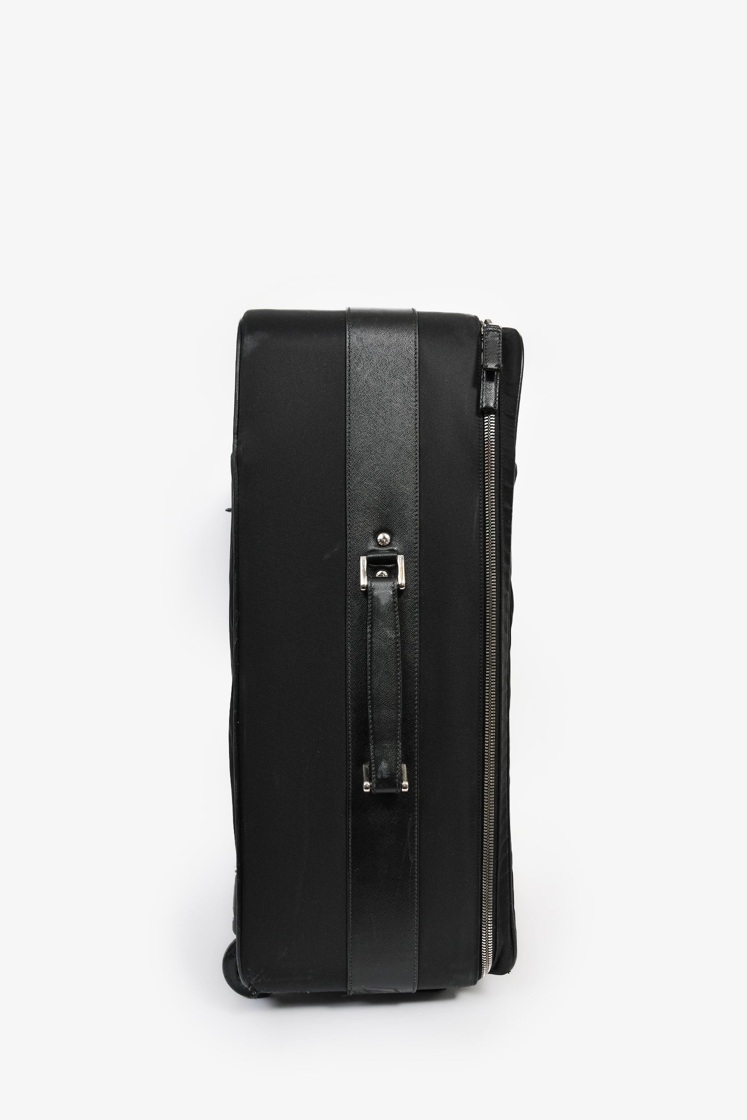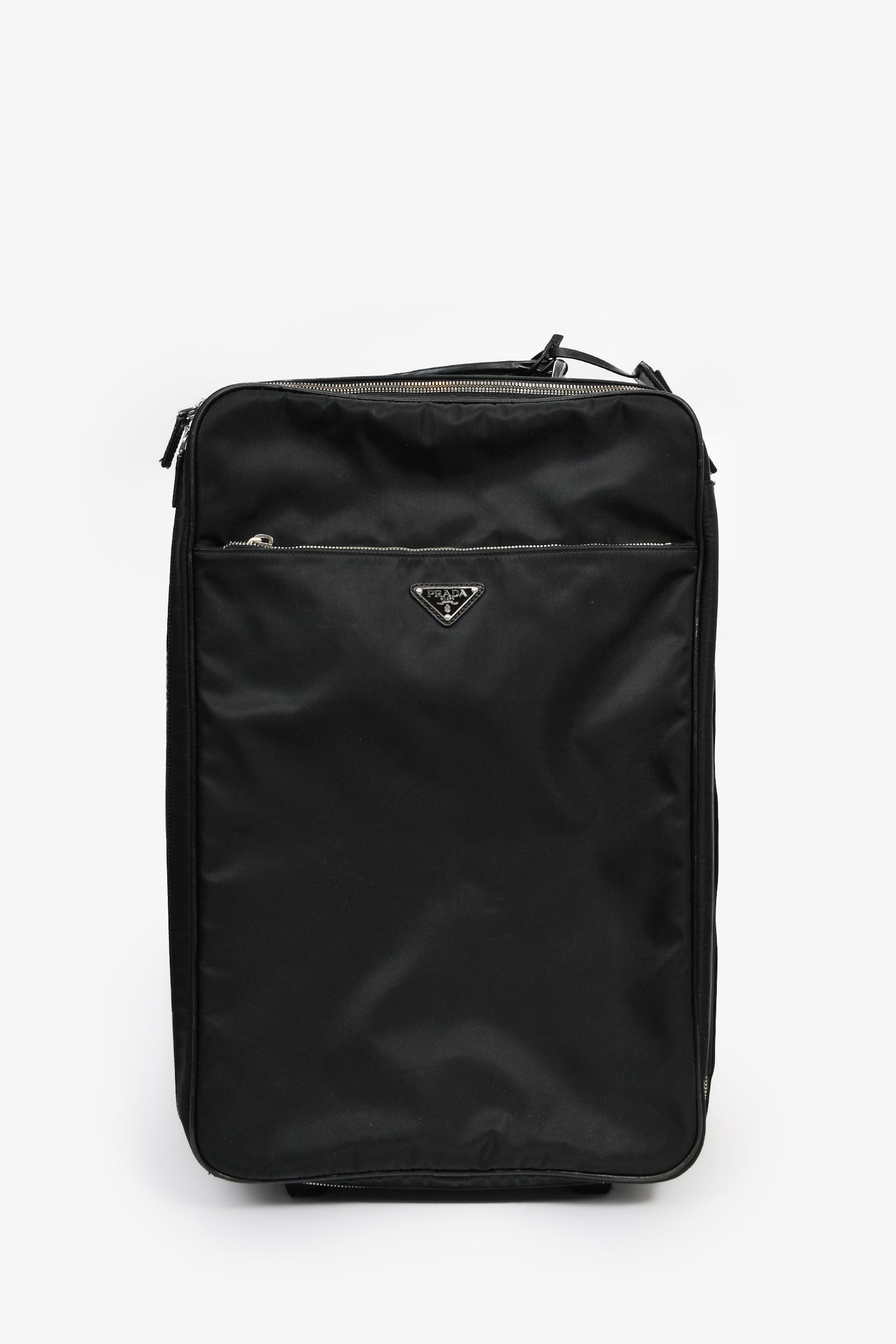 Refresh availabilityPrada Black Nylon 22" Roller Suitcase. Front two-way zip closure. Top and side handle. Front zip pocket. Lined interior. Interior straps with buckle closures. Single interior zip compartment. Removable luggage tag. Silver-tone hardware. Tonal stitching.