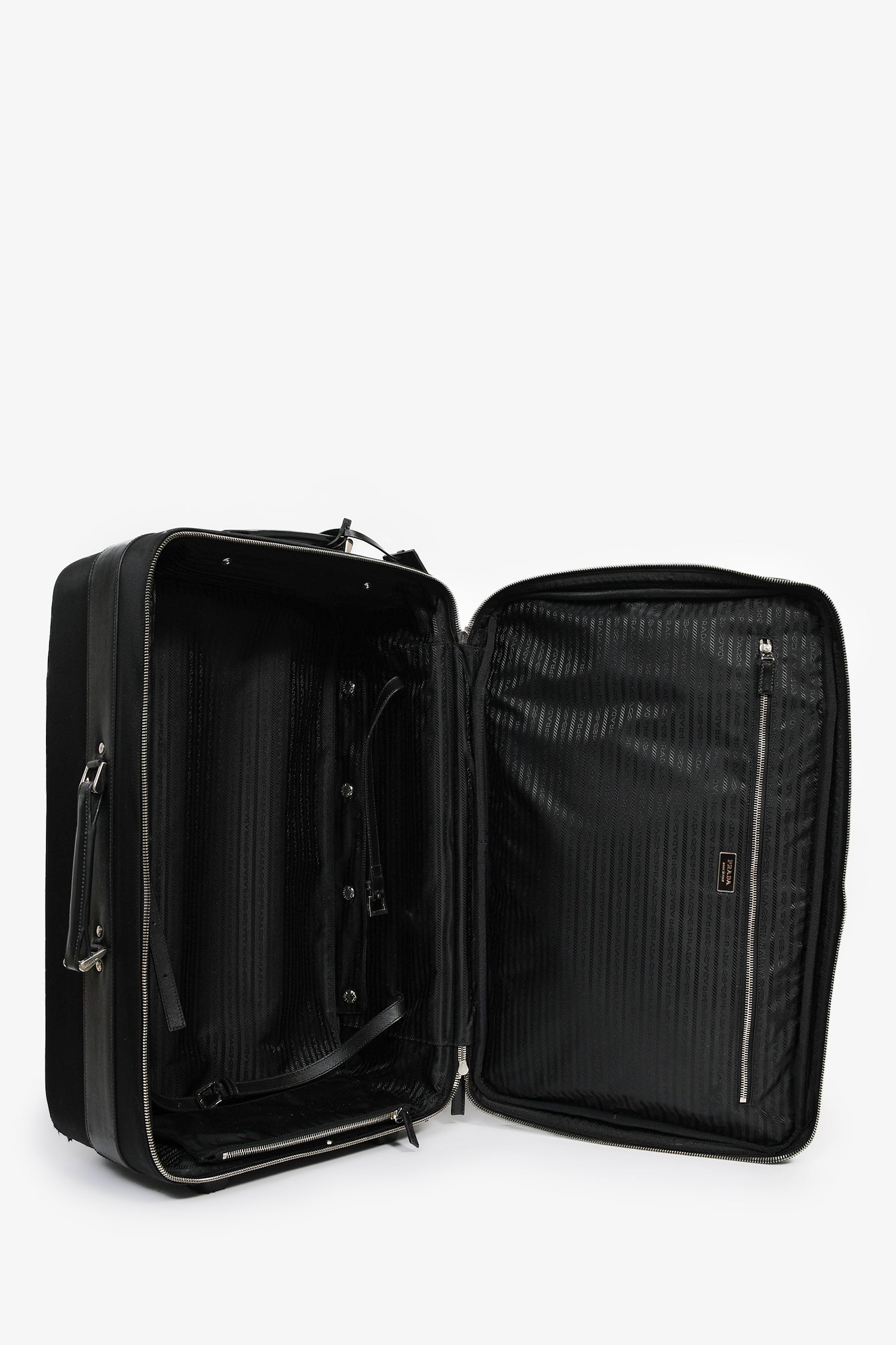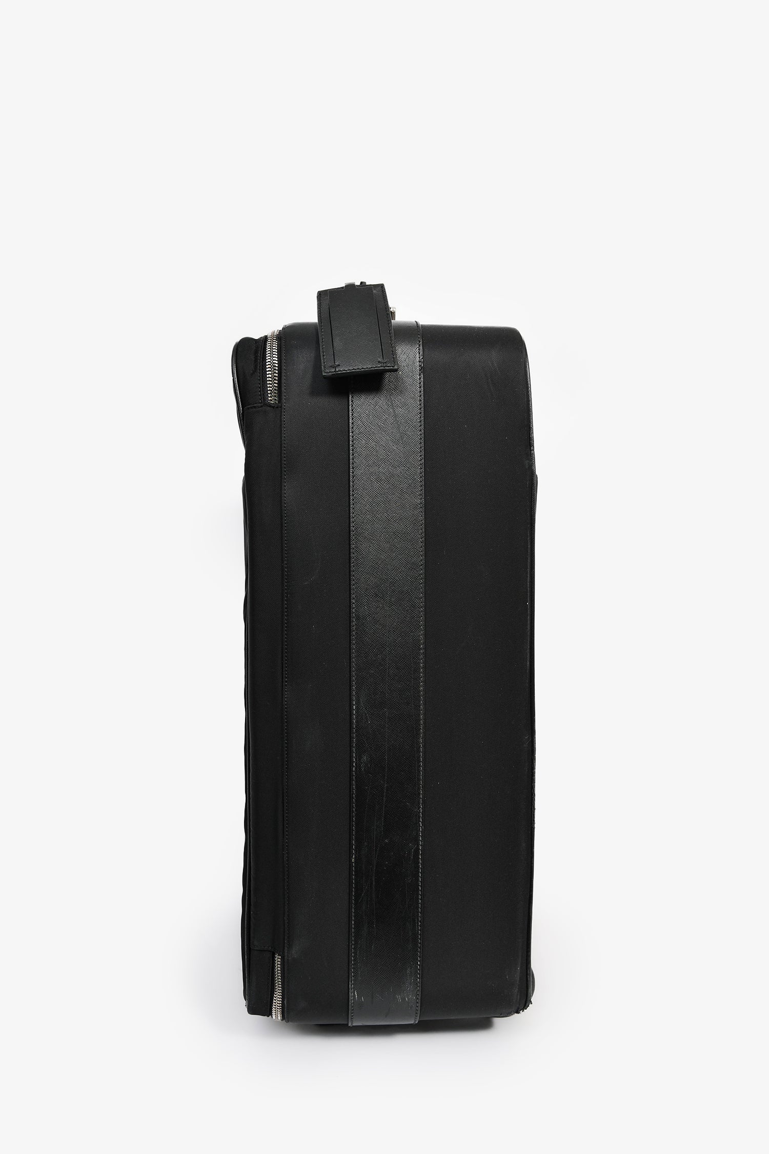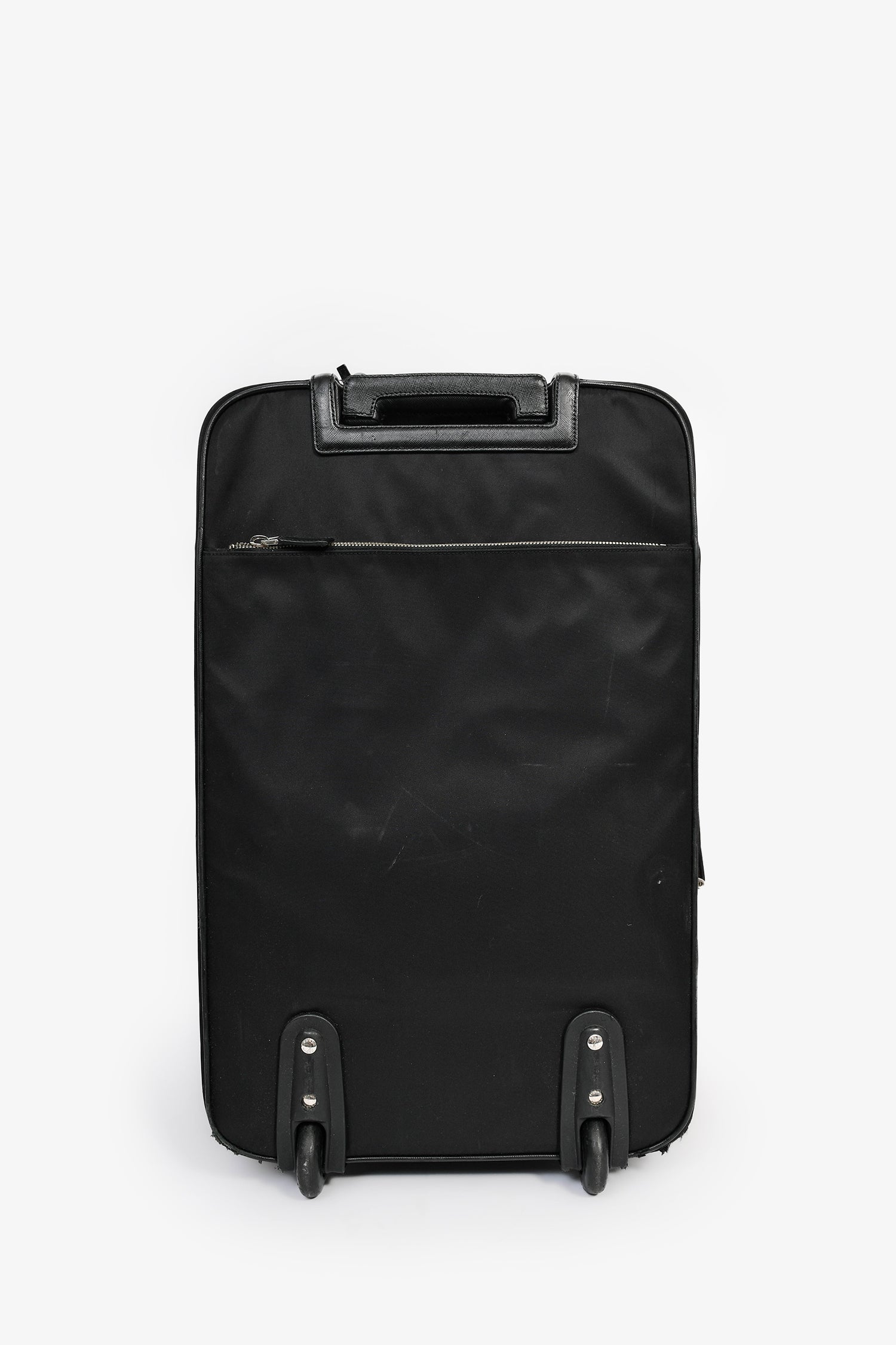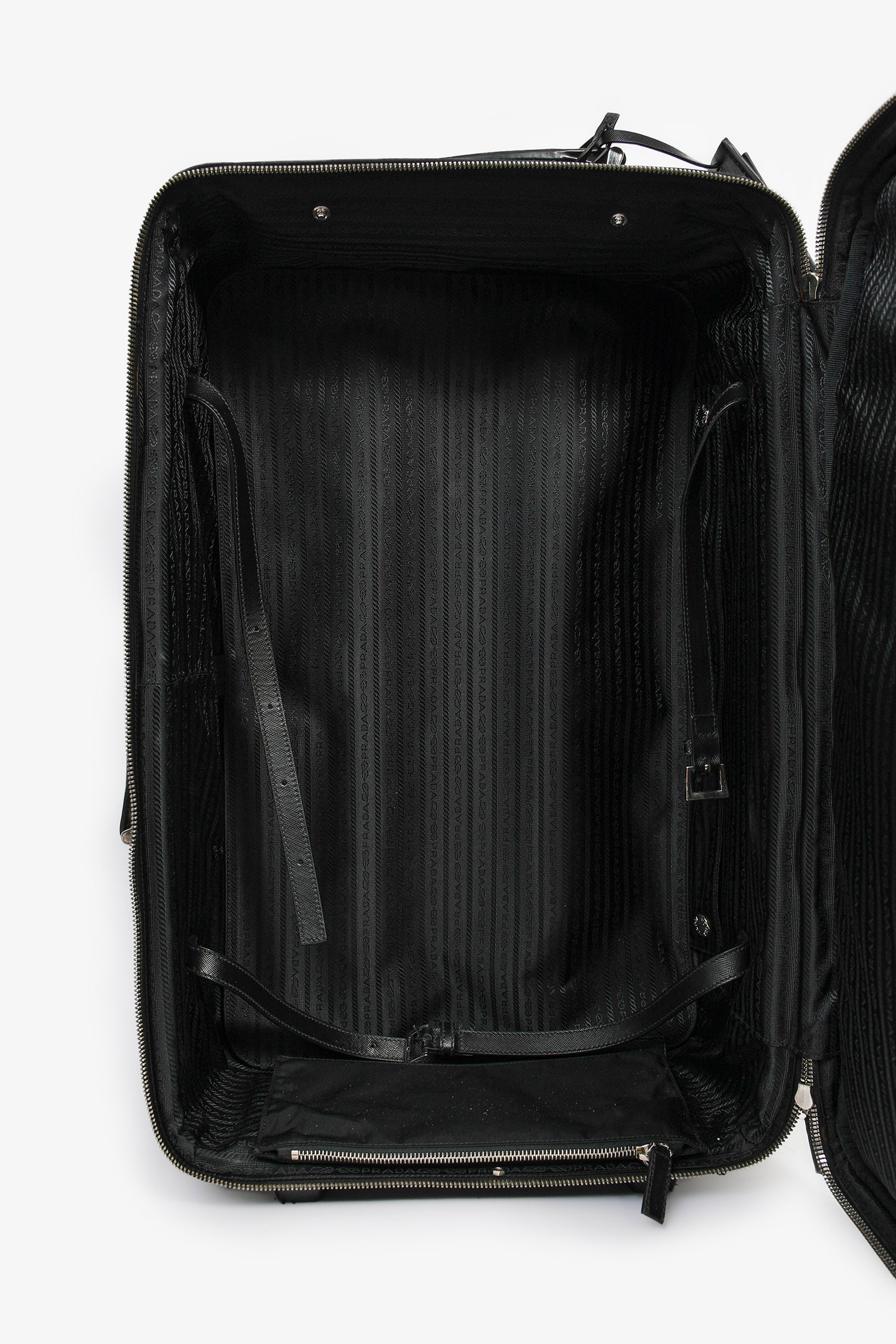 Refresh availabilityPrada Black Nylon 22" Roller Suitcase. Front two-way zip closure. Top and side handle. Front zip pocket. Lined interior. Interior straps with buckle closures. Single interior zip compartment. Removable luggage tag. Silver-tone hardware. Tonal stitching.