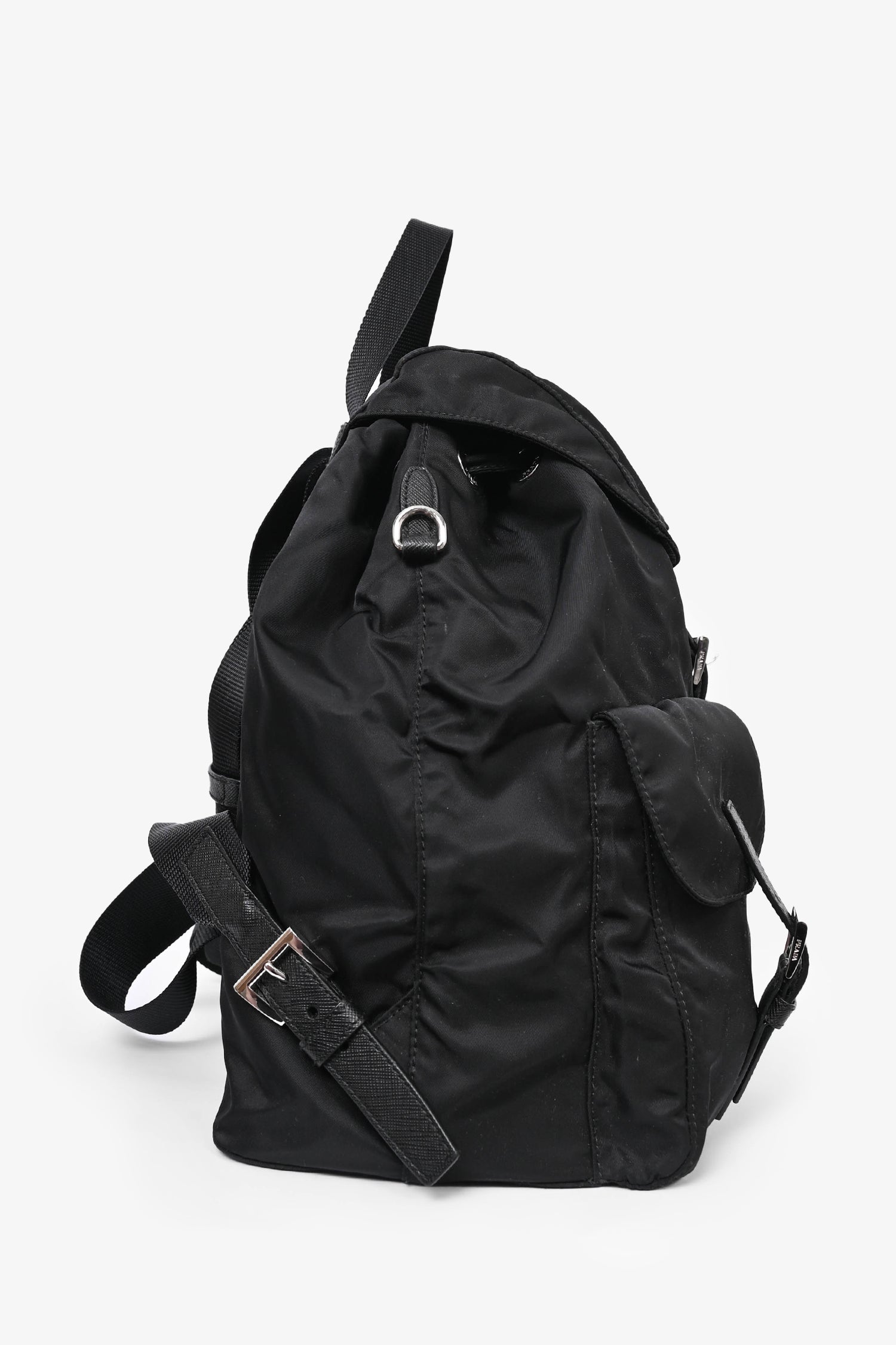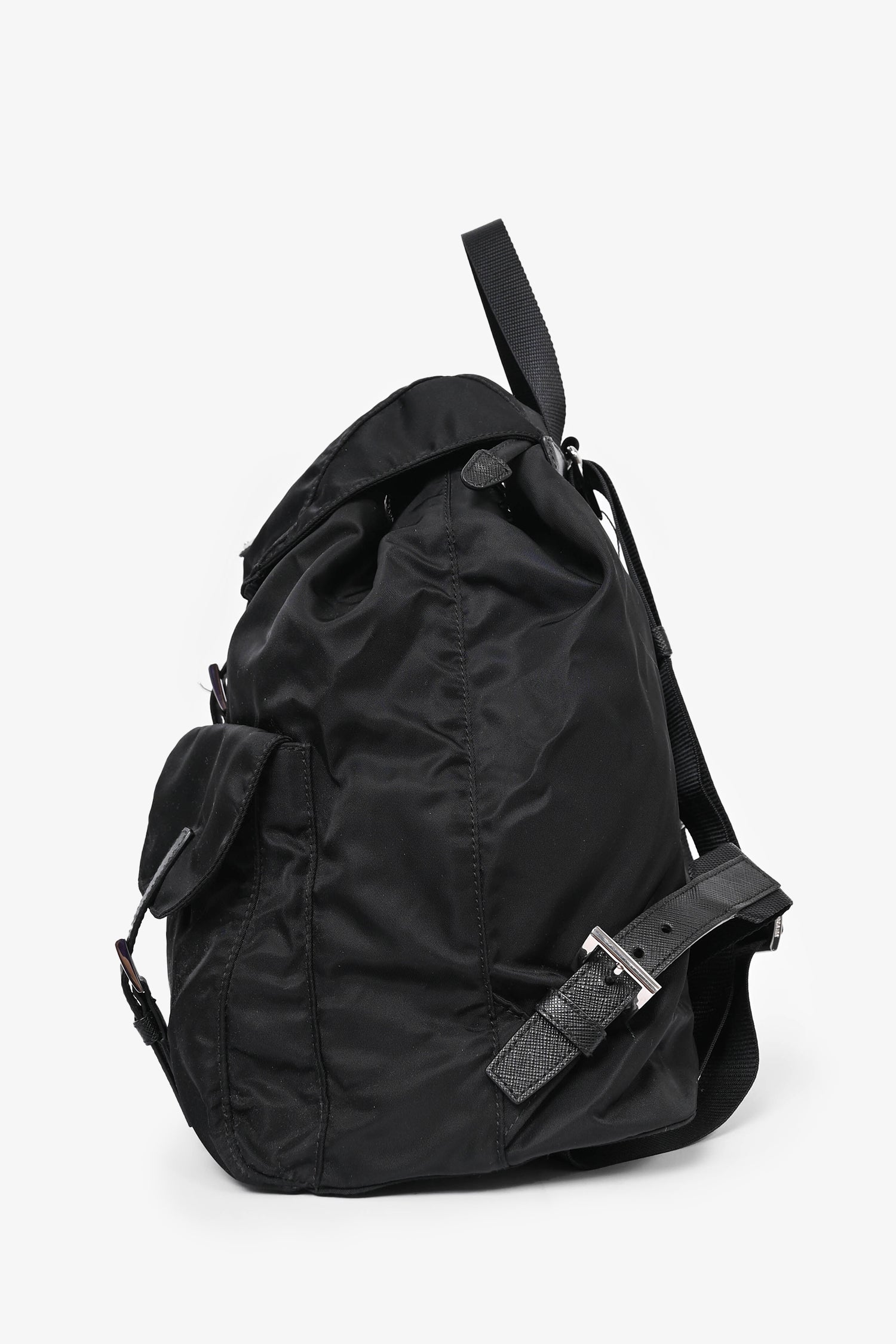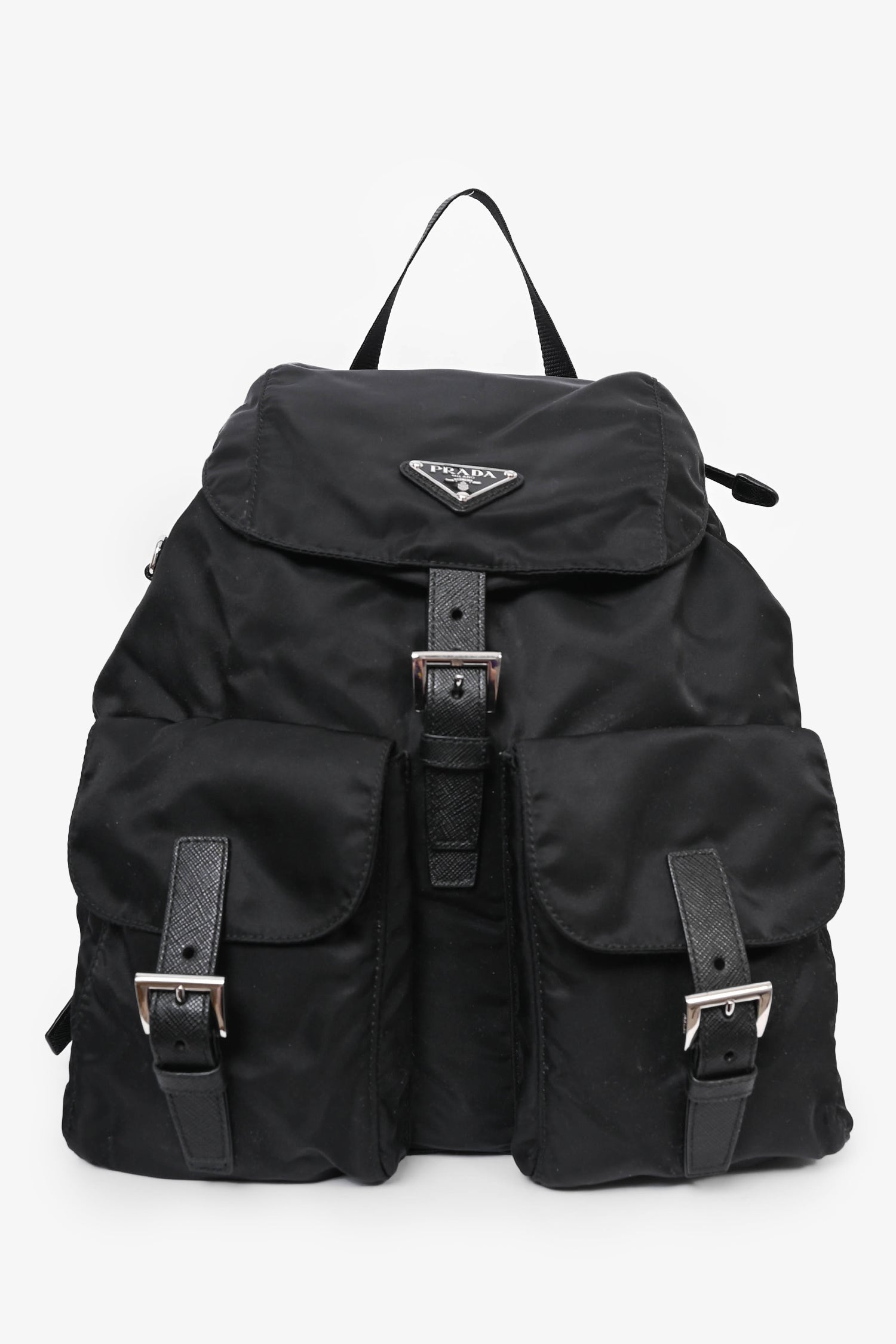 Refresh availabilityPrada Black Nylon Backpack. Leather trimming. Silver-tone hardware. Dual front pockets with straps. Adjustable pull tab. Back shoulder straps. Lined interior with zipped compartment.