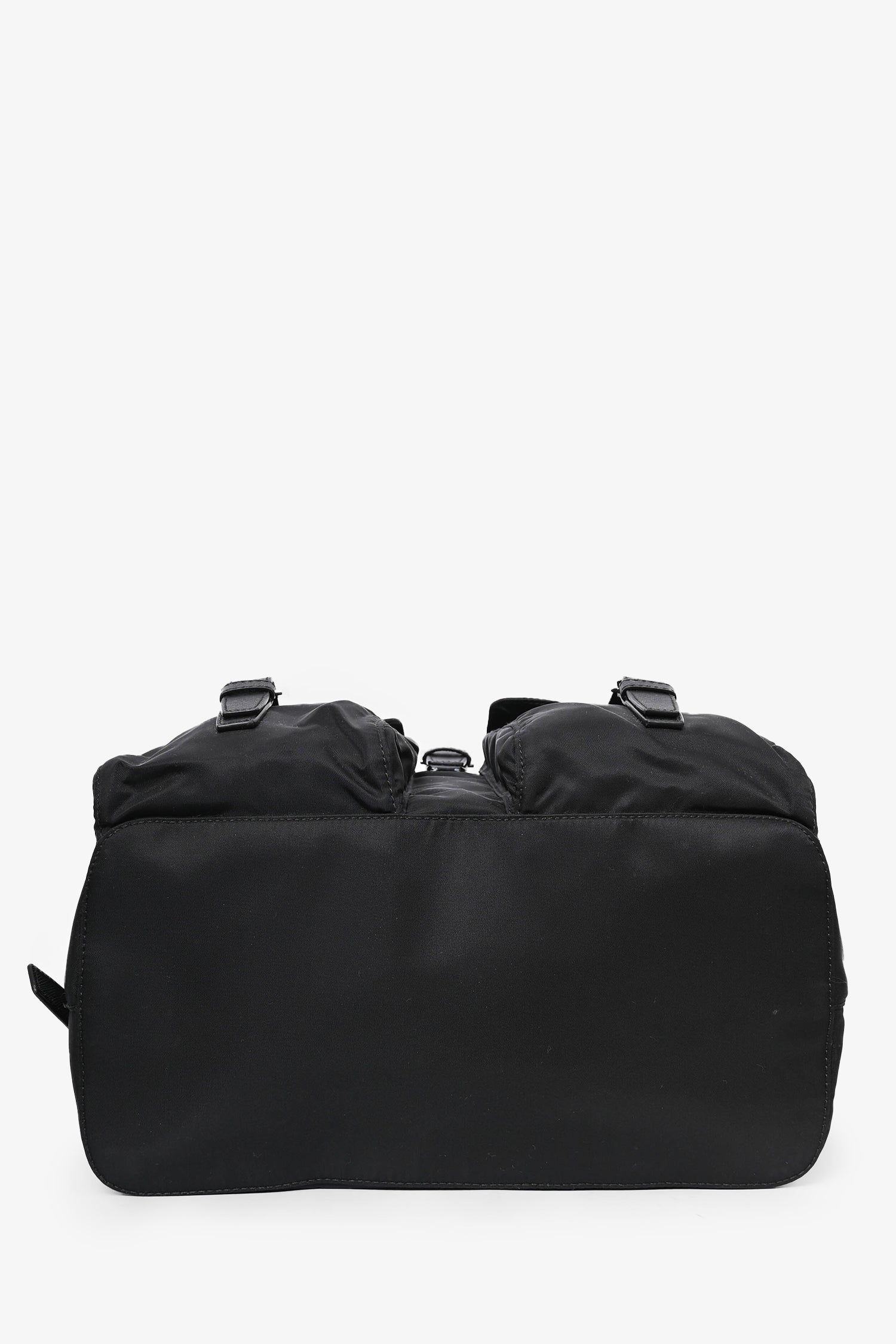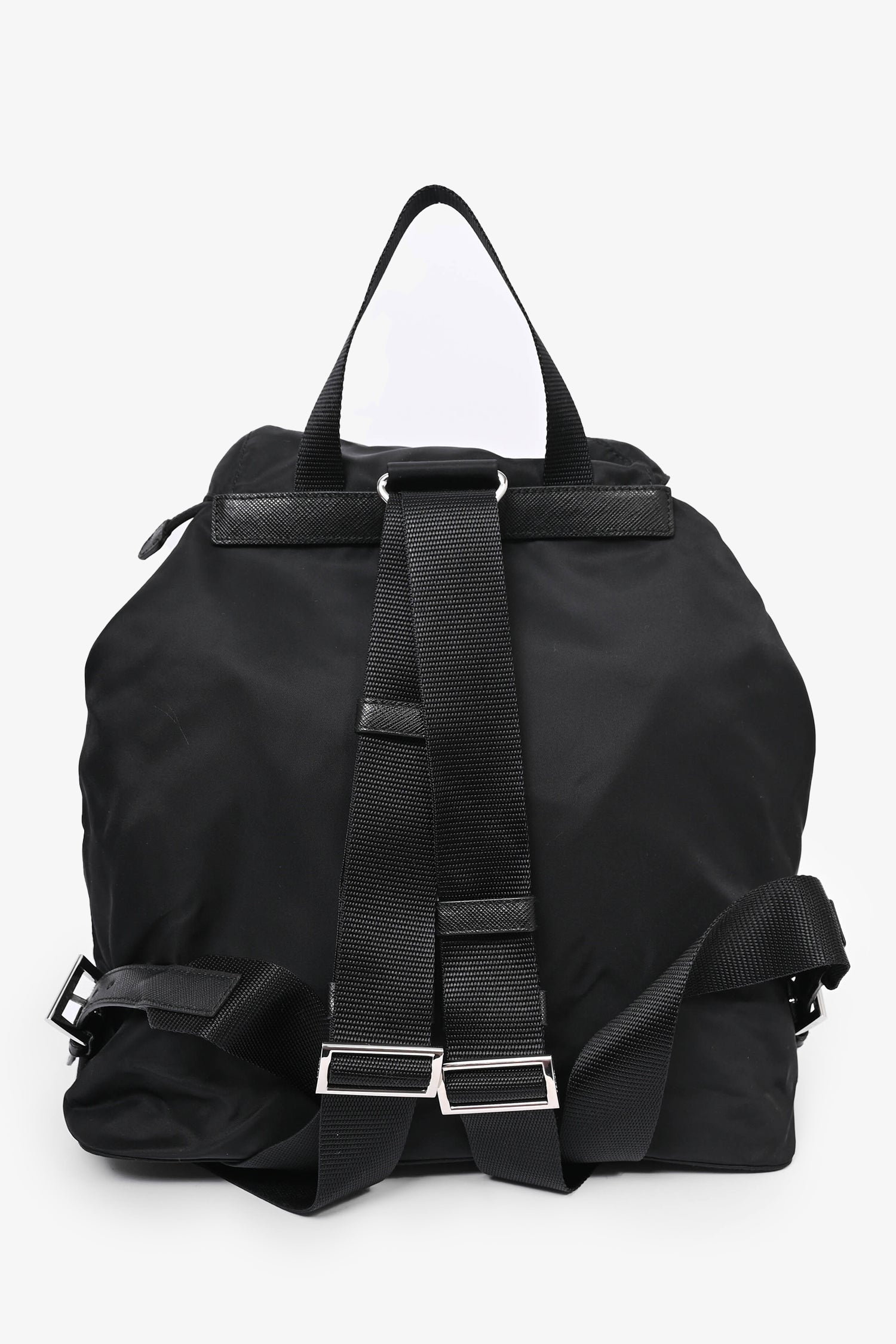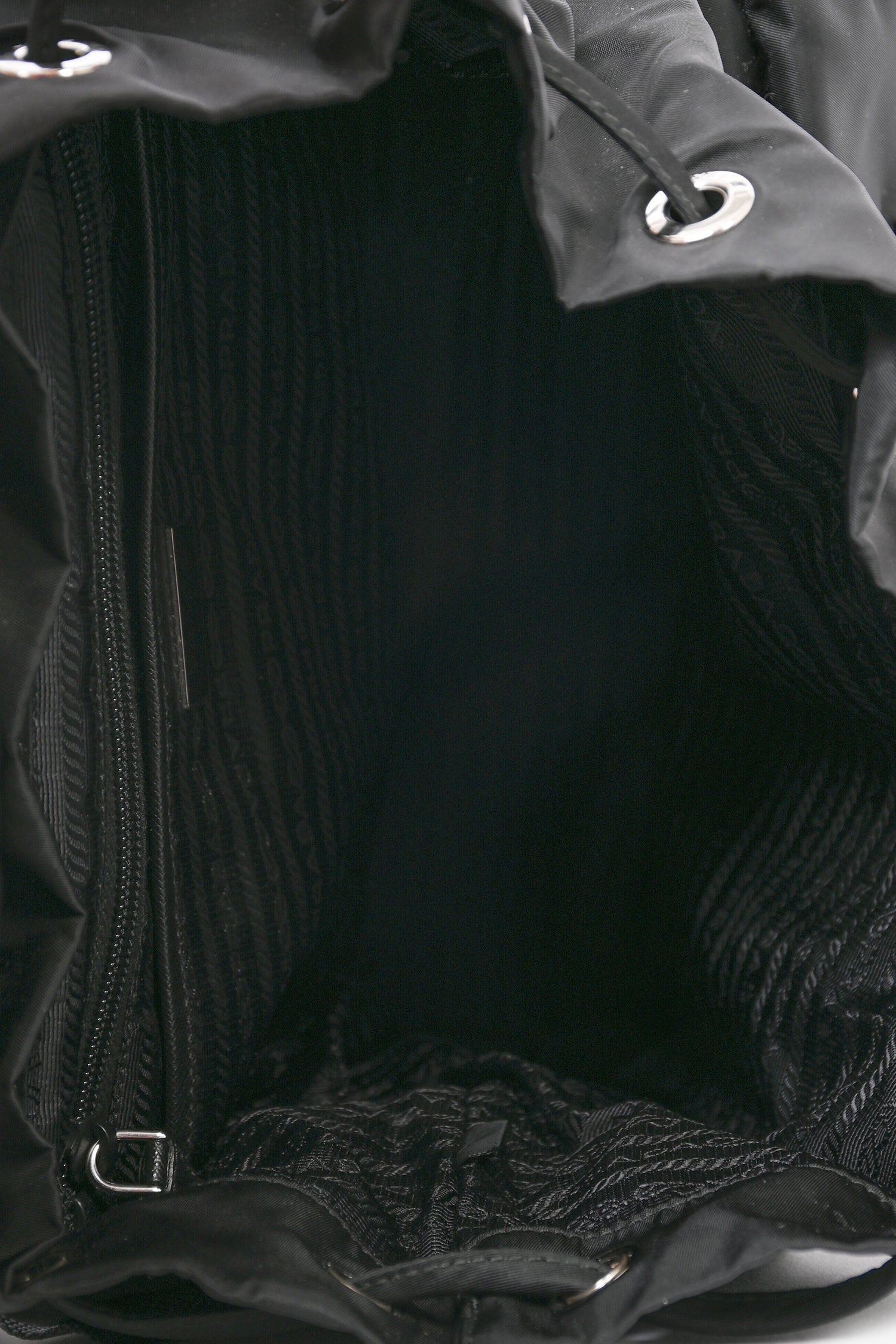 Refresh availabilityPrada Black Nylon Backpack. Leather trimming. Silver-tone hardware. Dual front pockets with straps. Adjustable pull tab. Back shoulder straps. Lined interior with zipped compartment.