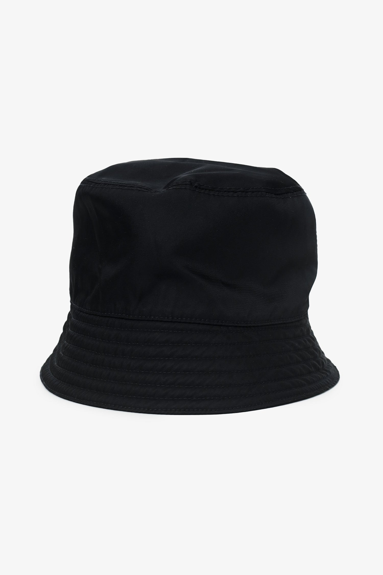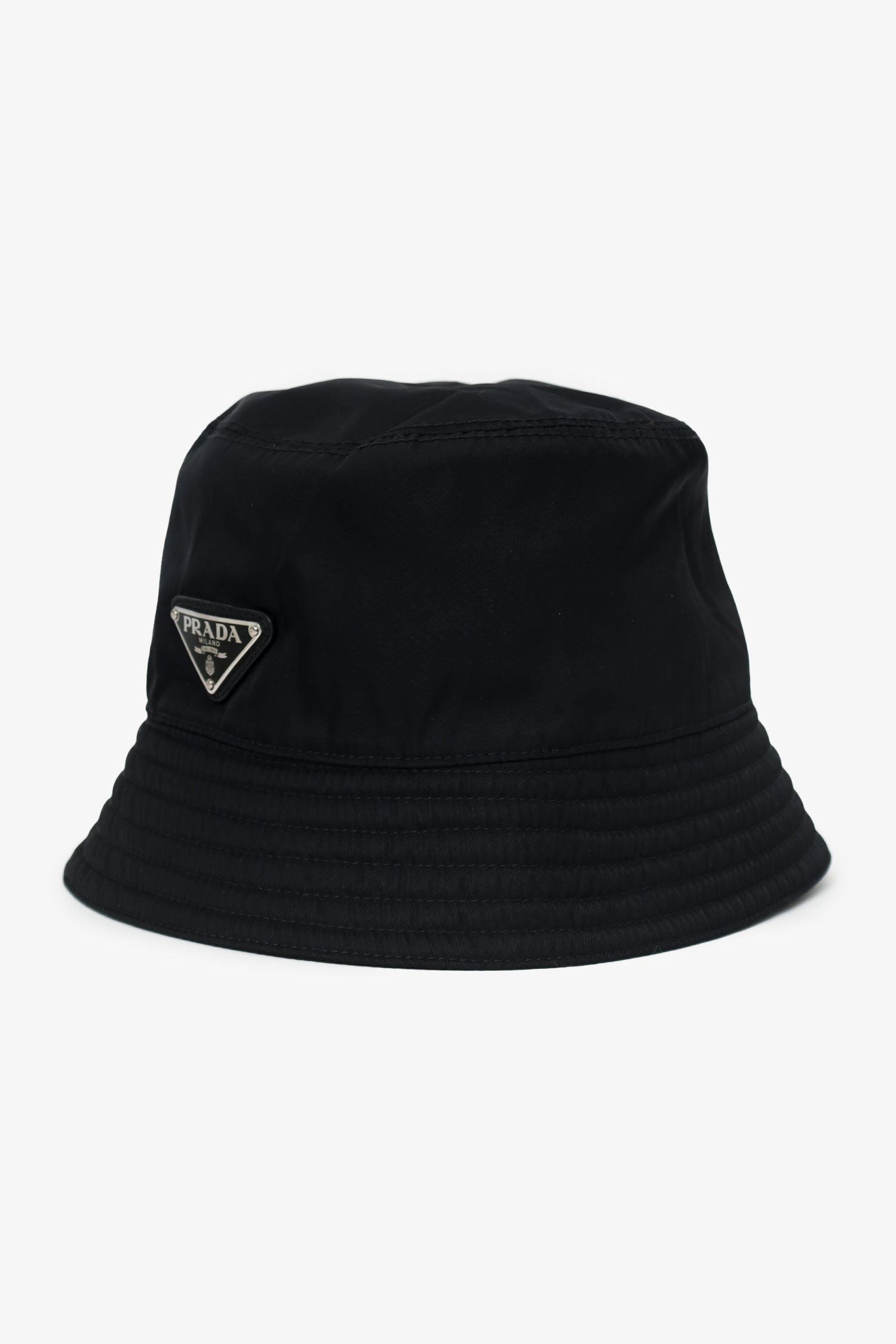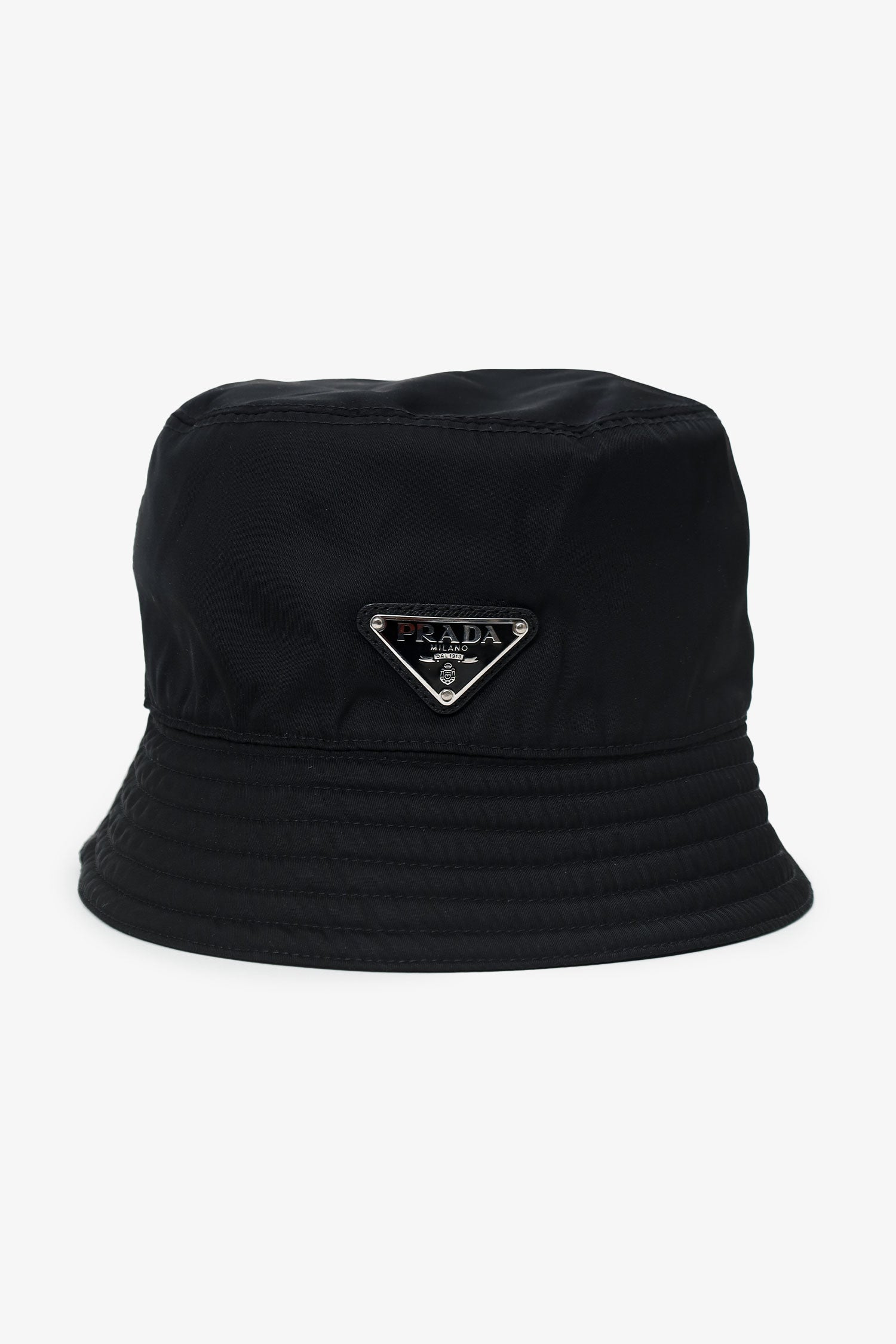 Refresh availabilityPrada Black Nylon Bucket Hat. Logo embellishment to front. Silver-tone hardware. Tonal stitching.