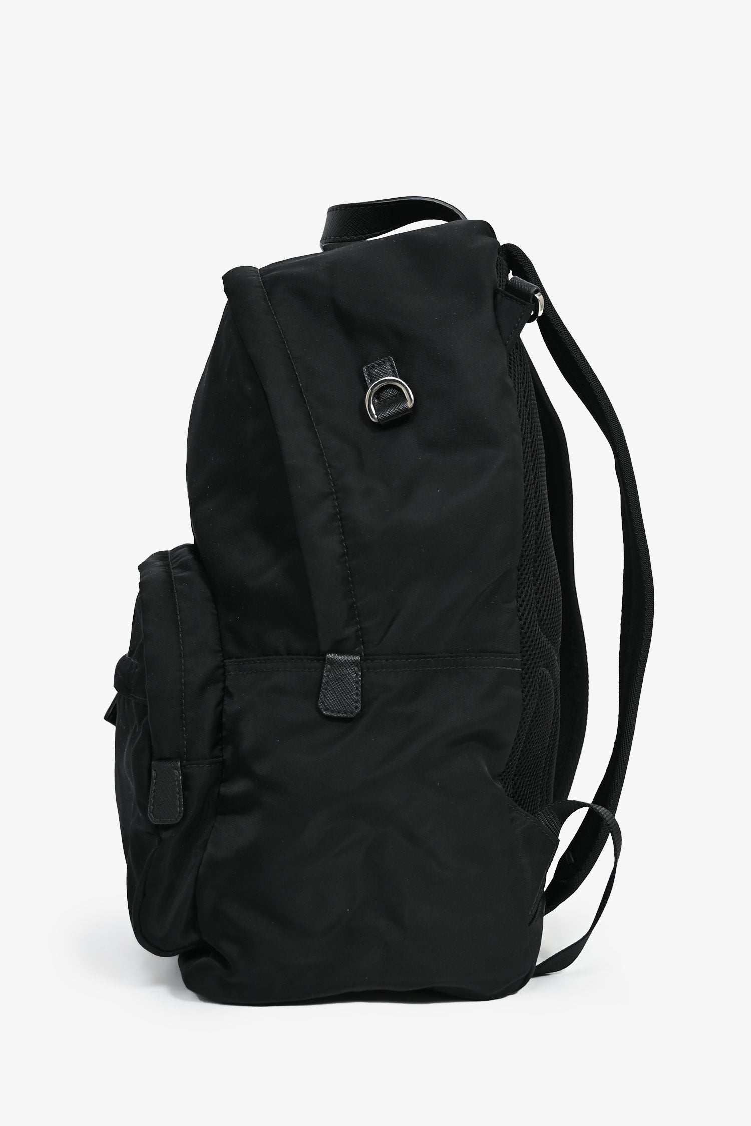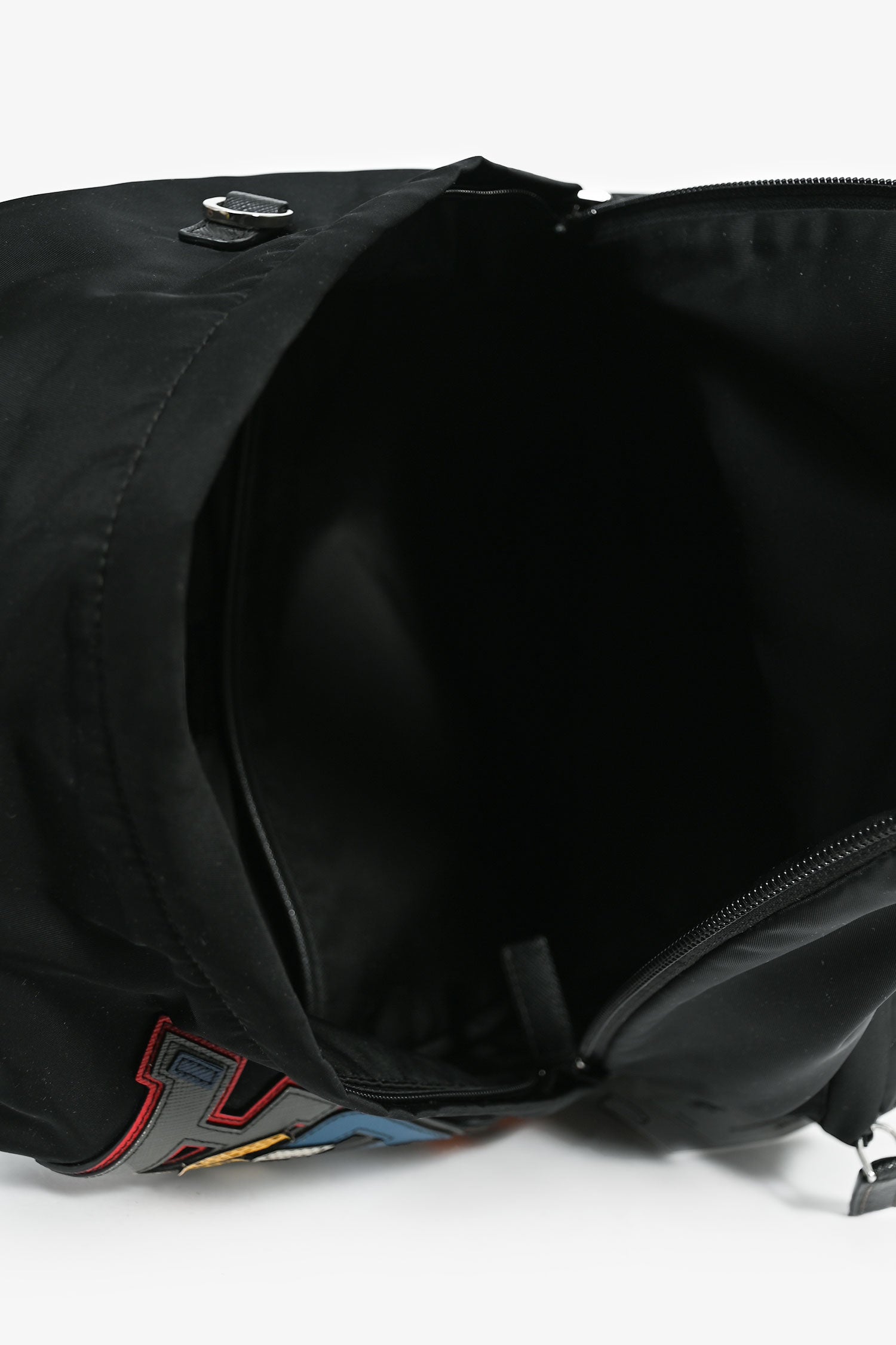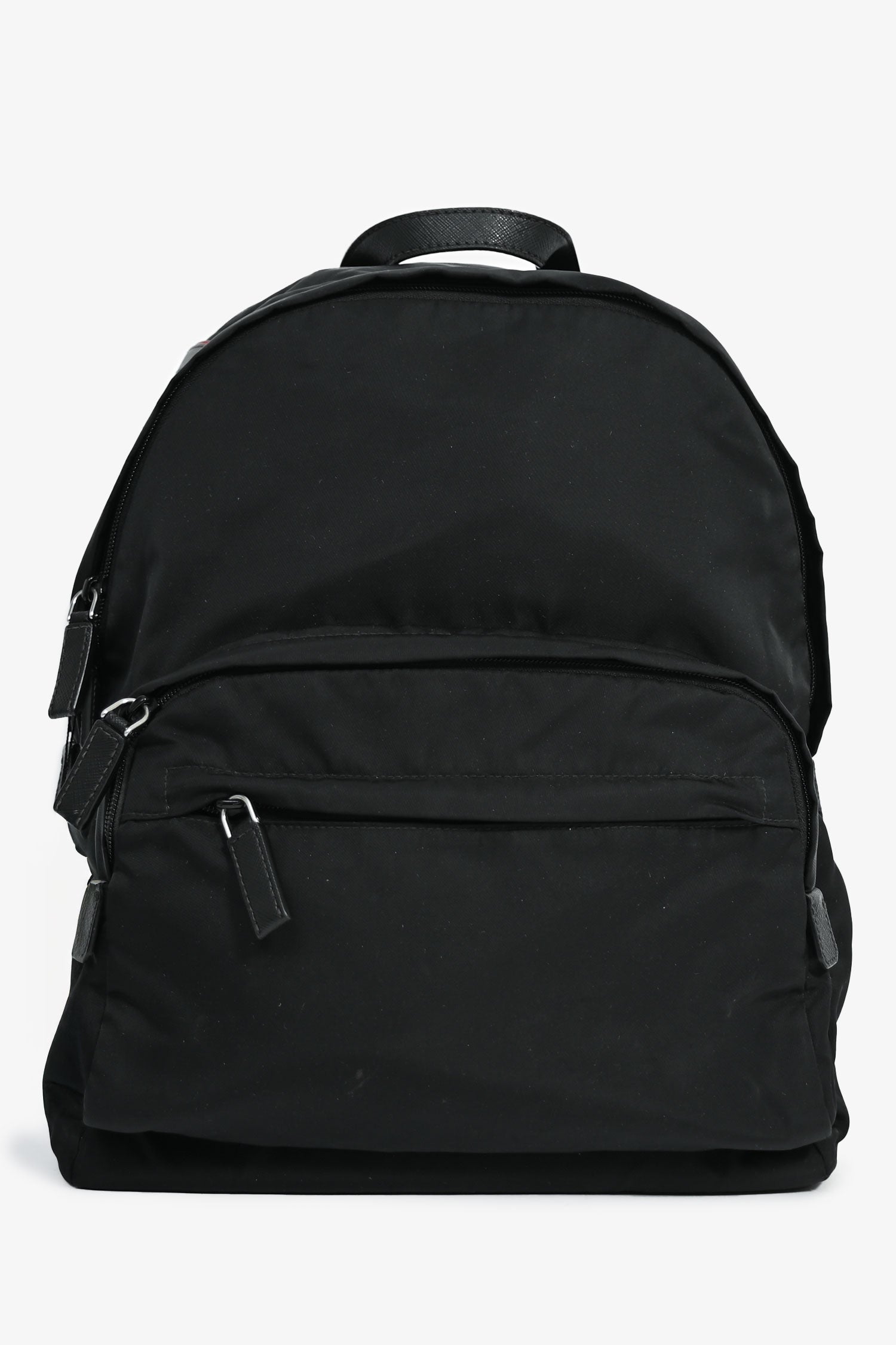 Refresh availabilityPrada Black Nylon Colour Block Logo Backpack. Front pocket with zip closure and one exterior zip pocket. Adjustable shoulder straps. Lined interior. One interior wall pocket with zip closure. One wall slip pocket. Silver-tone hardware. Tonal stitching.