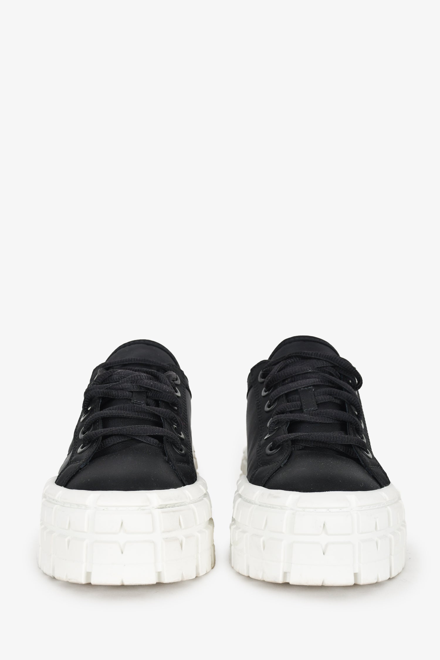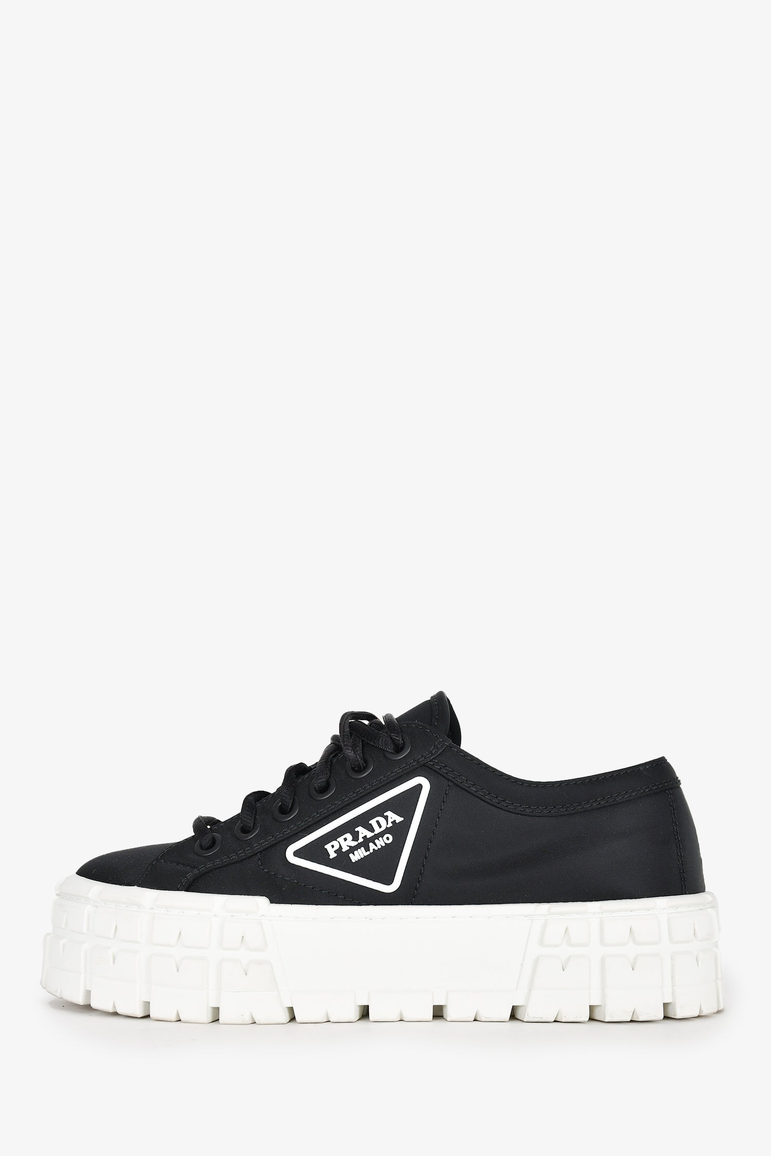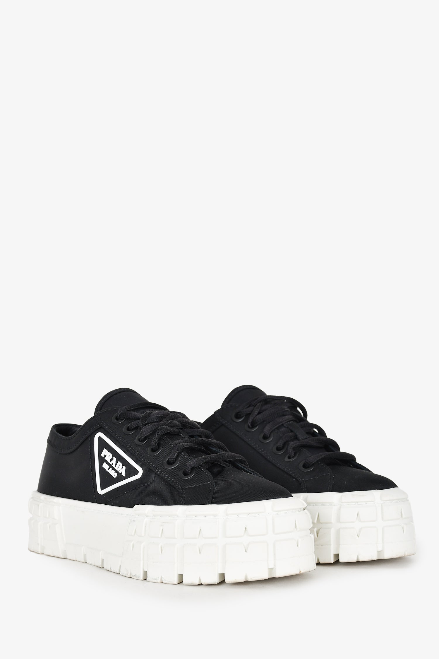 Refresh availabilityPrada Black Nylon 'Double Wheel' Platform Sneakers. Round toe. Lace-up closure.