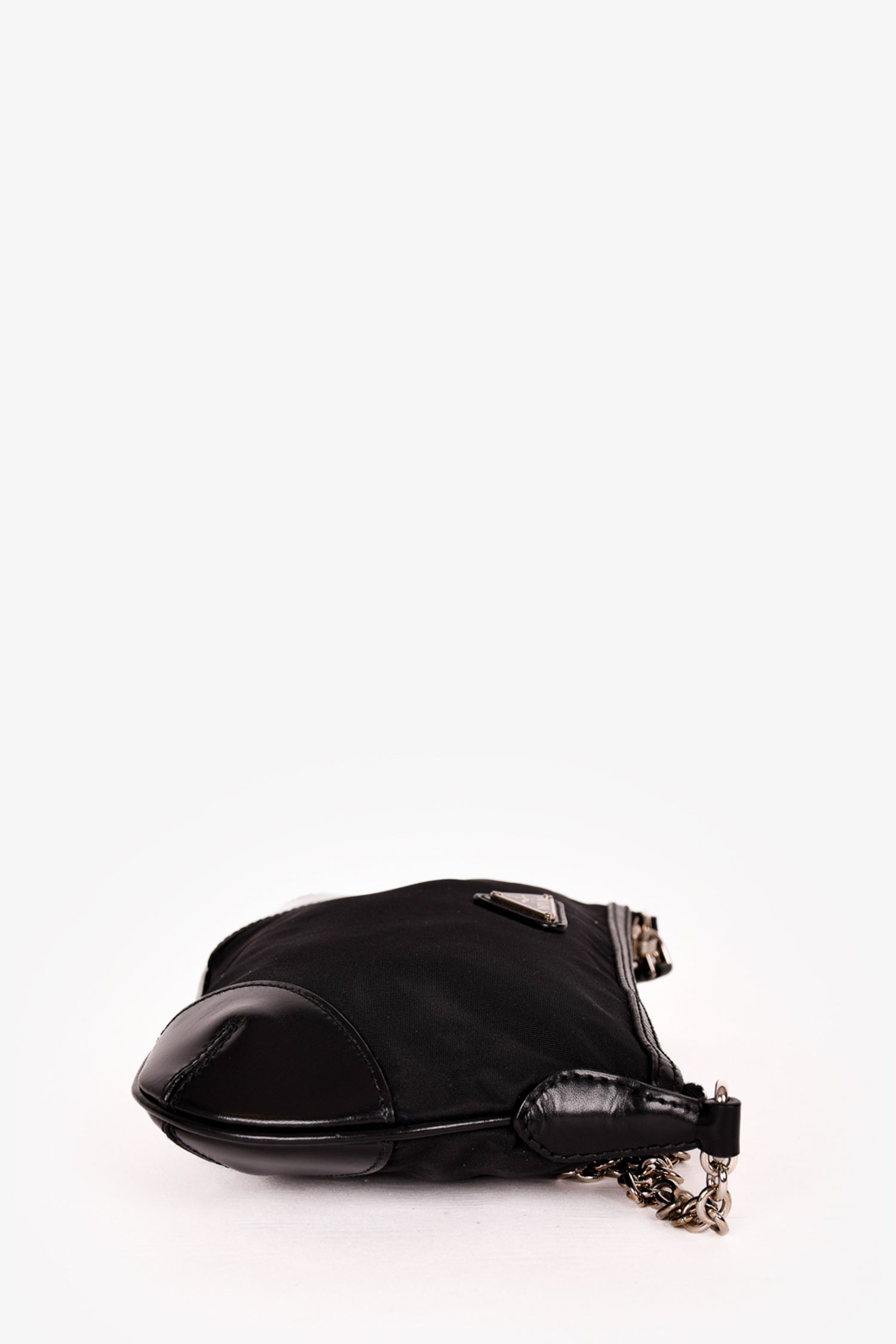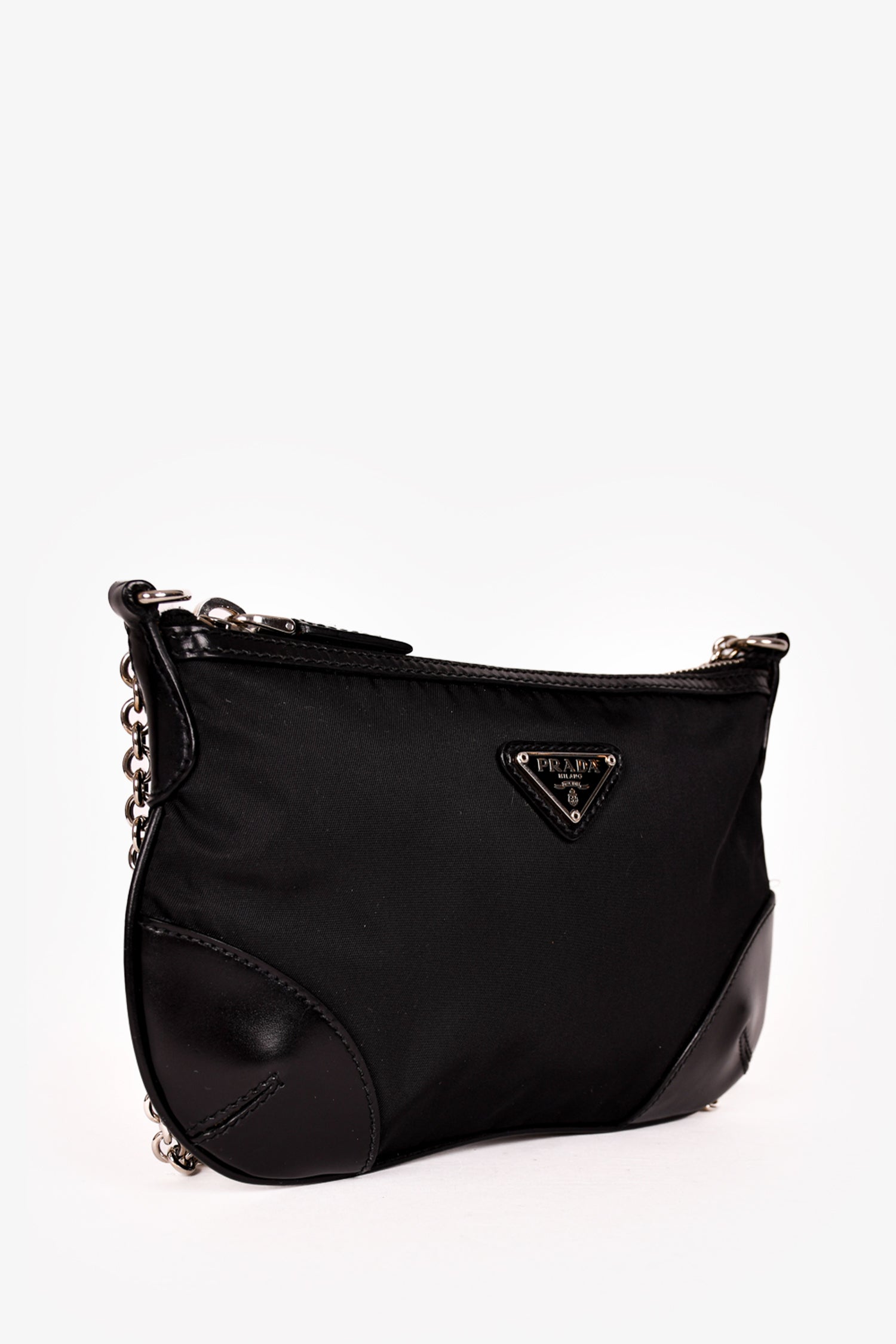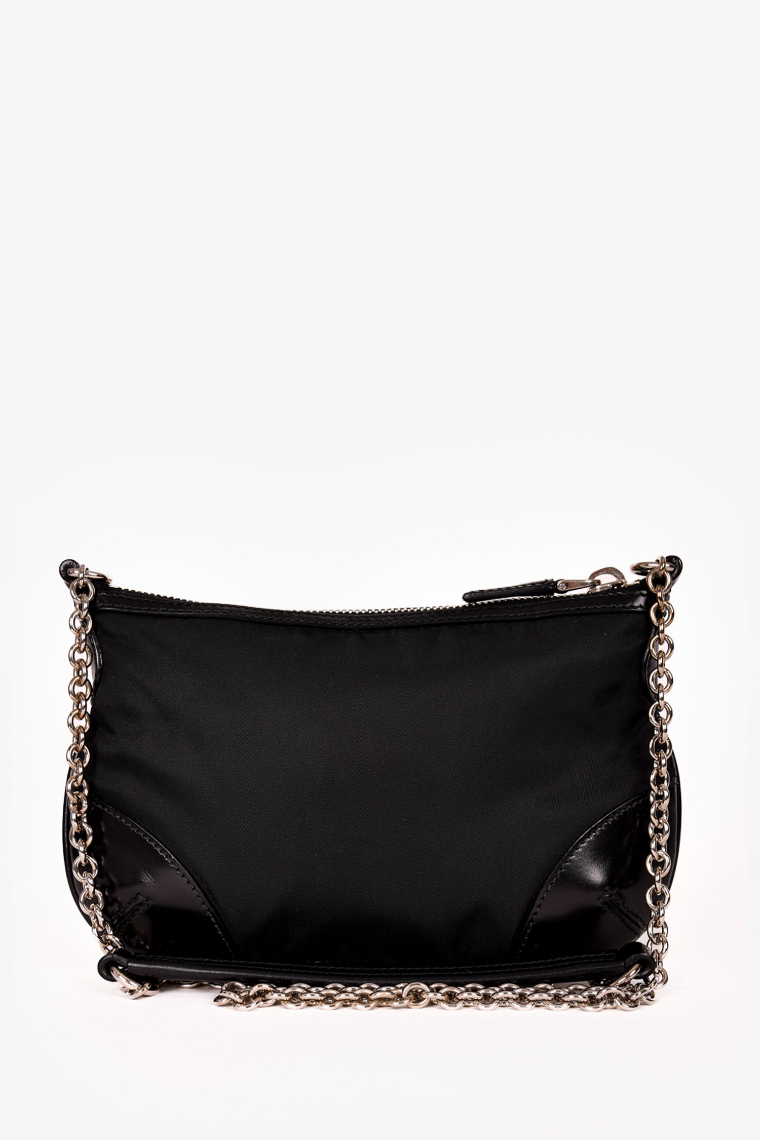 Prada Black Nylon/Leather Trim Silver Chain Crossbody Bag. Top zip closure. Tonal logo'd textile interior lining. Single interior wall zip pocket. Silver-tone hardware. Tonal stitching.
