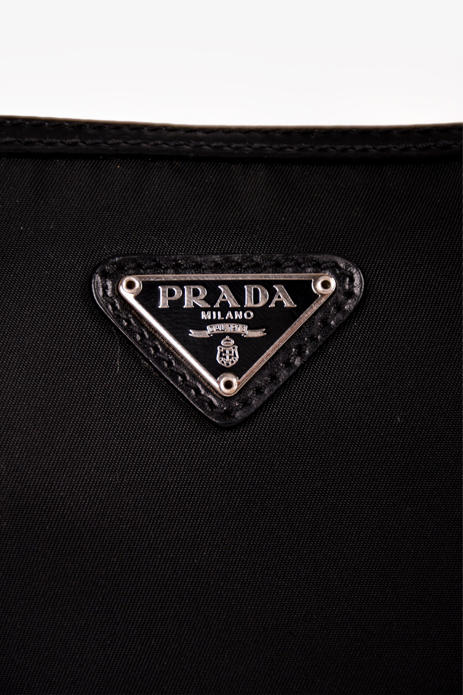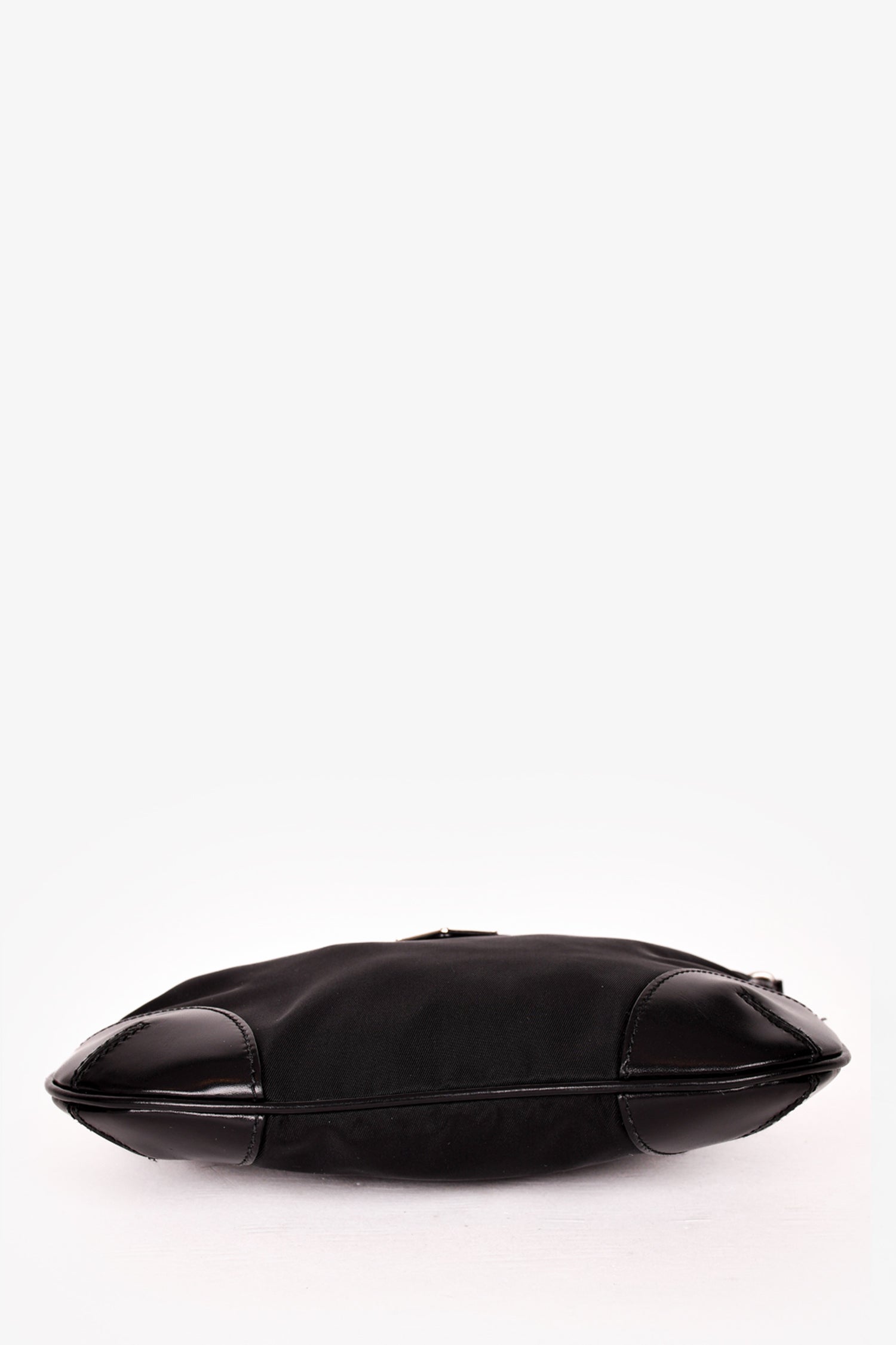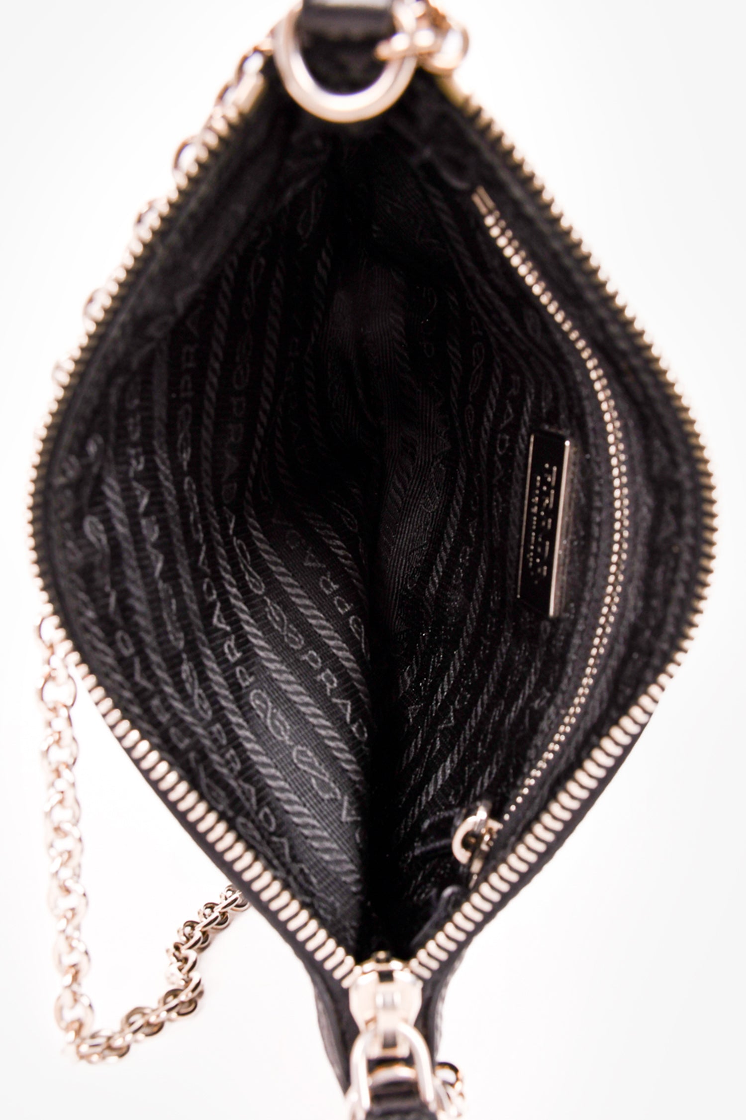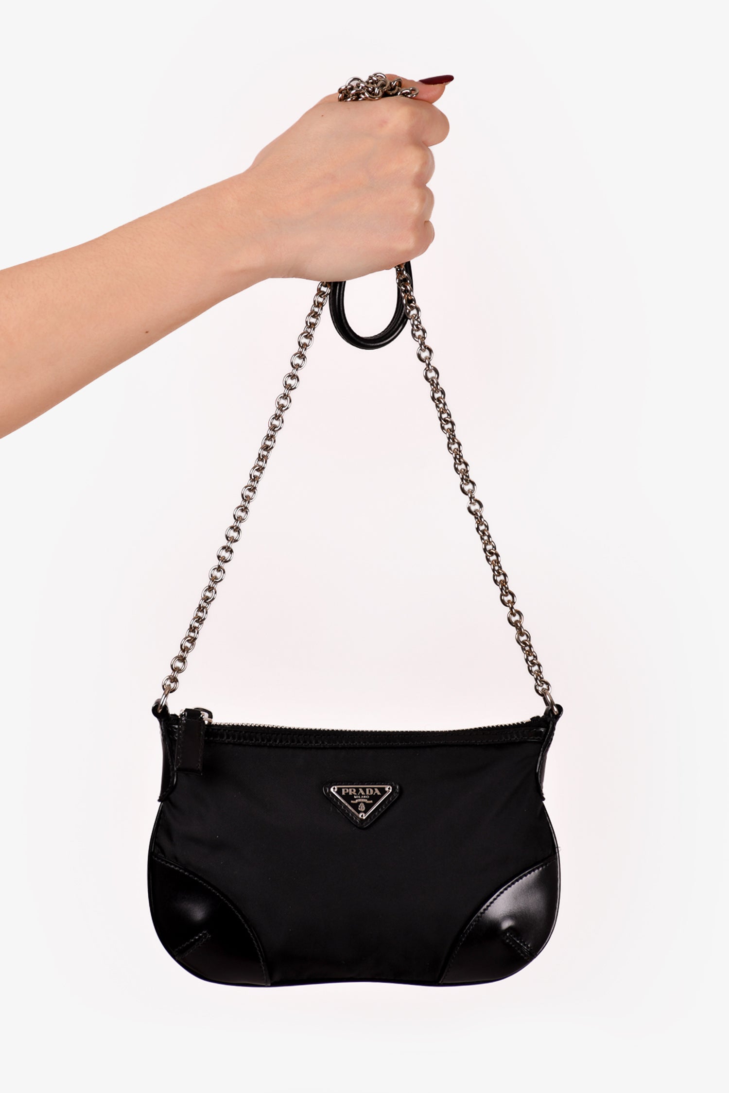 Prada Black Nylon/Leather Trim Silver Chain Crossbody Bag. Top zip closure. Tonal logo'd textile interior lining. Single interior wall zip pocket. Silver-tone hardware. Tonal stitching.