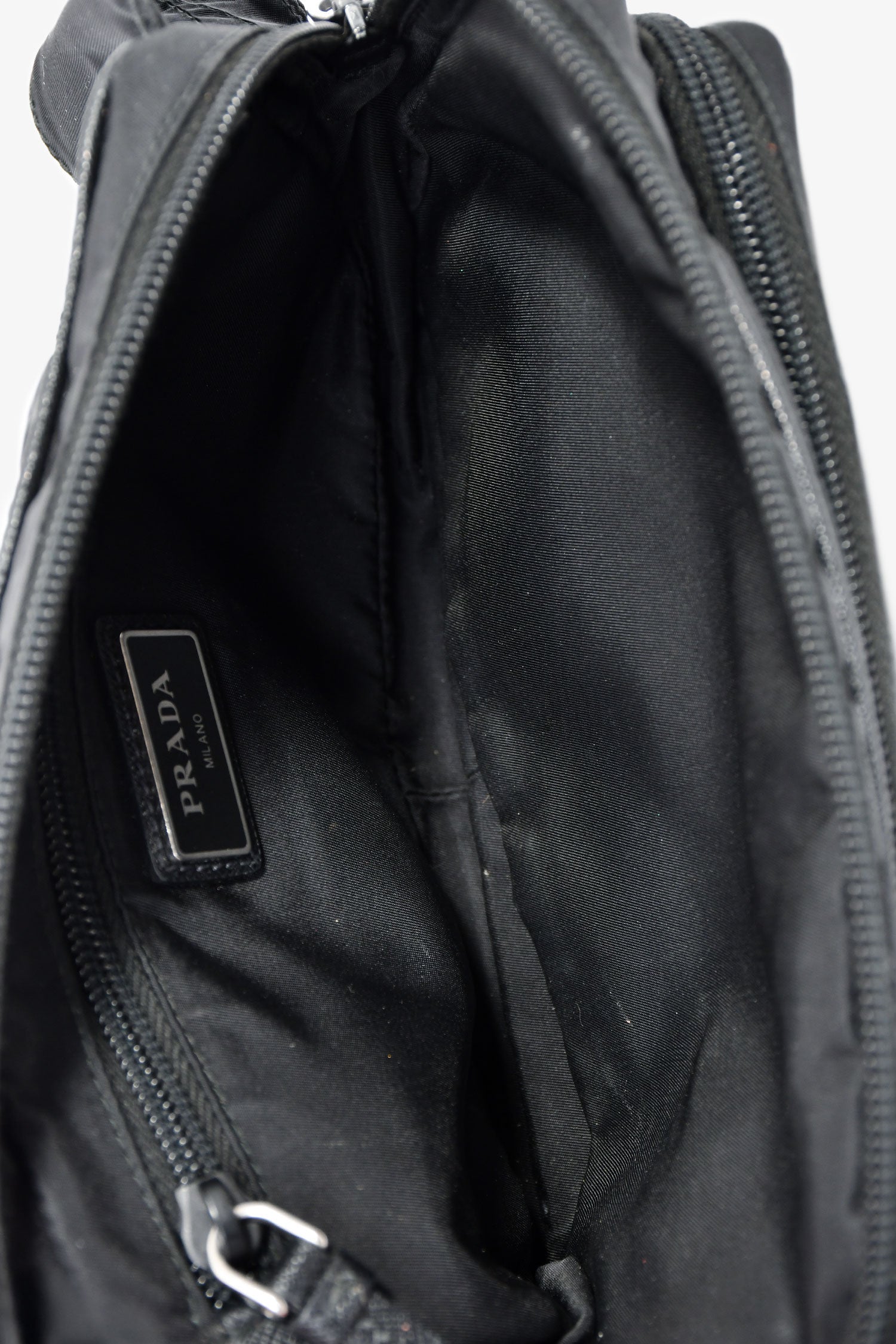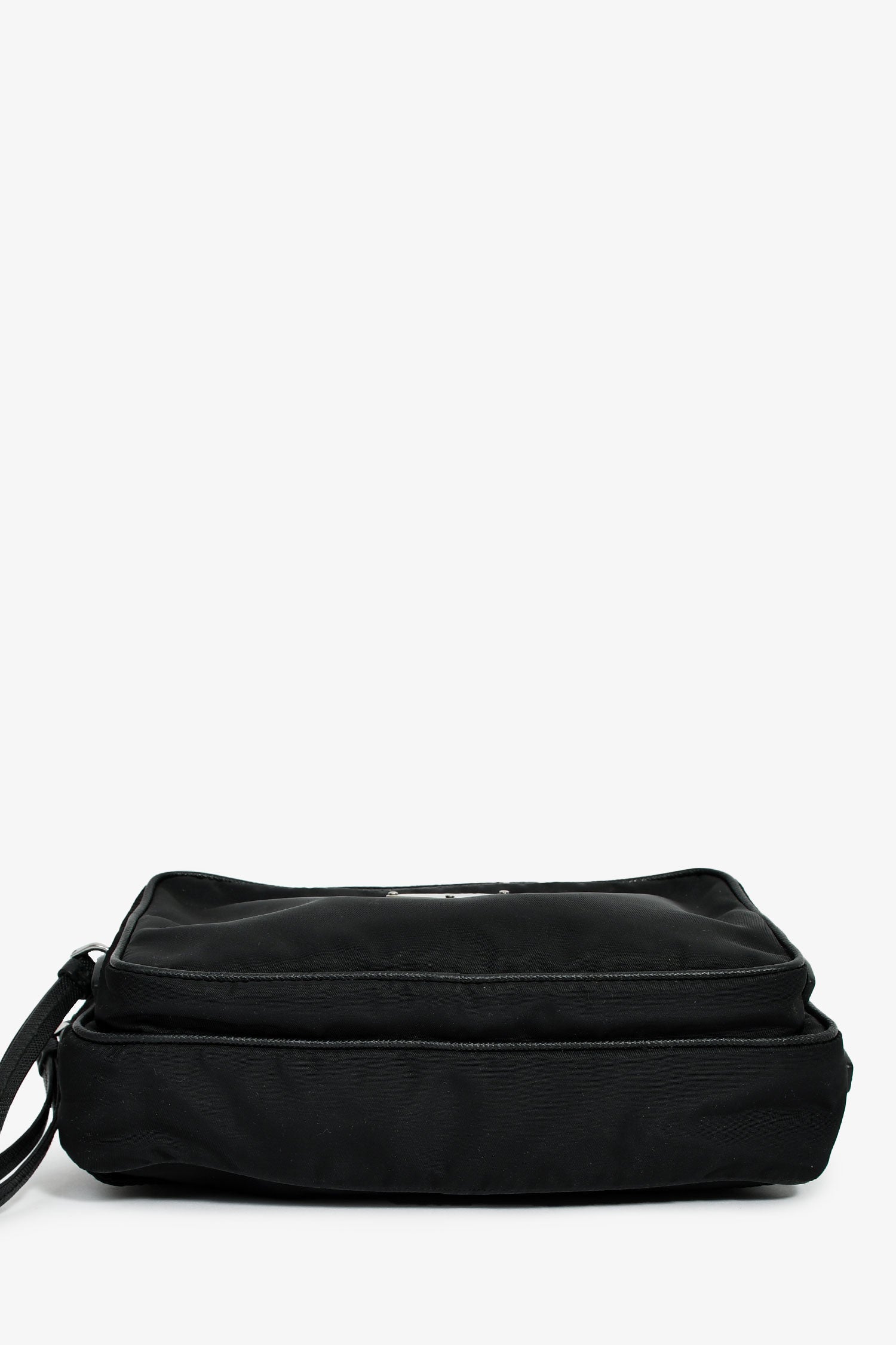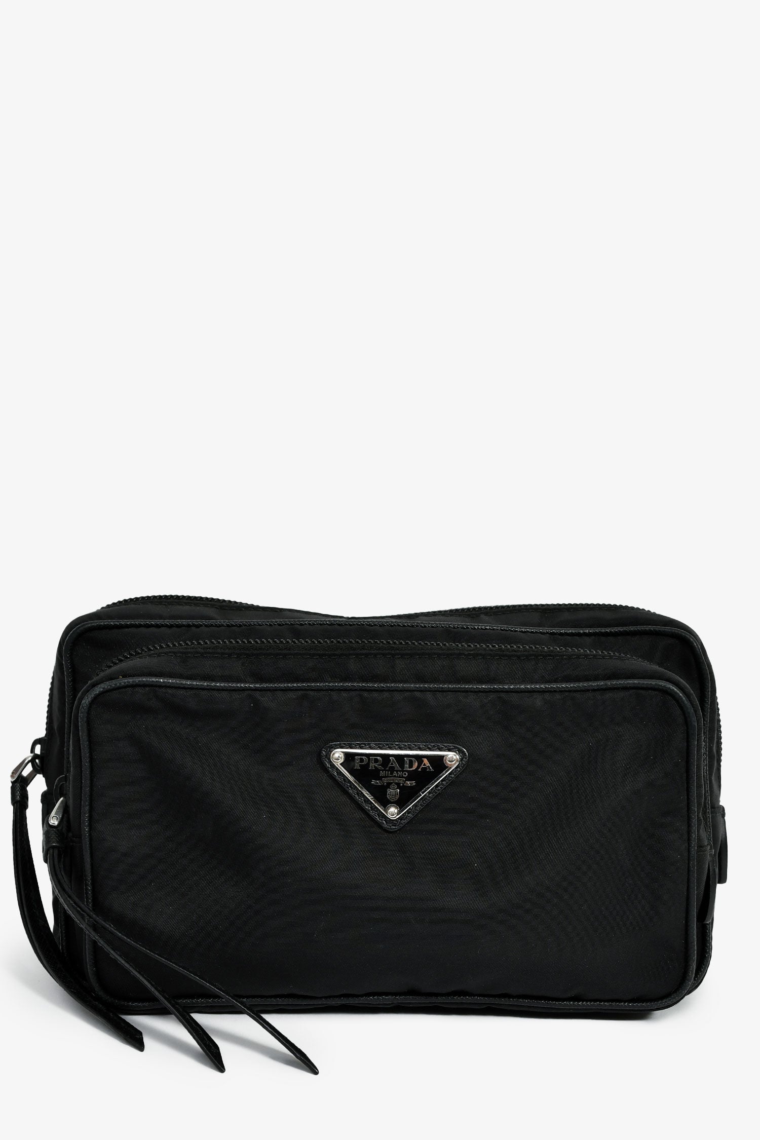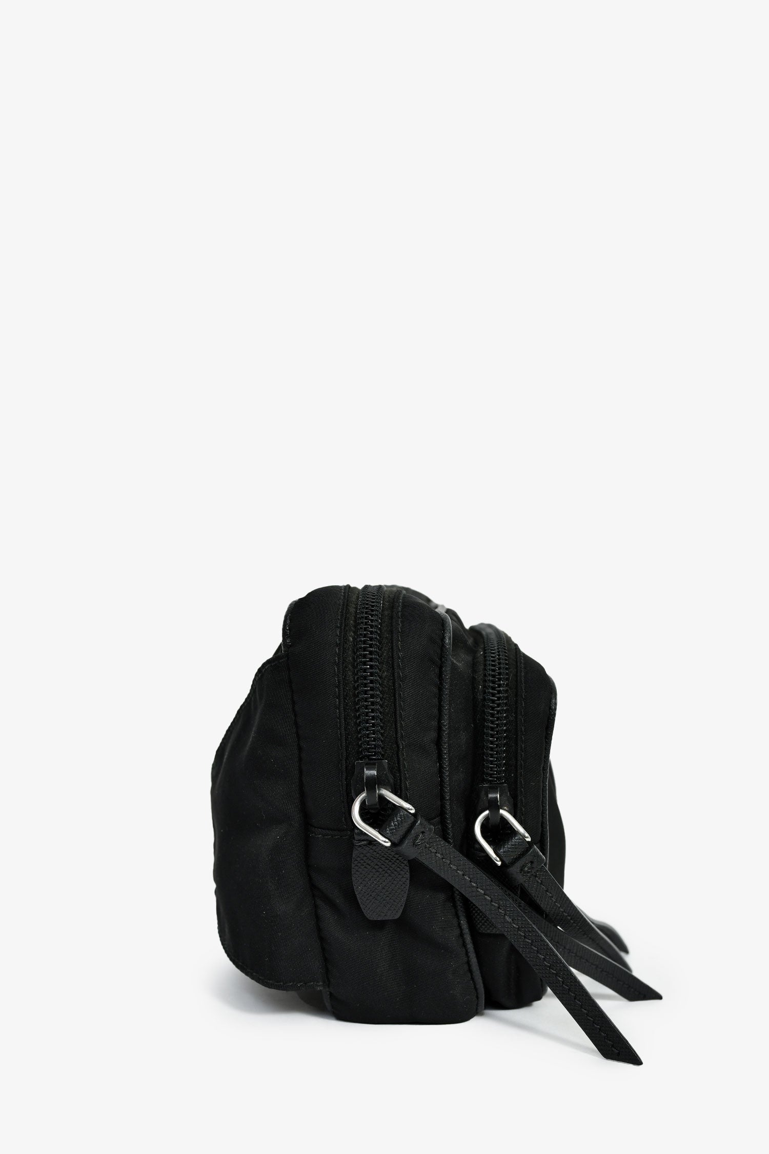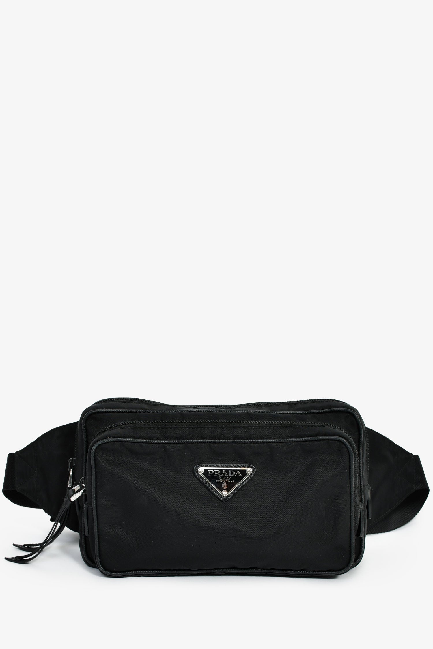Refresh availabilityPrada Black Nylon Logo Belt Bag. Top zip closure. Adjustable webbed strap with a buckle. 1 zip exterior compartment. Lined interior with a zip compartment. Silver-tone hardware. Tonal stitching.