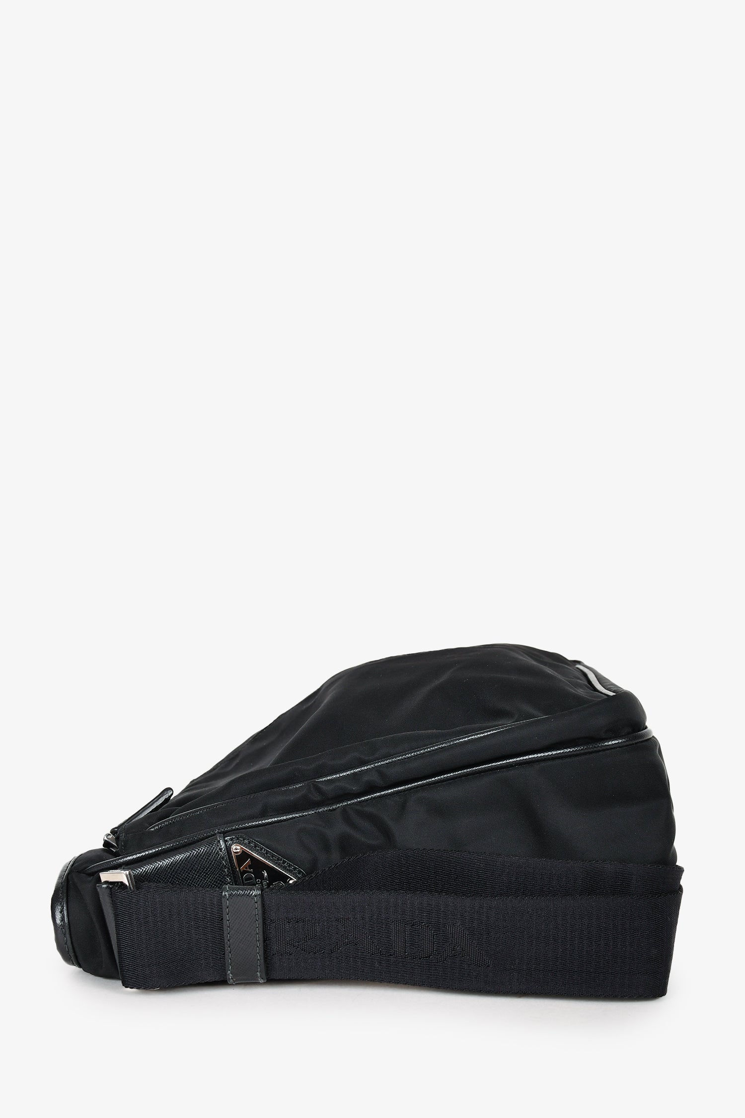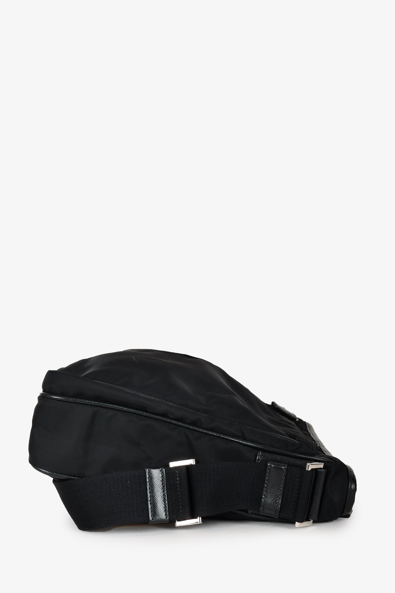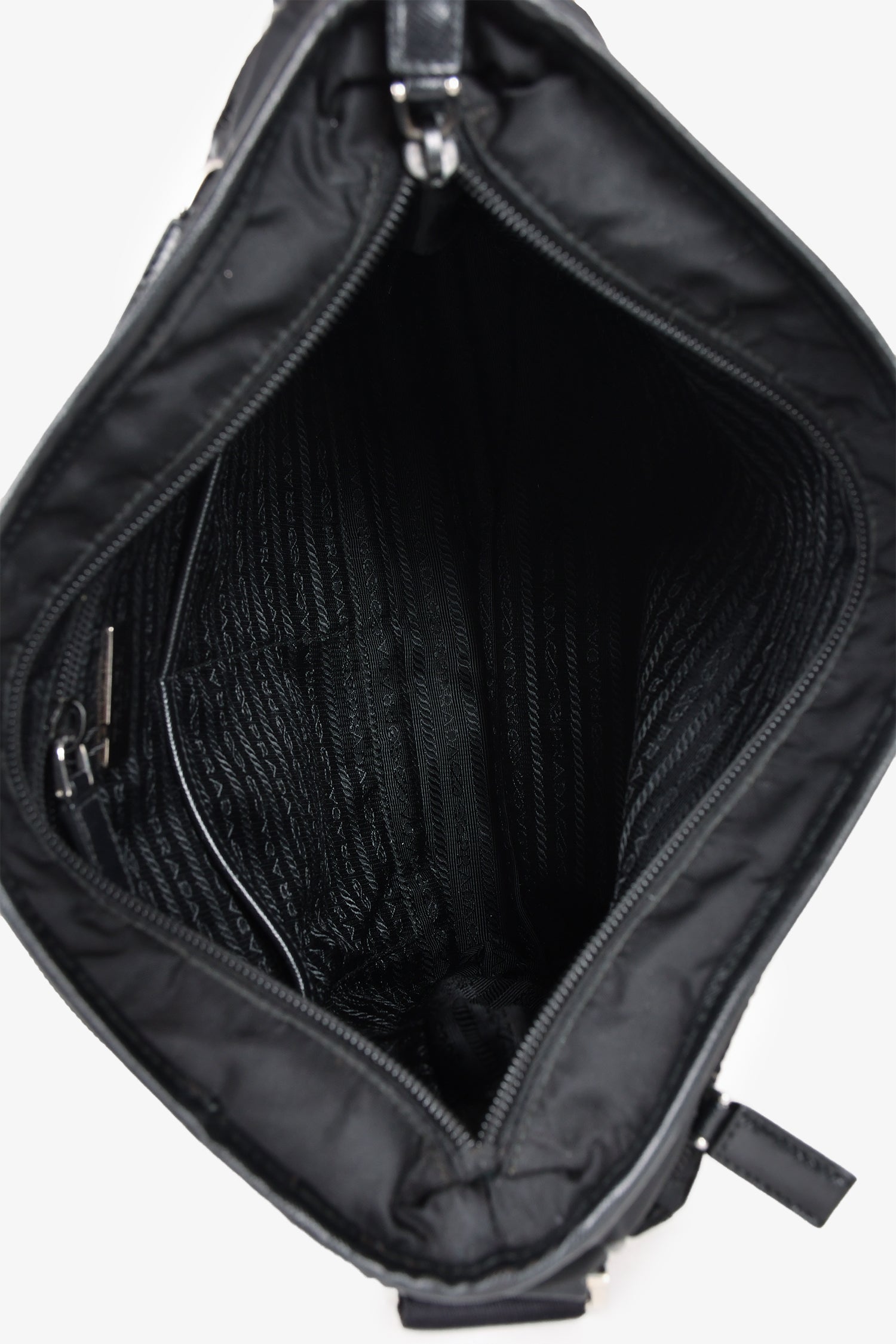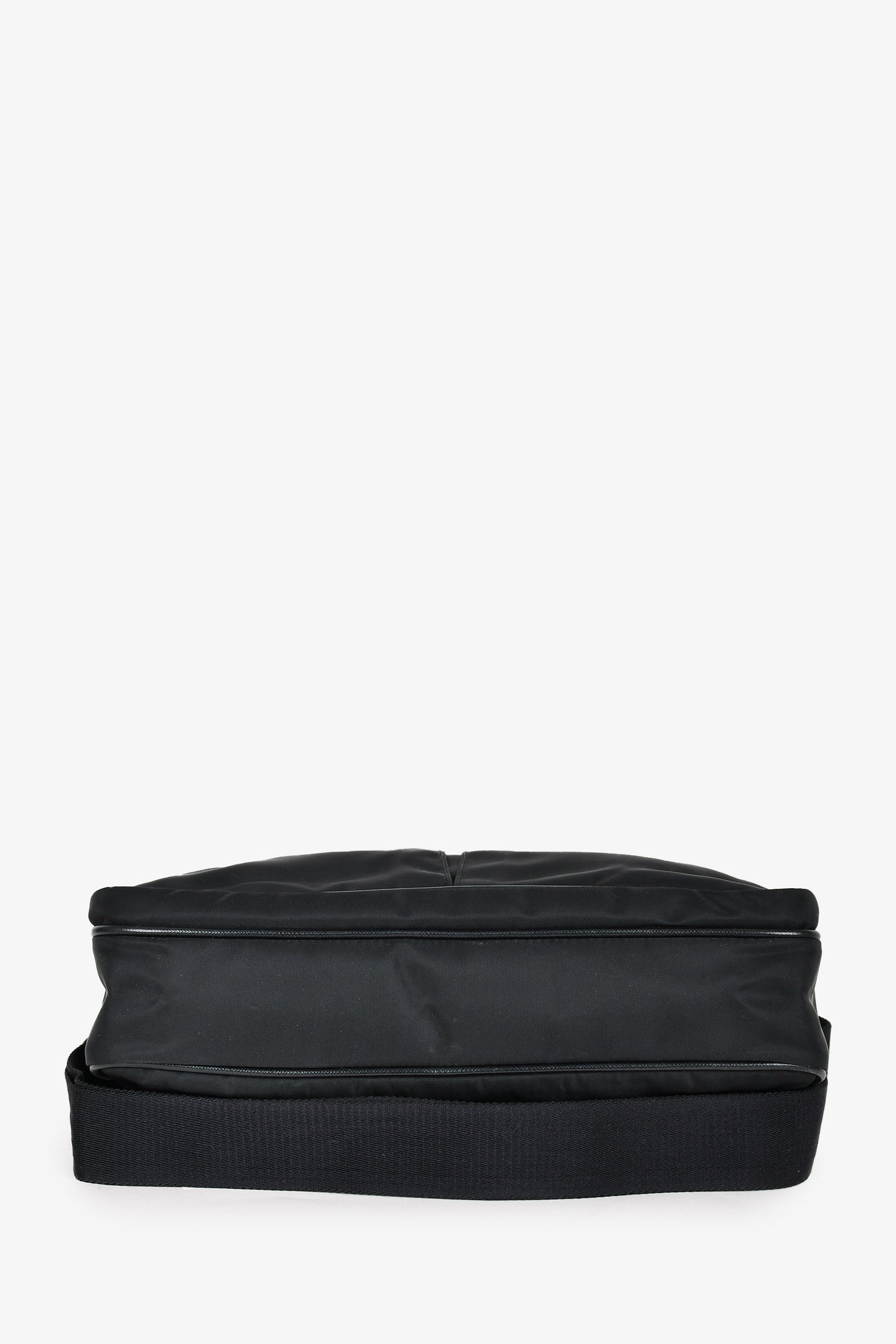 Refresh availabilityPrada Black Nylon Messenger Crossbody Bag. Top zip closure. 1 interior zip pocket. 2 interior slip pocket. 2 exterior zip pockets. Adjustable cross-body strap. Tonal stitching.