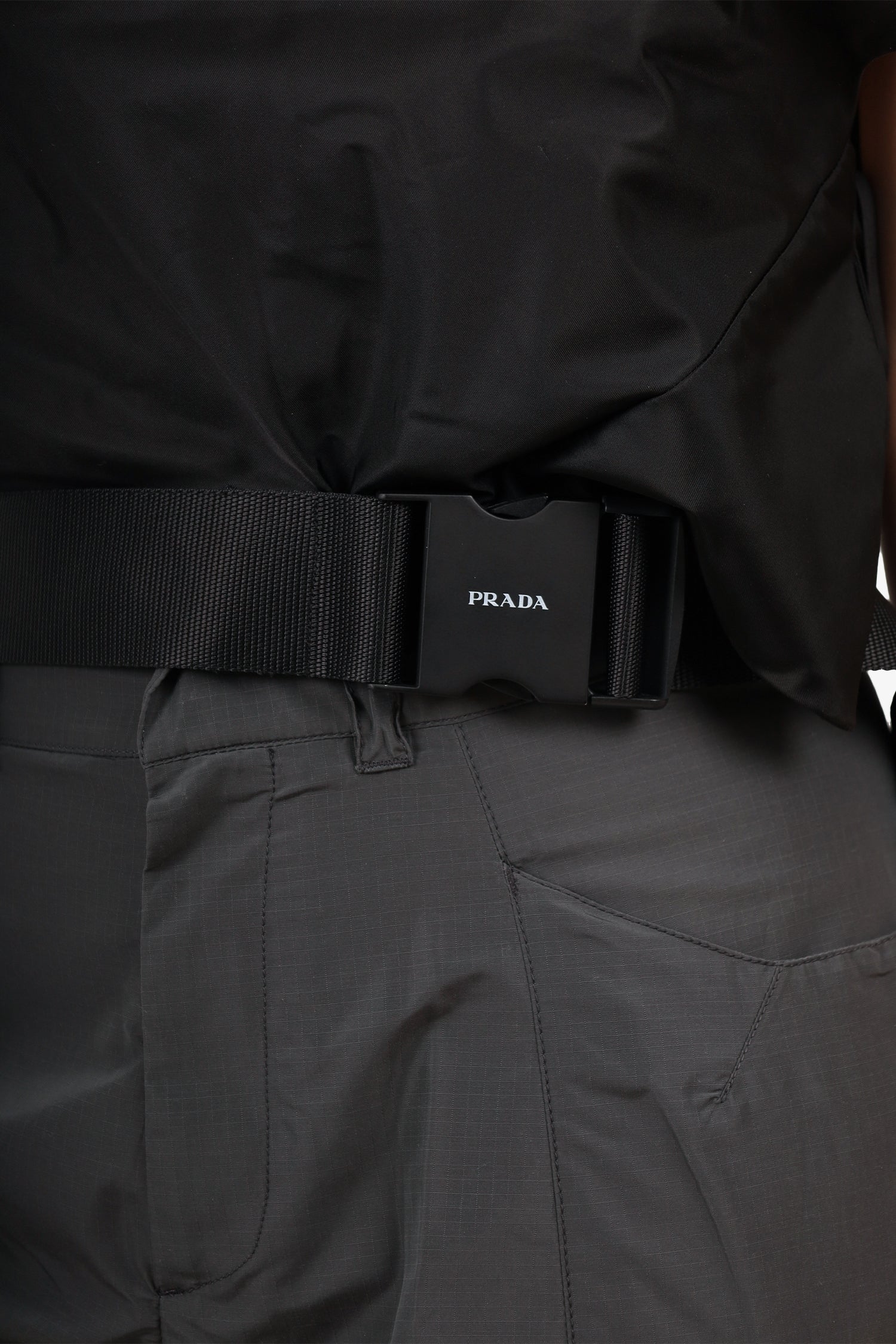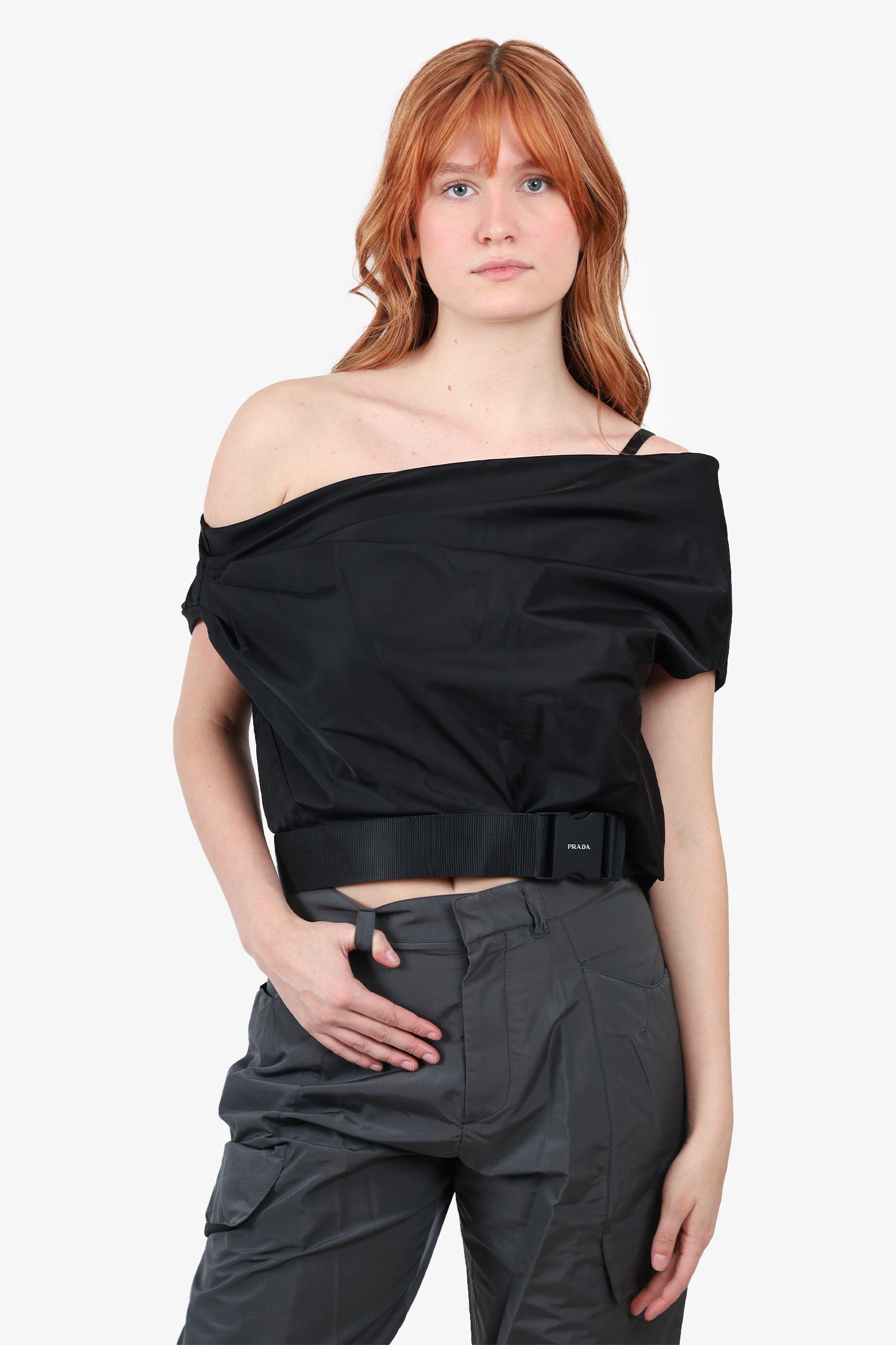 Refresh availabilityPrada Black Nylon Off Shoulder Belted Top. Asymmetrical neckline. Pull-on. Lined. Tonal stitching.