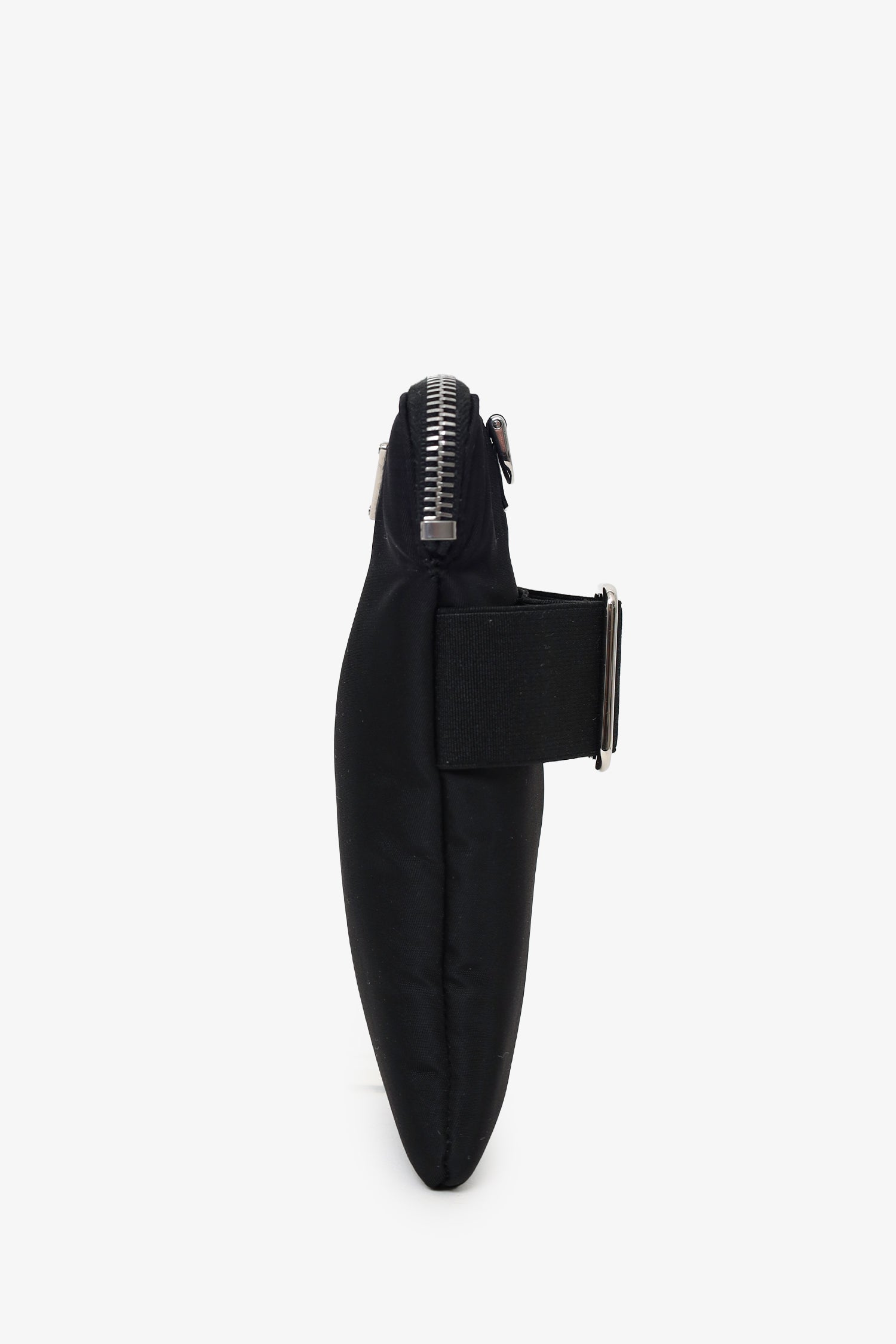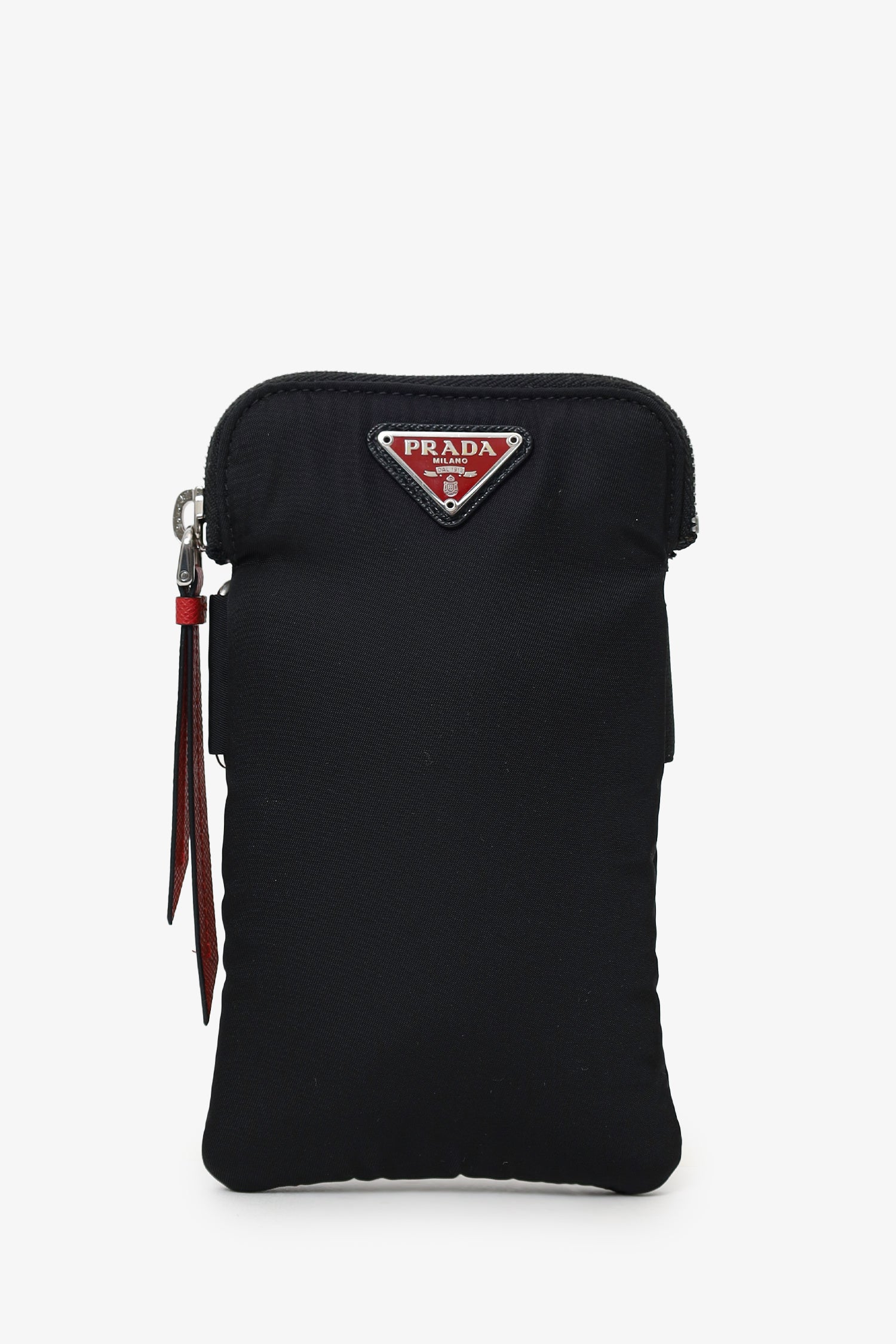 Refresh availabilityPrada Black Nylon Phone Pouch With Strap. Top zip-up closure. Adjustable pull-through buckle closure to rear. Lined interior. Silver-tone hardware. Tonal stitching.