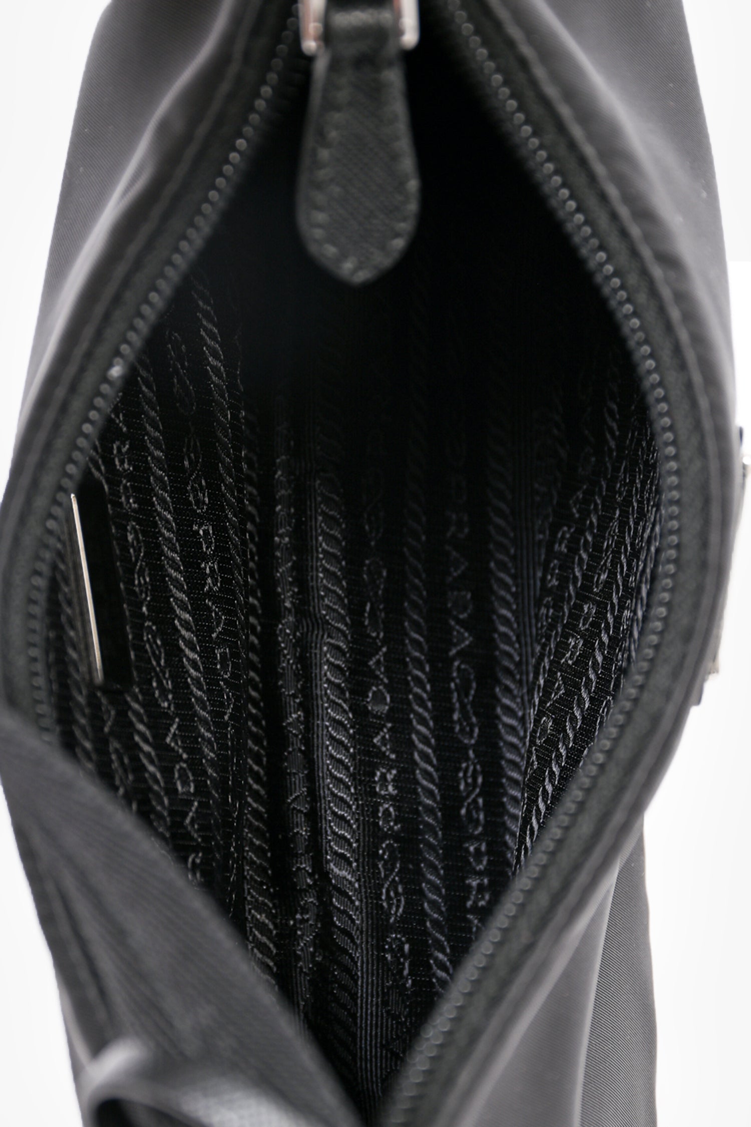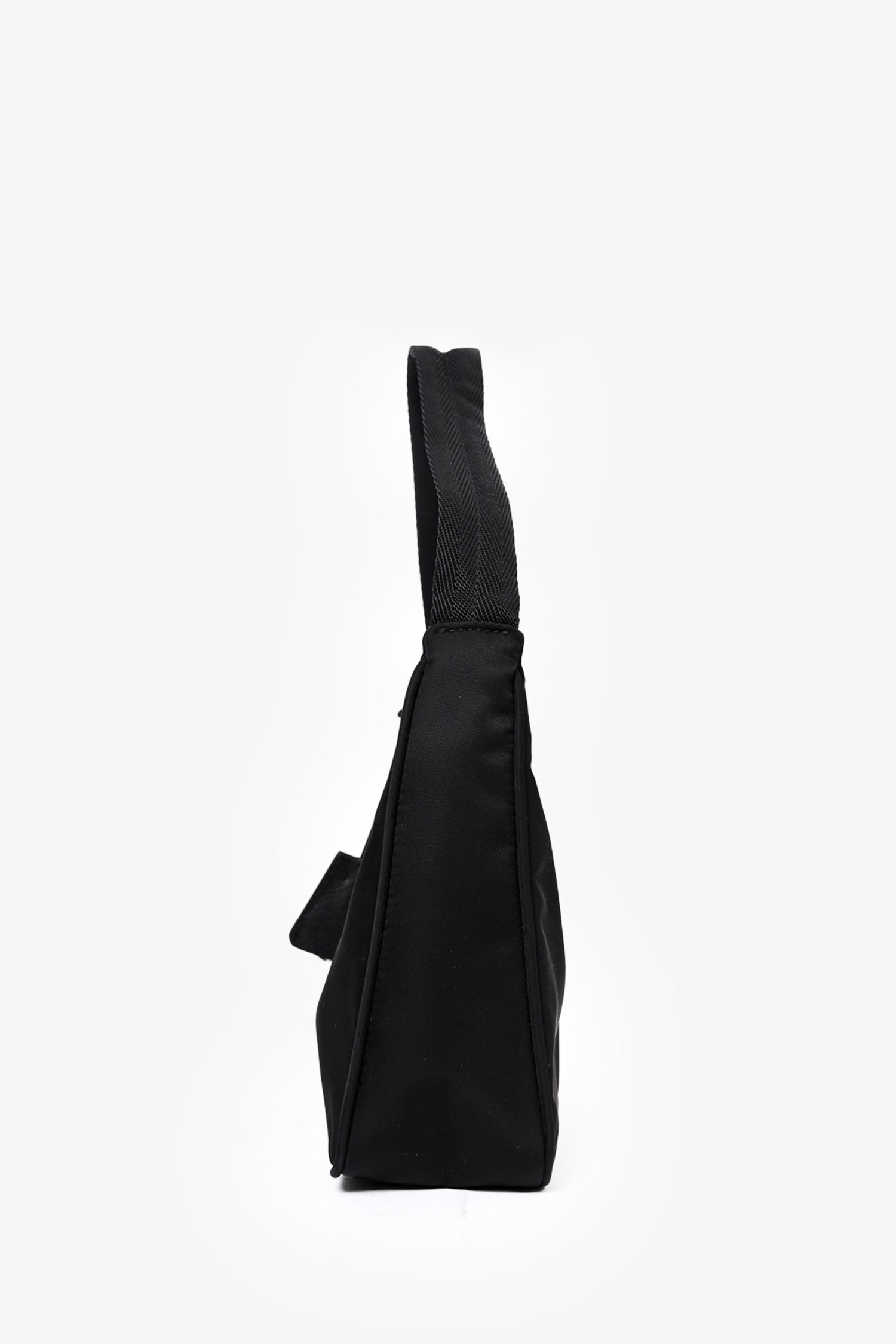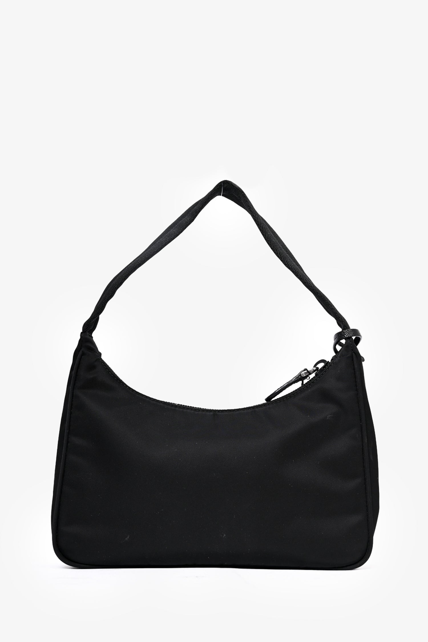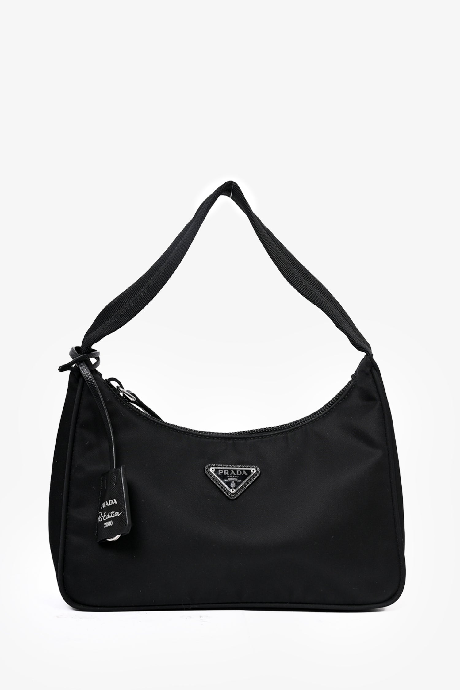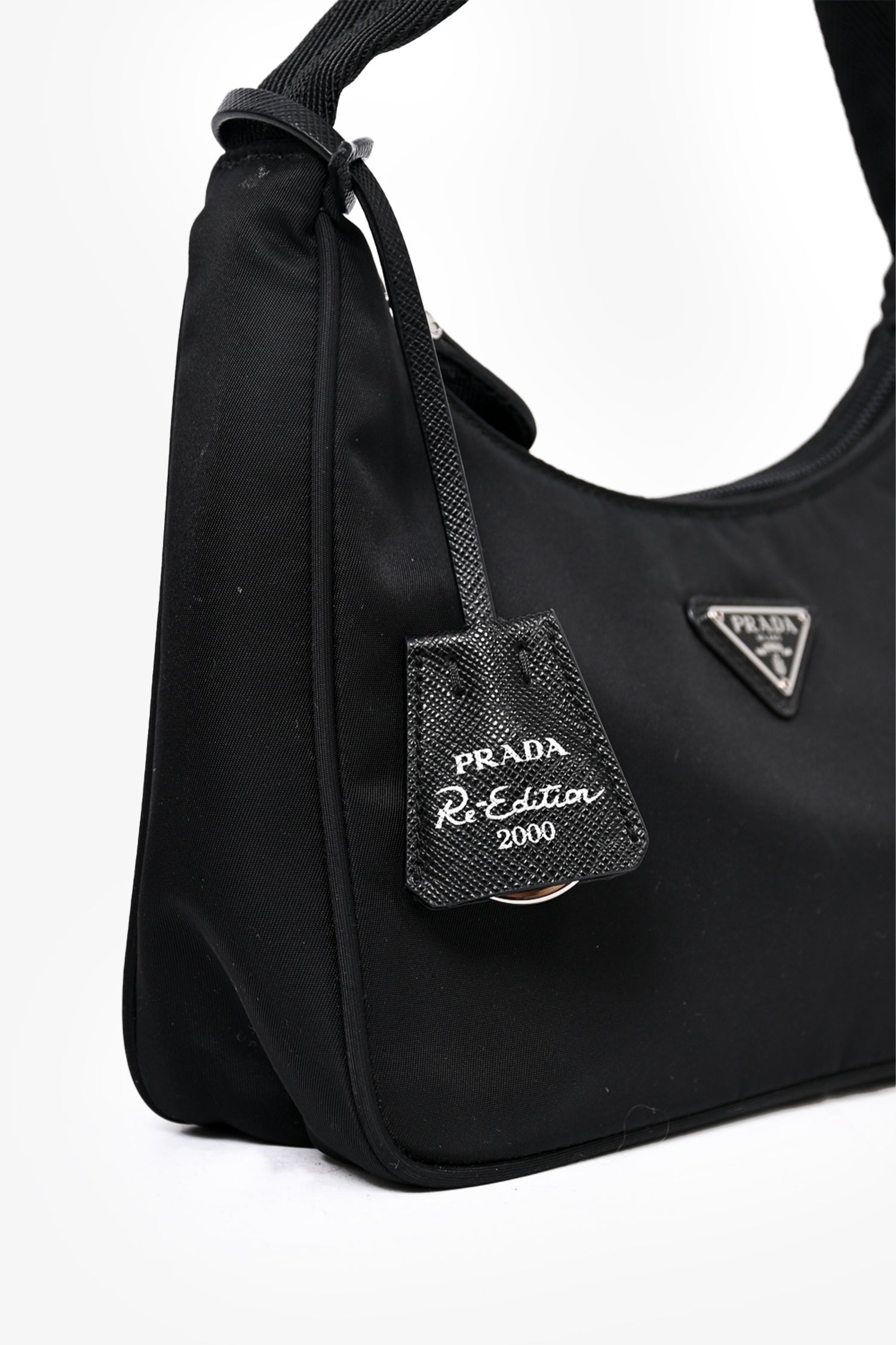 Refresh availabilityPrada Black Nylon Re-Edition 2000 Shoulder Bag. Top zipper with leather pull tab. Attached leather clochette. Lined interior.