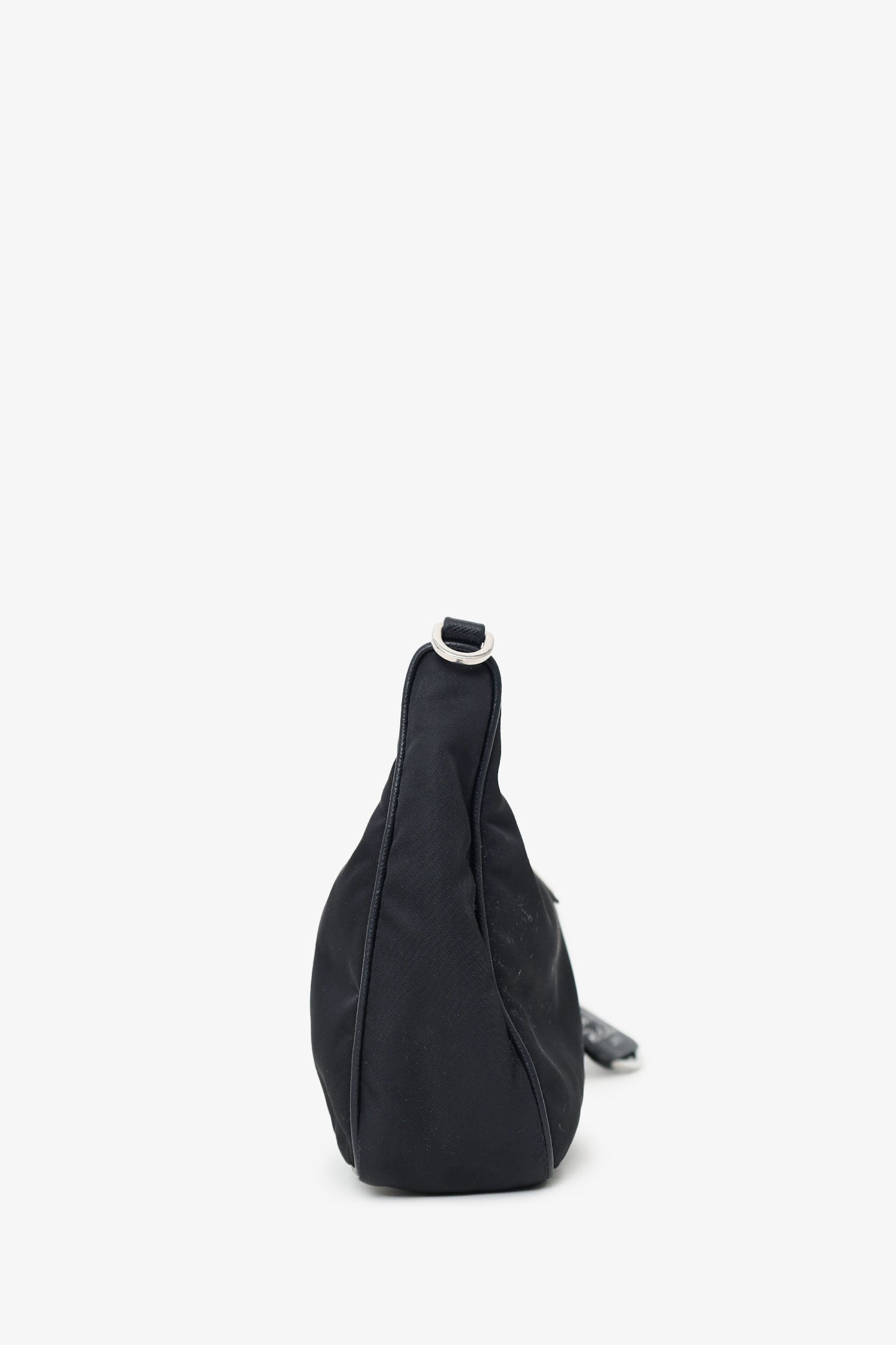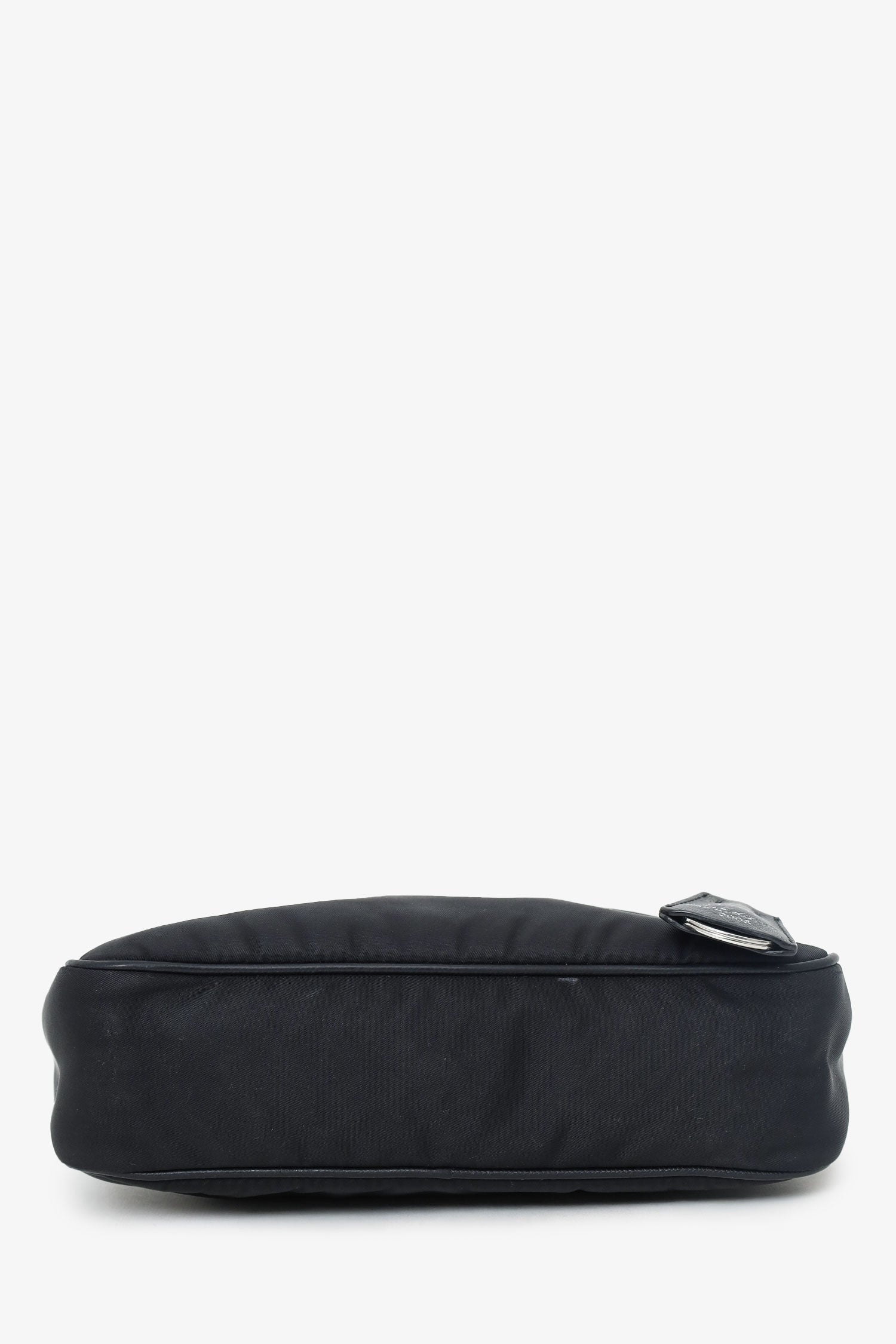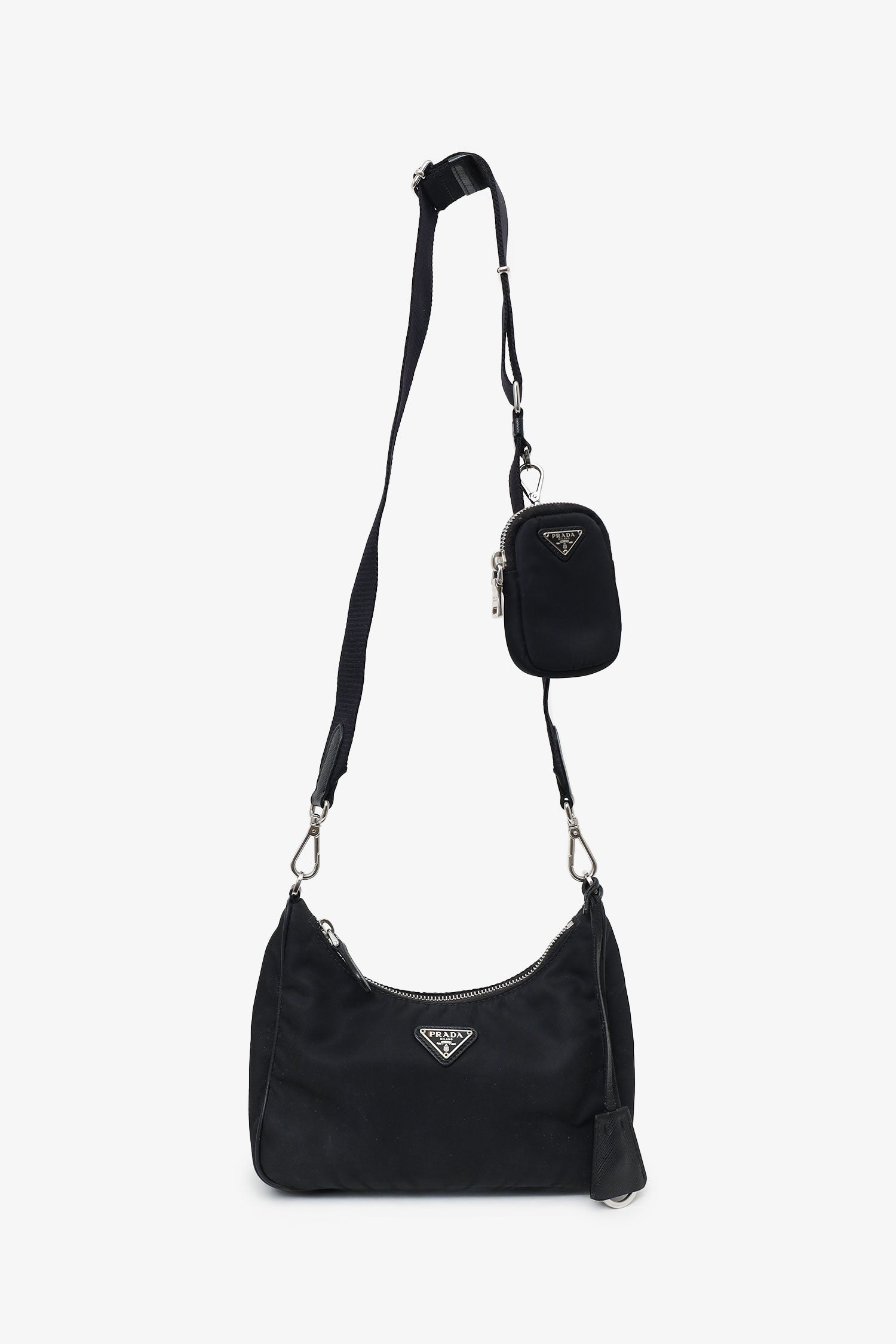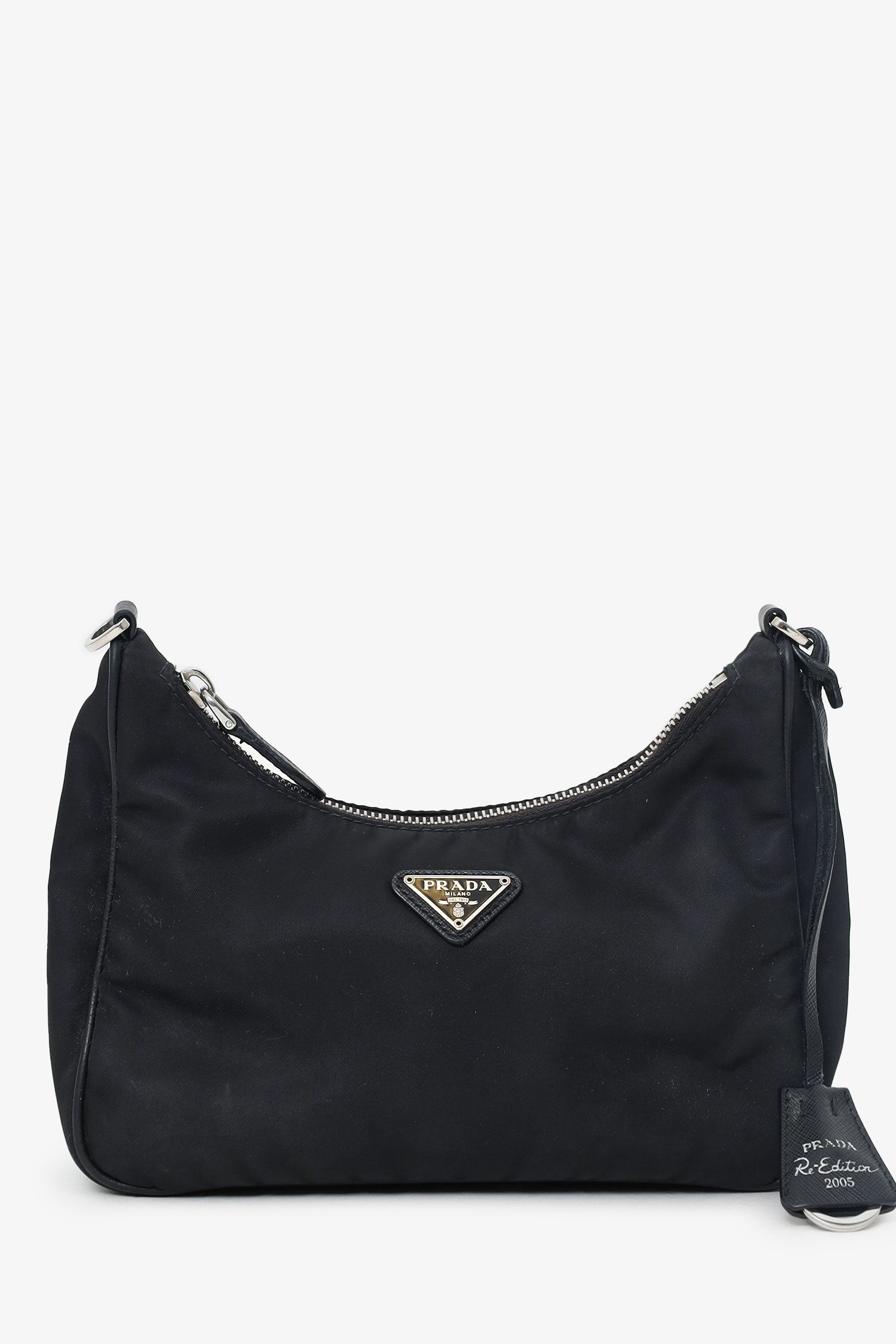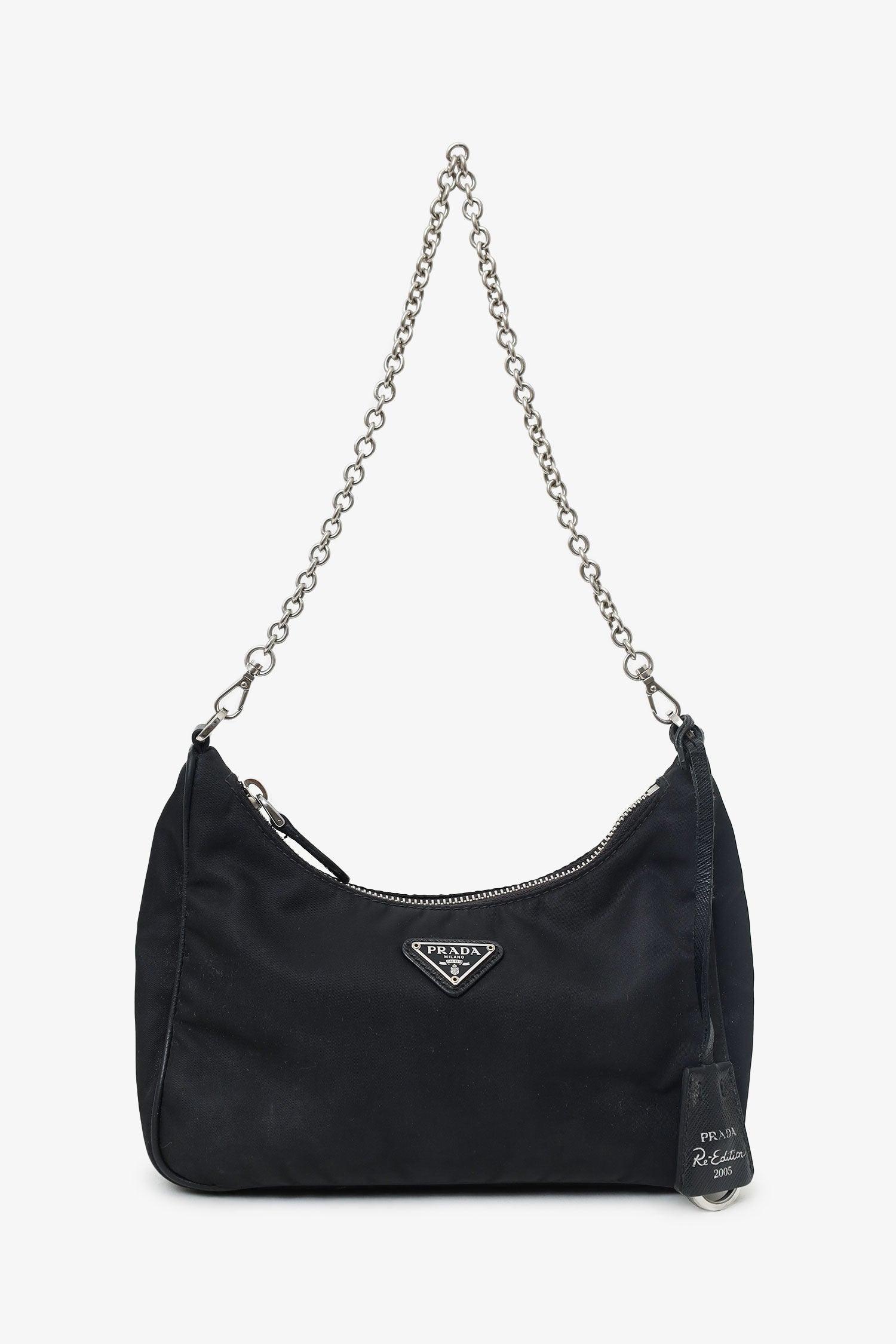 Refresh availabilityPrada Black Nylon Re-Edition 2005 Crossbody Bag. Top zip closure. Two removable shoulder straps with lobster clasp closure; chainlink and adjustable canvas with sliding buckle. Lined interior. Silver-tone hardware. Tonal stitching.