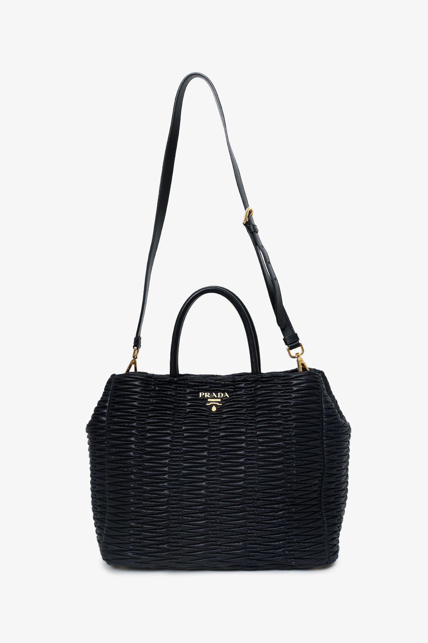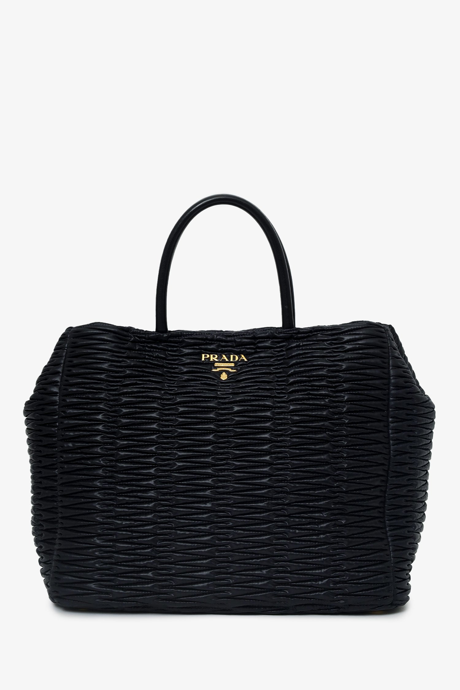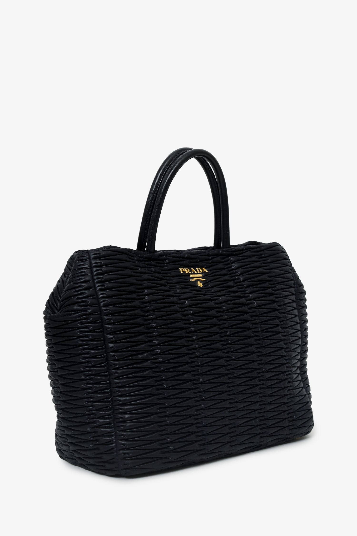 Refresh availabilityPrada Black Nylon Ruched Top Handle Bag With Strap. Top magnetic closure. Twin handles. Removable strap with adjustable buckle closure and lobster clasps. Side magnetic closure. Protective studs at bottom. Lined interior. 2 interior pockets: 1 slip, and 1 zip. Gold-tone hardware. Tonal stitching.