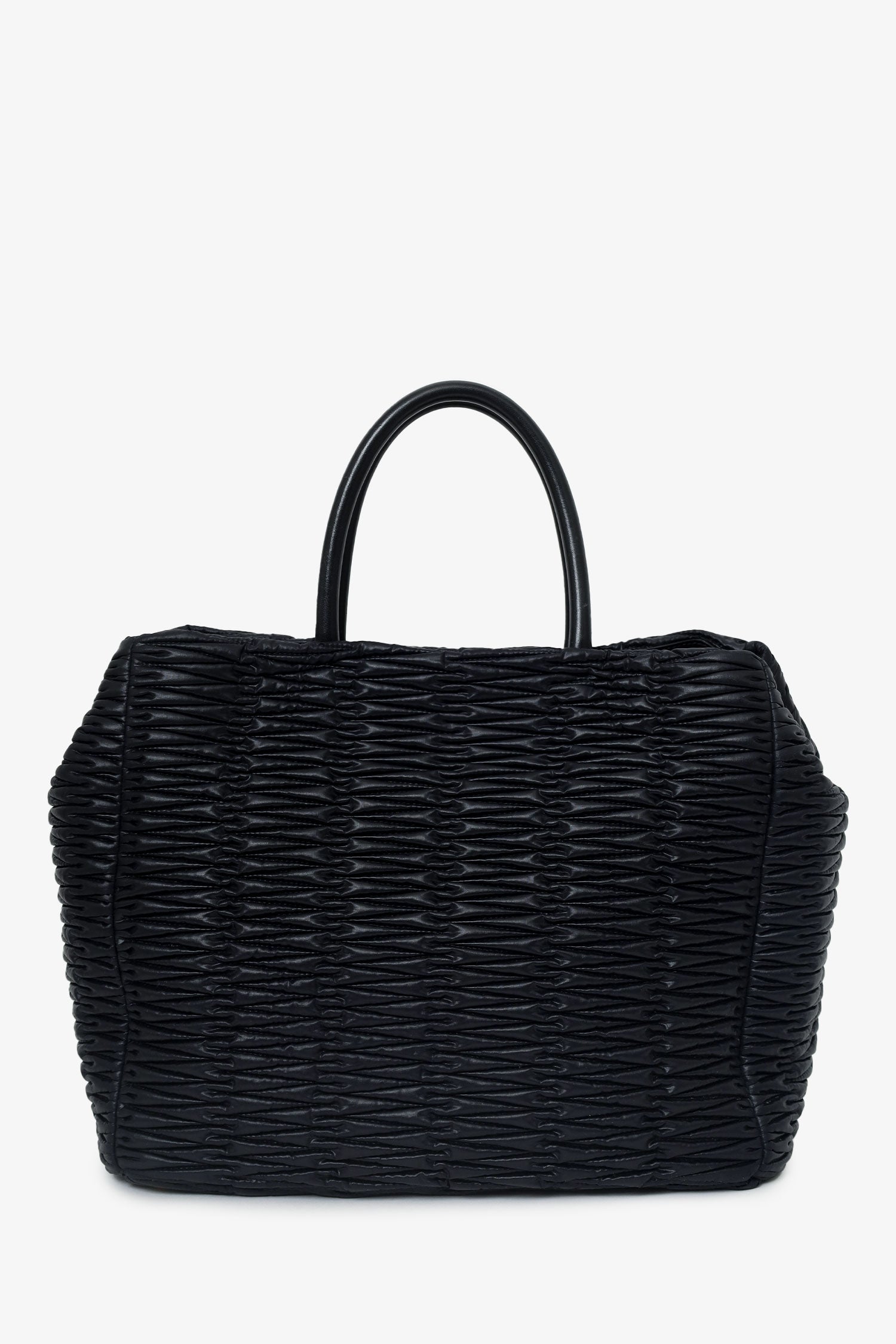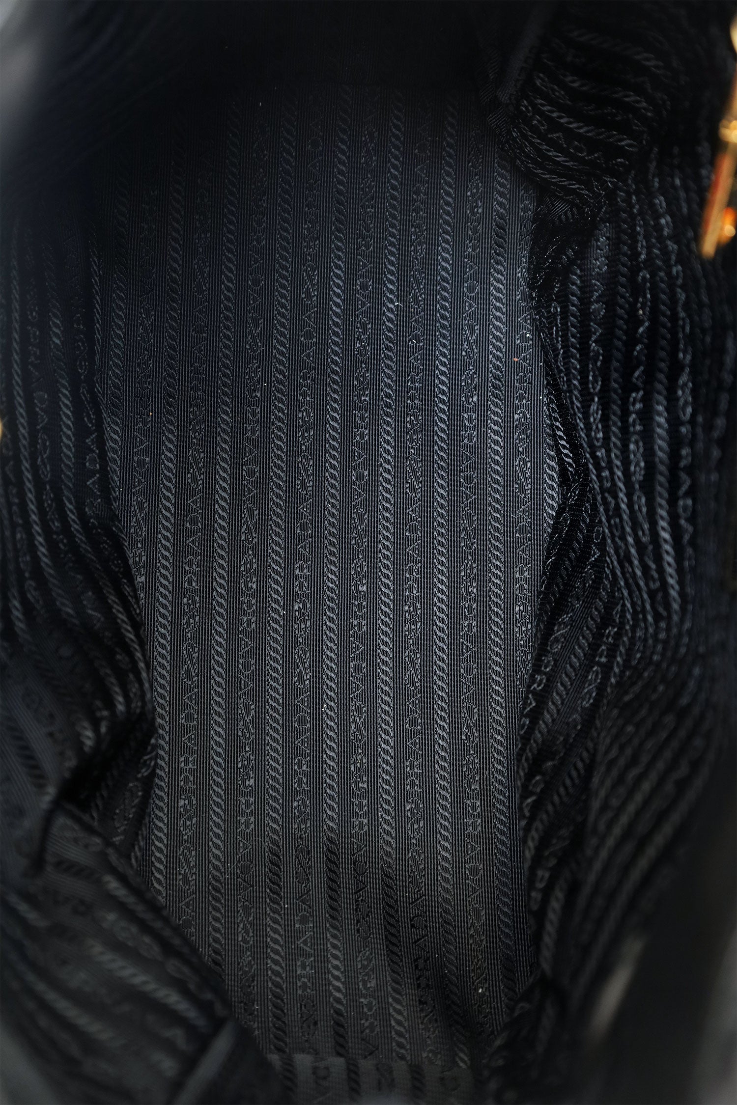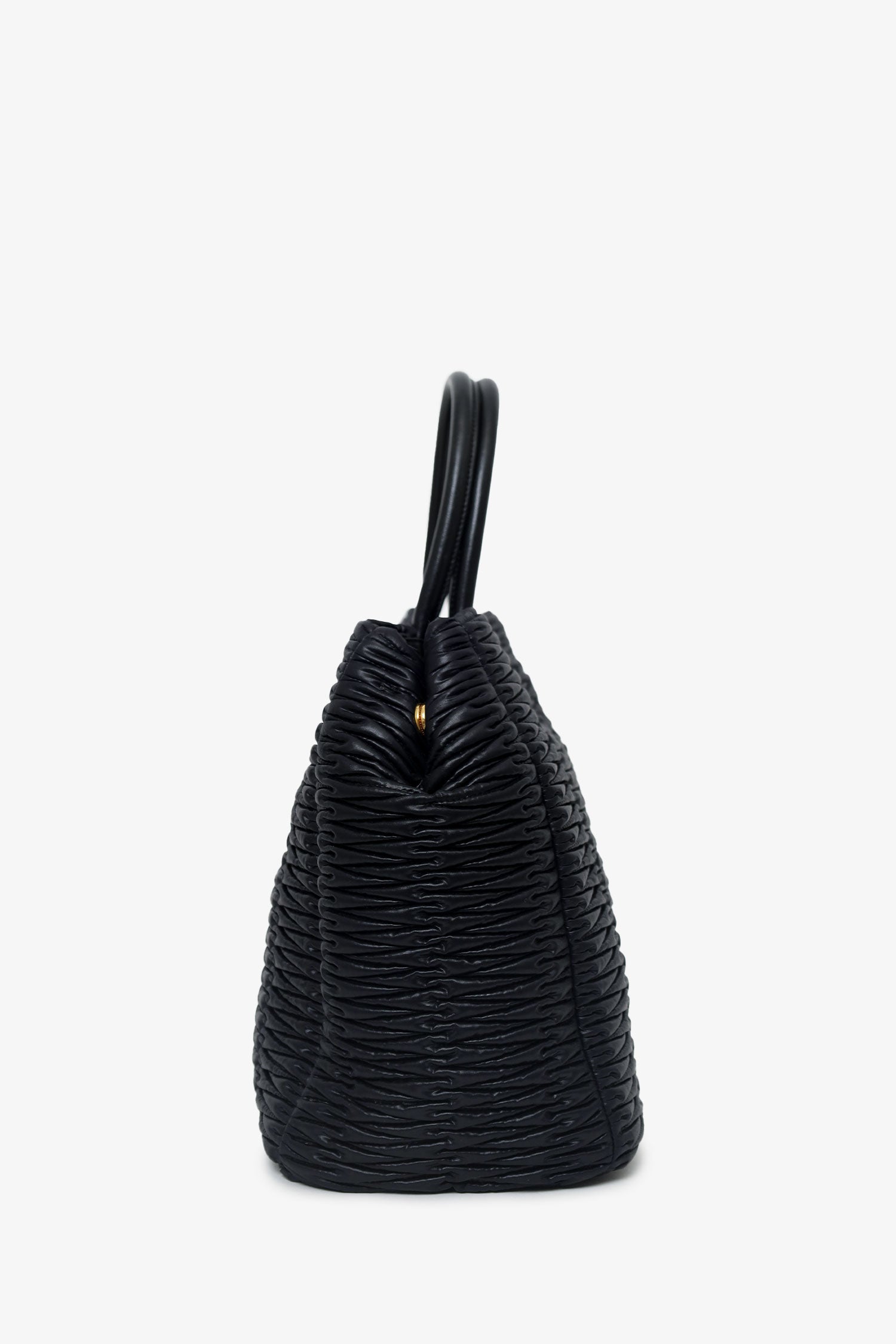 Refresh availabilityPrada Black Nylon Ruched Top Handle Bag With Strap. Top magnetic closure. Twin handles. Removable strap with adjustable buckle closure and lobster clasps. Side magnetic closure. Protective studs at bottom. Lined interior. 2 interior pockets: 1 slip, and 1 zip. Gold-tone hardware. Tonal stitching.